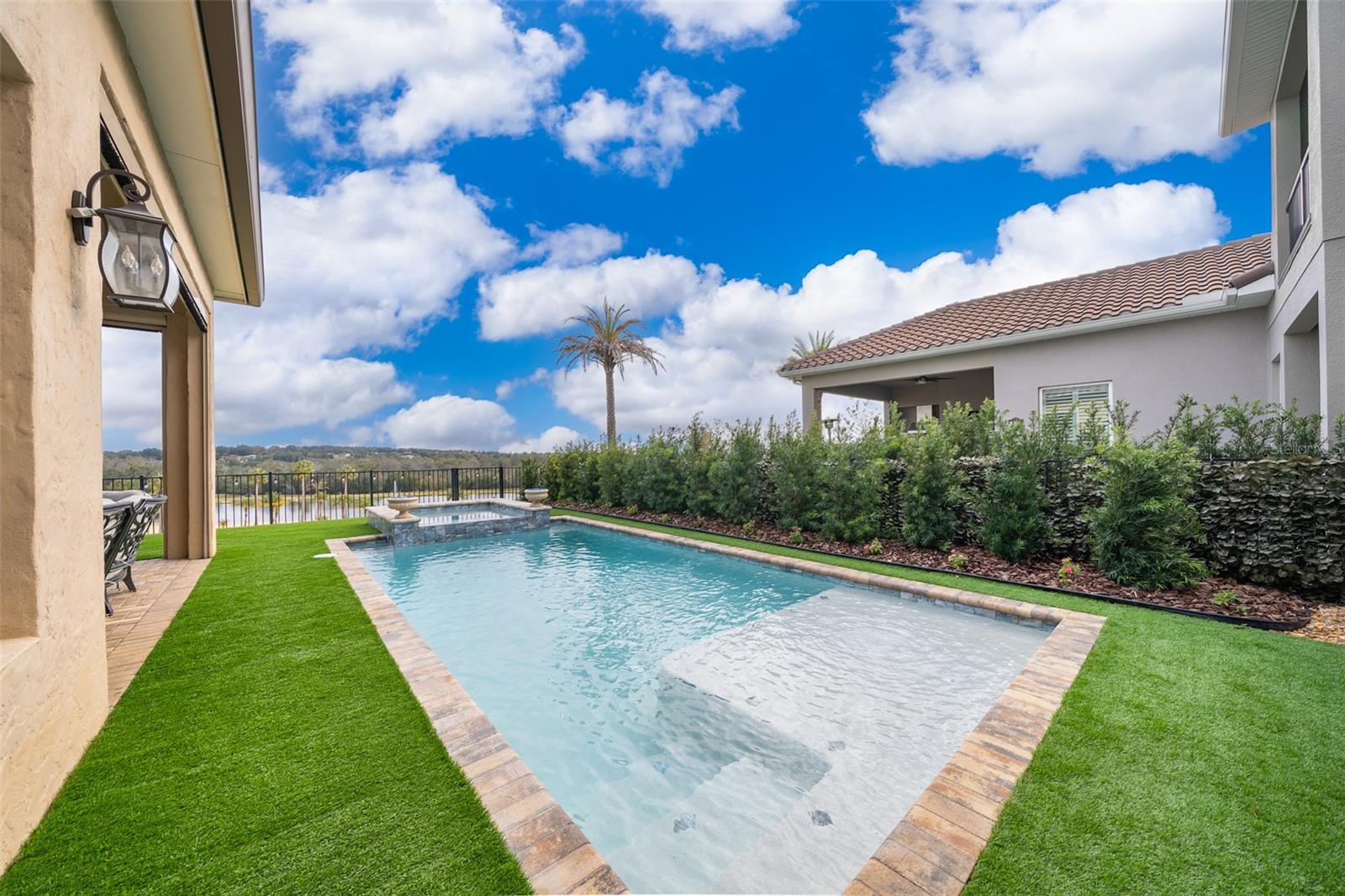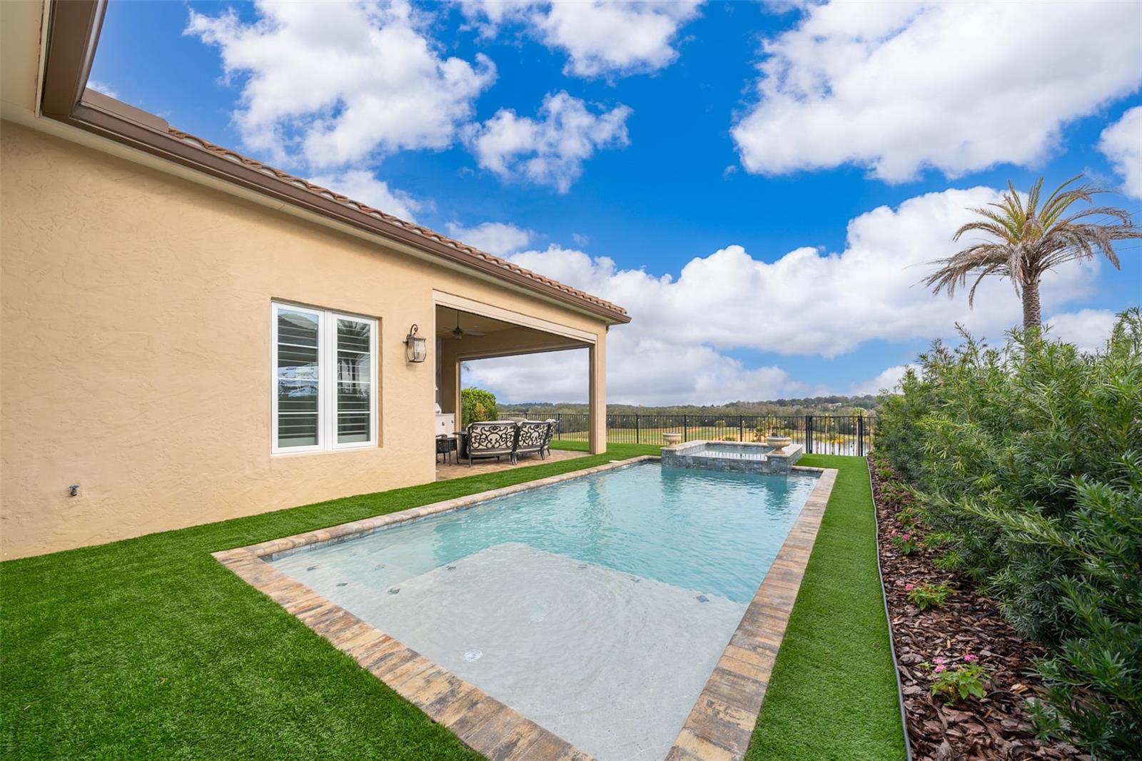 Embrace the mesmerizing views overlooking the 2nd and 5th holes of the signature, championship Nick Faldo-designed golf course and lake. Immerse yourself in this indulgent lifestyle offered by Bella Collina- the highly sought-after gated community. This stunningly crafted, custom-built property features an expansive 3056 Sq FT living space with 4 spacious bedrooms, each with en-suite bathrooms and walk in closets. The home's open floor plan showcases a gourmet chef's kitchen featuring custom, soft-close cabinetry and pull-out drawers in lower cabinets. This kitchen is an entertainer's dream - from the Sub-Zero fridge with integrated custom-matching doors, Bertazzoni (Italian designed) gas range with stove and custom hood that is as beautiful as it is functional, WiFi controlled built-in microwave, wine fridge, over-range pot filler, in-sink instant hot water dispenser and custom coffee bar. You'll find beautiful attention to detail throughout, such as upgraded light fixtures, granite countertops, crown molding and custom shutters. The spacious downstairs primary bedroom retreat is a relaxation haven boasting luxurious walk-in shower with dual shower heads and free-standing tub and dual walk-in closets. The backyard oasis is your personal sanctuary, meticulously planned and thoroughly upgraded. The brand new pool features a hot tub/spa and sunshelf complete with built-in umbrella holder and relaxing bubbler. With the Pentair IntelliCenter, you can control the jets, temperature, lights, and more directly from the mobile app - or schedule according to your liking. The lanai is equipped with motorized, retractable screens and a brand new outdoor kitchen complete with an extra large 45" grill and rotisserie, mini fridge, cocktail station with glass rack and cutting board for garnishes, along with blender and mixer compartments. Plenty of storage and even a built-in trash ensure the ultimate hosting experience. Privacy landscaping with professional irrigation and extra drainage, combined with artificial cool turf synthetic grass with microbial pellets makes your backyard nearly maintenance-free ensuring you spend your time enjoying the breathtaking views of the golf course, lake with fountain and the esteemed Bella Collina clubhouse. Call today to schedule your showing and familiarize yourself with the wide array of amenities and lifestyle offered by The Club at Bella Collina including an 18-hole Championship golf course in impeccable condition, a Har-Tru tennis complex, pickleball courts, a fitness center offering daily classes, a spa, and two restaurants offering indoor/outdoor dining.