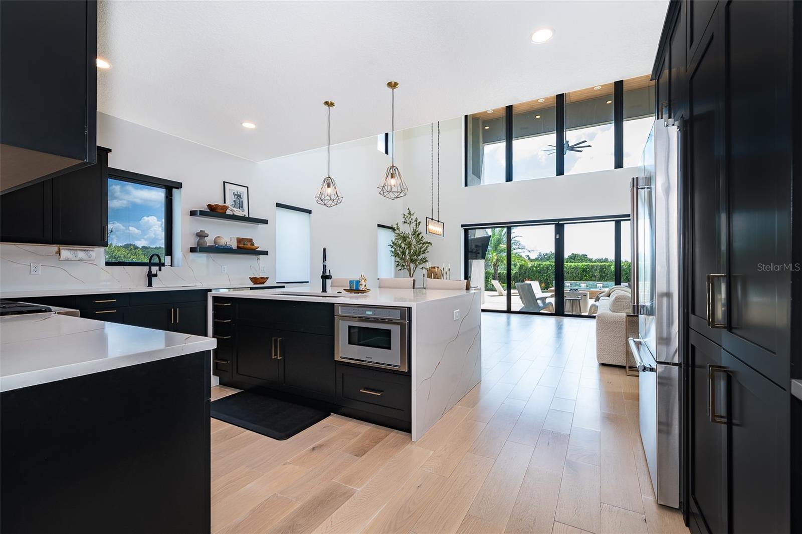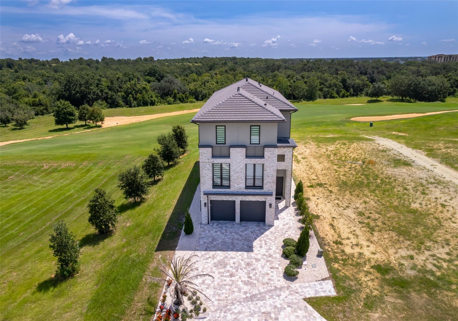 Step into elevated living in this extraordinary corner-lot, custom-designed estate, within a cul-de-sac, in the exclusive guard-gated community of Bella Collina. Spanning three luxurious levels, this 4BR, 5 Full BA, 2 Half BA custom home blends timeless elegance with modern sophistication, premium upgrades and panoramic golf views. The main level features soaring floor-to-ceiling, double-height windows and expansive glass doors allowing natural light to flood the space throughout the day. The oversized sliding glass doors seamlessly blend indoor and outdoor living as they open directly to the saltwater, heated pool & spa and patio area with lush landscaping, offering unobstructed views and easy access for entertaining. This level offers an open living/dining area with a gourmet kitchen equipped with Thermador appliances, two sinks and a hidden, walk-in pantry with Miele washer and dryer. The second floor offers a spacious bonus room with a Thermador beverage station and wet bar perfect for entertaining. On this level, you'll also find a frameless glass-enclosed office, a full hall bath and a guest suite with an en-suite bath (double sinks) and walk-in closet. On the third floor, you'll find a luxurious retreat offering breathtaking panoramic views of the 9th hole of the Bella Collina golf course through its private oversized balcony. Your primary suite comes equipped with a personal coffee station with sink, a Thermador beverage fridge and an expansive custom-built, walk-in closet. The third floor also includes two additional bedrooms, each with their en-suite bathroom. The laundry room with a Samsung washer and dryer, sink and custom-cabinetry is conveniently located between the bedrooms. Some of the additional features in this stunning home include: wood floors throughout, alarm system, whole-house water filtration system, 2-car garage, pool half bath and pre-wiring for sound system. This home perfectly balances high-end finishes, technology, and elegant indoor/outdoor flow—set within the serene, amenity-rich setting of Bella Collina, featuring a Nick Faldo Championship golf course, a luxurious spa, Har-Tru tennis courts, pickleball courts, clubhouse, outdoor pool complex, cutting-edge fitness center with complimentary fitness classes, lake views and monthly culinary and/or wine events. Don’t miss the opportunity to own this one-of-a-kind luxury retreat in Central Florida’s premier private community.