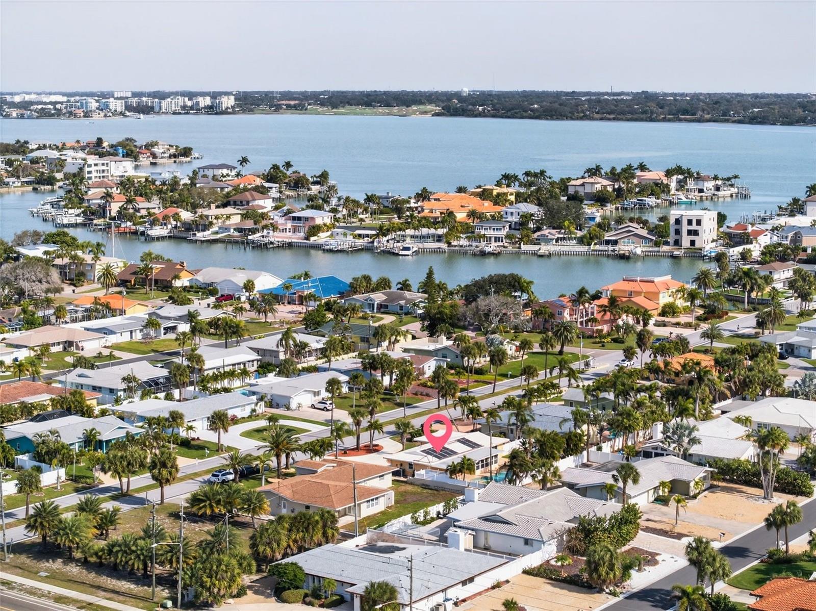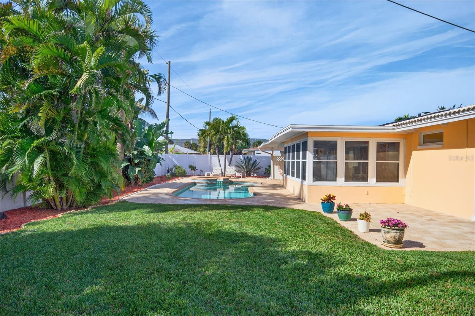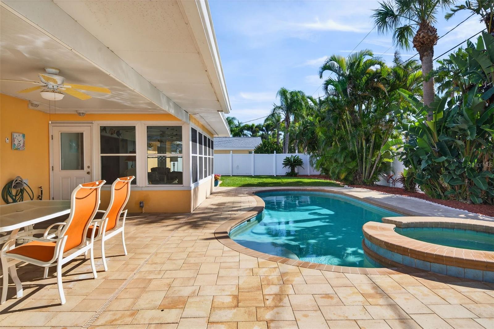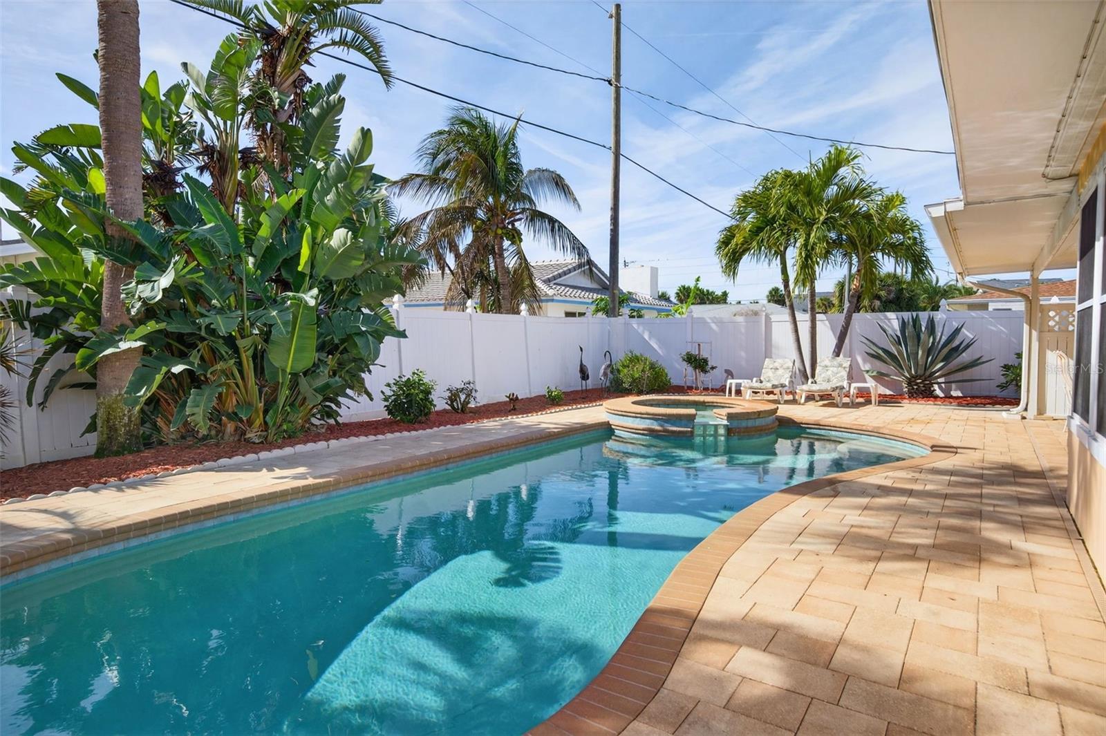 Wake up and walk to the Gulf. This charming 2-bedroom, 2-bath pool home sits just across the street from Belleair Beach's stunning sand shoreline. The oversized 90x100 lot delivers the outdoor lifestyle Florida is all about. A heated pool and spa anchor the large tropical backyard, surrounded by generous decking and a covered lanai perfect for year-round entertaining. Inside, a bright Florida room overlooks the pool area. Both bedrooms feature spacious walk-in closets, and plantation shutters throughout add classic coastal character. The eat-in kitchen keeps daily life easy, while ceramic tile floors make this home move-in ready. Lush tropical landscaping, a circular driveway, and true beach lifestyle living in one of Pinellas County's most sought-after coastal communities.