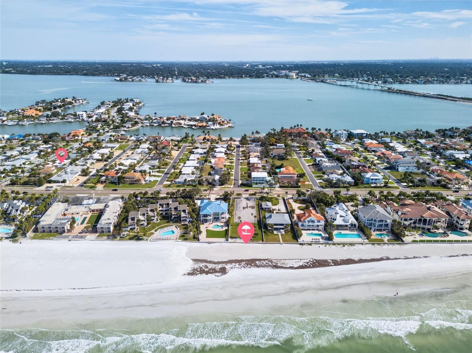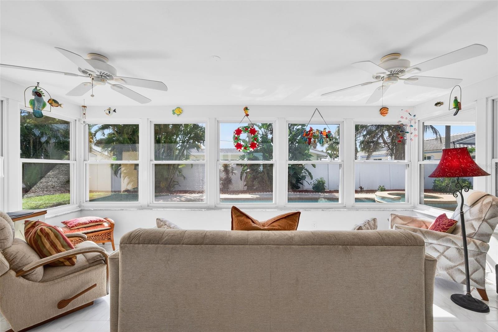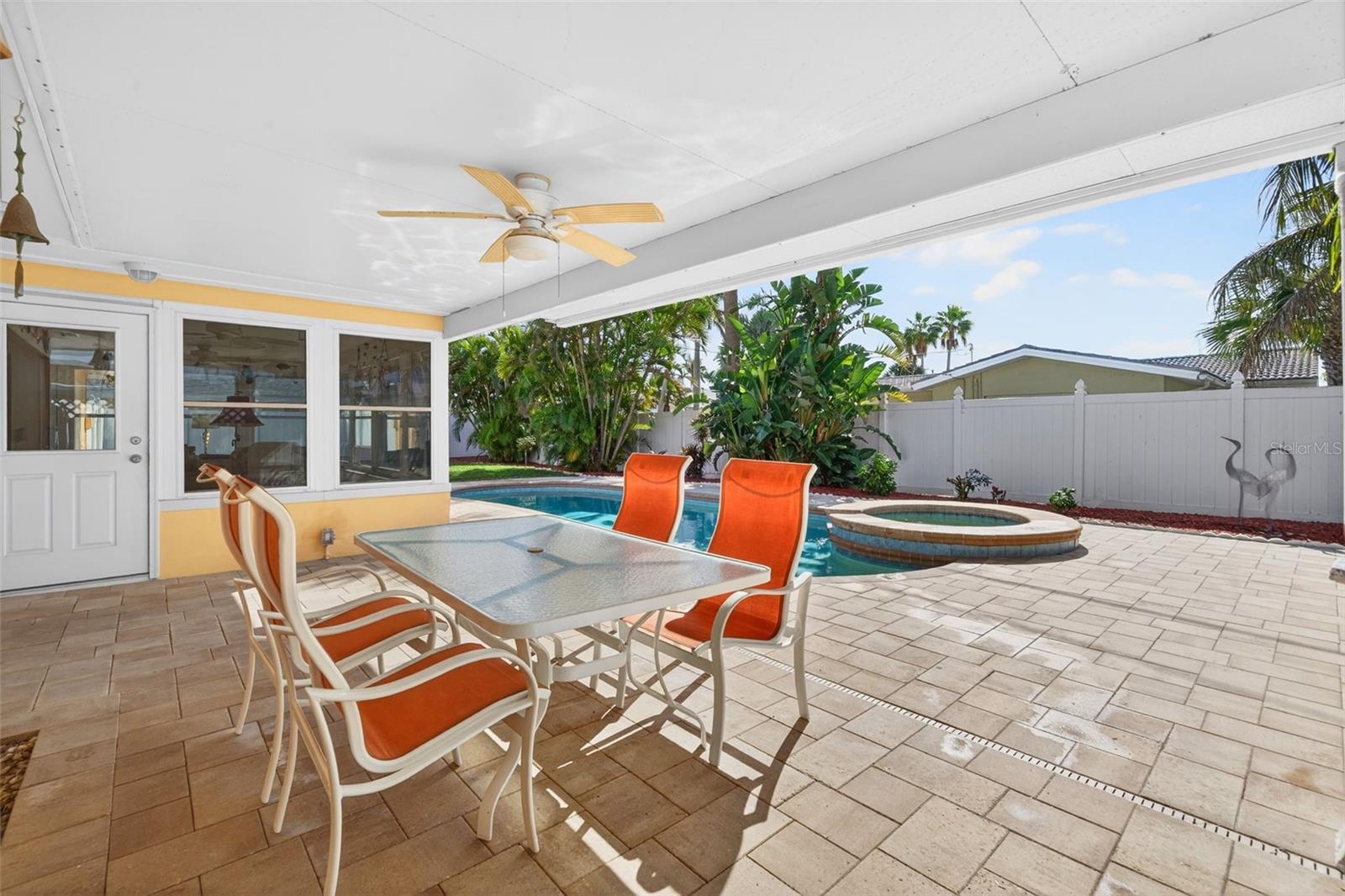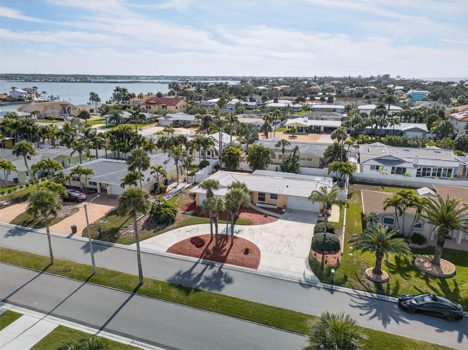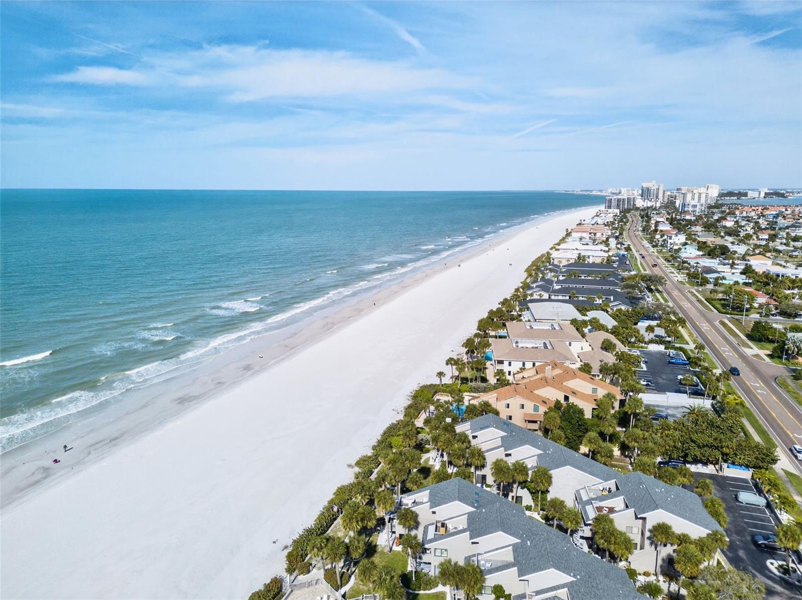Wake up and walk to the Gulf. This charming 2-bedroom, 2-bath pool home sits just across the street from Belleair Beach's stunning sand shoreline. The oversized 90x100 lot delivers the outdoor lifestyle Florida is all about. A heated pool and spa anchor the large tropical backyard, surrounded by generous decking and a covered lanai perfect for year-round entertaining. Inside, a bright Florida room overlooks the pool area. Both bedrooms feature spacious walk-in closets, and plantation shutters throughout add classic coastal character. The eat-in kitchen keeps daily life easy, while ceramic tile floors make this home move-in ready. Lush tropical landscaping, a circular driveway, and true beach lifestyle living in one of Pinellas County's most sought-after coastal communities.
