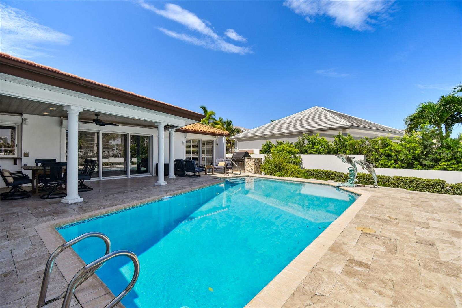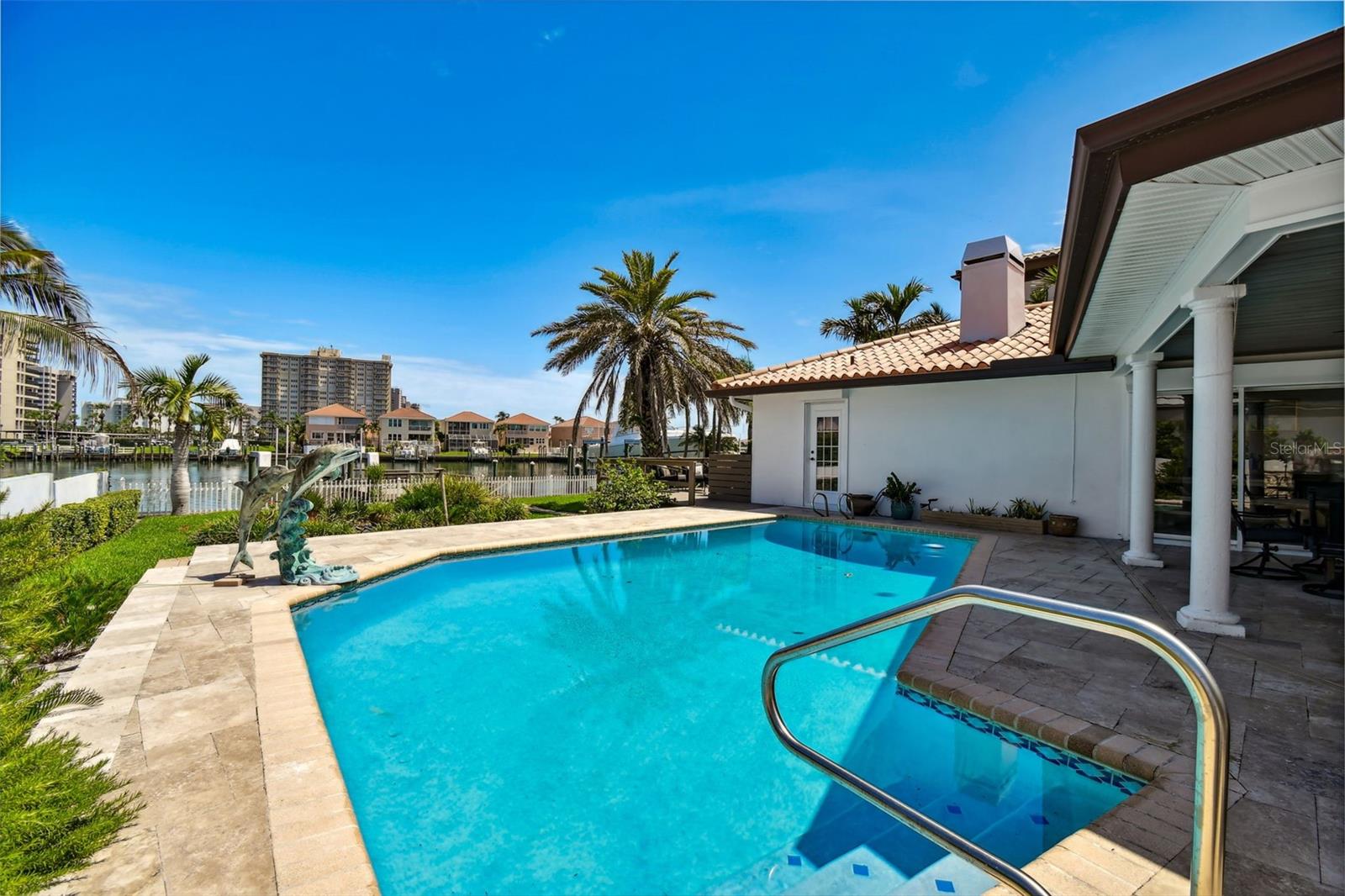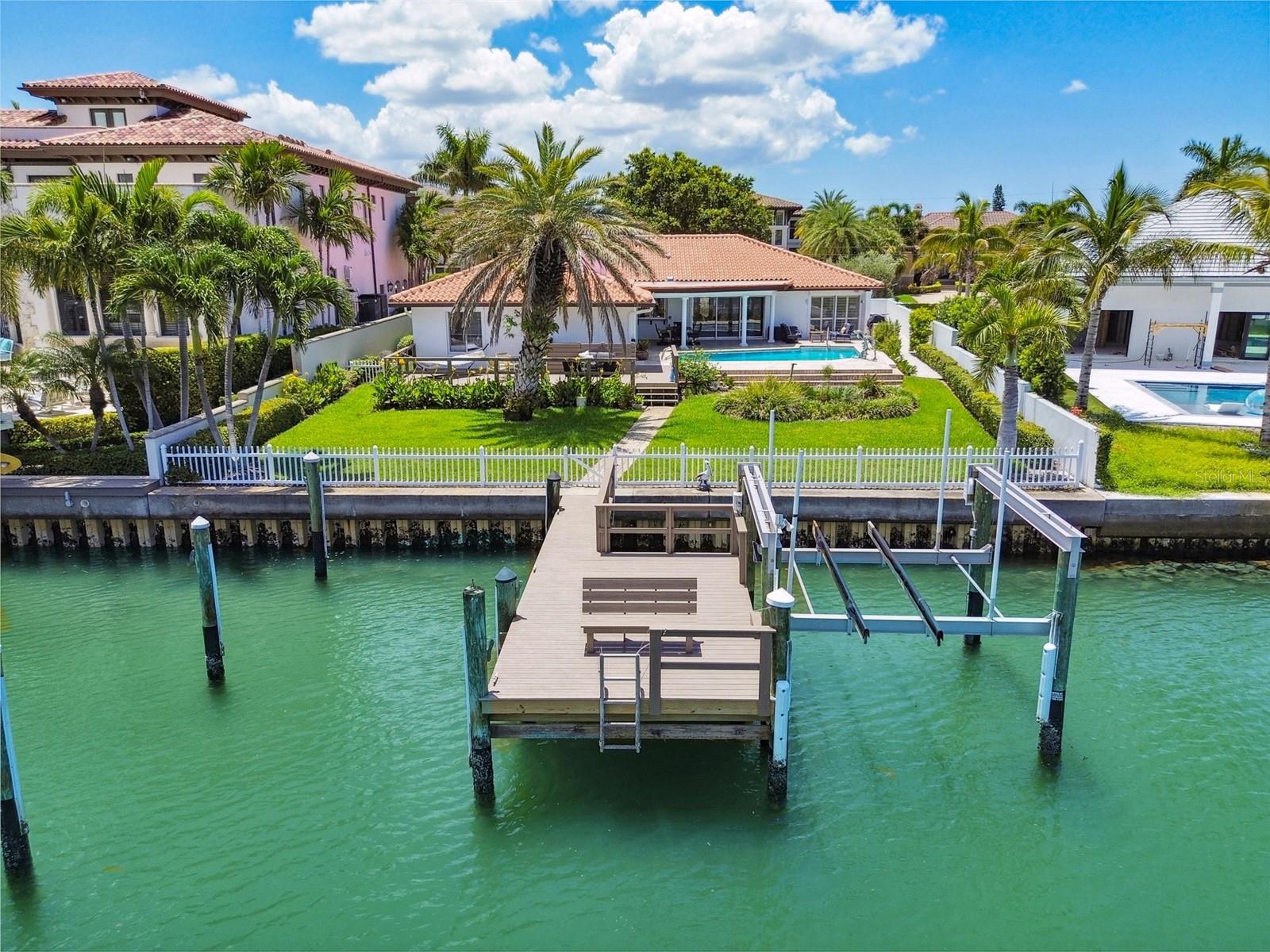 UNAFFECTED BY FLOODING - Waterfront Oasis Steps from the Beach - Just a block from the private pedestrian BEACH Access on Harrison Ave, this 4-bedroom, 3-bathroom residence, located in the coveted city of Belleair Beach, offers bright and airy coastal living, cozy fireplace, large eat-in kitchen, granite countertops, high-end appliances, 3 autonomous sleeping quarters featuring spacious bedrooms. Oversized primary suite comes with private access to the pool area, his/hers walk-in closets and an en-suite bathroom. Speedy access to the Gulf from the deep-water Intracoastal waterway. 69 feet of water frontage, 12K lbs boat lift, NEW dock and decking. The house is equipped with an energy-efficient water softener system as well as a whole-home GENERATOR. Home has received significant RECENT UPDATES (new floors, pool resurfacing, new outdoor Weber built-in gas grill, hurricane rated garage door, plantation shutters, garage floor epoxy, new pool heater & pump, new interior exterior painting just to name a few).