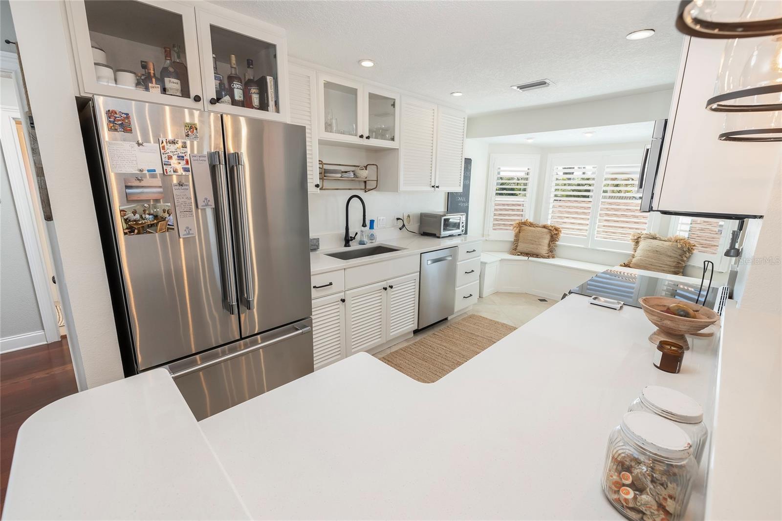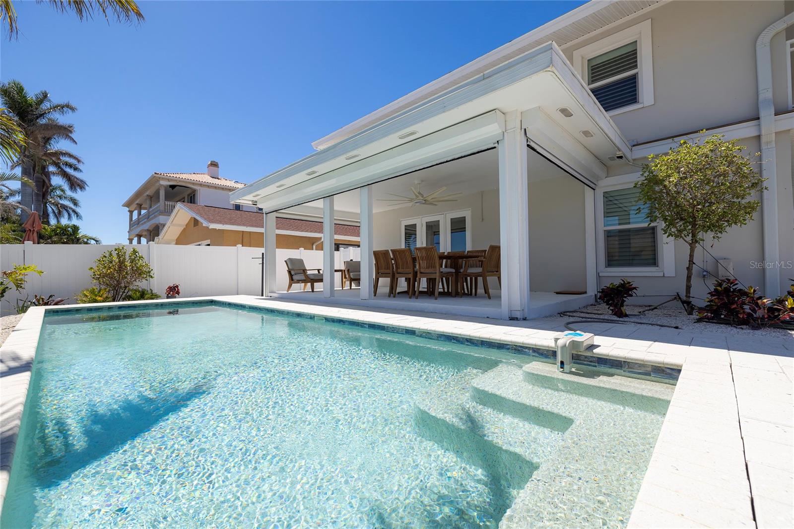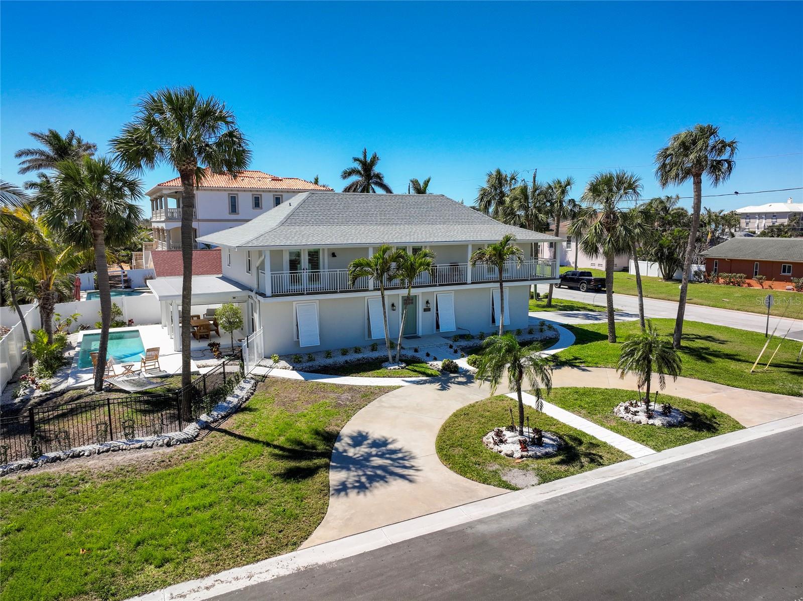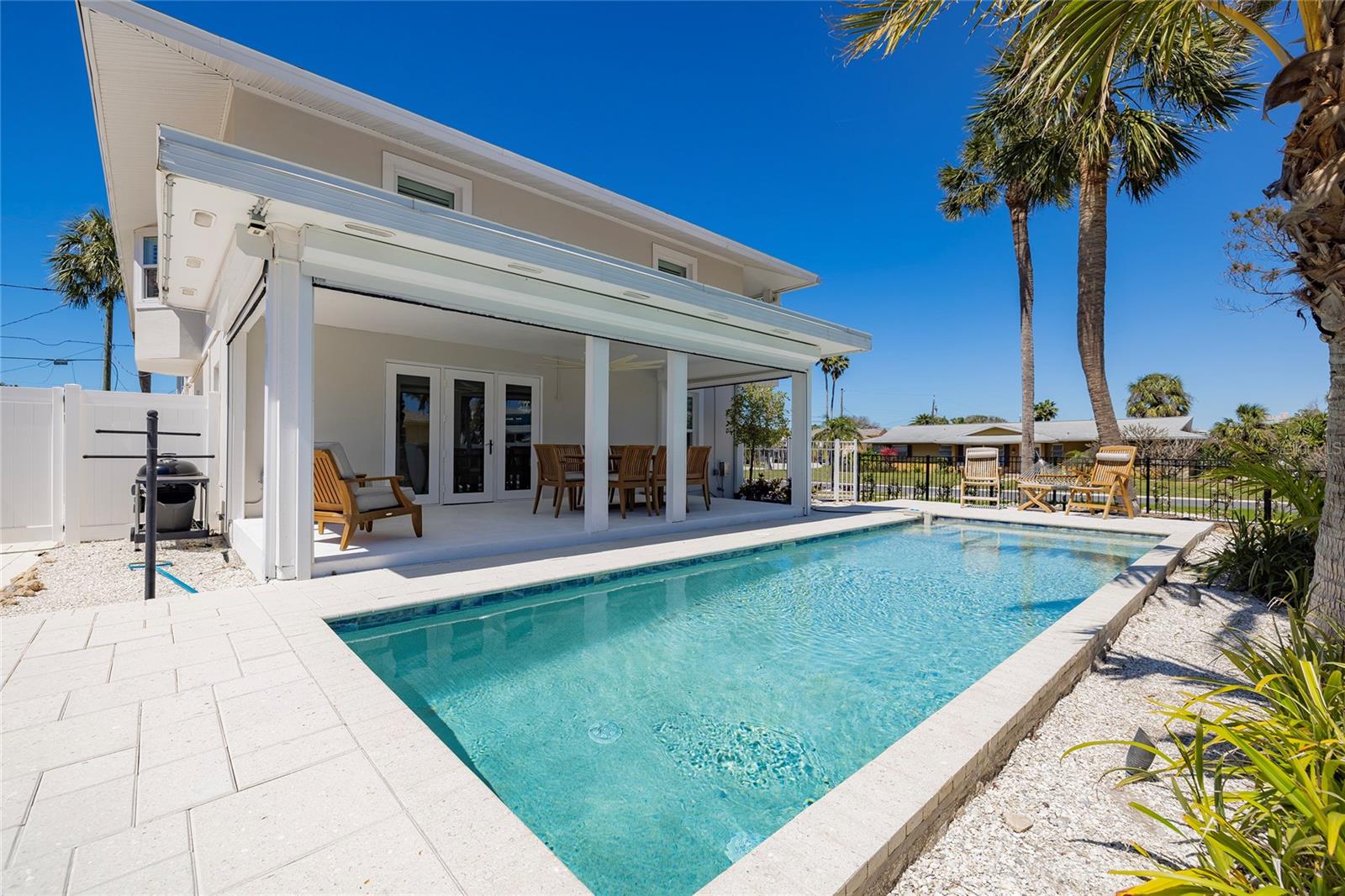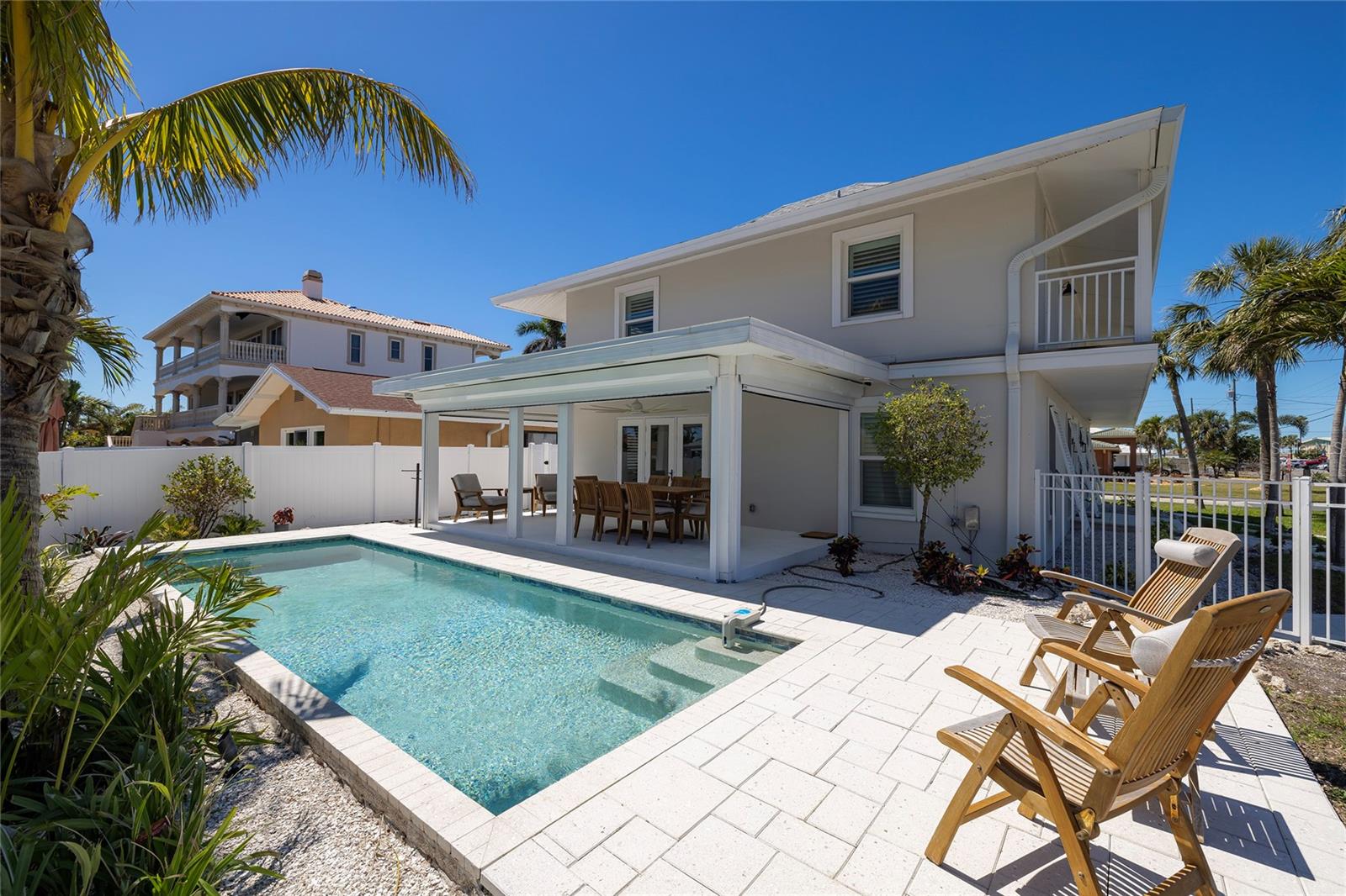 This move-in ready, corner lot home in Belleair Beach is ready for its new owner! Stepping inside, you'll be greeted with beautifully updated tile flooring, leading you to a large Living Area that overlooks the pool! Featuring a new wet bar with Quartz countertops and soft-close cabinets, this makes a great entertaining space for house-parties and holidays! French Doors lead you to the saltwater pool and covered patio. Back inside, the first floor features an updated half-bathroom, an oversized Laundry Room, and the access to the HUGE garage! Heading upstairs, you'll find the beautifully-updated Kitchen, featuring Quartz countertops and soft-close doors and drawers. All Stainless Steel Bosch Kitchen appliances are new 2021 and the Rohl fixtures are the perfect finishing-touch. The bench-seating off the Kitchen has ample storage and is a great space for a breakfast nook! The open Kitchen overlooks the Dining Room and Upstairs Living Room, providing the perfect space for family gatherings. The split-bedroom plan is ideal for privacy to the Master Bedroom. The light and bright Master Bedroom has a beautiful en-suite bathroom, with a large tub and a separate standing shower. It also has a large walk-in closet (11 ft x 5 ft), and French Doors leading to the Balcony that runs along the entire north-side of the home. The upstairs Living Room and the Second Bedroom all have access to this large balcony. The Second and Third Bedrooms are both ample in size, and all 3 Bedrooms feature waterproof vinyl flooring. The guest Bathroom was beautifully updated in 2020. You'll love all of the upgrades and have peace of mind knowing that everything major is new! The Roof is new 2019 -- the saltwater pool was added in 2019 and a new pool pump was installed in Nov 2024 -- new pavers in the back yard were installed in 2020 -- The A/C is 2020 -- Pella Hurricane Windows and Doors are 2021 -- Interior Shutters are 2020 -- Fence is 2020 -- Outdoor Bahama Shutters 2021 -- New Water Softener and Whole House Filtration System 2022 -- Washer and Dryer 2025! The new front door is Hurricane proof, and the Seller has AstroGuard Hurricane fabric for the side-garage door as well as for the front door. Both Garage doors are Hurricane-rated and are new 2021. The entire exterior was Benjamin Moore painted in 2020. The back covered patio is spacious, measuring 21 ft x 11 ft, and features remote controlled Hurricane shades to help protect your outdoor furniture, installed in 2021. The pool, security system, front door lock AND the garage doors have the capability to be controlled from your phone! There is an abundance of parking space outside, with a circular drive AND a separate driveway. Invite your friends over to walk to Belleair Beach -- The beach access is located just steps away!! Did I mention that this home is being sold furnished? Only a few items will be leaving this home (ask your Realtor!), so bring your toothbrush and move right in! Only a 20-minute drive to PIE Int'l Airport, and about a 30-minute drive to Tampa Int'l Airport. Just minutes away from dining, shopping, and the BEST of Florida-living, what's not to love?! The Kitchen, Bedrooms, Living and Dining Areas in this home are located on the second level, elevated well above sea-level!