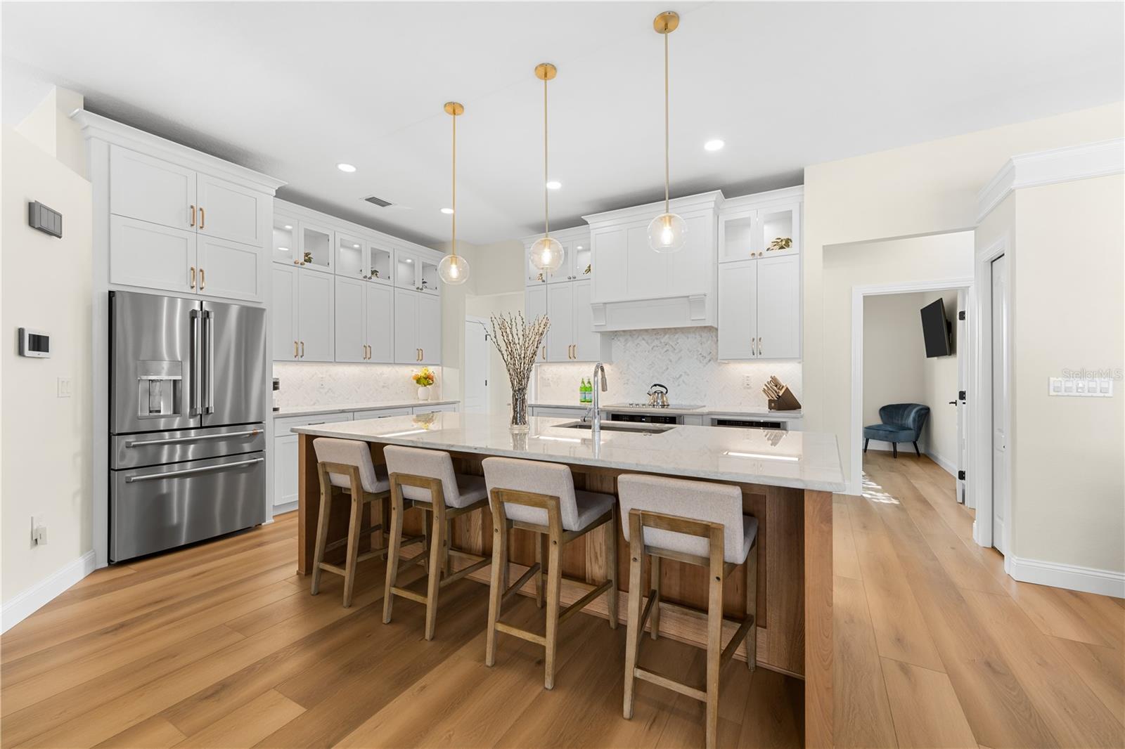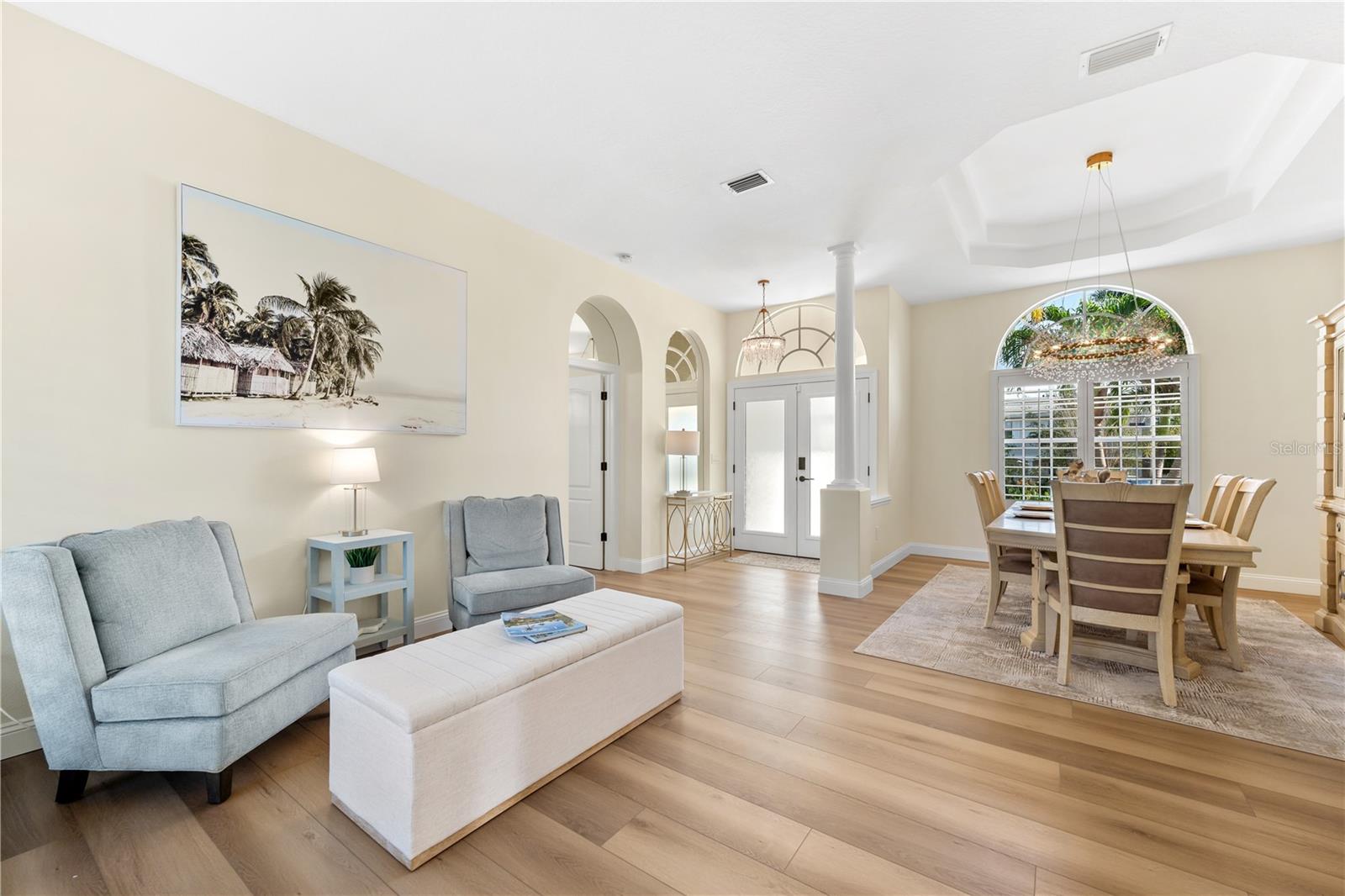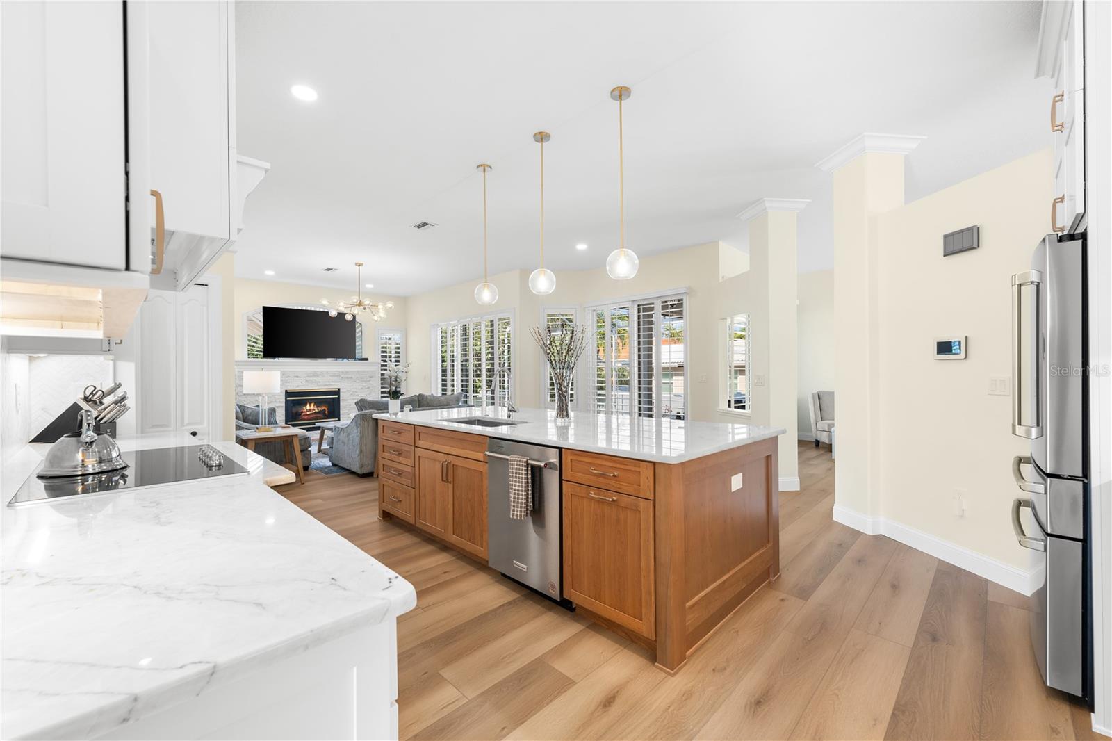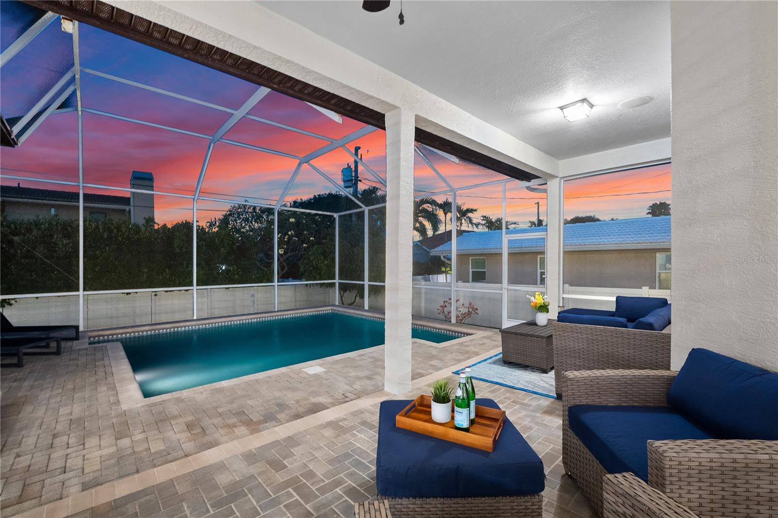 HIGH AND DRY!! TOOK IN NO WATER DURING HURRICANE HELENE!!! Welcome to your new luxury retreat on Belleair Beach, perfectly positioned between the Intracoastal and the Beach. This residence has been masterfully customized and redesigned, featuring modern conveniences to elevate your lifestyle with ease. Upon arrival, you will notice the Intracoastal waterfront and community dock area, rarely found 3 car garage, raised elevation, pristine landscape, and welcoming entrance. Venture inside and experience the contemporary coastal elegance of wood-look waterproof flooring and designer lighting, creating a chic yet inviting atmosphere throughout the home. Every detail has been thoughtfully considered. The kitchen has been curated with precision and style, custom solid wood KraftMade Cabinetry offers both functionality and elegance, providing ample storage space for all your culinary essentials. The natural stone Quartzite countertops not only add a touch of sophistication but also ensure durability for years to come. Prepare your favorite meals surrounded by family and guests in the open concept floorplan all while enjoying the luxury of KitchenAid appliances and a Cafe Refrigerator, designed to meet the demands of a discerning chef. Cozy up by the cultured stone fireplace on chilly evenings, creating the perfect ambiance for relaxation and intimate gatherings. The owners suite is a sanctuary of peace with its spa-like bathroom, adorned with custom tile imported from Spain. Bask in the luxury of fine craftsmanship and exquisite design, where every element speaks of elegance and comfort. Lock it and leave it luxury evidenced by the new exterior doors, including a hurricane-rated front door equipped with a smart lock for added peace of mind. Embrace the convenience of Google smart technology, with a thermostat, front ring bell camera, and rear home camera, putting control at your fingertips, whether you are at home or away. Experience effortless outdoor living with the new Wi-Fi-controlled sprinkler system, ensuring your lawn stays lush and vibrant with minimal effort. The re-screened pool patio enclosure, where you can lounge in comfort and style, is surrounded by the tranquility of your private oasis. Entertainment is taken to new heights with Sonos speakers both inside and outside, complete with an amplifier controlled by your smart device. Whether you're hosting a soirée or enjoying a quiet evening at home, immerse yourself in premium sound quality and effortless connectivity. For added convenience, the home is pre-wired for an electric car charger, providing the ultimate in modern living for eco-conscious homeowners. Plus, enjoy the luxury of Smart Samsung TVs in every bedroom, ensuring entertainment is always within reach. Complete with plantation shutters and custom closets, this home exudes luxury at every turn. The community offers tennis courts, a playground, a marina, multiple private resident-only beach accesses, and multiple boat docks, one of which is steps from your front door. Call today to request your private tour.