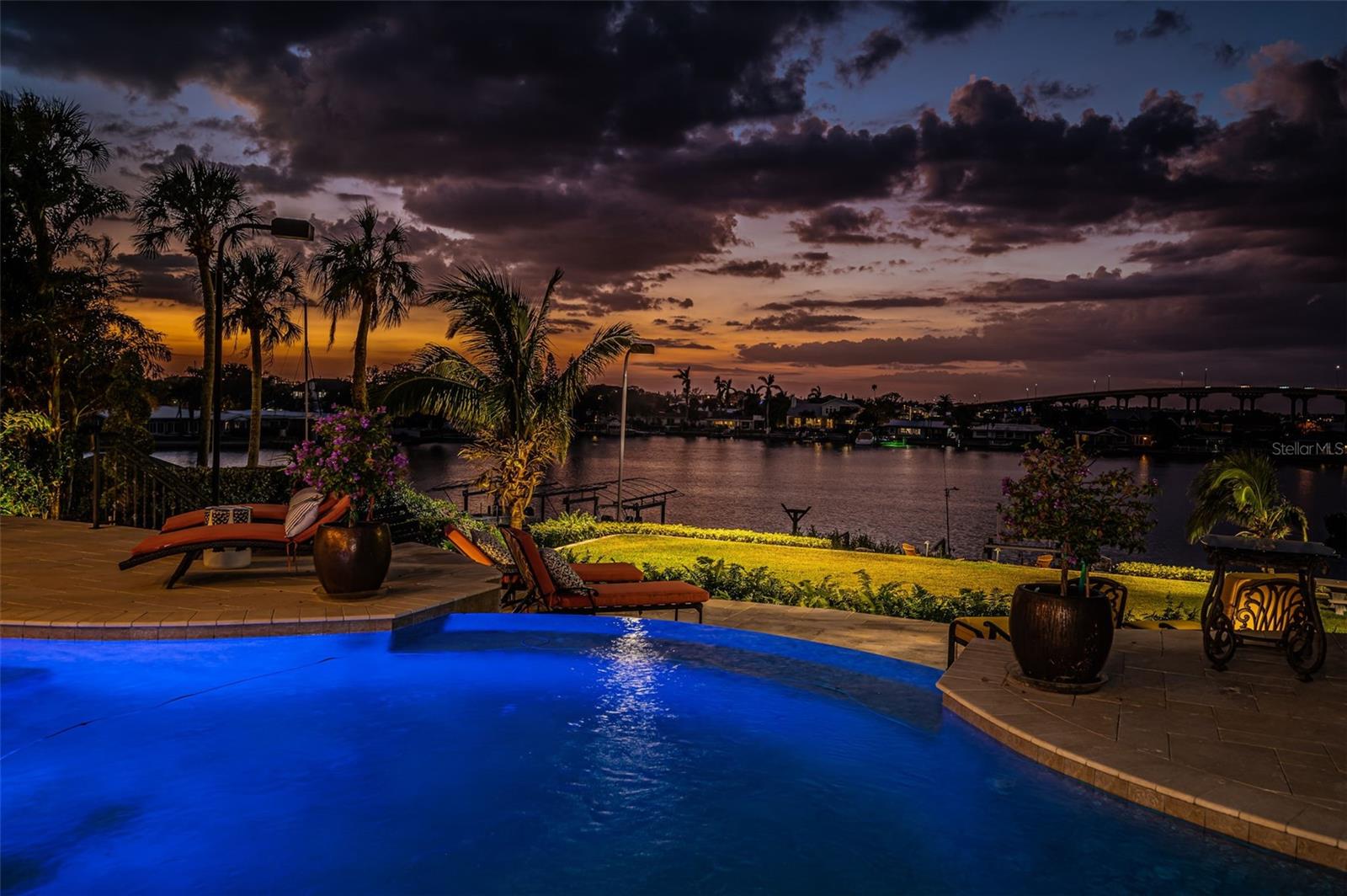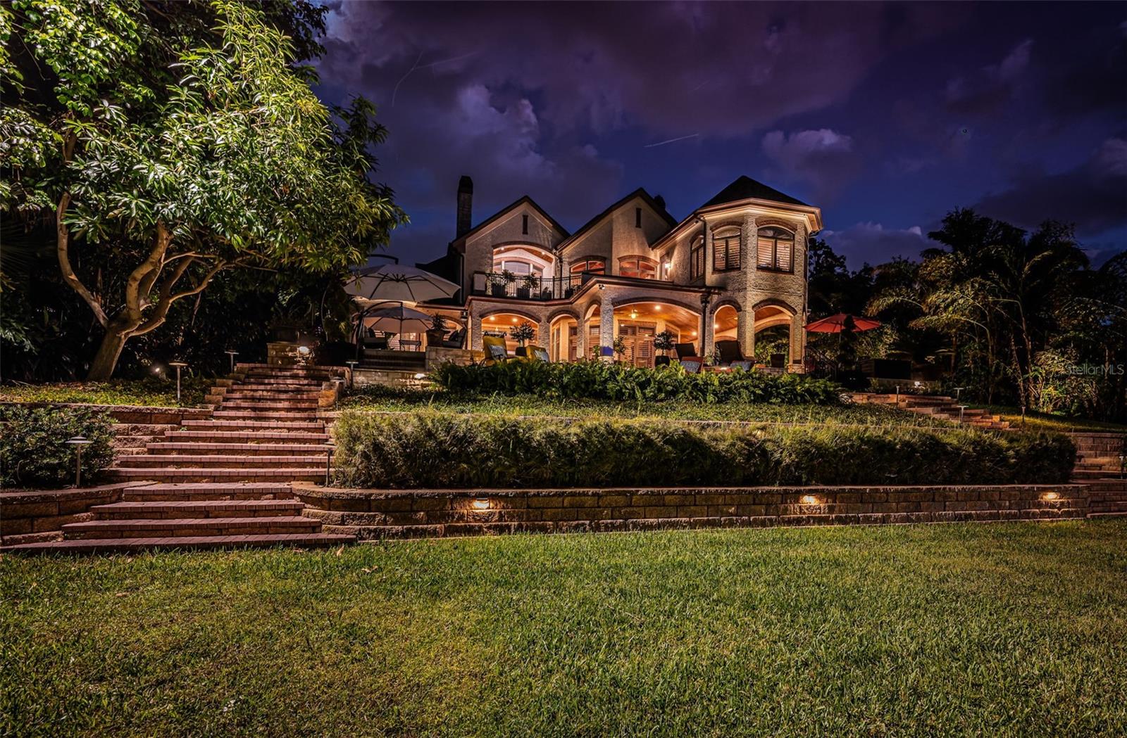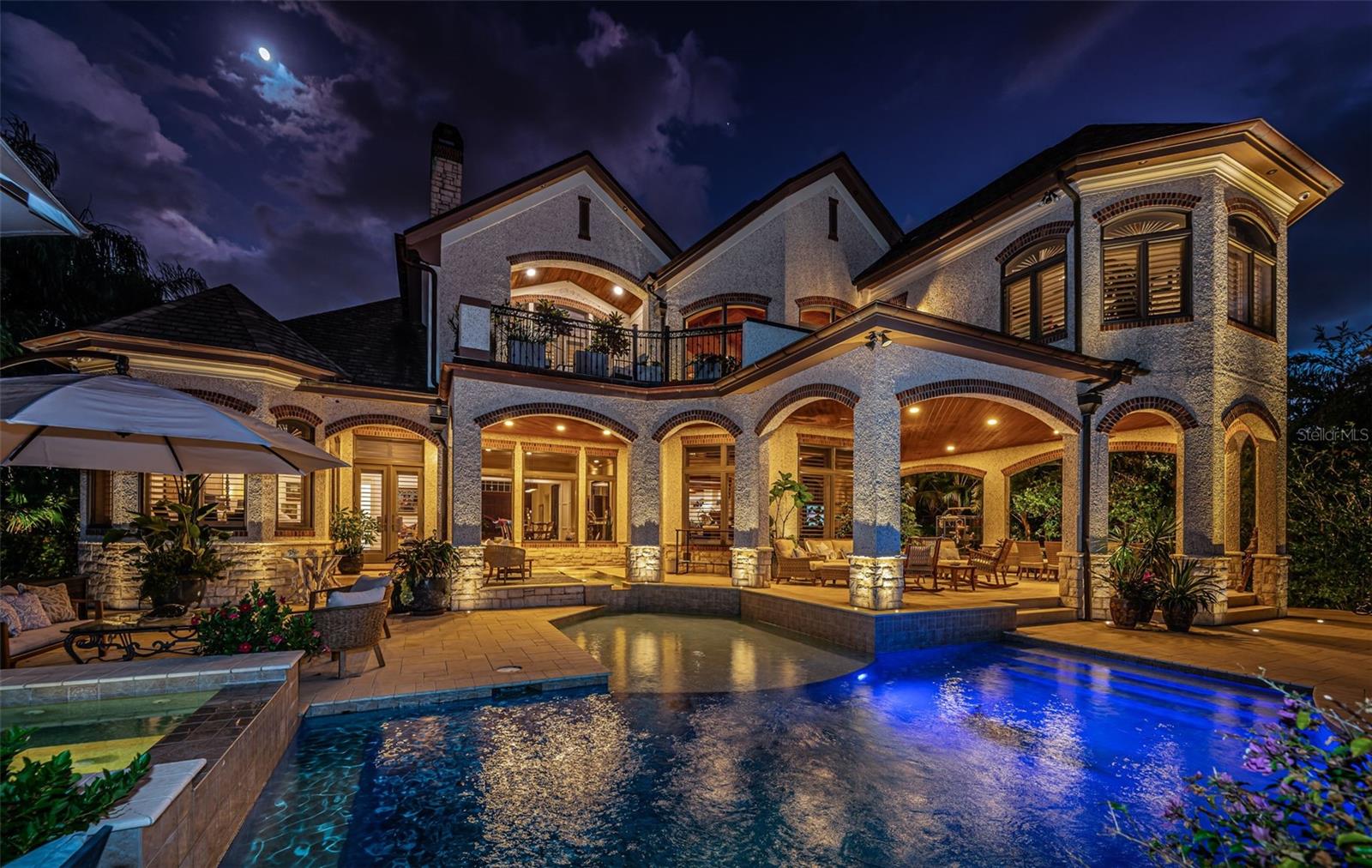 One or more photo(s) has been virtually staged. BRAND NEW SOLAR ROOF SIGNIFICANTLY REDUCES ELECTRICITY COSTS! Rising high above the bluffs of Belleair Causeway, this 1-of-a-kind landmark estate features astonishing finishes and the richest of uncompromising details across an unforgettable, picturesque waterfront setting. With a magical curb appeal resembling a Thomas Kinkaid master artwork, you’ll love the architectural composition, style and grace of this brilliant private executive enclave. Uniquely beautiful exterior finishes are complemented by a lush, inspiring landscape. Stately mahogany double-door entry introduces a soaring 23-ft high foyer with dazzling engineered contours and rare custom woodworking. Lovely dining/casual seating area delivers stunning views of your waterfront. Step through to the immense family room with 27ft-high wood-beamed ceilings, elegant wetbar with wine/beverage center, custom imported lighting, custom mahogany entertainment center, cast stone gas fireplace, and sweeping views of the pool deck and waterfront. The sumptuous gourmet kitchen is a 5-star culinary delight – with exquisite ogee-edge granite surfaces, impressive custom-designer cabinetry, Subzero/Wolf appliances, gas cooking, a large island breakfast bar, generous storage, an extraordinary butler’s pantry, and a robust dedicated work center. A resplendent den/receiving room is balanced by a fabulous CEO-caliber executive office with commanding views of the waterfront. Through fine double doors, the posh owner’s wing is a cloistered sanctuary; large waterfront bedroom with dedicated sitting area and tumbled-stone gas fireplace, is supported by a remarkable walk-in cherry closet system with built-in dresser. The owner’s bath is a plush pampering retreat – with white marble and Mahogany finishes, 2 large vanities, a superb Jacuzzi Spa and gorgeous all marble/glass rainshower enclosure. Upstairs, discover sublime custom mahogany book cases, lavish bedroom suites, and a multi-purpose fitness/media/art studio. Step out back to a mesmerizing outdoor entertaining environment. Supported by an opulent outdoor gas cooking center, the grand 1300sqft covered limestone paver deck enjoys seating in 4 distinct areas and boasts a stunning Pebbletec infinity pool/spa (with water features) that meanders throughout the covered/open deck areas. The unique backyard grounds are private and descend through 5 separate levels - including the pool deck, lounging deck, open game field, firepit deck, and boat dock. Dock includes a 12,000 lb. boat lift & dual jetski platform lift. There is so much to love about this astonishing residence. Its museum-quality feel boasts interior/exterior finishes that reflect a staggering level of luxury and world-class craftsmanship. Salt-chlorine pool water system, custom indoor/outdoor lighting, and scores of rich, value-added amenities. A magnificent architectural accomplishment and one of the finest waterfront estates anywhere on Florida’s Gulf Coast. Buyer to verify all dimensions. A number of interior images have been virtually staged.