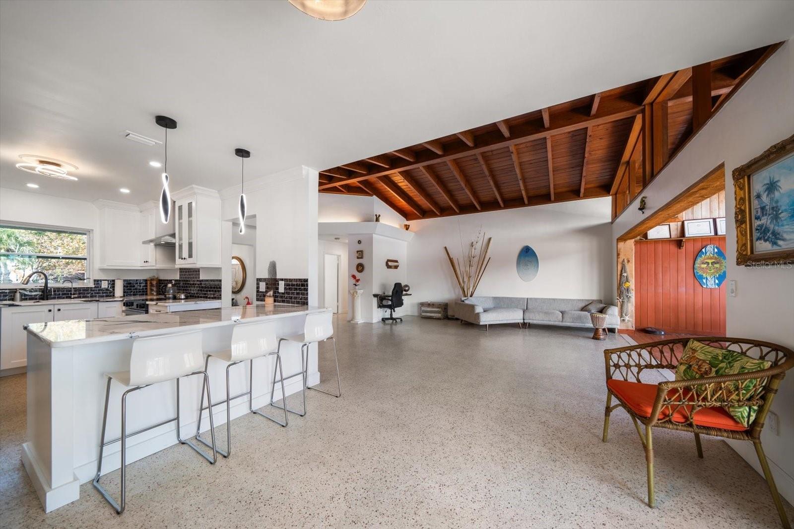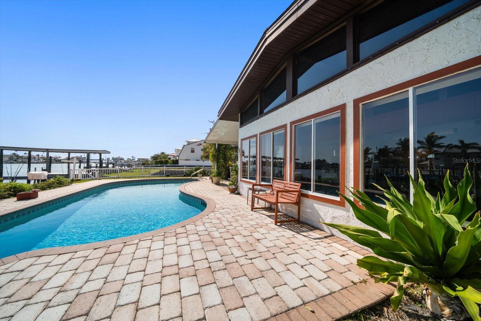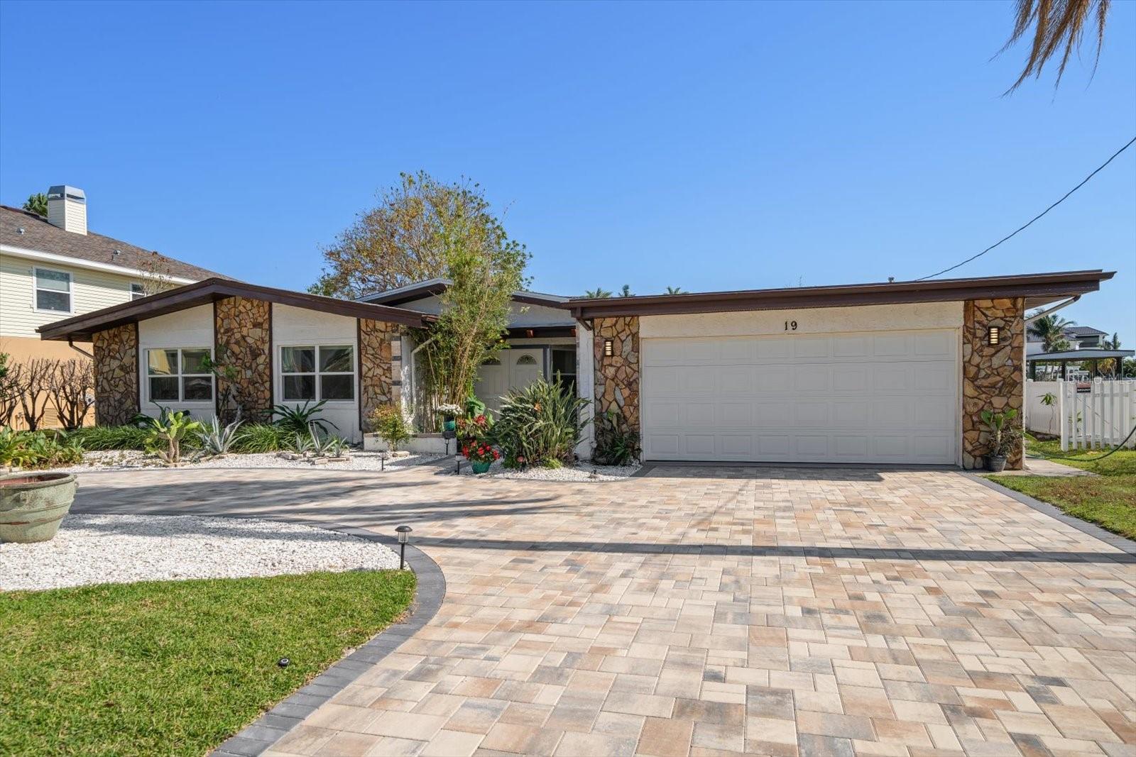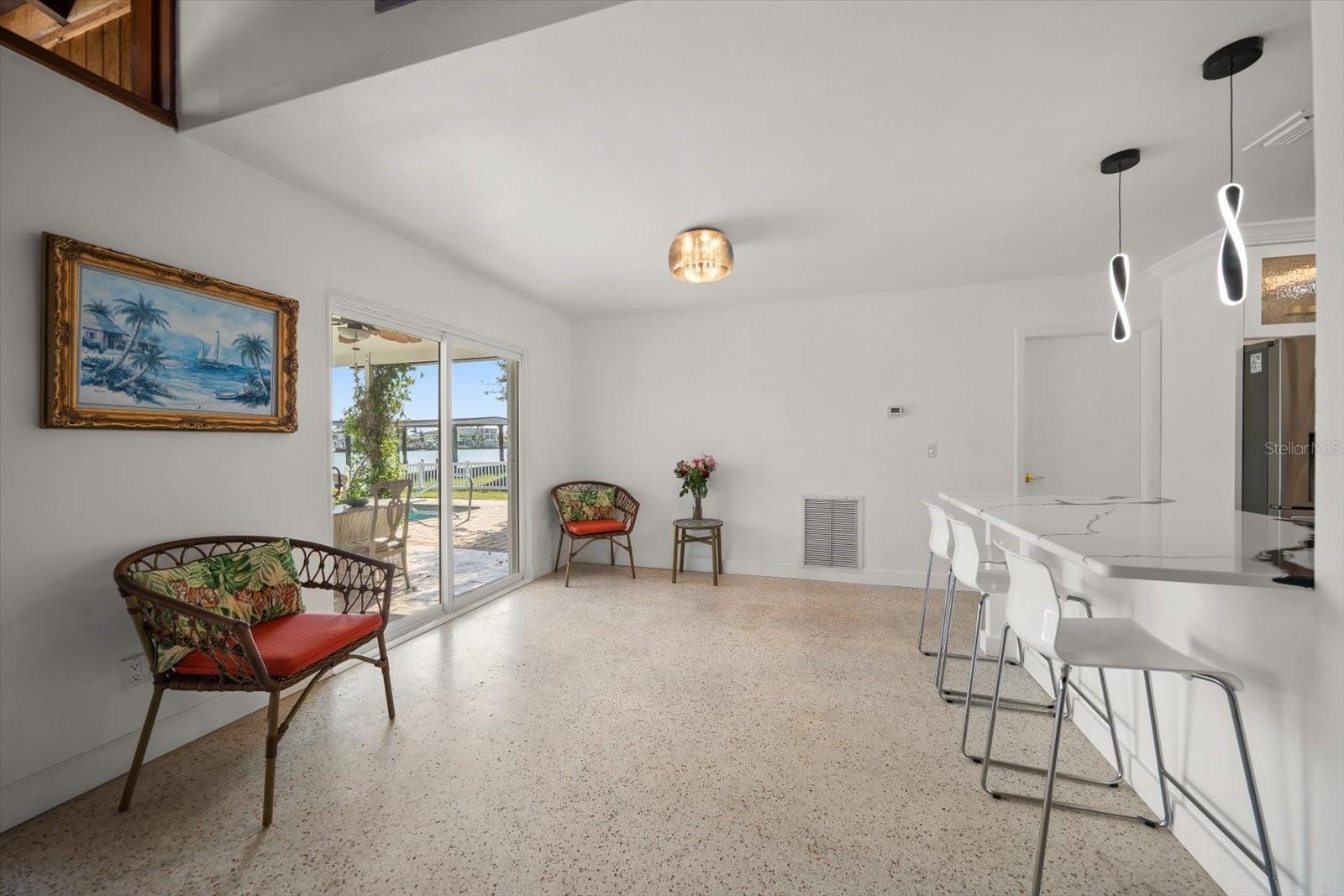 Welcome to this move-in ready Belleair waterfront home, where there is almost 3000 square feet of coastal contemporary style under roof. A brand-new pavered circular driveway sets the tone for the inviting curb appeal, while inside, the wide-open floor plan blends retro character with fresh, modern updates. Original terrazzo floors and wood-beamed vaulted ceilings create a warm, welcoming vibe, especially in the spacious family room where walls of floor-to-ceiling windows frame serene views of the sparkling pool and tranquil water beyond. The brand-new white kitchen is both stylish and functional, featuring quartz countertops, new appliances, a breakfast bar with chic pendant lighting, and seamless flow into the adjacent dining room with new sliders leading out to the pool and outdoor entertaining spaces. The primary bedroom is bathed in natural light and offers a functional, updated ensuite. Two additional bedrooms share a beautifully remodeled hall bath with a double sink vanity and tub/shower combo. A private flex room with beadboard ceilings and its own ensuite—tucked behind the garage—is ideal for a home office, guest suite, nanny quarters, or creative studio. For boating enthusiasts, this is a dream come true with easy access to the Intracoastal and Gulf. Enjoy the charm of Belleair’s small-town atmosphere, all while being just minutes from fine dining, boutique shopping, and the area’s renowned beaches.