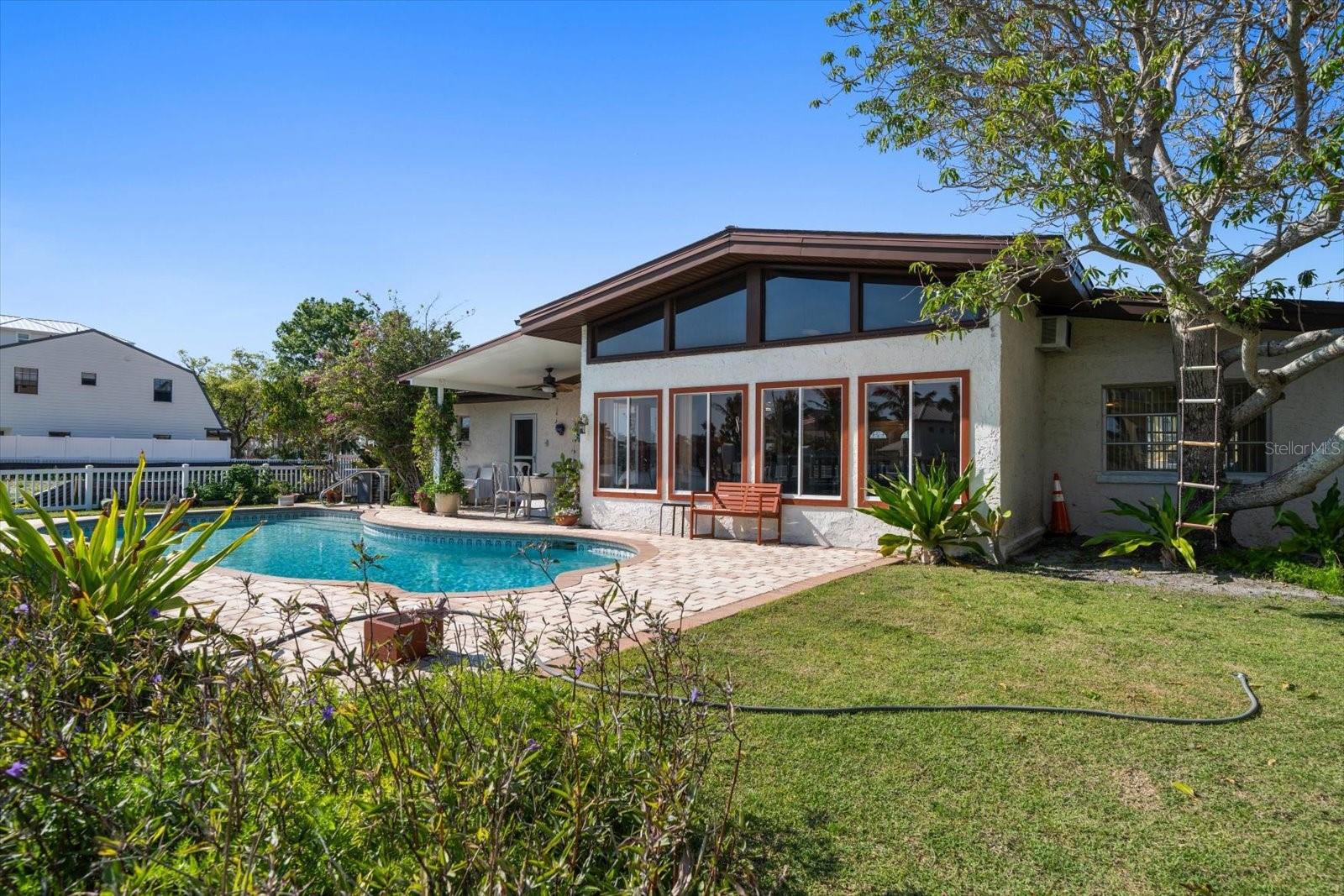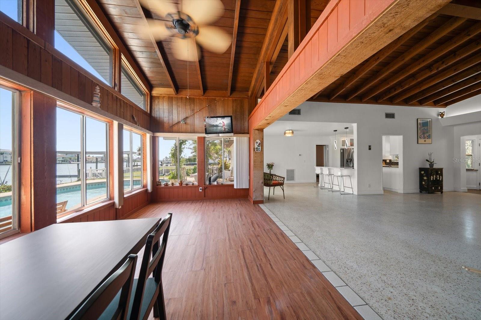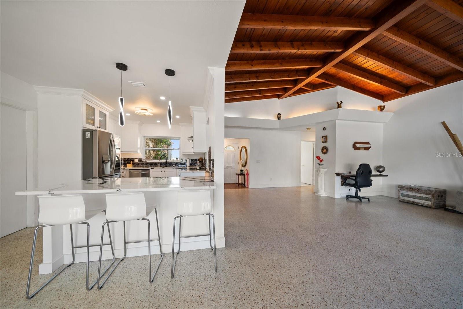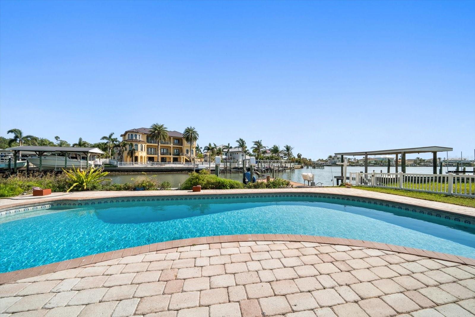 Welcome to this move-in ready Belleair waterfront home, where there is almost 3000 square feet of coastal contemporary style under roof. A brand-new pavered circular driveway sets the tone for the inviting curb appeal, while inside, the wide-open floor plan blends retro character with fresh, modern updates. Original terrazzo floors and wood-beamed vaulted ceilings create a warm, welcoming vibe, especially in the spacious family room where walls of floor-to-ceiling windows frame serene views of the sparkling pool and tranquil water beyond. The brand-new white kitchen is both stylish and functional, featuring quartz countertops, new appliances, a breakfast bar with chic pendant lighting, and seamless flow into the adjacent dining room with new sliders leading out to the pool and outdoor entertaining spaces. The primary bedroom is bathed in natural light and offers a functional, updated ensuite. Two additional bedrooms share a beautifully remodeled hall bath with a double sink vanity and tub/shower combo. A private flex room with beadboard ceilings and its own ensuite—tucked behind the garage—is ideal for a home office, guest suite, nanny quarters, or creative studio. For boating enthusiasts, this is a dream come true with easy access to the Intracoastal and Gulf. Enjoy the charm of Belleair’s small-town atmosphere, all while being just minutes from fine dining, boutique shopping, and the area’s renowned beaches.