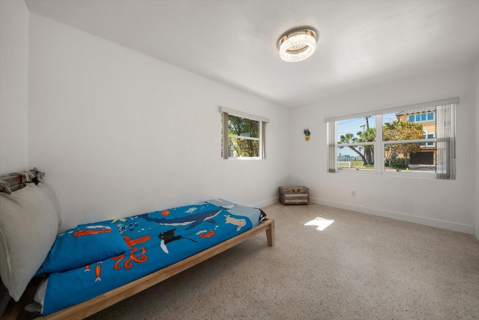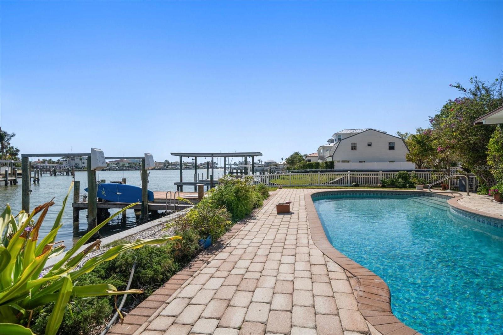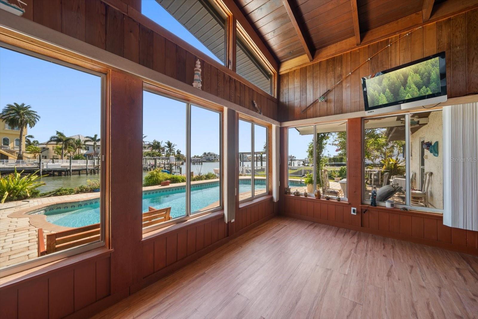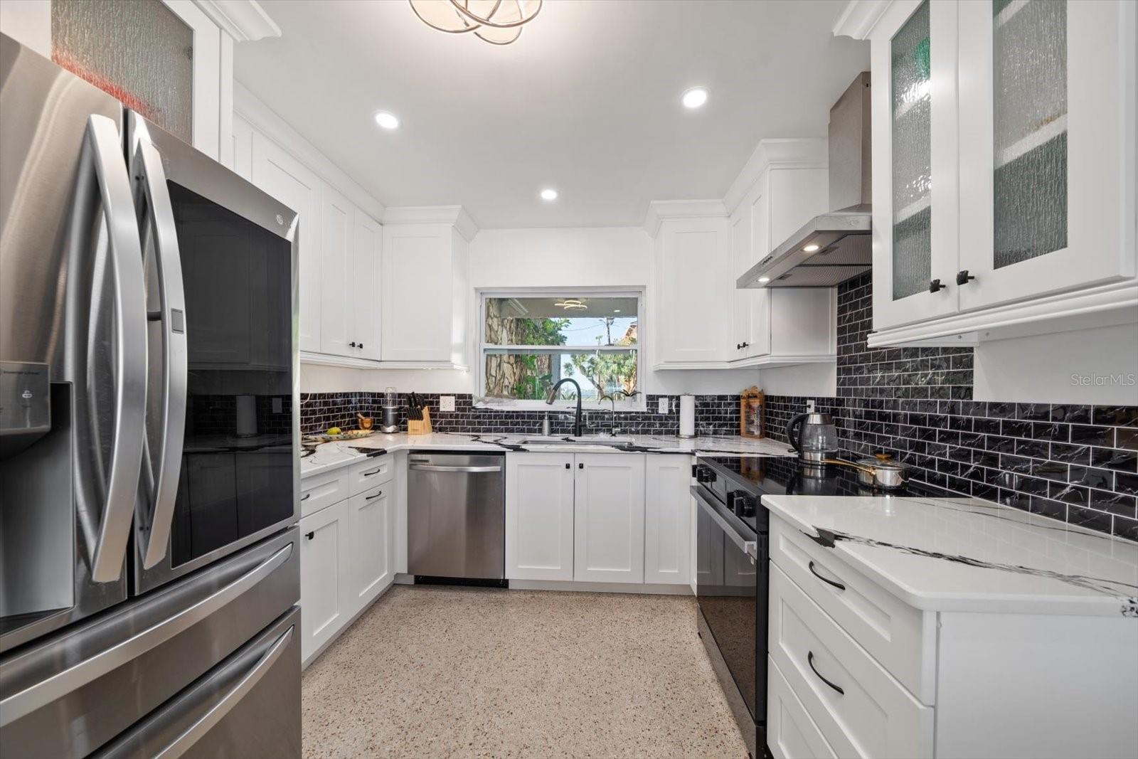 Welcome to this move-in ready Belleair waterfront home, where there is almost 3000 square feet of coastal contemporary style under roof. A brand-new pavered circular driveway sets the tone for the inviting curb appeal, while inside, the wide-open floor plan blends retro character with fresh, modern updates. Original terrazzo floors and wood-beamed vaulted ceilings create a warm, welcoming vibe, especially in the spacious family room where walls of floor-to-ceiling windows frame serene views of the sparkling pool and tranquil water beyond. The brand-new white kitchen is both stylish and functional, featuring quartz countertops, new appliances, a breakfast bar with chic pendant lighting, and seamless flow into the adjacent dining room with new sliders leading out to the pool and outdoor entertaining spaces. The primary bedroom is bathed in natural light and offers a functional, updated ensuite. Two additional bedrooms share a beautifully remodeled hall bath with a double sink vanity and tub/shower combo. A private flex room with beadboard ceilings and its own ensuite—tucked behind the garage—is ideal for a home office, guest suite, nanny quarters, or creative studio. For boating enthusiasts, this is a dream come true with easy access to the Intracoastal and Gulf. Enjoy the charm of Belleair’s small-town atmosphere, all while being just minutes from fine dining, boutique shopping, and the area’s renowned beaches.
