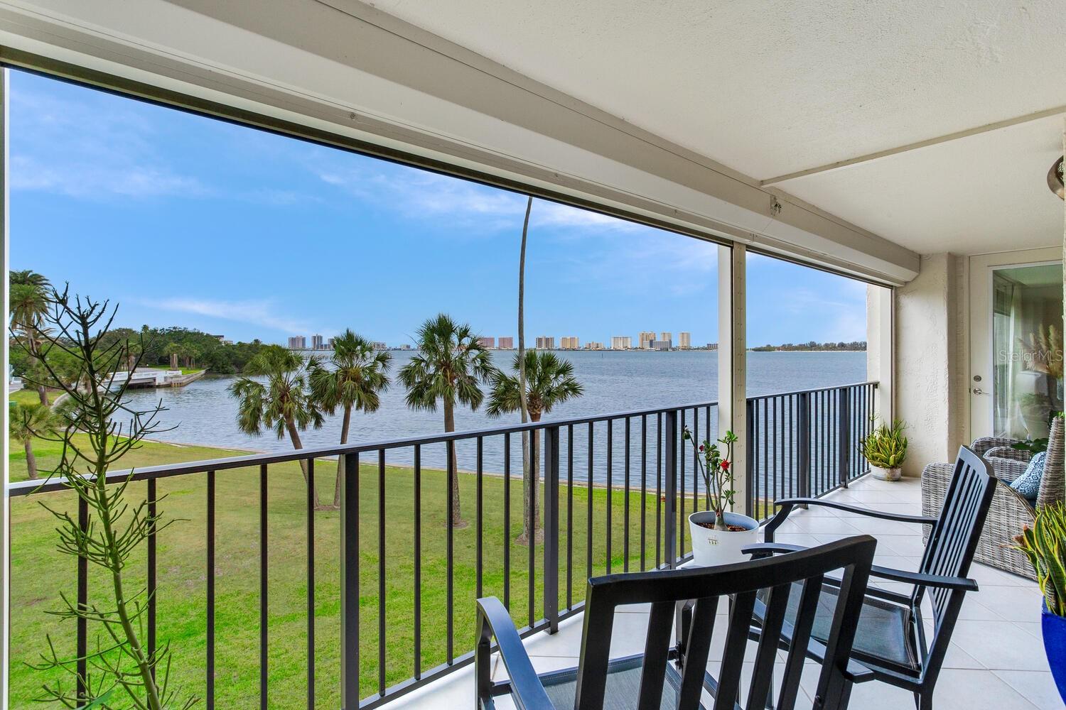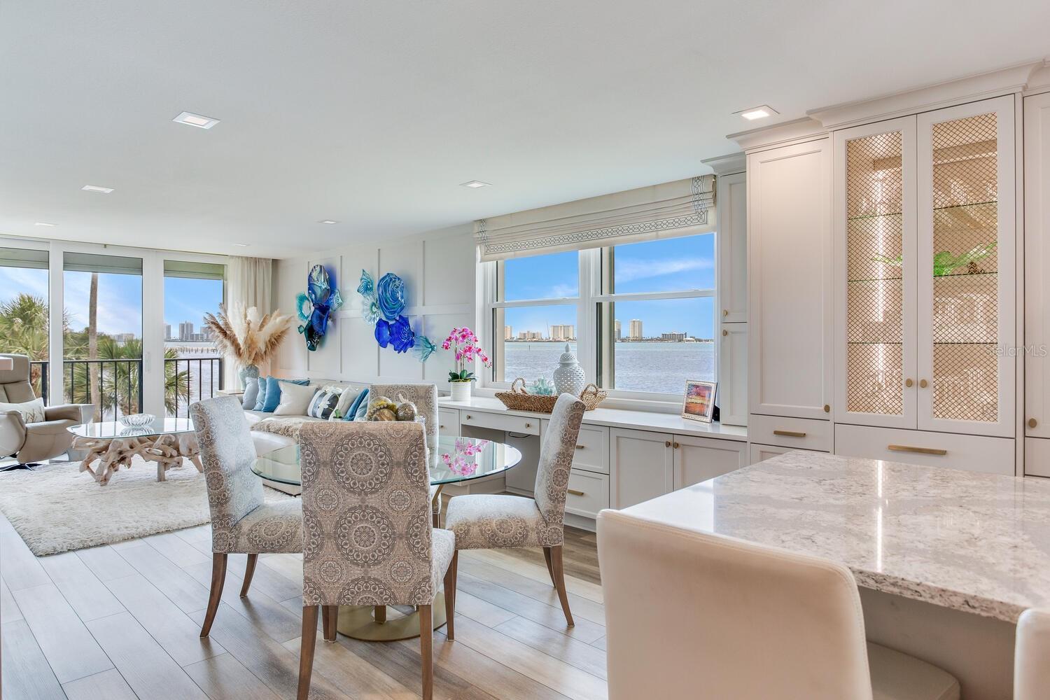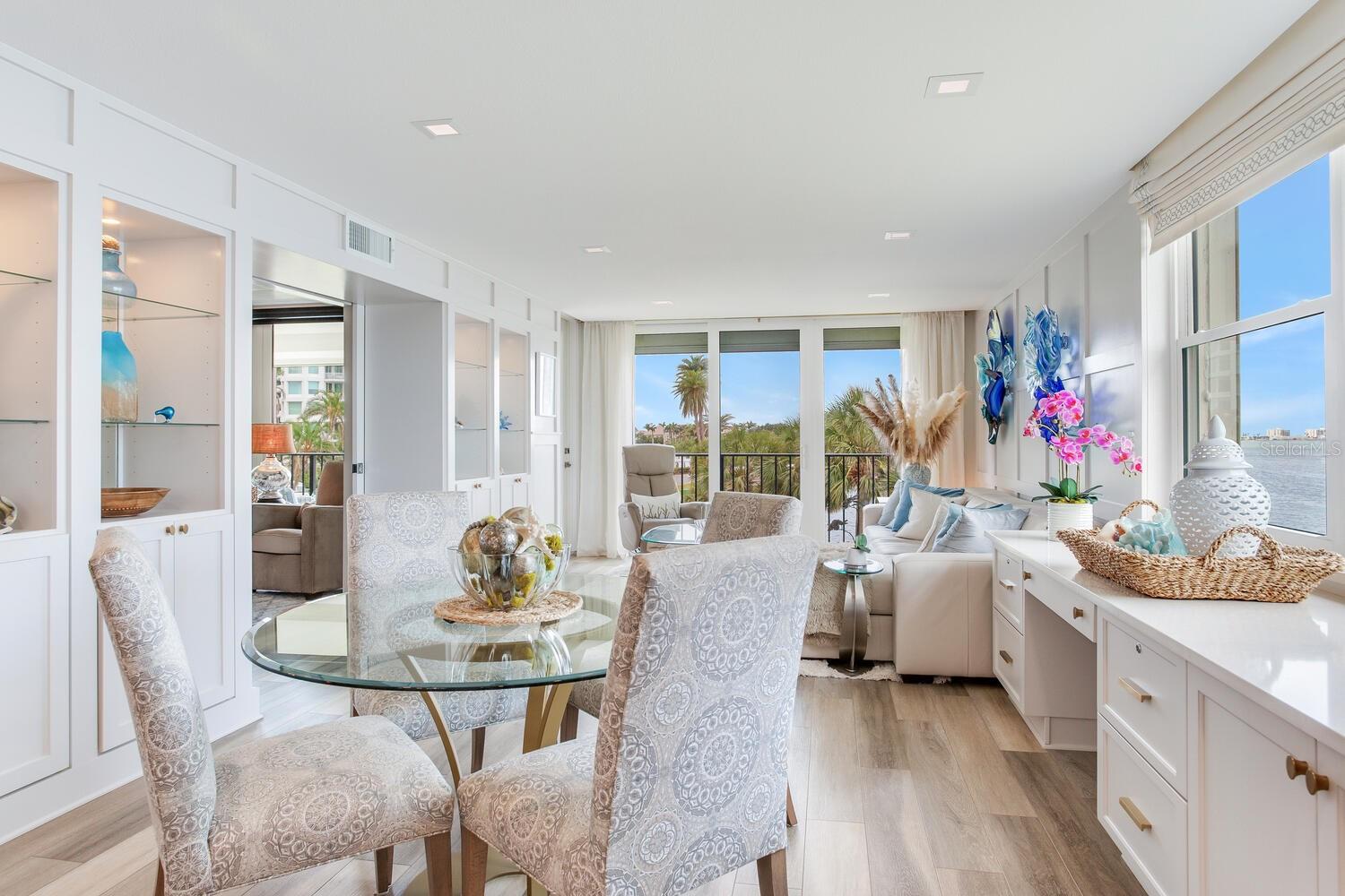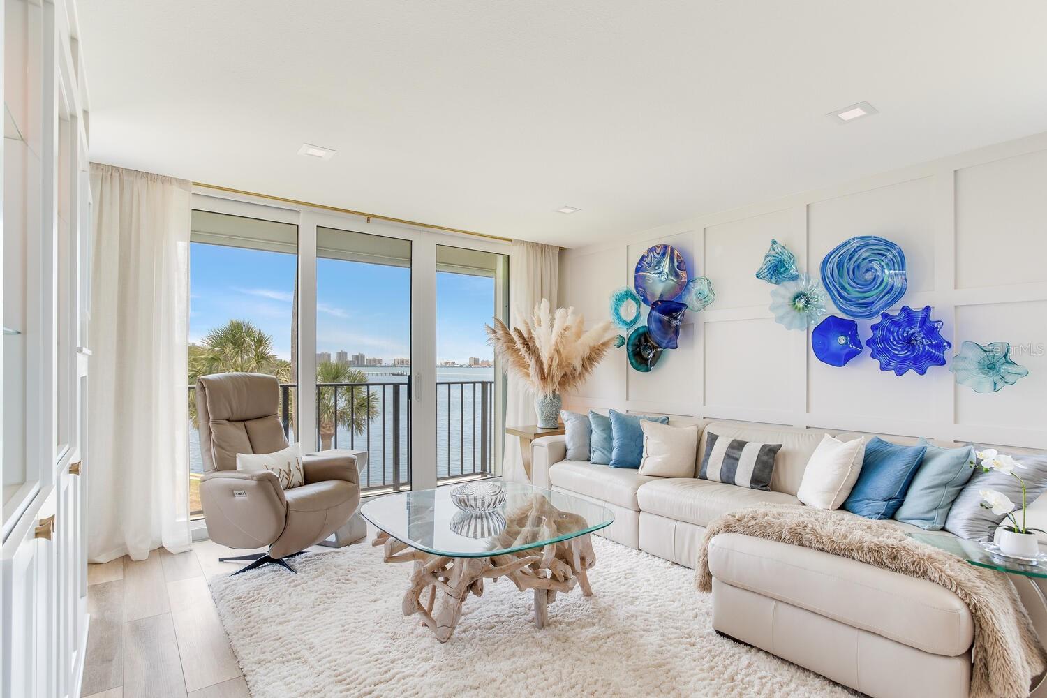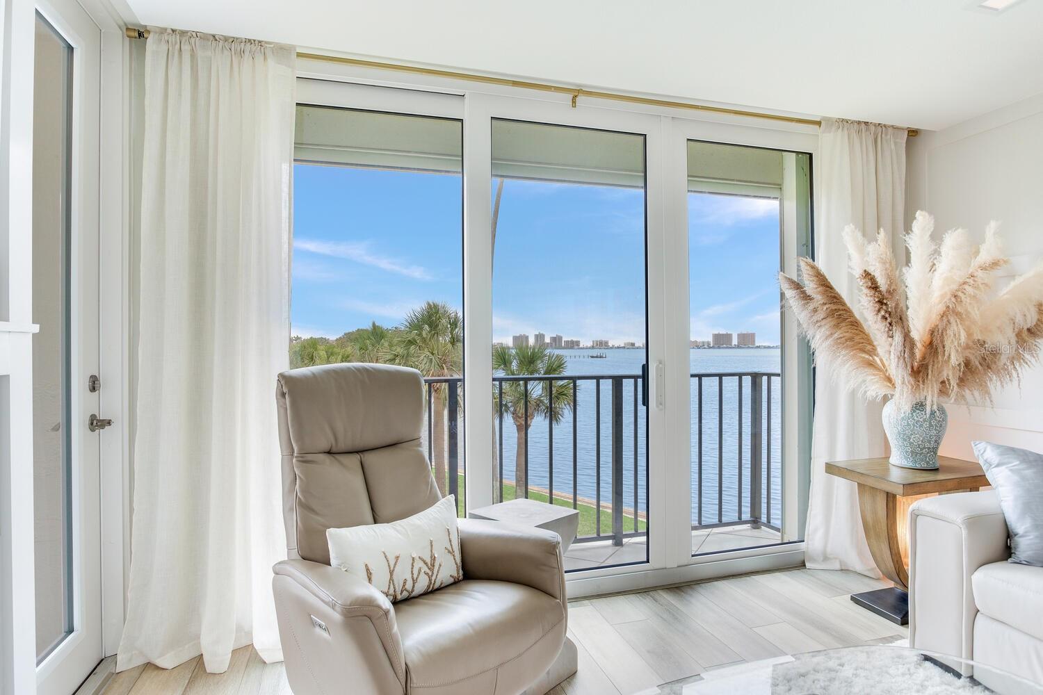 Live the coastal dream in this beautifully updated residence in the exclusive guard-gated Belleair Country Club community. Positioned to capture unbeatable sunsets, this southwest-facing corner condominium offers panoramic views of the Intracoastal Waterway, Sand Key Bridge and Memorial Causeway. Enter this fully remodeled two-bedroom, two-bath southwest corner unit, spanning 1,395 square feet, and experience the elegance of a thoughtfully upgraded interior. This light-filled home features smooth ceilings, new windows and doors (2020), and insulated exterior walls for enhanced comfort and efficiency. Custom finishes include wainscoting, cabinetry and storage throughout, window treatments, and interior glass-paneled doors that elevate the overall aesthetic. The chef’s kitchen is a standout with a quartz waterfall edge island and eat-in space, custom cabinetry with pullout drawers and extensive organization, and pullout pantry. Luxury appliances include a Bosch refrigerator, Wolf induction cooktop, Zephyr hood, Bosch oven and paneled dishwasher, under-counter microwave and a Pentair water filter. Take in the stunning direct west views from your built-in desk nook and living room adorned with wainscoting. The clever second bedroom, designed as a flexible living area with custom built-ins, is privately set behind pocket doors and can easily serve as a den, guest room or home office. A highlight of this unit is the oversized 26-foot waterfront balcony with southwest views of the Intracoastal. Hurricane shutters line the perimeter, providing peace of mind and allow you to safely leave your balcony furniture outdoors year-round. Showcasing floor-to-ceiling marble, the jewel box guest bath features a walk-in shower. The primary suite is a tranquil retreat, featuring a wainscot ceiling, custom closet cabinetry and floor-to-ceiling mirrored wardrobe doors. The en-suite bath boasts custom cabinetry, walk-in shower with built-in bench and a quartz double vanity. Discreet and conveniently located laundry closet off the hall has a stackable washer and dryer. Additional updates and features include air conditioner (2020), water heater (2025), water softener and new electrical panel. Private personal storage closet on the same floor and one premium assigned covered carport parking. This unit combines sophisticated style with unmatched views and updates, all in a secure, amenity-rich community. Building and grounds are meticulous and offer secure access to the recently updated lobby equipped with video monitoring. Newly renovated clubhouse and heated pool are directly on the Intracoastal Waterway with a sunset every night! In the guard gated community of Belleair Country Club and historic Belleview Inn. New owner qualifies for immediate golf membership, skipping the six-year waiting list, and a discount on initiation fee at the Belleair Country Club. Private marina with boat slips for rent or purchase are subject to availability. In the Town of Belleair with its own police department, town hall and recreation center with activities for all. Minutes to famous Gulf beaches, shopping, dining and excellent medical facilities. Close to downtown Clearwater, Dunedin and St. Pete. TPA airport is 30 minutes away and PIE is just 20 minutes. Floorplan Slide #41 VIMEO: https://vimeo.com/1085071812