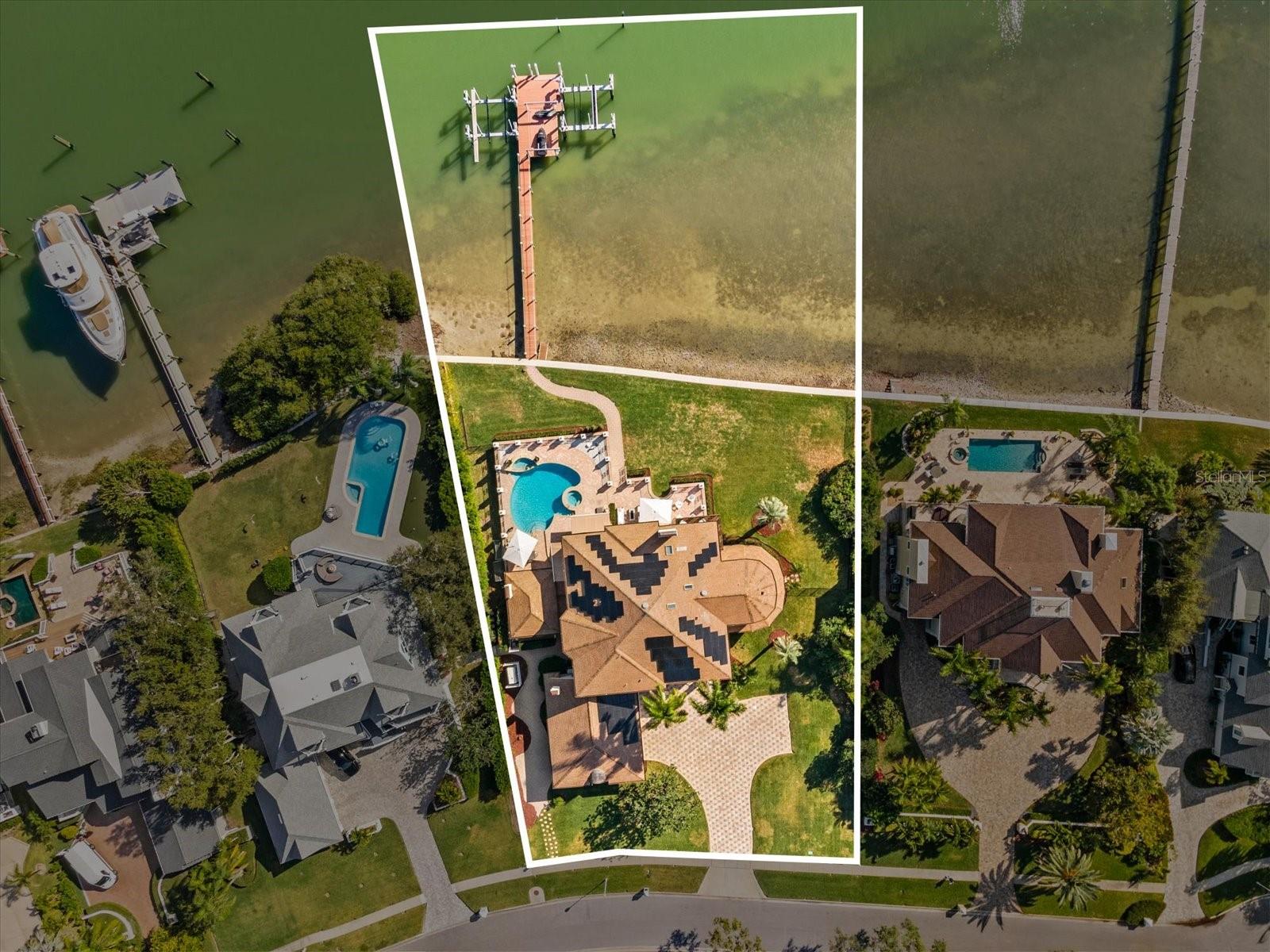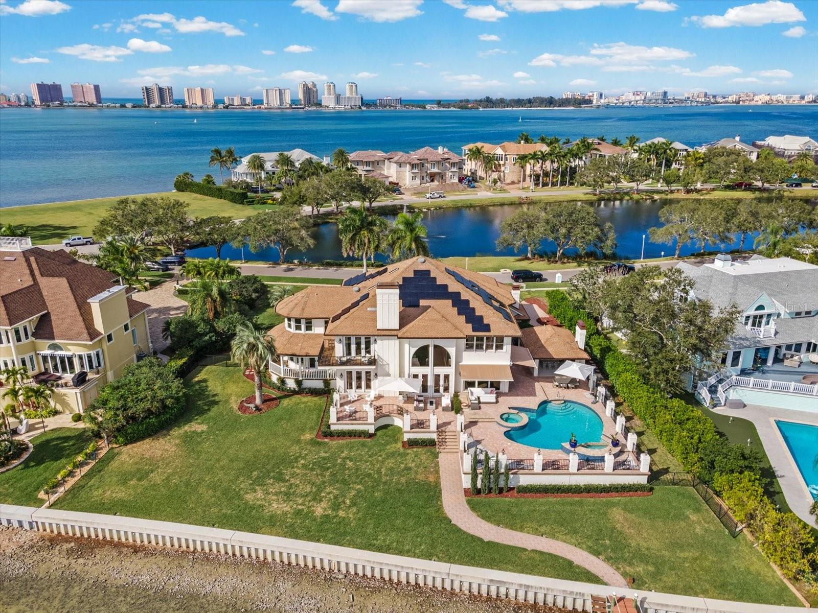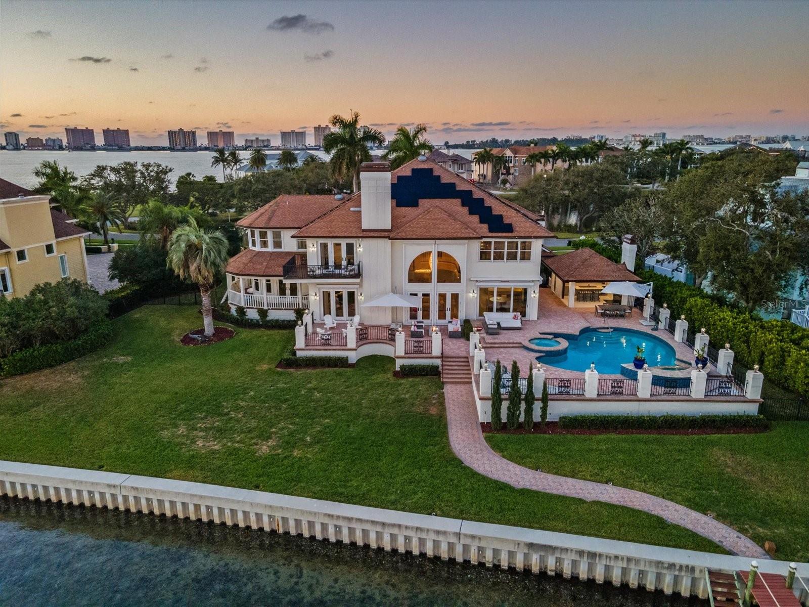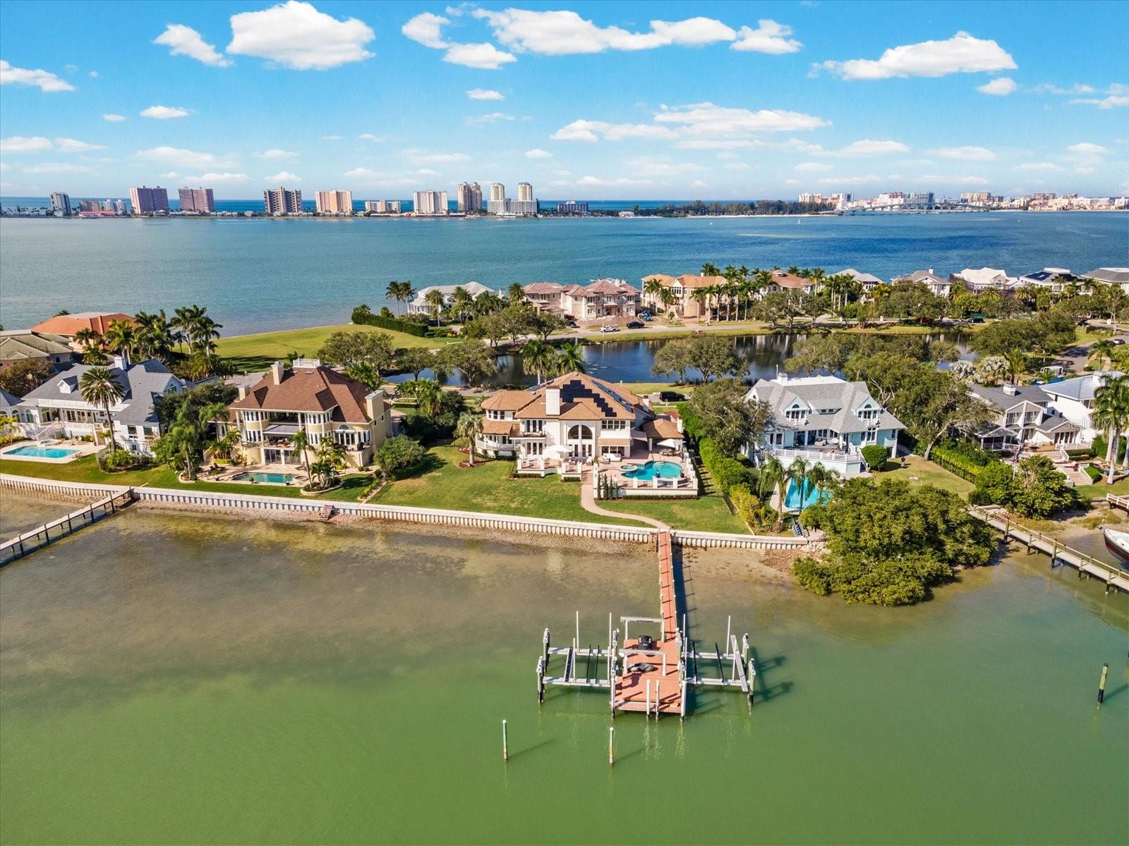 This private, world-class waterfront estate owned by the family of Formula One World Champion Nigel Mansell sits within the exclusive double-gated enclave of Belleview Island. Pole positioned on a rare double lot, the property offers breathtaking panoramic views of Clearwater Harbor and the historic Donald Ross–designed Belleair Golf and Country Club, Florida’s first golf course. A true boater’s paradise, the protected cove features a custom dock with a jet ski lift, along with 60,000 lb. and 80,000 lb. boat lifts, providing quick and direct access to Clearwater Pass and the Gulf of America. Inside, the custom-built residence showcases refined craftsmanship and elegant living spaces. A grand, custom staircase introduces the home and opens into an expansive great room designed for sophisticated entertaining, complete with a dining area, wet bar, custom built-ins, and sweeping water views. The gourmet kitchen offers a large island, custom cabinetry, granite countertops, a butler’s pantry, and a charming breakfast room overlooking both the bay and golf course. The second floor is a private retreat featuring a luxurious primary suite with its own balcony, vaulted ceilings, fireplace, and dual spa-caliber bathrooms—one with a walk-in shower and the other with a whirlpool tub—plus two walk-in closets. Three additional guest suites each include marble bathrooms and walk-in closets. Outdoor living is exceptional, with a beautifully designed pool house featuring an open wood ceiling, wine refrigerator, and grilling area, all overlooking an elegant paver pool deck. The 1,100 sq ft air-conditioned three-car garage offers high ceilings ideal for car lifts, while the landscaped grounds and custom paver driveway enhance the home’s grand presence. Engineered for long-term resilience, this elevated block construction features custom electric hurricane shutters, a whole-home Generac generator, and a new seawall (2023). The home further benefits from updated AC systems (all under warranty), a new pool and hot tub heater, tankless water heater, water softener, solar panels, LED lighting throughout, and numerous updated appliances. This exceptional residence combines pedigree, privacy, craftsmanship, and unmatched waterfront living. Secure your place in the winner's circle and experience one of Belleview Island’s finest estates.