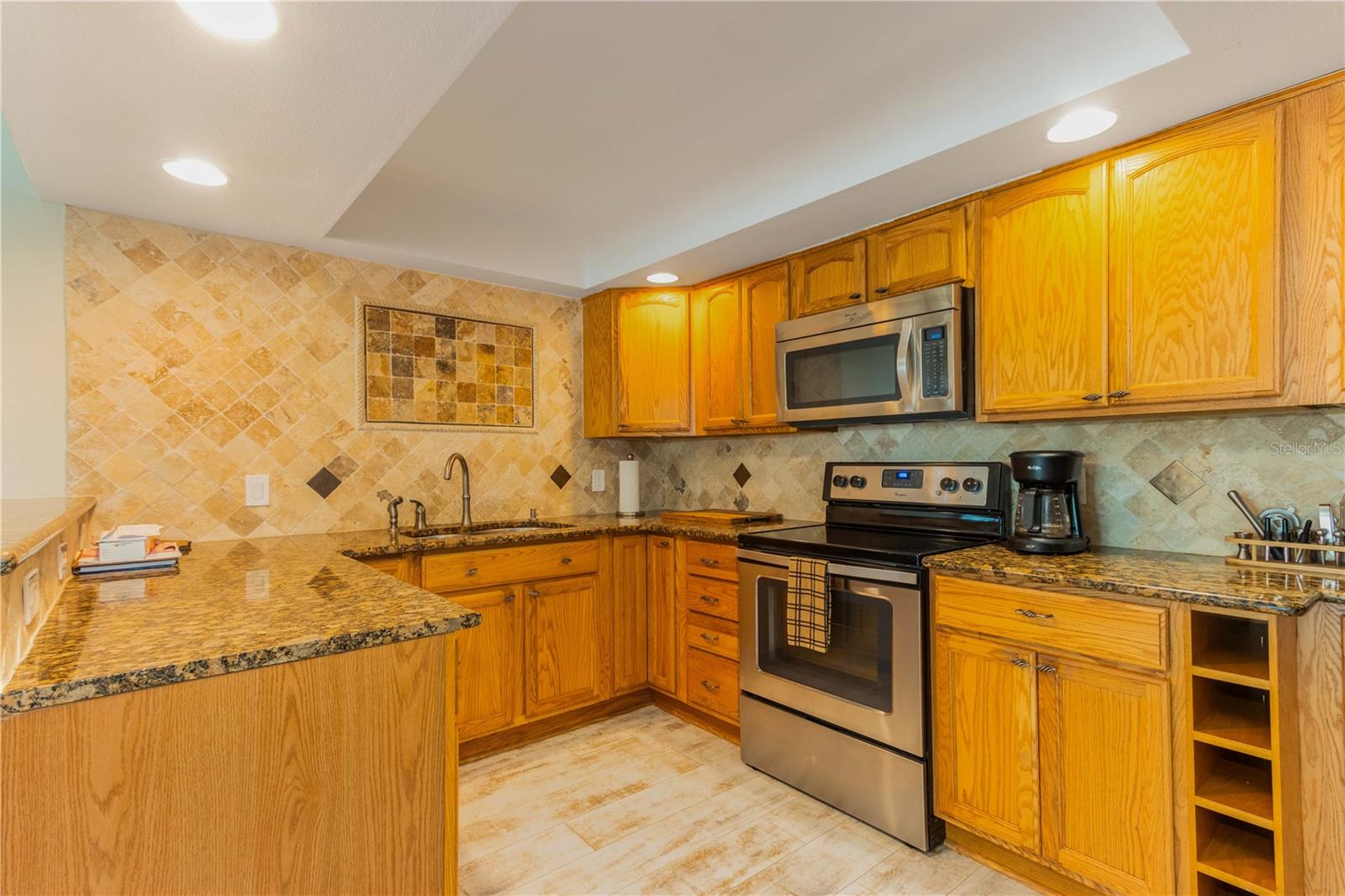 Beautiful coastal living in desirable Belleair Country Club! This unit has gone under extensive renovations including newer oakwood kitchen cabinetry with granite counter tops, stainless steel Whirlpool appliances, tumbled travertine stone backsplash, impact-rated PGT sliding doors, wood-like laminate floors thru out the living areas, and recessed lighting. Primary bedroom include spacious double closets, updated en-suite bathroom with ceramic tiles, white double sink vanity with beautiful white Carrara marble, walk-in shower and linen closet. Guest bathroom is also updated with stone-like grey porcelain tiles, sink with white Carrara marble, walk-in glass door shower. Huge balcony to enjoy outdoor entertaining and watch the sunsets! Owning in this exclusive community offers many amenities including a discounted membership for the Country Club which includes the recently renovated two championship 18-hole golf courses! Bedroom Closet Type: Built In Closet (Primary Bedroom).