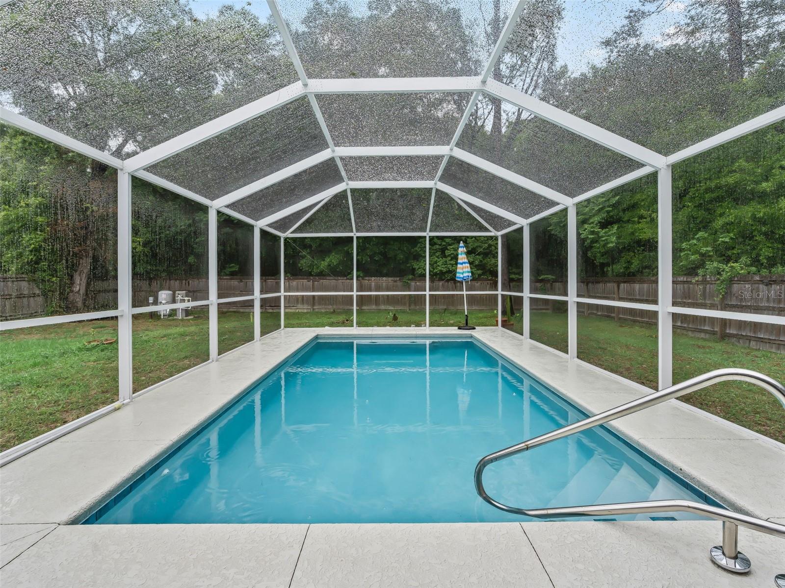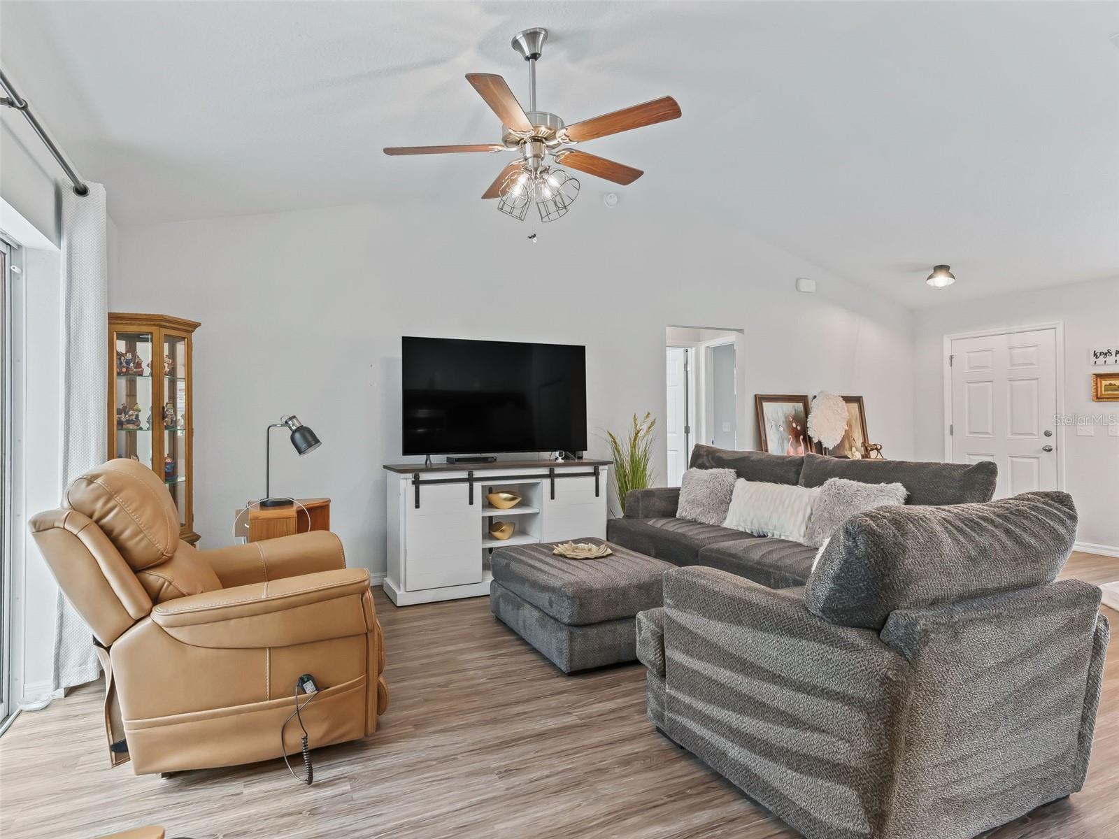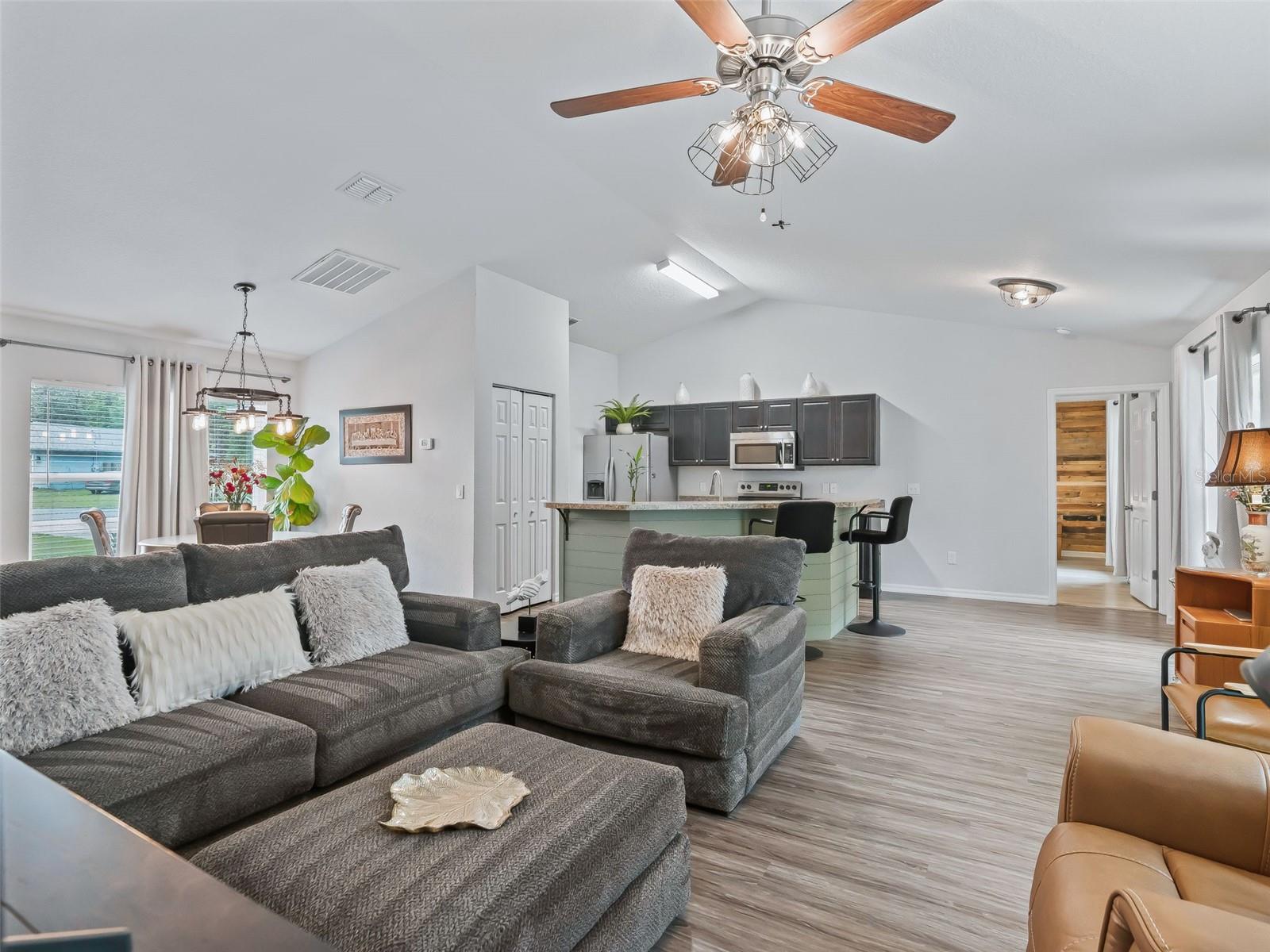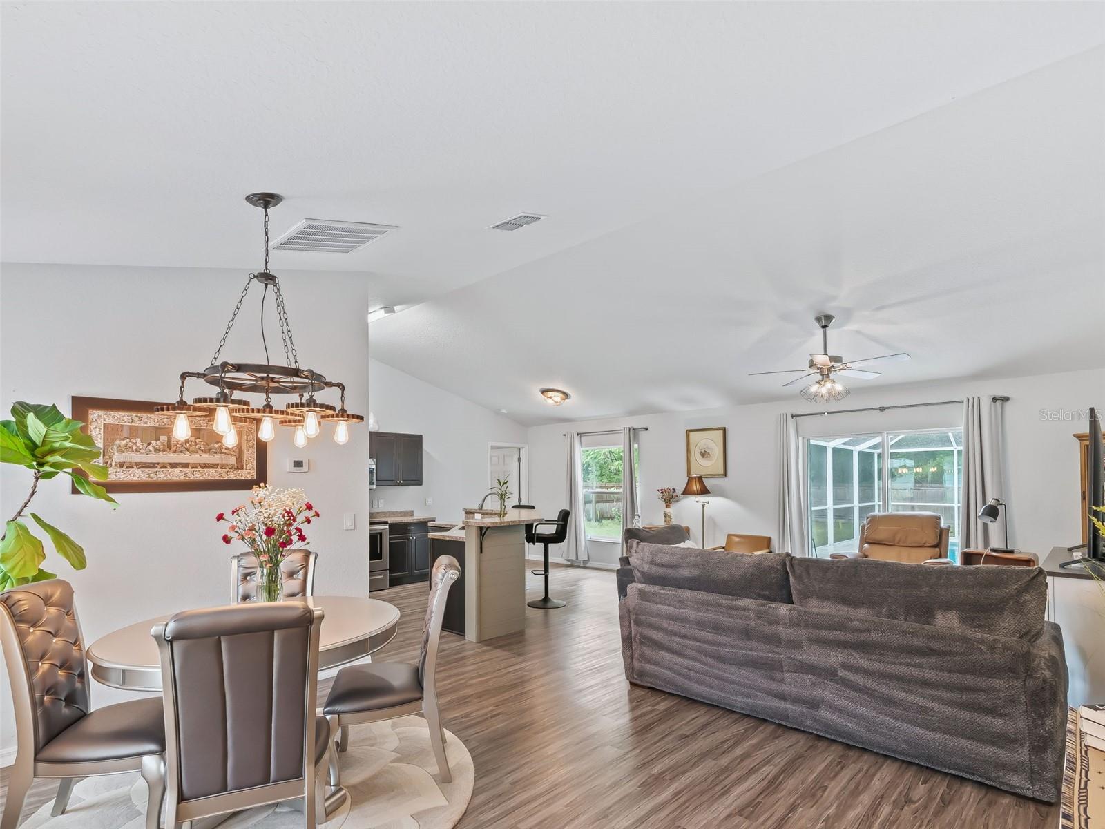 Under contract-accepting backup offers. Nestled in Belleview’s sunny skies subdivision, 6775 SE 122nd Lane is a beautifully crafted pool home built in 2019, offering comfort, style, and a prime central location between Ocala and The Villages. This thoughtfully designed Carnation model features durable block and stucco construction and has been enhanced with a stunning in-ground Saltwater pool added in 2022, equipped with the heating and cooling control, creating the perfect Florida retreat. The home offers three bedrooms and two full bathrooms within 1,416 square feet of air-conditioned living space, and 1,870 total square feet under roof. A desirable split-bedroom layout provides added privacy, while vaulted ceilings and an open-concept living and dining area create a bright, spacious feel throughout. The living room is especially inviting, with sliding glass doors that open directly to the sparkling pool and private, fully fenced backyard—ideal for relaxing or entertaining. The kitchen is both functional and charming, featuring warm wood cabinetry, high-definition laminate countertops, stainless steel appliances, and a stylish shiplap accent wall at the sink. Just off the kitchen, you’ll find a convenient indoor laundry room complete with washer, dryer, and upper cabinetry, as well as access to the attached two-car garage. Luxury vinyl flooring flows seamlessly through the main living areas, while the bedrooms offer cozy carpeting. The primary suite is a peaceful retreat with a walk-in closet and an updated en-suite bathroom showcasing a beautifully remodeled shower. Guest bedrooms and the guest bath are thoughtfully situated on the opposite side of the home for maximum privacy. Step outside to enjoy the expansive 18’ x 35’ pool area, surrounded by a wood-fenced backyard that offers both privacy and tranquility. Conveniently located near shopping, dining, medical facilities, and just minutes from the VA Medical Center in Summerfield, this home combines modern living with everyday convenience. This lovely property is move-in ready and waiting for you—schedule your private showing today.