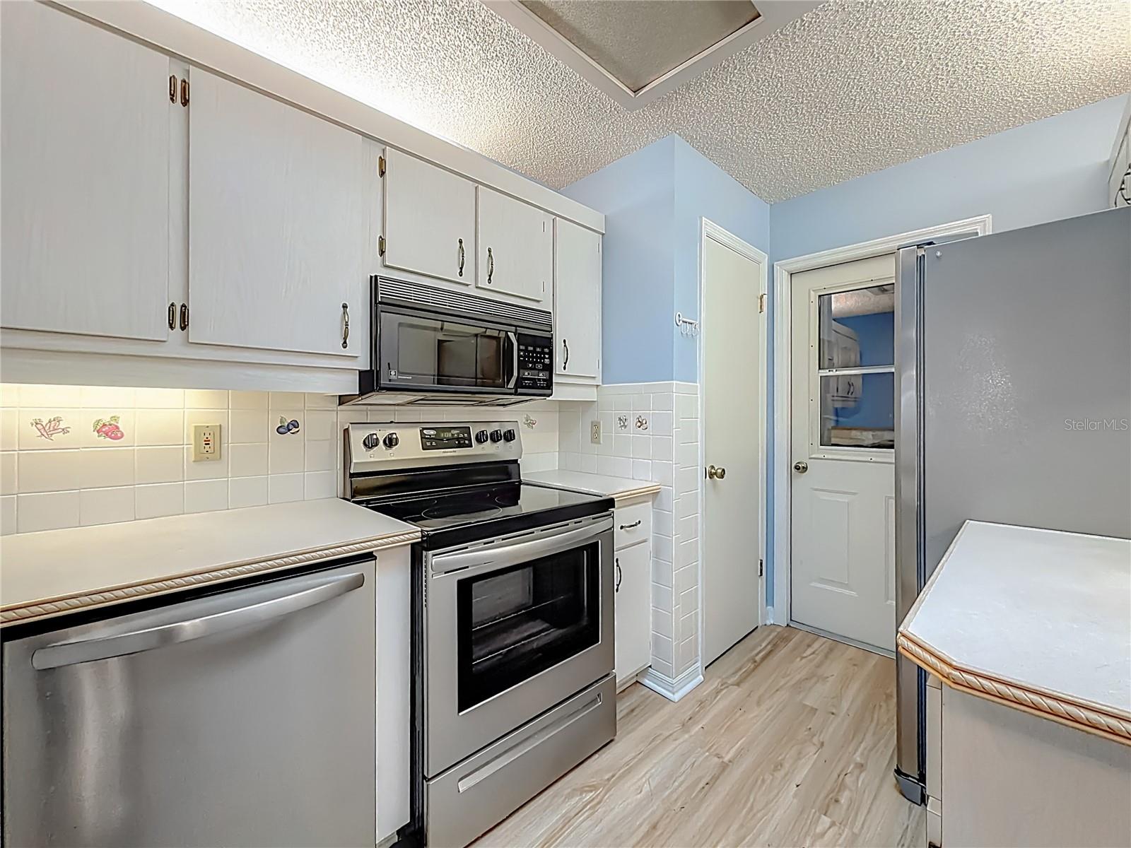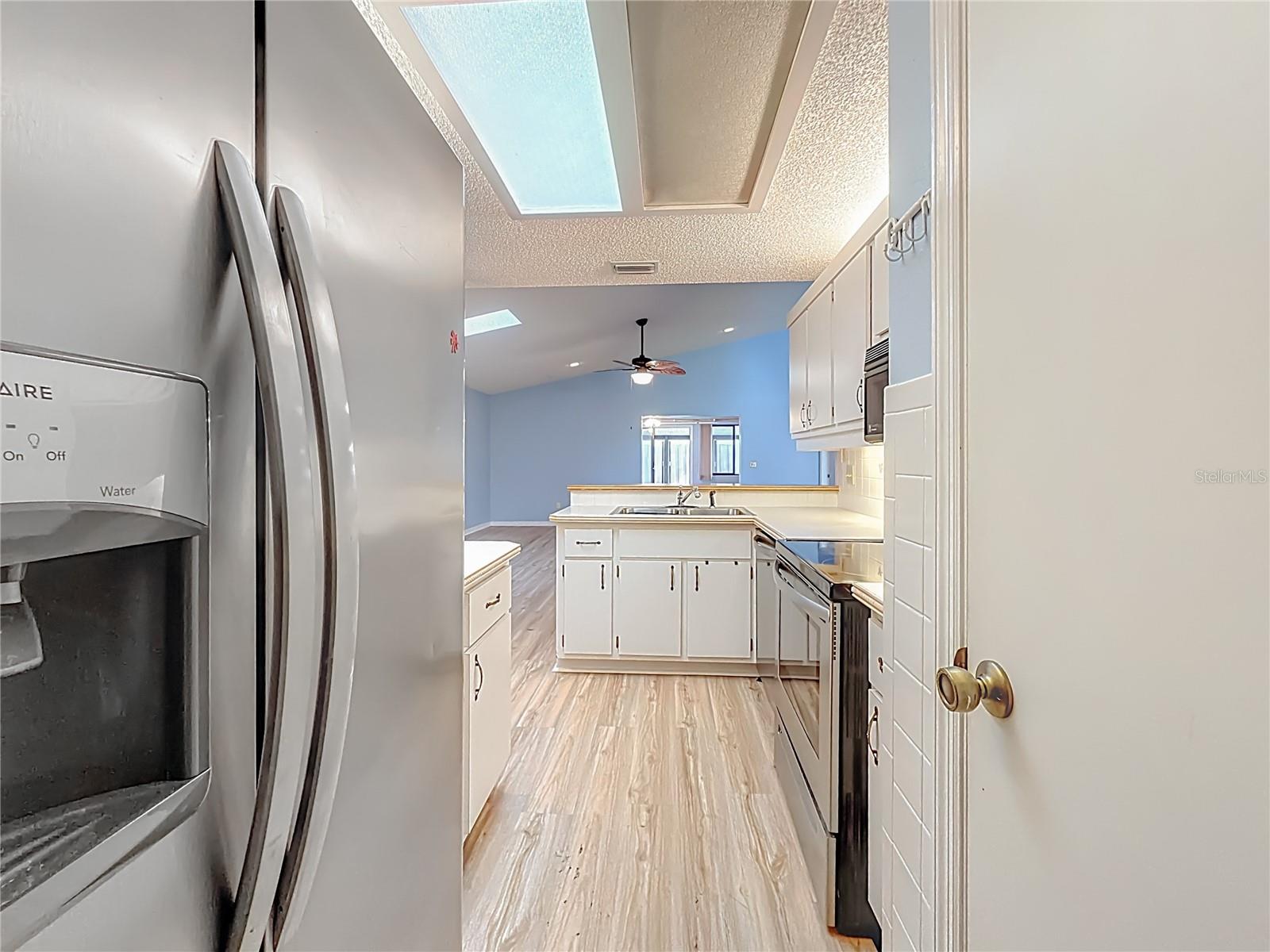 Beautiful villa in gated Villas of Bellevue featuring the largest floor plan in the community. Wood laminate flooring throughout, stainless steel appliances, skylights, and sliding glass doors provide a bright, open feel. Bonus den/office offers flexible living space. Enjoy a large screened-in patio and private backyard—perfect for relaxing or entertaining. Glass front door adds curb appeal. Garage includes extensive built-in cabinetry and a screened closure door for added functionality. Community amenities include a clubhouse and swimming pool. Low-maintenance living in a desirable gated neighborhood. Schedule your private showing today!