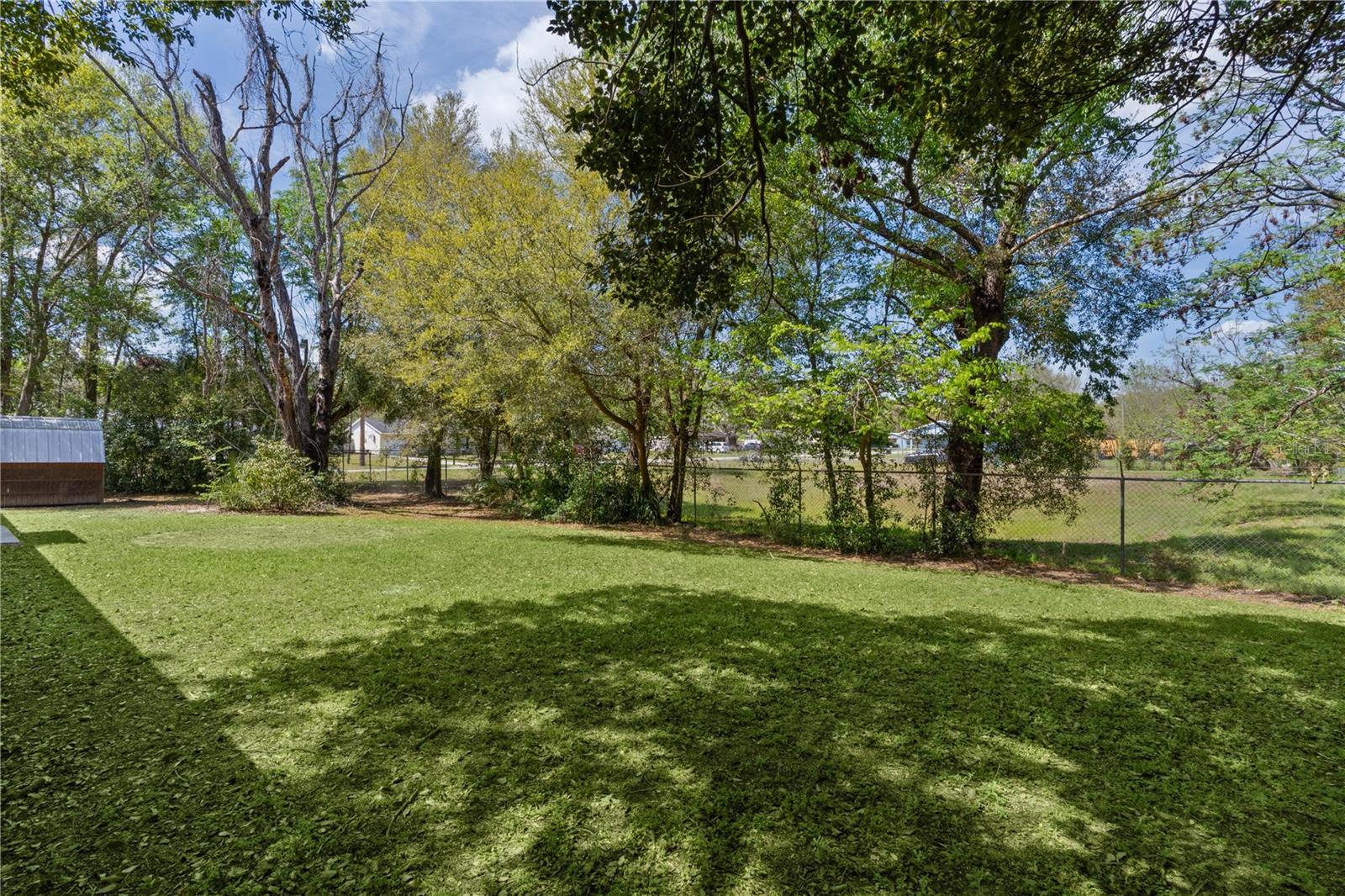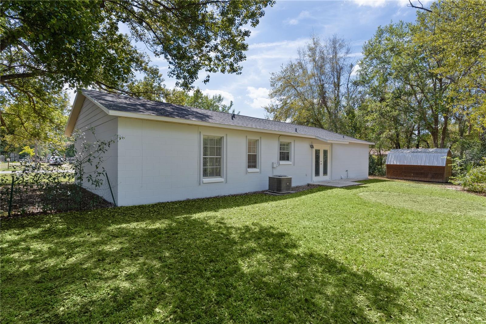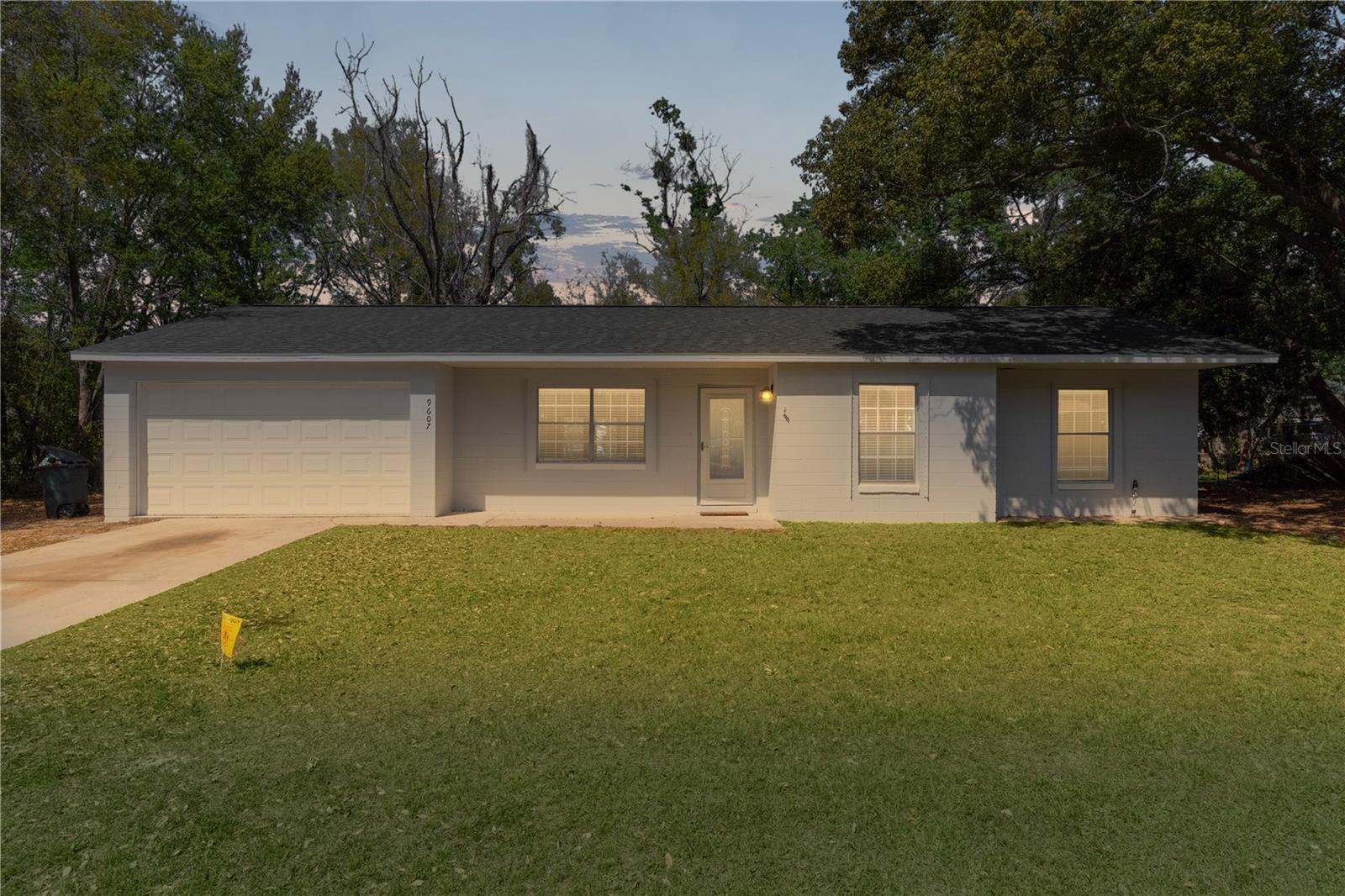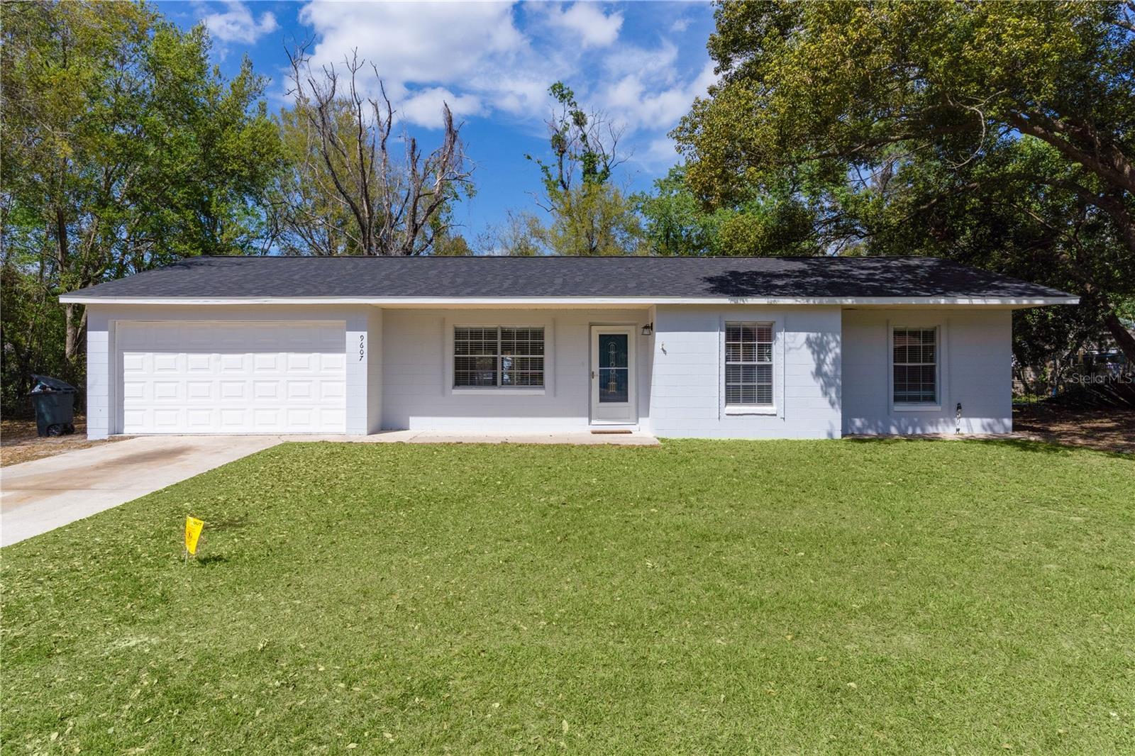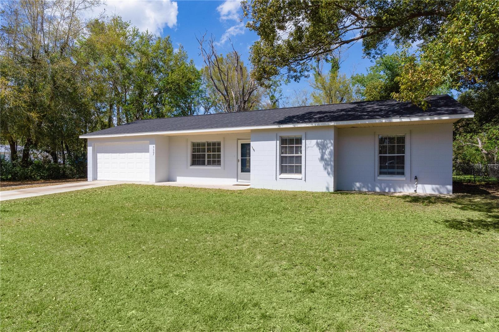 Fabulous 3 bedroom, 1 ½ bathroom block home nestled on a large corner homesite. Featuring a one car garage, private backyard with large shed. BRAND NEW ROOF 2/2025 and freshly painted exterior. Great primary home or investment property. This .30 acre (13,000 sq ft) sit in a nice neighborhood with NO HOA and no neighbors in the back (retention pond in back). Spacious living room just off the dining room that has easy access to the back yard through the French doors. The kitchen was updated a few years ago with wood-look tile floors, bead board cabinets, counter tops and matching back splash. Appliances included. Tile in the kitchen and vinyl floor throughout the rest of the house. The master bedroom has a half bath. Large laundry room with a BONUS office space with entrance or can be used for storage. All the windows have exterior mounts for the aluminum hurricane shutters. Partially fenced backyard. It is located near Lake Weir for fishing, boating, swimming and wildlife viewing.