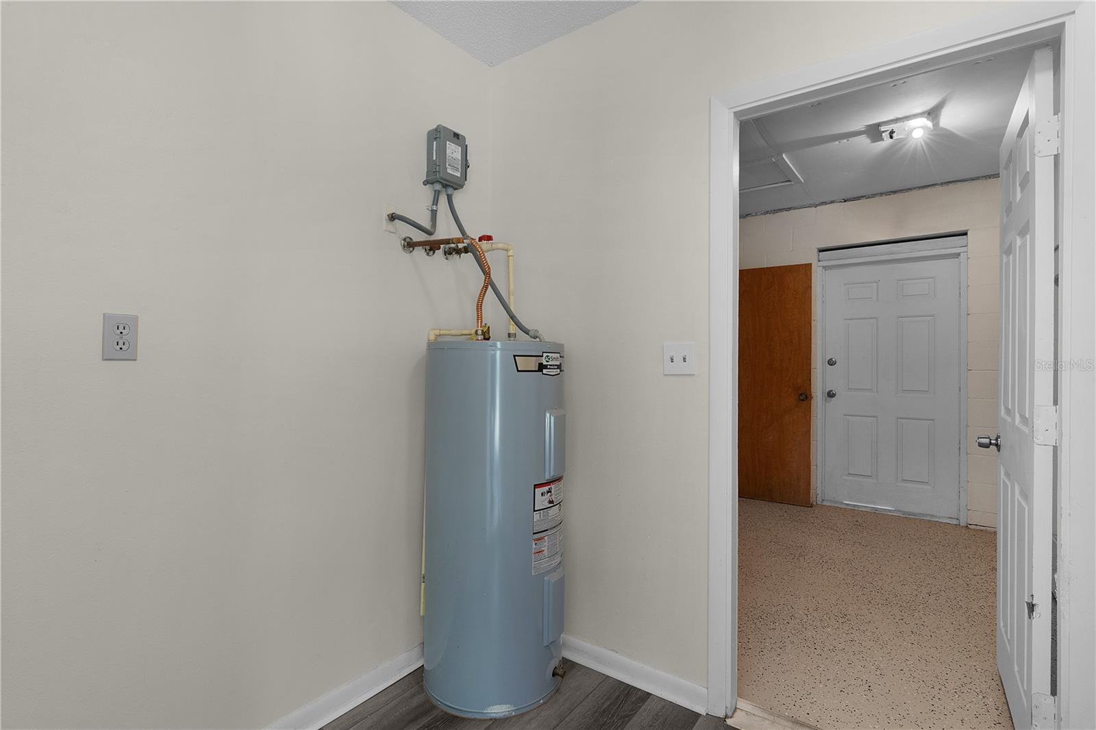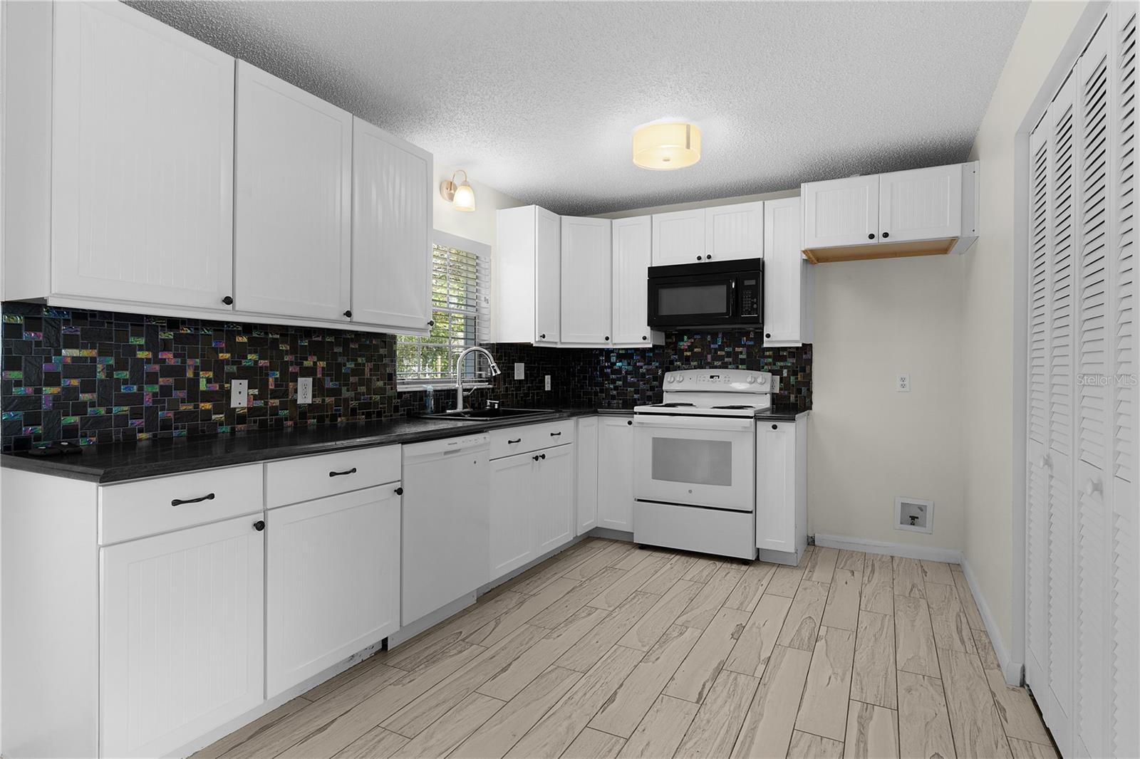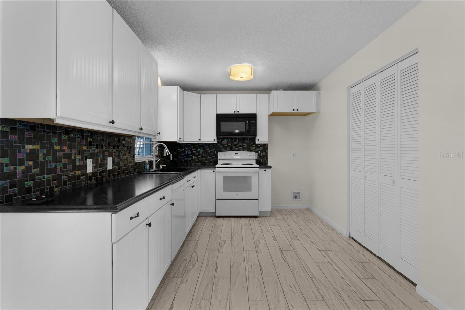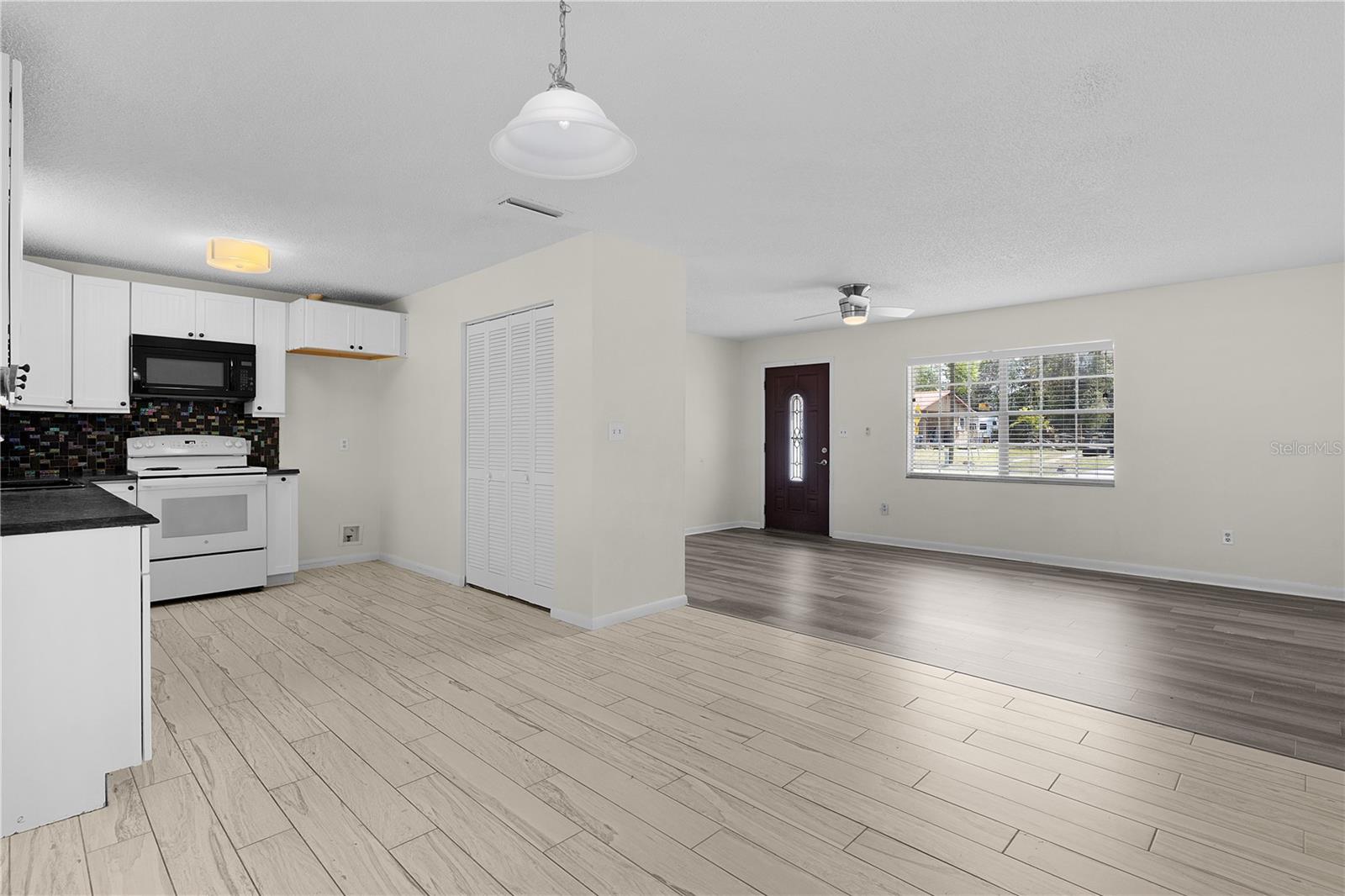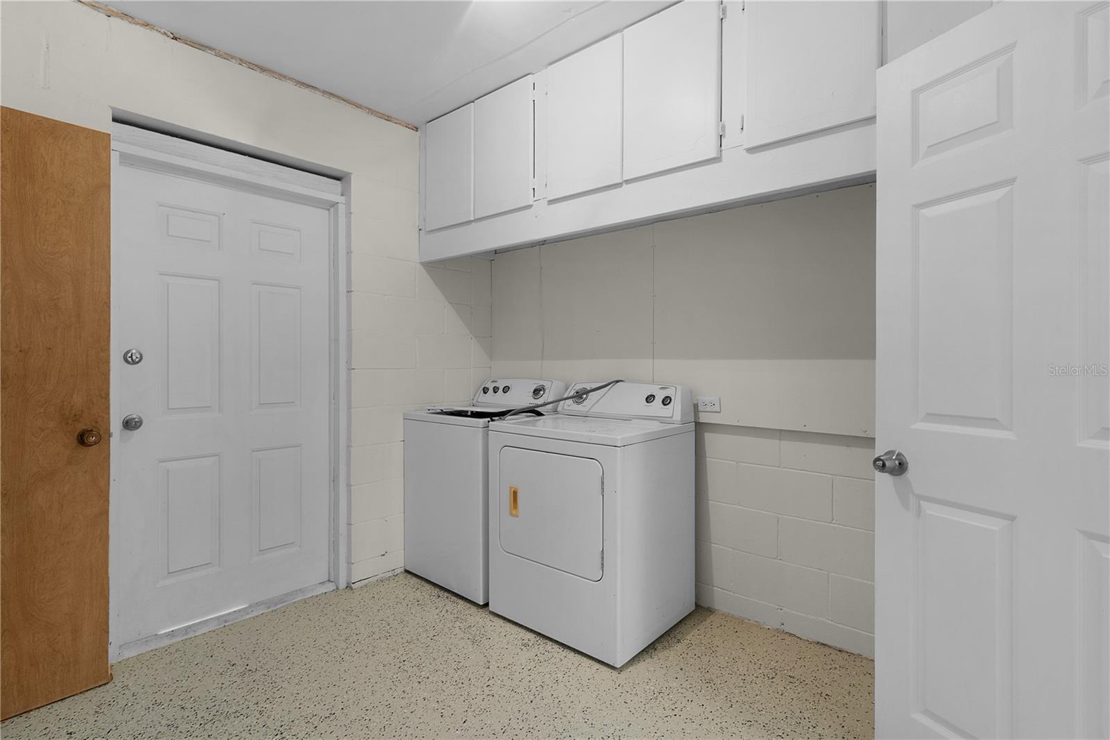 Fabulous 3 bedroom, 1 ½ bathroom block home nestled on a large corner homesite. Featuring a one car garage, private backyard with large shed. BRAND NEW ROOF 2/2025 and freshly painted exterior. Great primary home or investment property. This .30 acre (13,000 sq ft) sit in a nice neighborhood with NO HOA and no neighbors in the back (retention pond in back). Spacious living room just off the dining room that has easy access to the back yard through the French doors. The kitchen was updated a few years ago with wood-look tile floors, bead board cabinets, counter tops and matching back splash. Appliances included. Tile in the kitchen and vinyl floor throughout the rest of the house. The master bedroom has a half bath. Large laundry room with a BONUS office space with entrance or can be used for storage. All the windows have exterior mounts for the aluminum hurricane shutters. Partially fenced backyard. It is located near Lake Weir for fishing, boating, swimming and wildlife viewing.