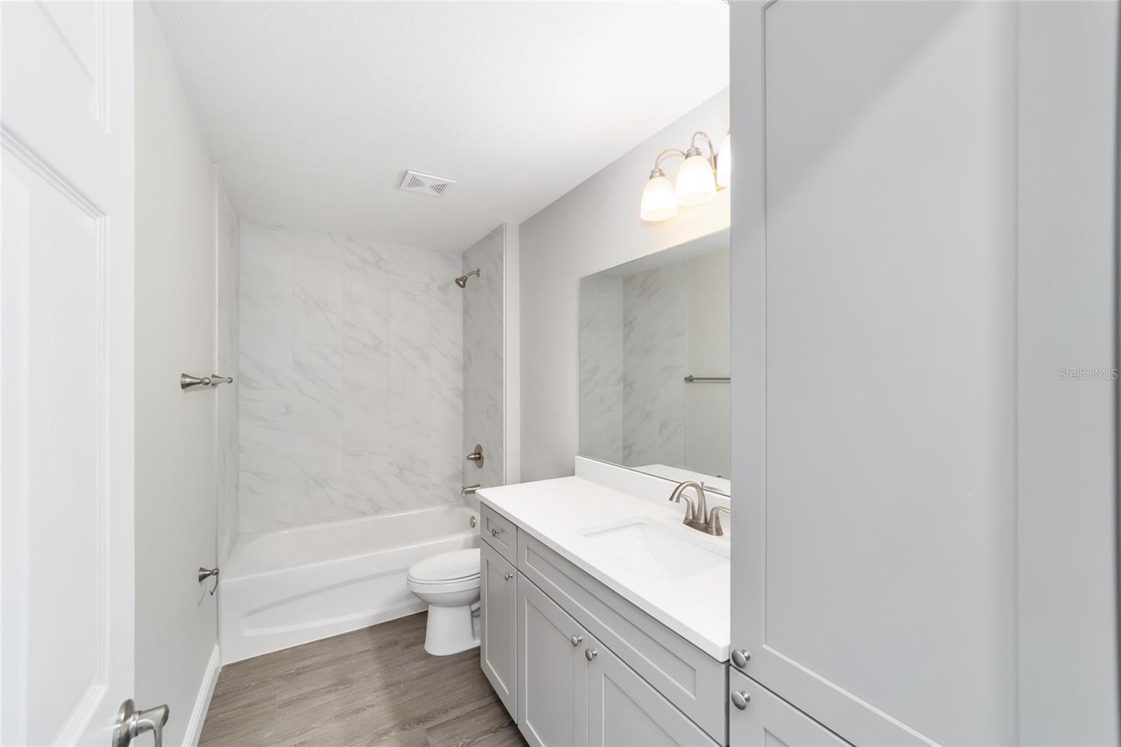 Under Construction. NEW UNDER CONSTRUCTION home featuring 3 spacious bedrooms, 2 modern bathrooms and a 2-car garage with lots of natural light. This split floor plan home boasts an open-concept layout with high ceilings, luxury vinyl plank flooring, upgraded lighting and modern ceiling fans throughout. The kitchen overlooks the living room and features stainless steel appliances and fixtures, stone countertops, and upgraded cabinetry. Large living room has an eat in dining area. The primary bedroom has a tray ceiling and walk-in closet with an ensuite bathroom with stone countertops, double vanities and a large tiled walk-in shower. The guest bedrooms have built in closets and big windows. The guest bath offers a tiled tub surround, lots of storage cabinets and stone countertops. The covered front entrance has ceiling lights and sliding glass doors lead to the patio and backyard. Under construction. Interior photos will be exactly as pictures. House is freshly painted in blue.