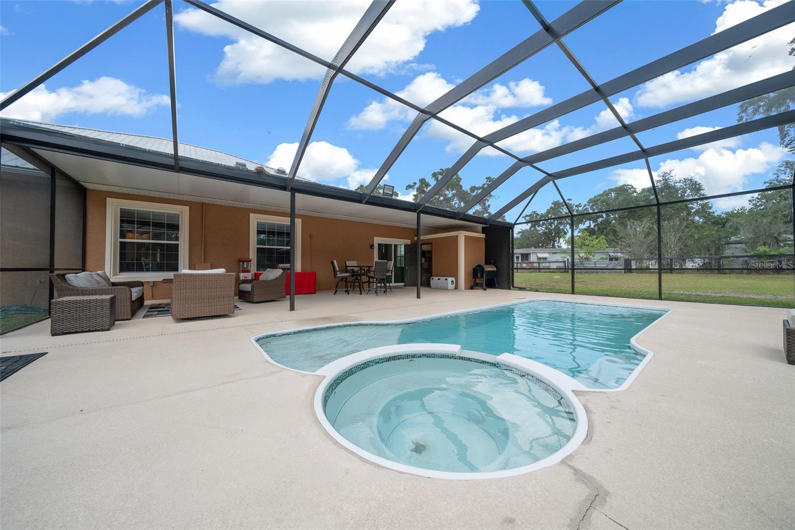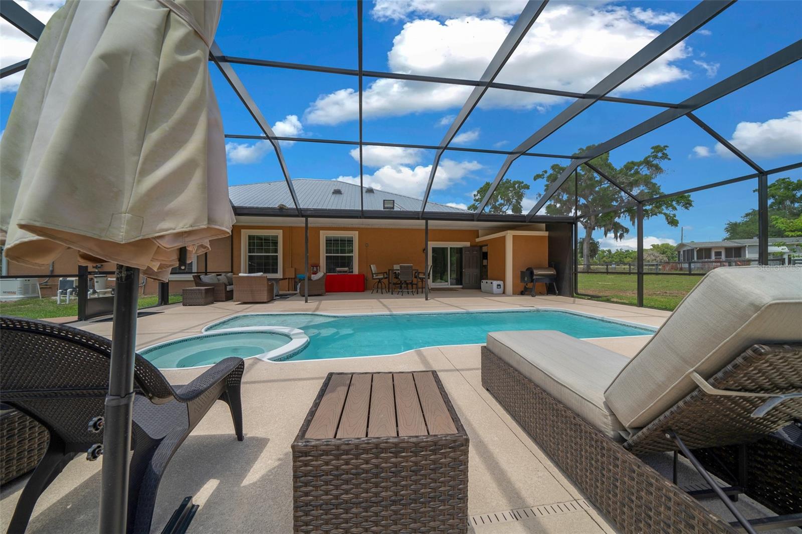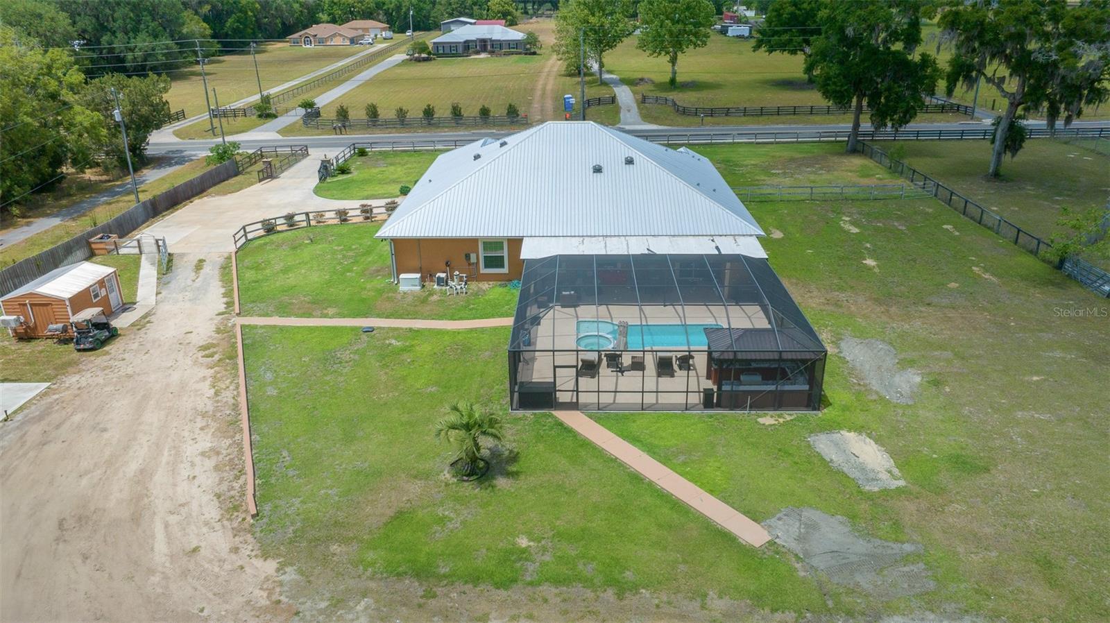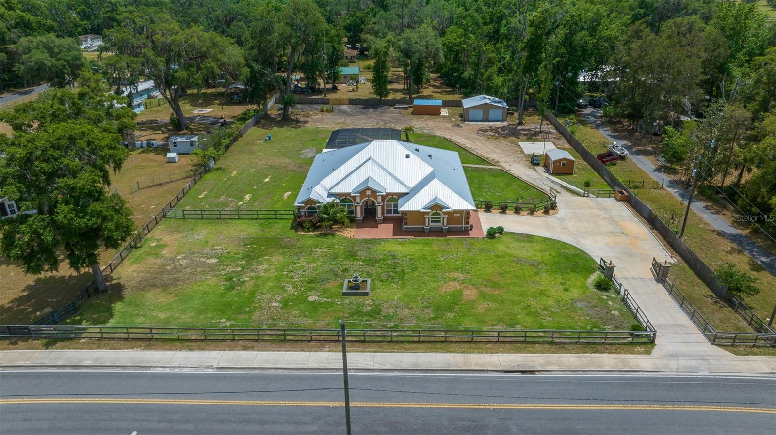 Experience luxury living in your new custom 5-bedroom estate set on 1.5 acres of private land. Over 3,849 square feet of beautifully designed living space, this 2021-built home offers elegance and functionality at every turn. The ceilings soar up 10 to 15 feet throughout this pristine home and is packed with luxury finishes, from the designer garage door to the gourmet kitchen and coffered ceiling in the family room. Enjoy the resort-style backyard, complete with a hot tub, in-ground heated pool under a grand screened birdcage enclosure and a fully equipped outdoor bathroom, kitchen, perfect for entertaining. Also includes a bonus detached, climate-controlled 12 x 16 office or in-law suite, plus a whole-house GENERAC generator, and a galvanized metal roof ensure comfort and security year-round. Bonus features include the home gym, basketball court, water softener, a garden, a fountain, gated entrance with plenty of parking space, plus an oversized detached 26 x 30 barn/garage and a carport. This is luxury, redefined! Schedule your private tour today!