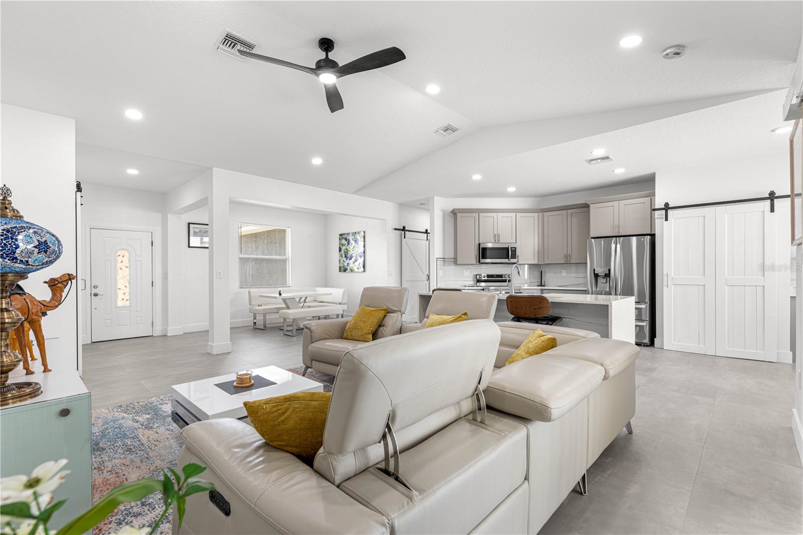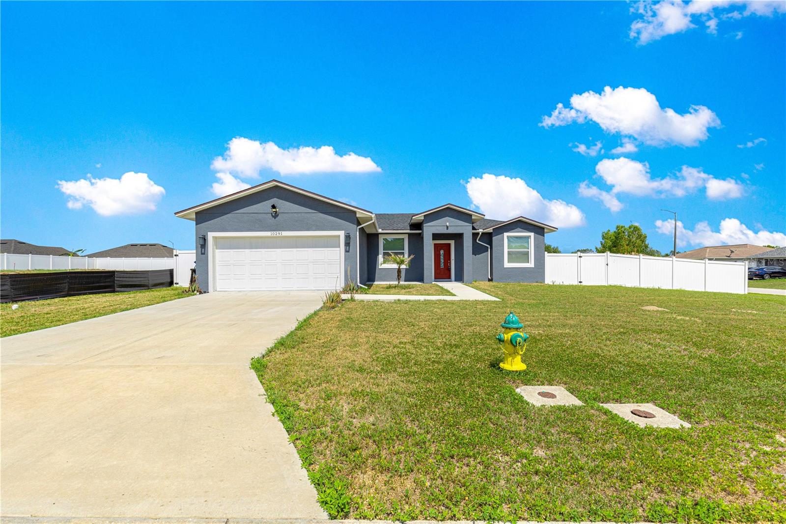 Welcome to this stunning 2022-built home featuring an open floor plan with 10-foot ceilings with recessed lighting throughout and a vaulted ceiling in the living room, creating a spacious and airy feel. Located on a desirable corner lot, this property is fully enclosed with a vinyl privacy fence and offers a blank slate for landscaping, ready for your personal touch. Imagine putting in a beautiful pool and fire pit in the backyard giving you your own private oasis! Step inside to elegant porcelain rectangular gray tile flooring with minimal grout lines throughout the entire home. The gourmet kitchen boasts quartz countertops and center island with breakfast bar, dark gray cabinetry, bi-fold barn door on the pantry, wine refrigerator, marble back splash and stainless steel appliances-perfect for both everyday living and entertaining. The master suite offers a luxurious retreat with a slipper bathtub, walk-in shower, and dual sink vanity. 2 guest bedrooms and a full guest bathroom with shower/tub combo available for your family or guests. Custom touches like multiple barn doors offer a stylish, modern flair. Other features include inside laundry, all furniture included-truly move-in ready and a 2-car garage with finished floor and utility sink. Don't miss this opportunity to own a beautifully designed, turnkey home with premium finishes in every room! All this in the desirable community of Diamond Ridge just across the street from the Belleview Sports Plex.