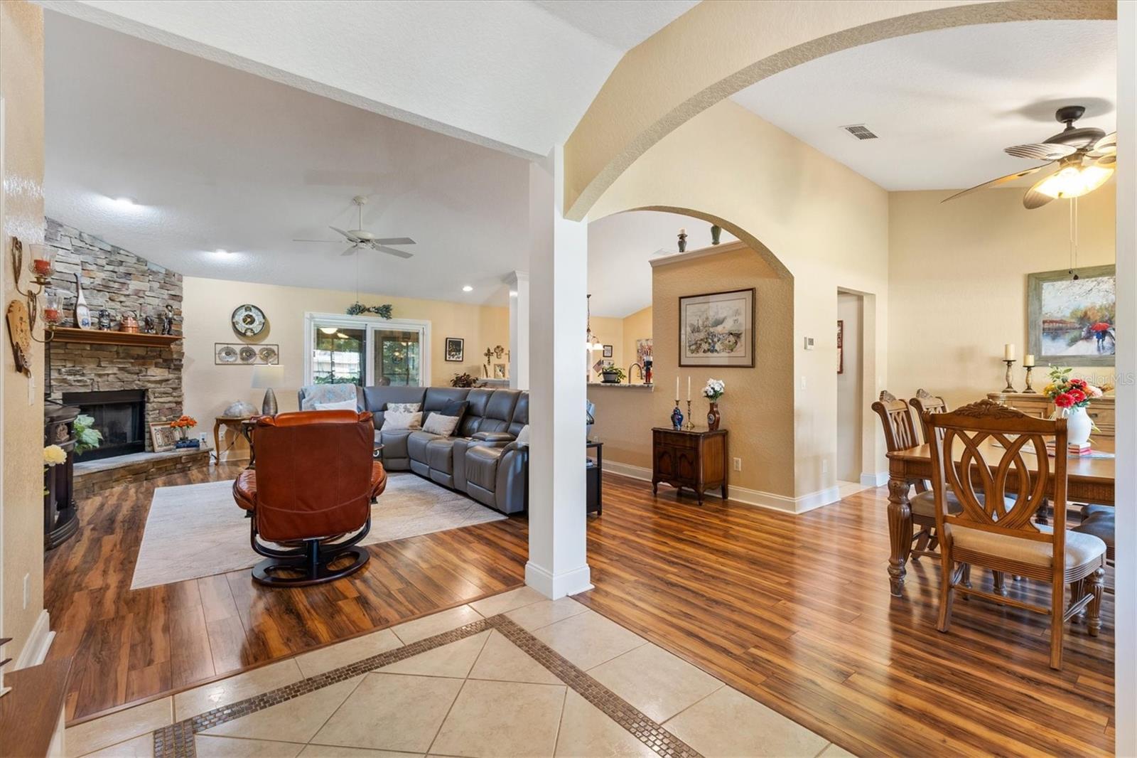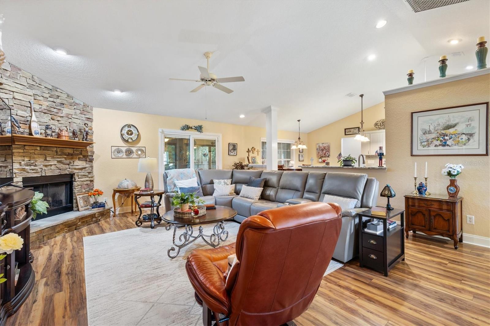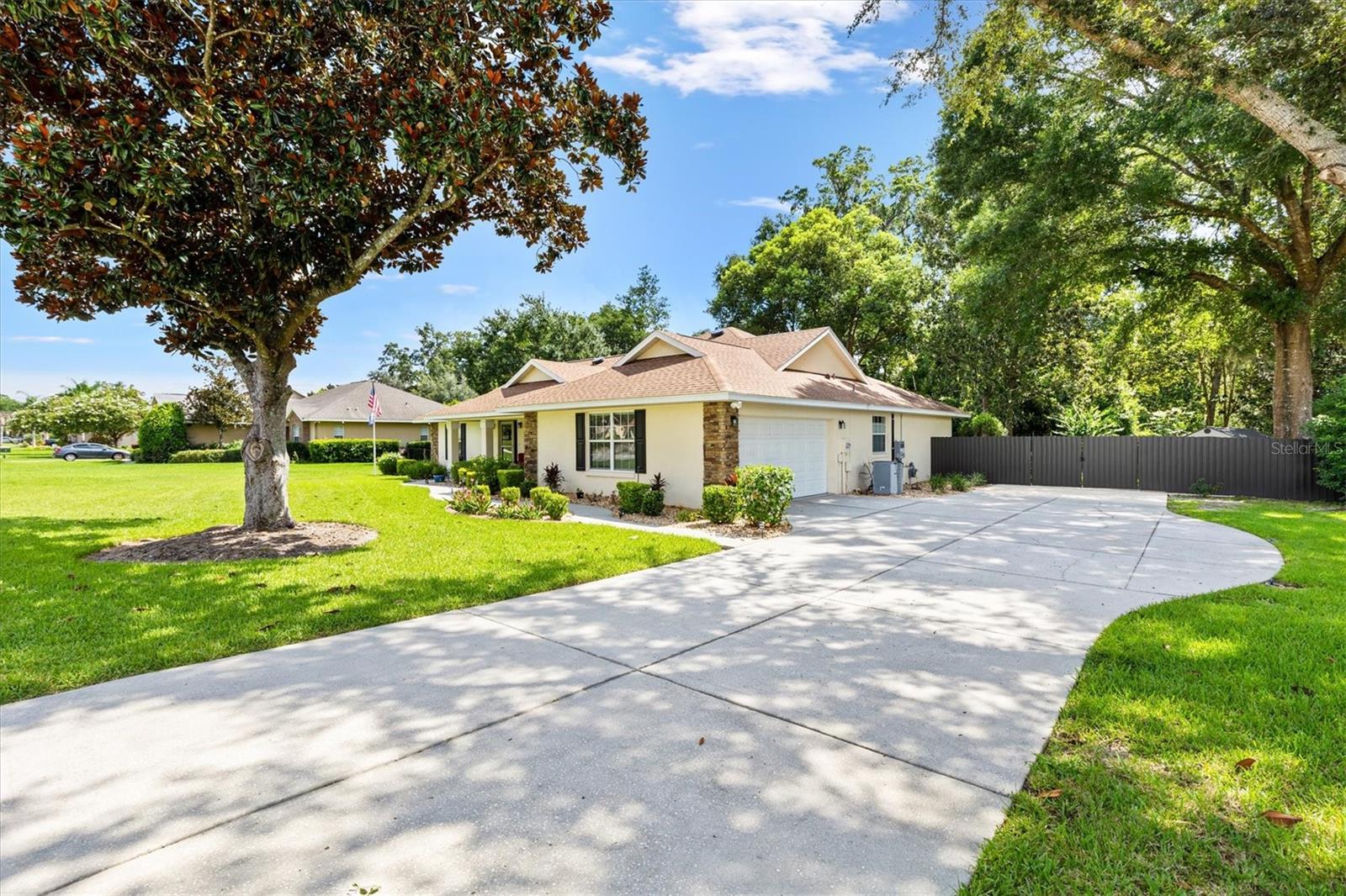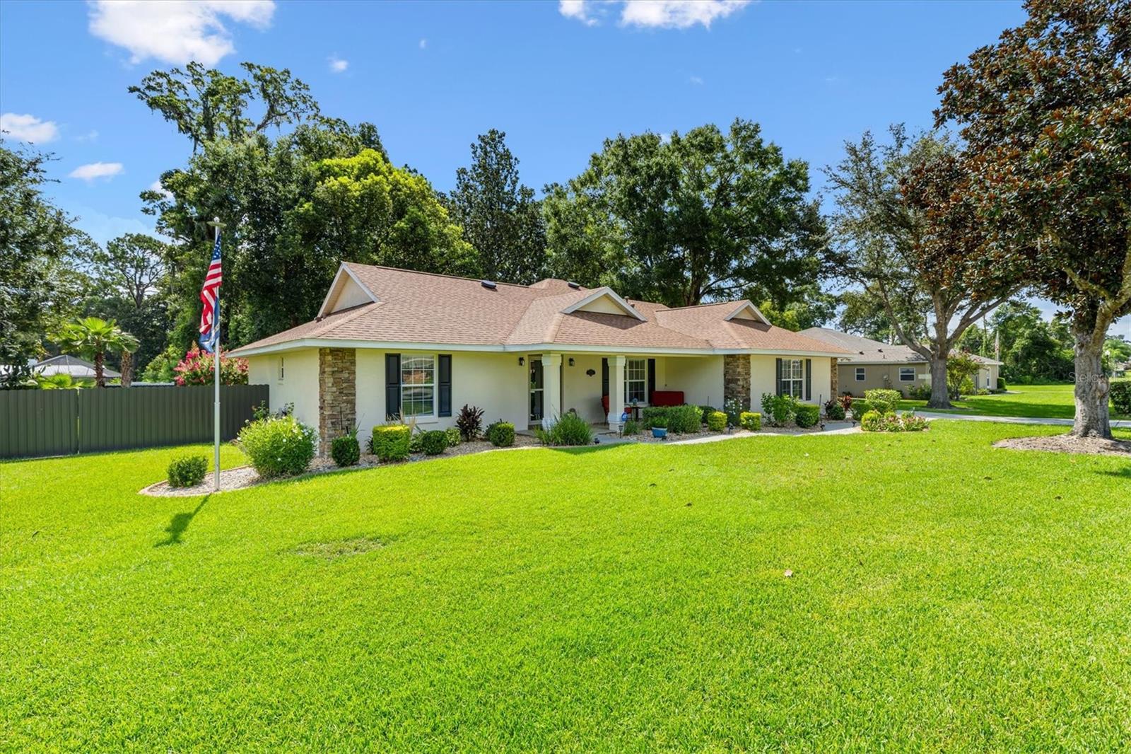 Your Private Paradise Awaits in COBBLESTONE... Resort-Style Living in this 3 Bedroom, 2 Bath CONCRETE/BLOCK/STUCCO home Minutes from The Villages, Florida! Tucked away in a peaceful all-age community, just 20 minutes North of The Villages and 15 minutes South of Ocala, this Belleview gem feels like your own private resort. Surrounded by lush greenery and framed by a brand-new 2025 METAL FENCE, the backyard becomes your sanctuary. Whether you’re sipping morning coffee in the enclosed lanai, grilling on the wooden deck, or simply soaking in the serenity. Step inside and be greeted by a warm and inviting living space where a corner BRICK HEARTH GAS FIREPLACE sets the scene for cozy evenings. The split bedroom floor plan ensures privacy, while the 2022 Kitchen RENOVATION brings elegance and function together with QUARTZ countertops, Custom cabinetry, and Stainless Steel appliances. The primary suite is pure indulgence, offering a large walk-in shower, TWO WALK-IN CLOSETS, a luxurious soaking tub, dual sinks, and private lanai access. Every detail has been thoughtfully updated, from the 2021 ROOF and 2020 GAS TANKLESS WATER HEATER to the 2023 VINYL LANAI WINDOWS and WHOLE HOUSE WATER SOFTENER system. LAMINATE and TILE Flooring flow seamlessly throughout, adding both style and ease of care. With an extended driveway, epoxy flooring in garage and front porch, decorative curbing around landscaped flower beds, and a backyard designed for relaxation, this home offers the perfect balance of comfort and escape. Here, every day feels like a vacation yet you’re still just minutes from shopping, dining, hospitals, and entertainment. Schedule your private showing today!