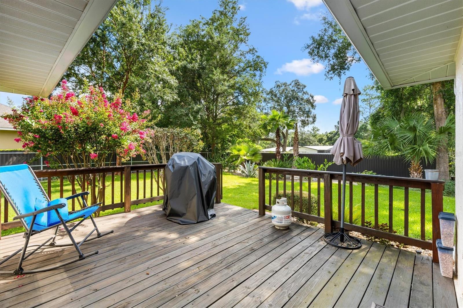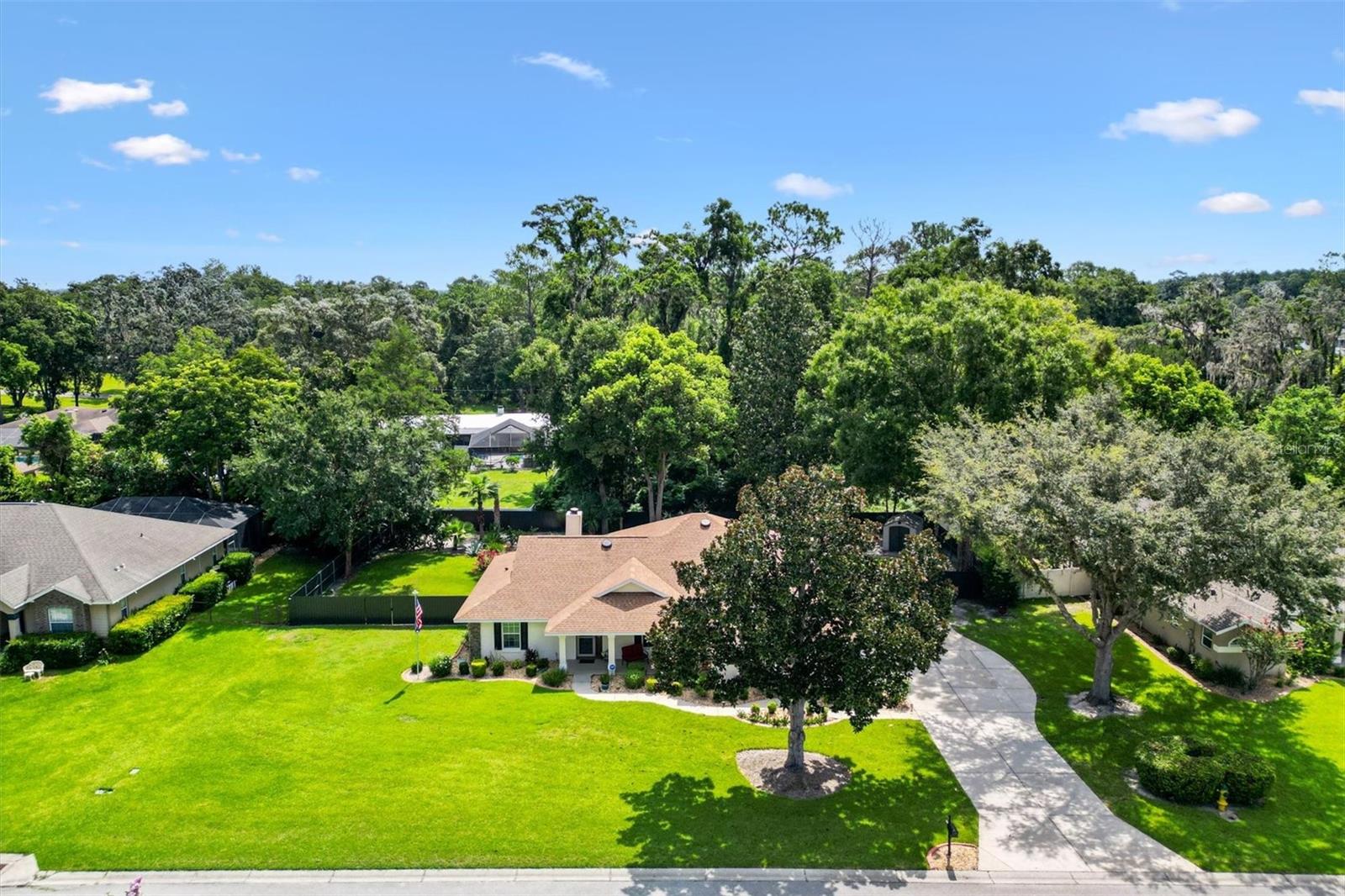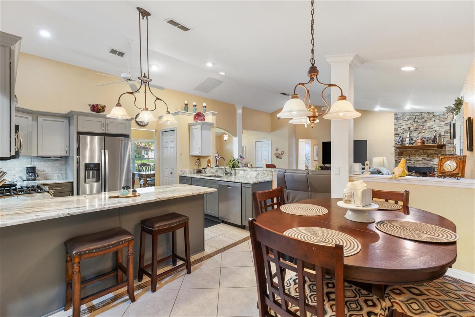 Your Private Paradise Awaits in COBBLESTONE... Resort-Style Living in this 3 Bedroom, 2 Bath CONCRETE/BLOCK/STUCCO home Minutes from The Villages, Florida! Tucked away in a peaceful all-age community, just 20 minutes North of The Villages and 15 minutes South of Ocala, this Belleview gem feels like your own private resort. Surrounded by lush greenery and framed by a brand-new 2025 METAL FENCE, the backyard becomes your sanctuary. Whether you’re sipping morning coffee in the enclosed lanai, grilling on the wooden deck, or simply soaking in the serenity. Step inside and be greeted by a warm and inviting living space where a corner BRICK HEARTH GAS FIREPLACE sets the scene for cozy evenings. The split bedroom floor plan ensures privacy, while the 2022 Kitchen RENOVATION brings elegance and function together with QUARTZ countertops, Custom cabinetry, and Stainless Steel appliances. The primary suite is pure indulgence, offering a large walk-in shower, TWO WALK-IN CLOSETS, a luxurious soaking tub, dual sinks, and private lanai access. Every detail has been thoughtfully updated, from the 2021 ROOF and 2020 GAS TANKLESS WATER HEATER to the 2023 VINYL LANAI WINDOWS and WHOLE HOUSE WATER SOFTENER system. LAMINATE and TILE Flooring flow seamlessly throughout, adding both style and ease of care. With an extended driveway, epoxy flooring in garage and front porch, decorative curbing around landscaped flower beds, and a backyard designed for relaxation, this home offers the perfect balance of comfort and escape. Here, every day feels like a vacation yet you’re still just minutes from shopping, dining, hospitals, and entertainment. Schedule your private showing today!