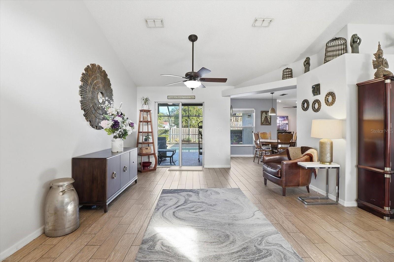 Welcome to this stunning sports pool home located in Cobblestone gated community. Spanning 2,128 sq ft, this residence features fresh indoor paint and vaulted ceilings that enhance the spaciousness of the living areas. The entertainment lanai is perfect for gatherings, equipped with a TV and speakers for your enjoyment. Recent updates include a new pool pump and timer, as well as new screen panels on the birdcage, ensuring a serene outdoor experience. This home offers four bedrooms and two bathrooms, providing ample space for guests. With keyless entry and an EV car/RV plug-in, convenience meets modern living. The fully fenced backyard ensures privacy while public water and sewer services add to the ease of maintenance. Home equipped with wired security system for extra ease of mind. Come view this beauty for yourself.