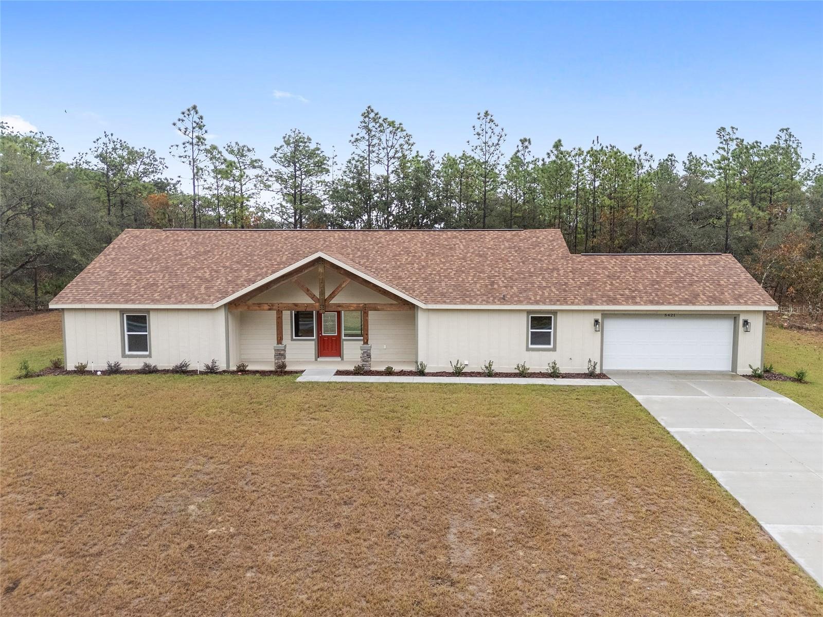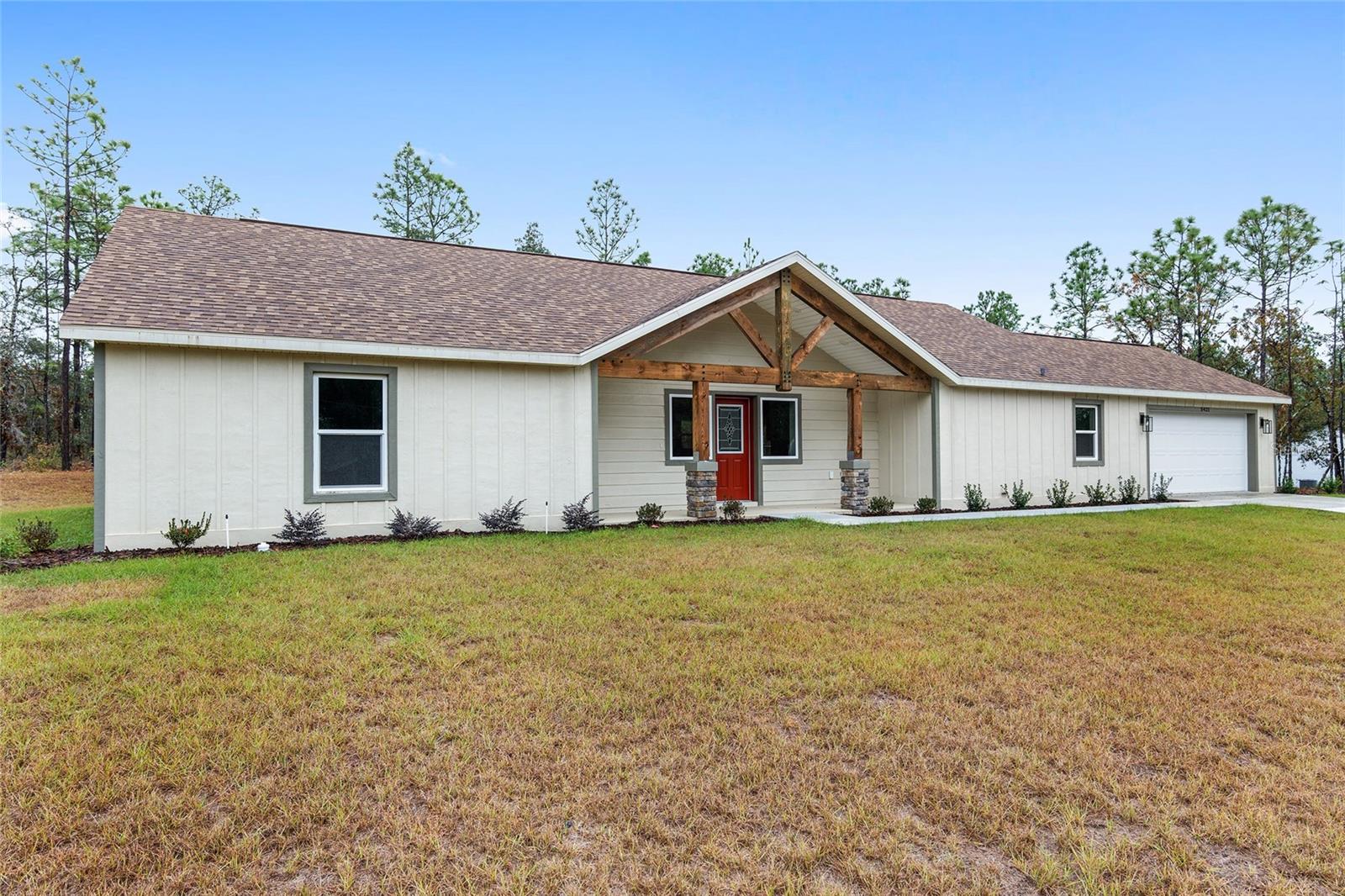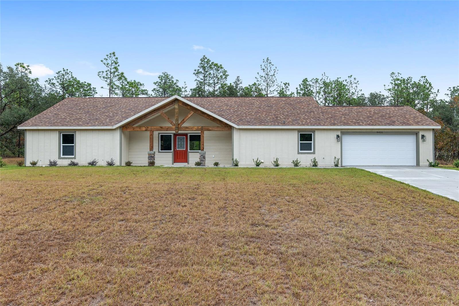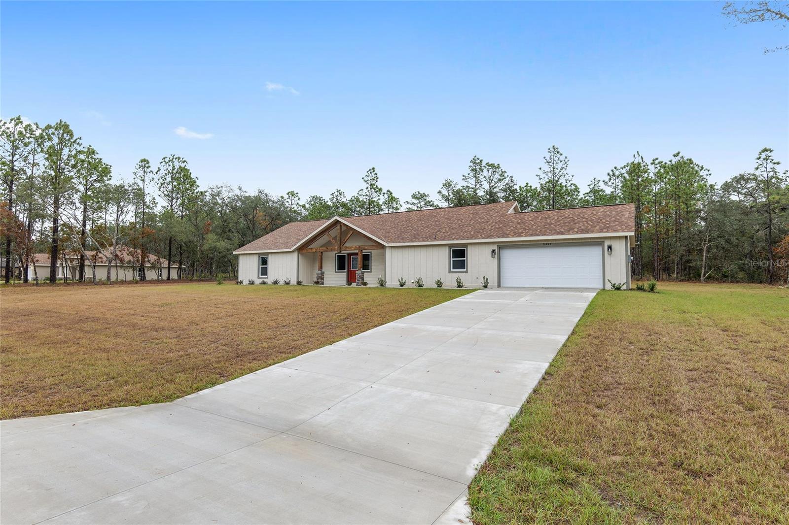 Nestled on over an acre of land, this brand-new home offers over 2,000 sq ft of luxurious living space, perfectly balancing seclusion and convenience. As you approach the front door, you're greeted by a charming, spacious front porch, setting the tone for the inviting open-concept design inside. The modern layout seamlessly connects the living room, kitchen, and dining areas, creating an ideal flow for entertaining guests or relaxing with family. The split floorplan ensures privacy, with the generously-sized primary suite tucked away in its own corner of the home. Enjoy direct access to the private covered back patio, a perfect spot for unwinding outdoors. The spa-inspired primary bath features a soaking tub, separate shower, and dual vanities, complemented by a large walk-in closet for added convenience and storage. Located in the desirable Pine Ridge Estates, you'll enjoy the benefits of a well-maintained HOA, offering an affordable and balanced community lifestyle without excessive restrictions. This exceptional home is waiting for you – schedule your showing today and see firsthand what makes it so special!