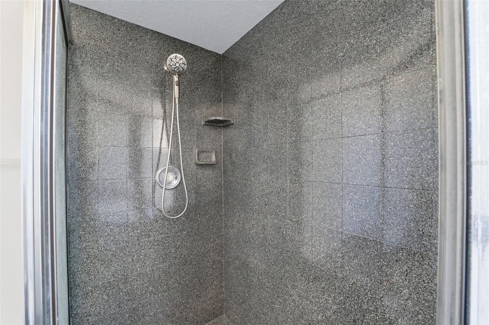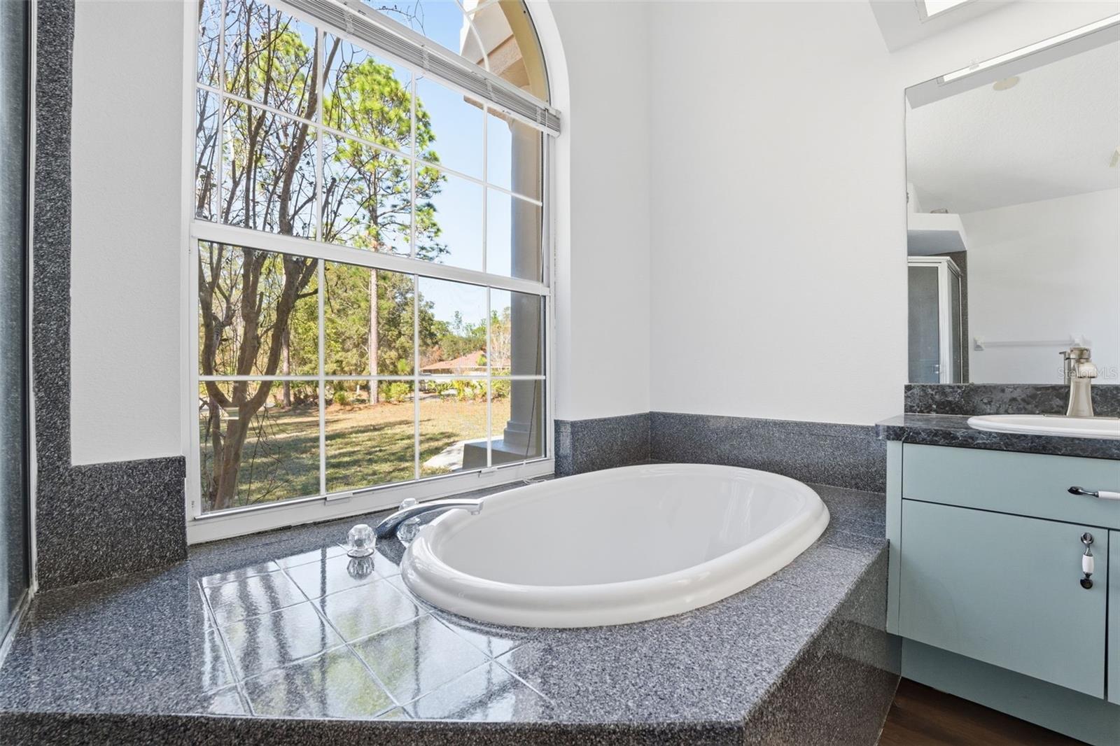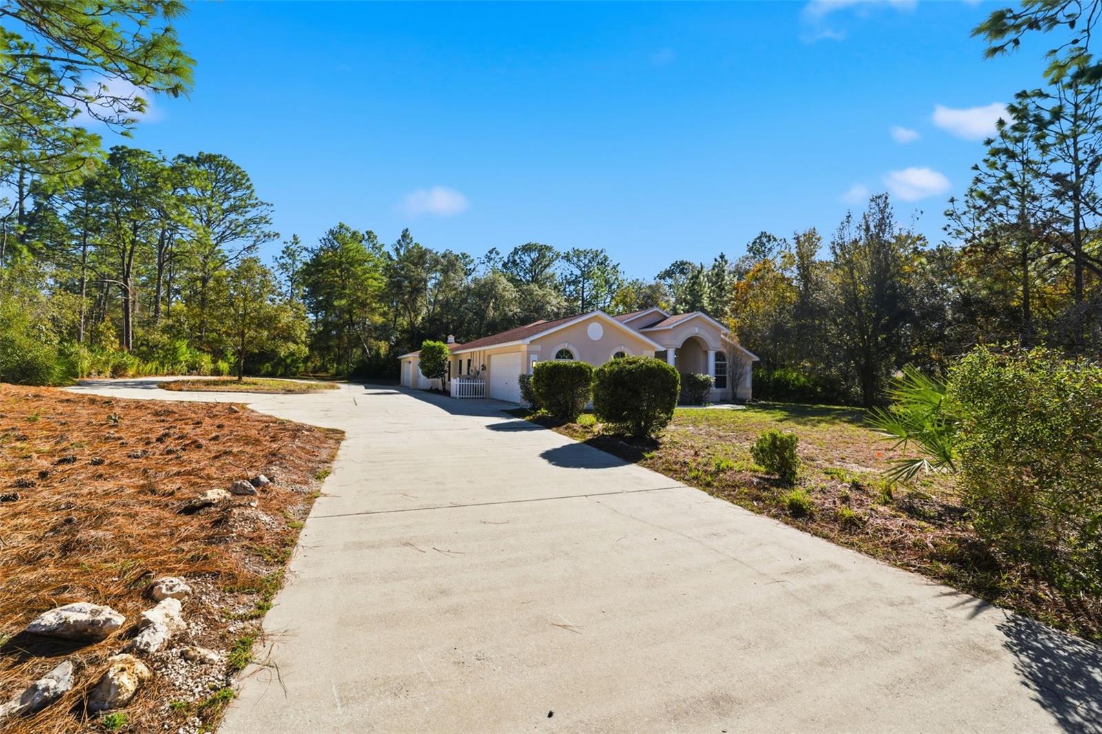 One or more photo(s) has been virtually staged. Set in the sought-after Pine Ridge community on a serene 1.34-acre wooded lot, this 3-bedroom, 2-bath home welcomes you with a long, natural driveway that extends into a side circular drive leading to split garages at both the front and back of the property, offering a total of four garage spaces and an elegant sense of arrival surrounded by mature trees and lush natural landscaping. The front porch invites you in with textured flooring, tall columns, arched windows, and a smooth light-toned ceiling framing the double-door entry that opens into a bright foyer with tile flooring and direct views of the shimmering pool through wide sliding windows. The dining and family room combination features wood-look luxury vinyl flooring, an open layout, and large windows that fill the space with daylight, with a dining area and a breakfast nook surrounded by windows overlooking the pool and connected to the kitchen, which includes tile flooring, white cabinetry, stainless steel appliances, a breakfast bar, a dual sink, and an airy pass-through that opens to the living area. The primary bedroom feels like a peaceful retreat with wood-look flooring, abundant natural light from large windows, and a sliding glass door leading directly to the pool area, while the ensuite bathroom offers dual vanities, a walk-in glass shower, and a soaking tub beneath a stunning arched window. Bedrooms two and three feature the same warm flooring, spacious walk-in closets, and access to a shared bathroom with a tub-and-shower combination. Both bathrooms have a linen closet. The front door has a coat closet. Outside, the screened pool area becomes an everyday escape with textured flooring, wide sliding windows connecting the interior to the outdoors, and tranquil views of the tree-lined backyard with natural ground cover. A walking trail behind the back yard offers a nature walk anytime. Nearby attractions include the Withlacoochee State Trail, a popular paved path ideal for biking, jogging, and nature walks; the wildlife-rich waters of Crystal River, perfect for boating and exploring Florida’s natural springs; and Beverly Hills Community Park, where open green spaces, walking paths, and recreational amenities offer outdoor enjoyment just minutes from home.