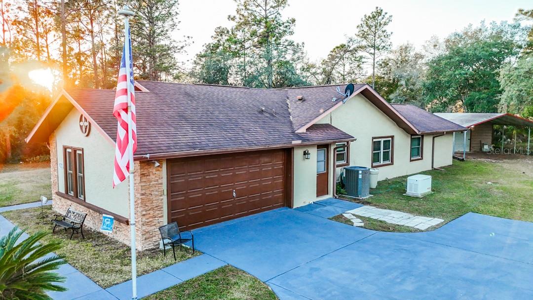 This was a model home. The patio was converted to a central air and heated Florida room by its current owner. All the windows throughout have been upgraded to double pain efficiency windows. The house backs up to golf course views. The roof is 2017 and the ac is 2019. The garage is workbench ready, motorcycle not included. It's riding off into the sunset with its current owner. All bedrooms, great room and Florida room have stereo surround sound. The newer shed can house all of your landscaping equipment and still have room for the hobby enthusiast needing workspace. Enjoy those sunset views in your Jacuzzi which conveys with the home. Electrical fireplaces throughout to give you that warm and cozy ambiance. Never have to lose power with your own hardwired generator on the property.