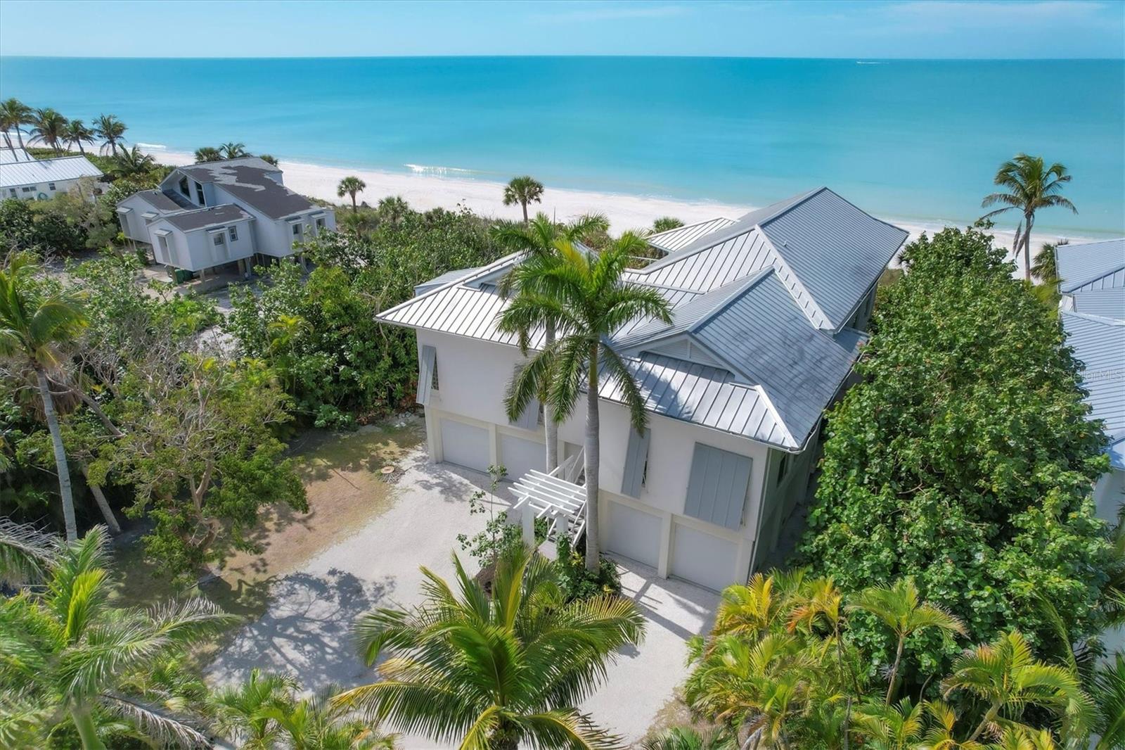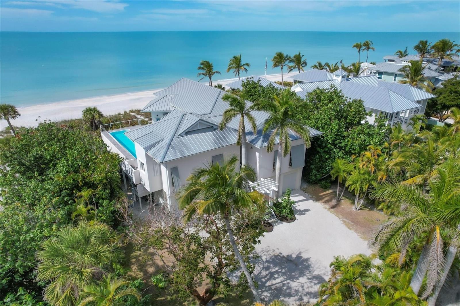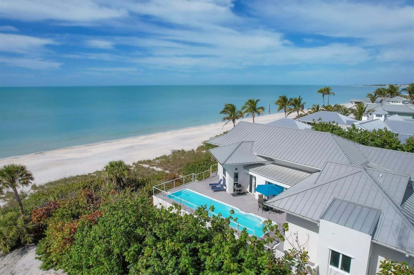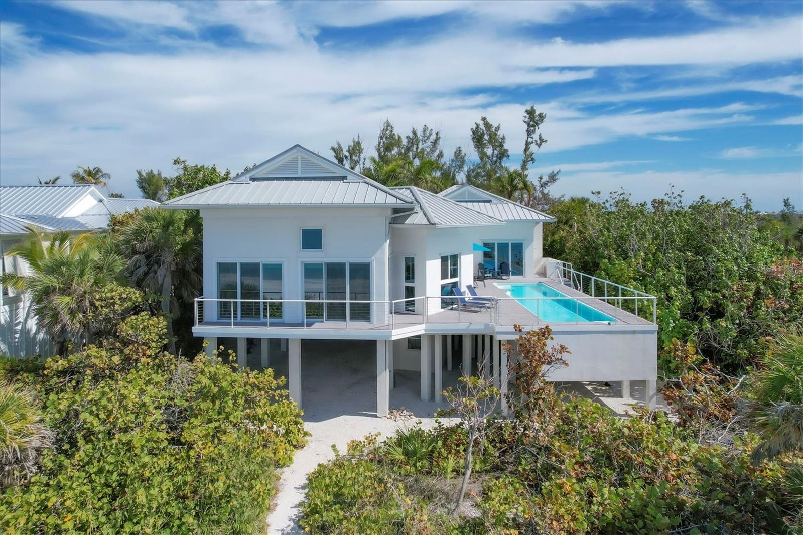 BEACHFRONT BOCA GRANDE! Nestled along the pristine shores of Boca Grande’s most exclusive beachfront lane sits this modern elevated estate, offering 105’ feet of unobstructed panoramic views of the beautiful cerulean waters and the sandy shores of the Gulf of Mexico. The perfect location offers blissful privacy yet close to everything this picturesque island has to offer. Discover the grandeur beauty of this 3 bedroom, 3 bathroom Gasparilla Island retreat. The expansive new sliding doors and windows offer stunning views from the living room out across the horizon paired with a plethora of natural light which cascades across the open concept floor plan, and its chic contemporary design. The galley kitchen hosts a modern and sleek concept, stainless appliances, beautiful views out over the pool and beach, and adjacent spacious formal dining area perfect for entertaining. The Primary suite radiates a peaceful and relaxing feel offering stunning views out to the pool through the floor to ceiling windows, and adjoining quaint private office. The ensuite master bath features a modern design with dual sinks, tiled walk-in shower and plenty of storage in the adjacent walk-in closet. The second bedroom offers a tranquil color scheme, expansive wall length closet, large windows showcasing the exterior's tropical foliage, and ensuite polished bathroom complete with walk-in shower. The third bedroom follows suite with its tranquil color scheme, plenty of natural light from the large windows with views out to the lush tropical landscaped estate grounds. The home's third bathroom is mere steps away featuring the same modernistic design throughout and offers a full-size bathing tub and shower combo. The attached laundry room features high efficiency washer and dryer for convenience and ease. Step out onto the grand deck and immerse yourself in the cool waters of the private pool perched above and surrounded in privacy by the lush tropical seascape. Only a short golf cart ride into downtown Boca Grande village where you can enjoy the eclectic boutiques, island shops, fine dining restaurants and the famous Gasparilla Inn all perched amongst a true old Florida atmosphere. ~See virtual tour link for 3D walkthrough tour~