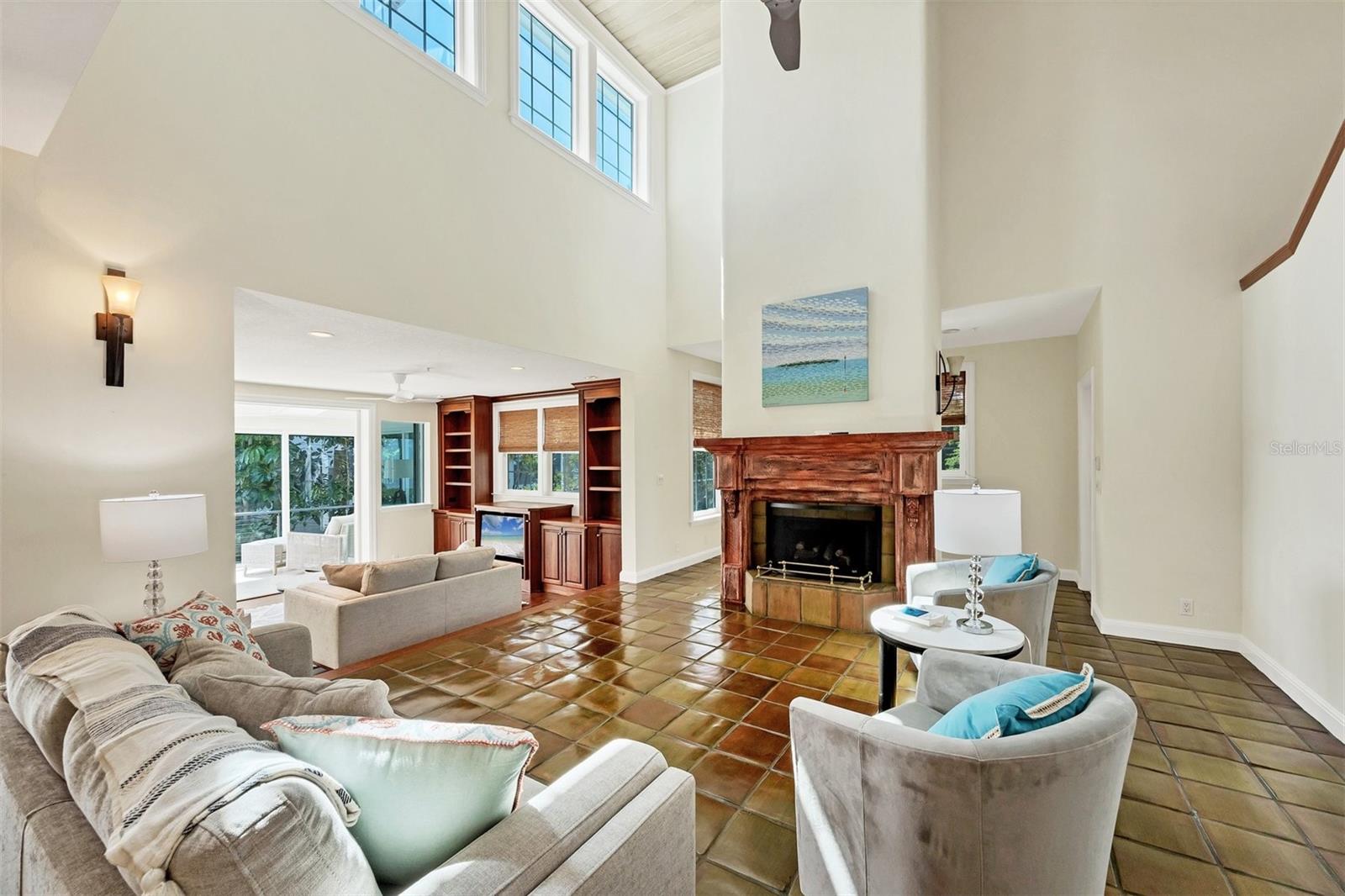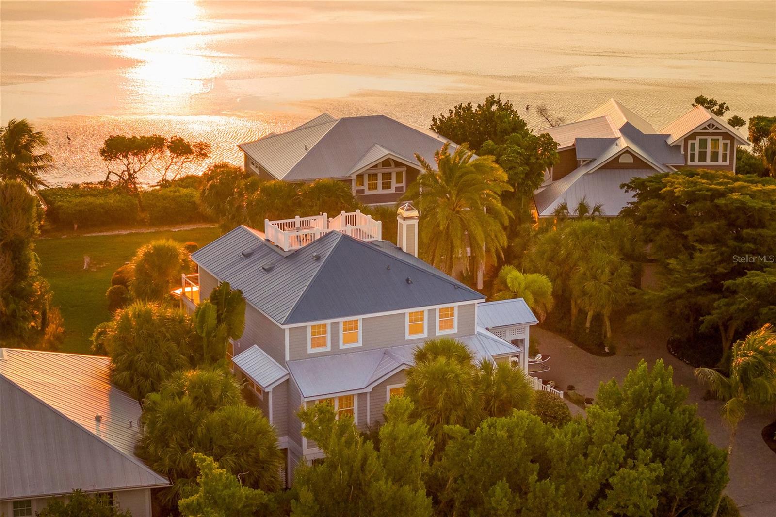 This unique bayfront home offers stunning sunrises and moonscapes over Charlotte Harbor. The spacious open main floor begins with an entry leading into the two-story living room with hand painted coffered ceiling. This space is accented by the hand painted staircase, custom tera cotta tile floors and a fireplace surrounded by a hand carved pecky cypress mantle. The adjoining dining room continues into the heart of the home providing quiet dining and harbor views. Step down into the kitchen and open family room. The kitchen is completely updated with stainless appliances, granite countertops and a spacious island with a second sink. Both rooms feature cherry flooring, custom woodwork and designer cabinetry with storage features. Adjacent to the kitchen and family room, a waterfront sunroom spans the width of the home, leading to a custom, window filled stairwell to the first-floor storerooms, doubled garage spaces and a garden patio. The property finishes with a garden view leading to the mangrove coastline. There are two large main level guest rooms, one en-suite and a second with an adjacent full bath. The upstairs primary suite welcomes you with built-in shelving and desk, vaulted ceiling and expansive windows facing Charlotte Harbor. The open Roman bath, large walk-in closet and laundry room complete the space. Open the large French doors in the primary bedroom to enter a private deck with amazing harbor views. To complete the deck, a circular staircase leads to a widow's walk with a panoramic view of Gasparilla Island and beyond. Additional highlights include a finished elevator to the first floor, impact glass on all windows and doors, a new metal roof installed in 2023 and all interior walls freshly painted. This North Bay gem, in the amenity rich Boca Bay community, is a true sanctuary combining location, style and natural beauty.