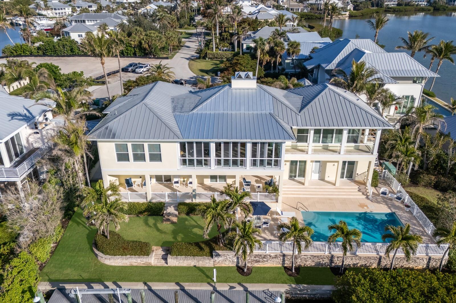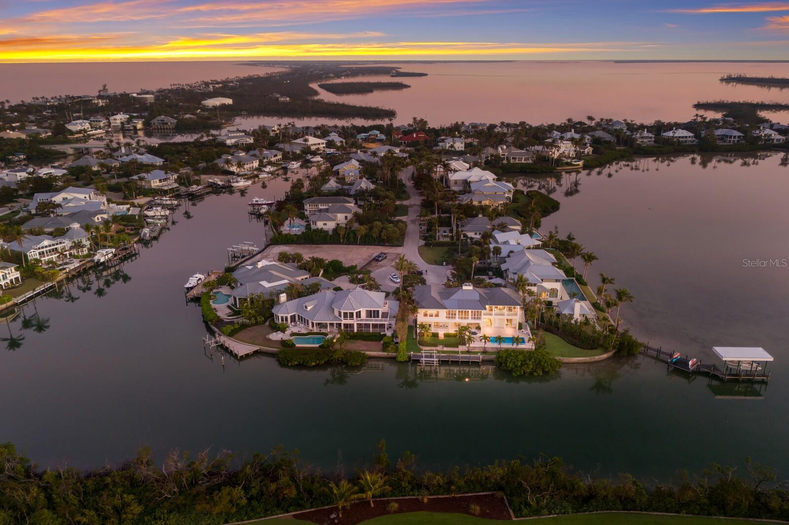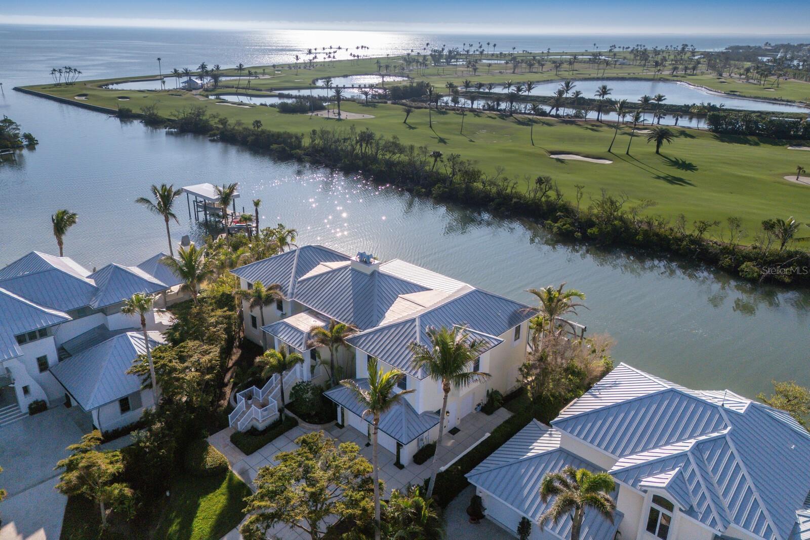 This exceptional waterfront property on a large tip lot boasts breathtaking views of Charlotte Harbor, The Gasparilla Inn Golf Course, and the surrounding natural landscape. With 170 feet of frontage, it provides deep-water dockage with a 50' dock and boat lift. Built in 2011, the home’s main floor showcases a spacious living room with a fireplace and adjacent dining area. Sliding doors lead from the living room to a spectacular sunroom, where floor-to-ceiling windows frame stunning water and golf course views, creating a breathtaking backdrop for everyday living. The open-concept kitchen is equipped with high-end appliances, including a Sub-Zero refrigerator, double ovens, induction cooktop, and separate ice maker, all complemented by a beautiful granite island and countertops. Off the kitchen is a spectacular family room leading to a grilling patio. Noteworthy millwork, including custom door trim and crown moldings, enhances the home’s luxurious feel. The primary suite, overlooking the waterway, includes a small office and a spacious spa-like bathroom featuring dual vanities, two closets, and two water closets. There is also a flexible bonus room perfect for a den, office, or workout room. Ideal for family and guests, the lower level boasts four en-suite bedrooms along with a shared coffee bar and family room. Beautiful wood floors, impact-resistant windows and doors, and superior construction quality round out this thoughtfully designed home. A convenient elevator provides easy access to all floors. The expansive outdoor living space is a true highlight, with a spacious covered patio offering ample seating for relaxing or entertaining while enjoying serene views. A large heated pool offers the ultimate Florida lifestyle experience, and rear southern exposure ensures optimal sunlight throughout the day. A grassy area, swaying palm trees, and steps leading to a deck with a boat lift complete this tropical outdoor retreat. Additional highlights include plenty of storage space and a two-car garage with a separate golf cart entrance. Savor both sunrise and sunset views from this exquisite home, located within the private, gated community of Boca Grande Isles. Just a short distance from the historic village of Boca Grande’s, charming shops, restaurants, and historic buildings, this home is a true gem.