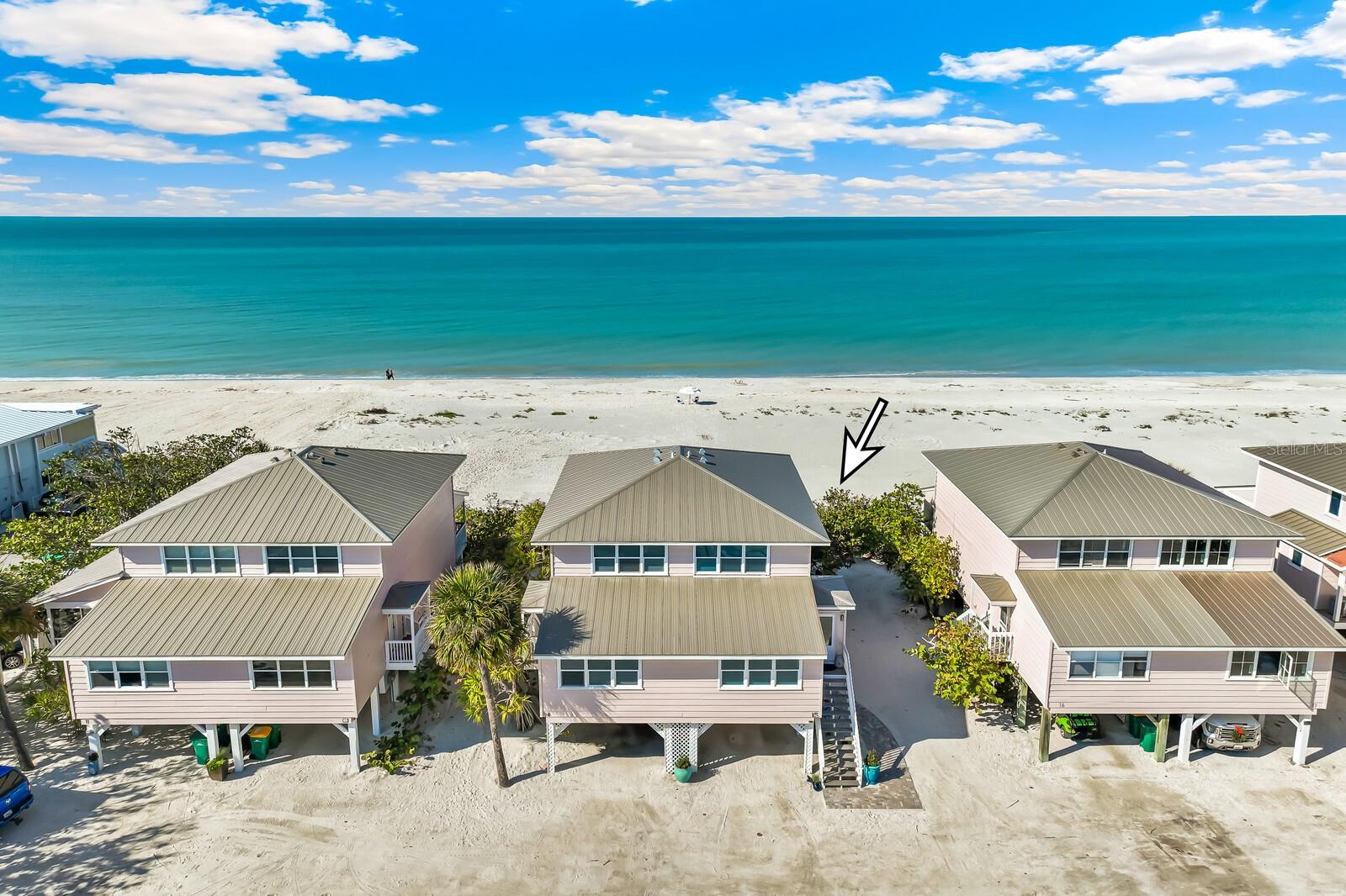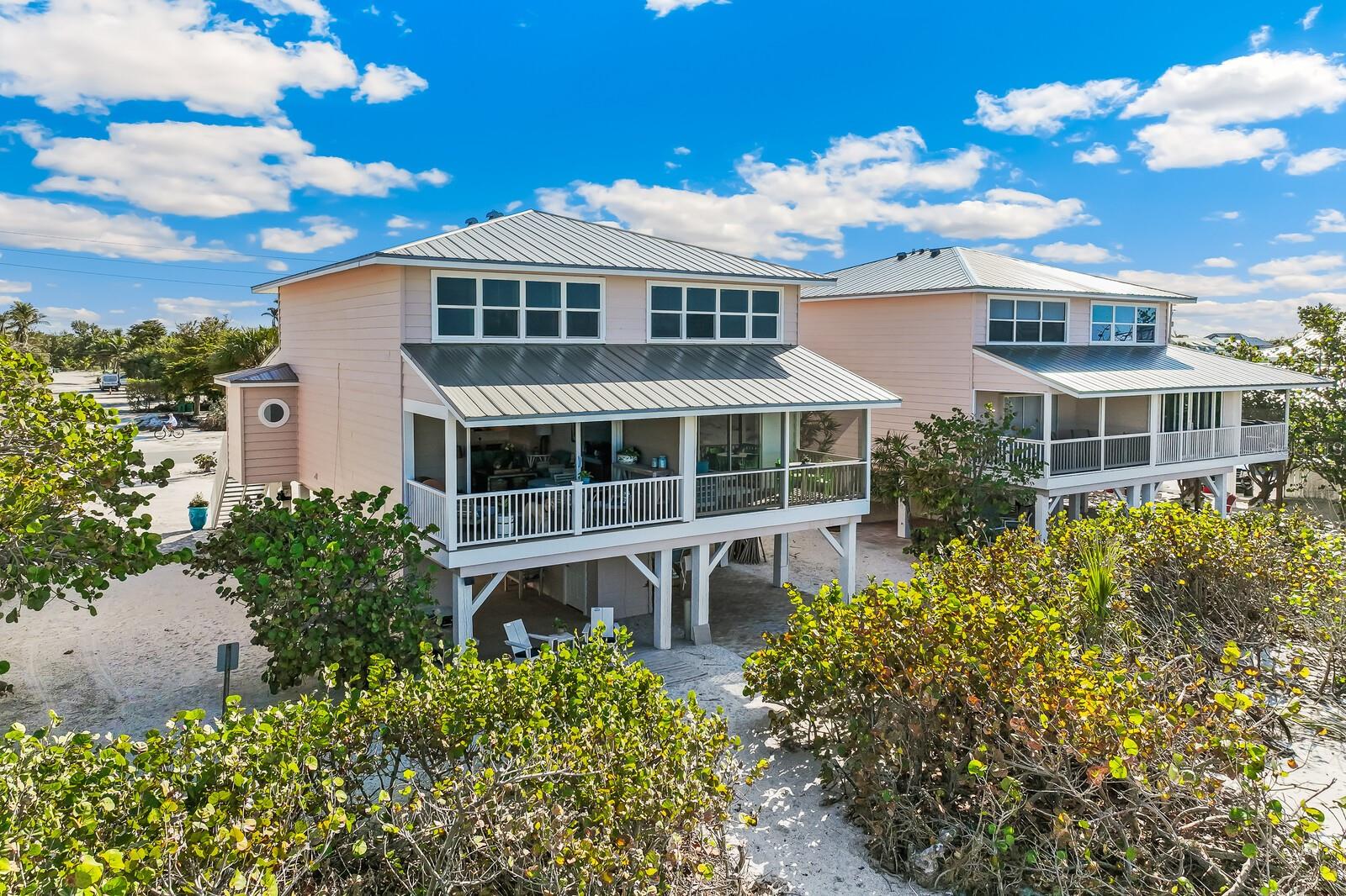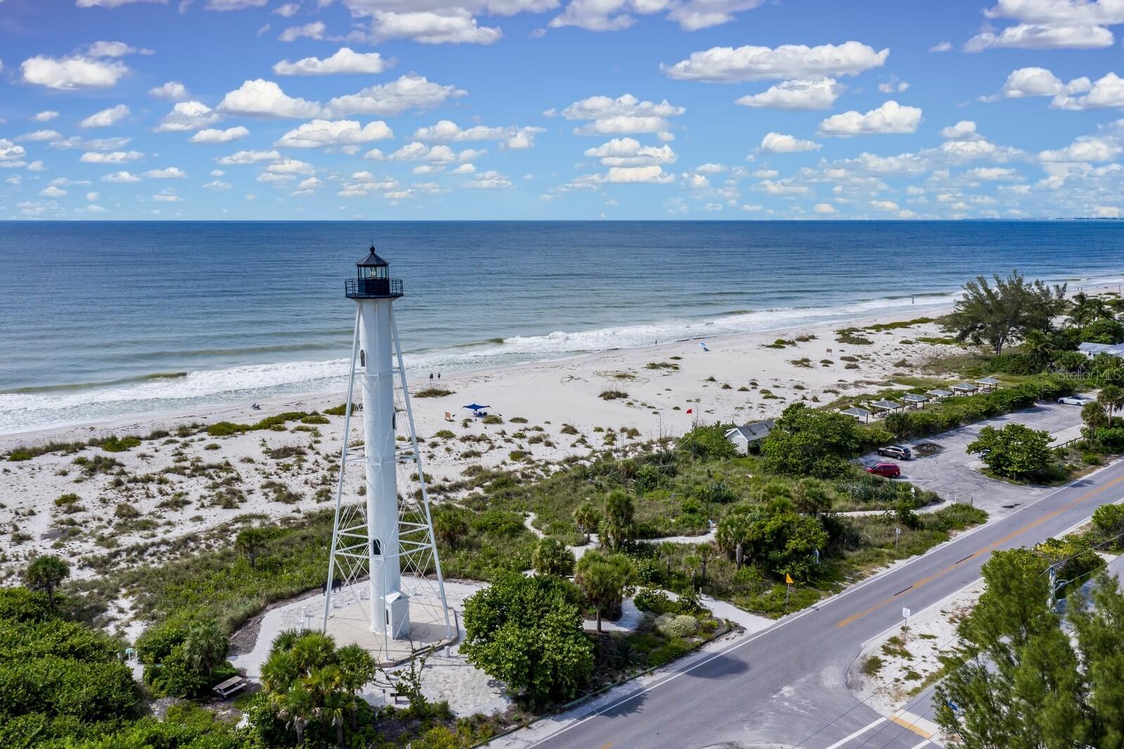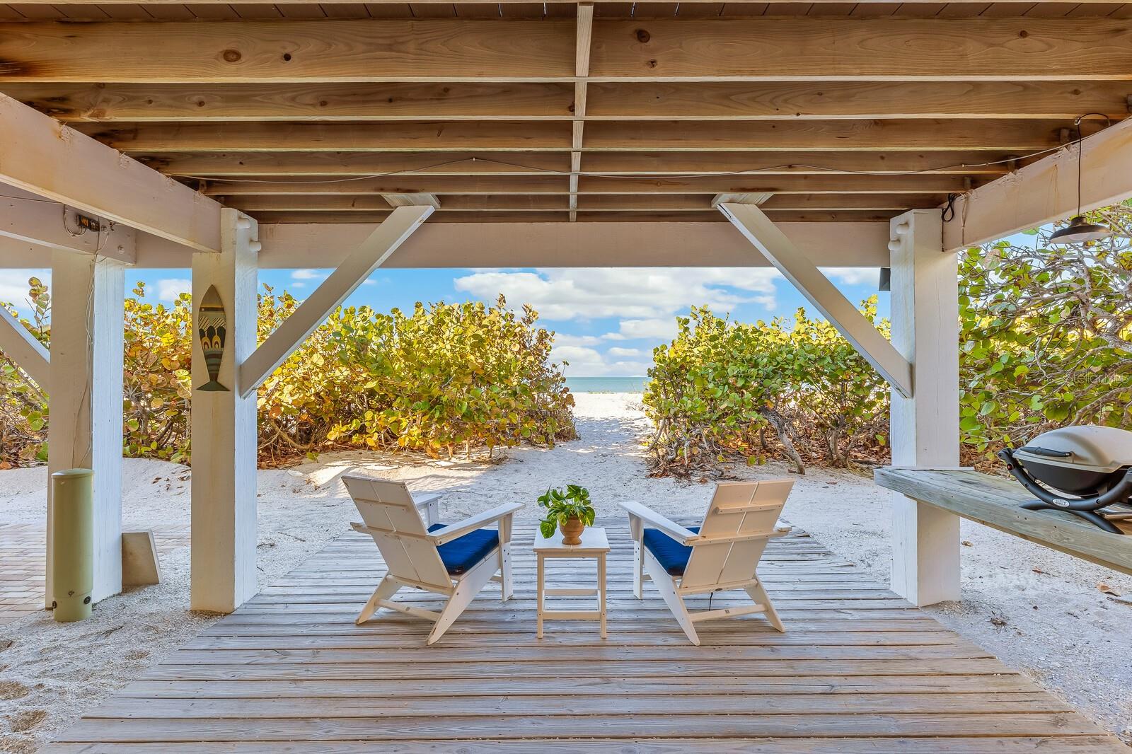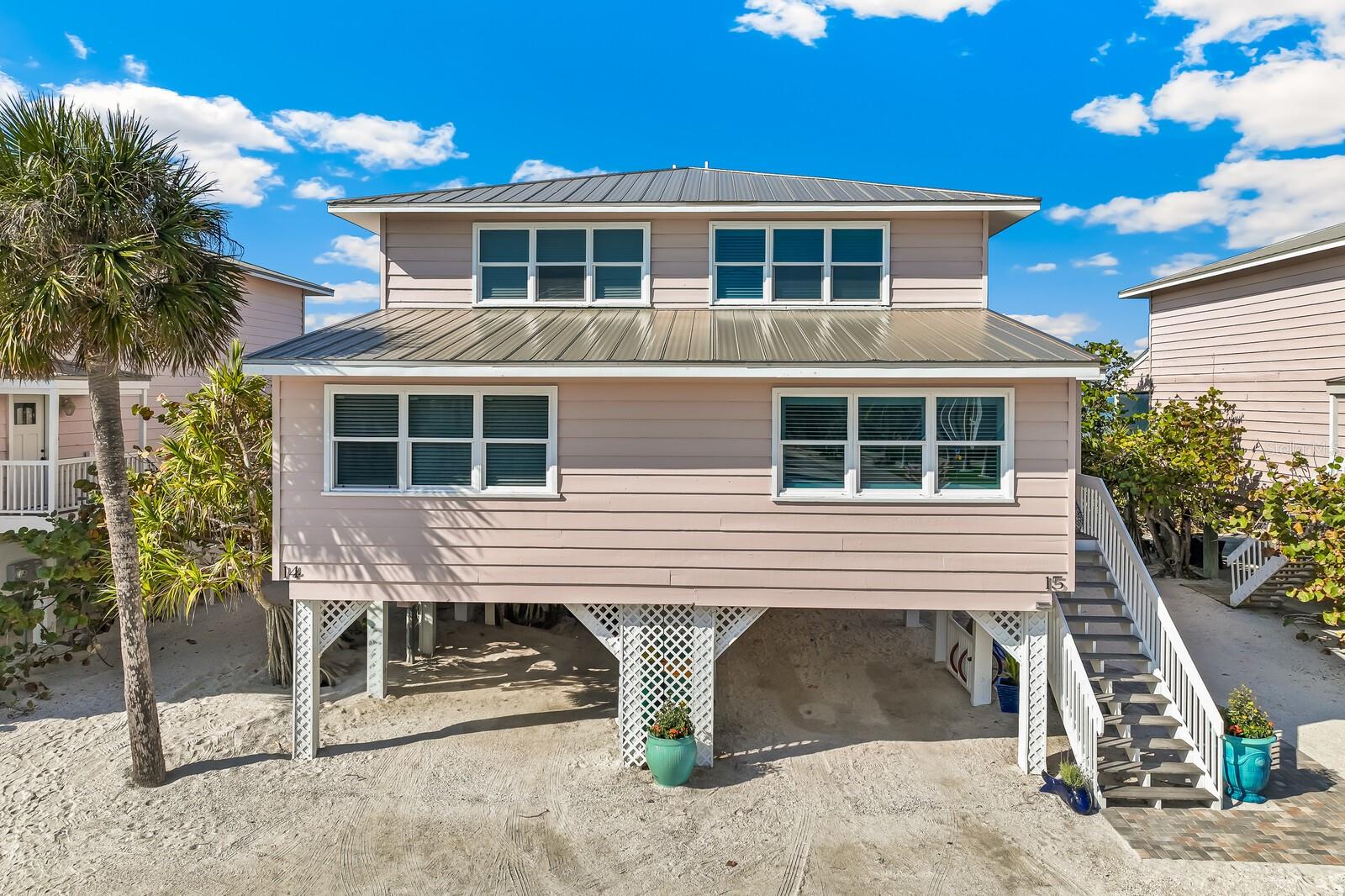 Discover coastal living at its finest in this beautifully renovated two-story townhouse, where modern luxury meets beachfront charm. Step through the welcoming entry, featuring a distinctive porthole window and cozy bench, into an open-concept living space that captures the essence of Florida living. The thoughtfully designed interior showcases recent top-to-bottom improvements, including impact-resistant glass windows, a durable metal roof, and elegant 12"x18" wood grain tile throughout. The custom kitchen is a chef's dream, boasting Viking appliances, marble countertops, and a French door refrigerator. A sophisticated beverage bar with dual refrigerator drawers makes entertaining a breeze. Wake up to stunning Gulf views in the primary bedroom, where a wall of windows brings the outside in. The living room features built-in bookcases perfect for displaying your favorite beach reads, while the custom banquette offers a charming spot for morning coffee or casual dining. Outdoor living spaces include a Gulf-front porch ideal for watching spectacular sunsets and a convenient outdoor shower for rinsing off sandy toes. Two covered parking spaces, bicycle storage, and dedicated closets for beach gear make coastal living effortless. Located within walking distance to Boca Grande's charming village, this 1,408-square-foot residence offers the perfect blend of sophisticated comfort and island convenience. A new HVAC system ensures year-round comfort in this meticulously maintained coastal retreat.