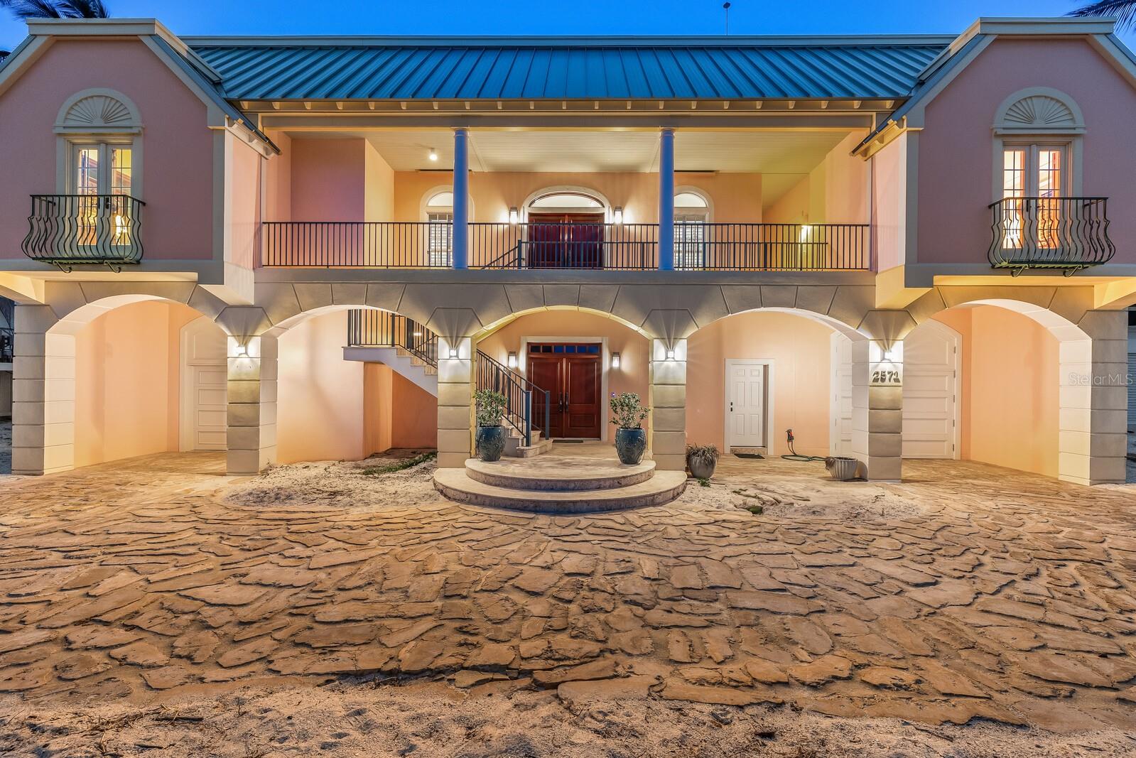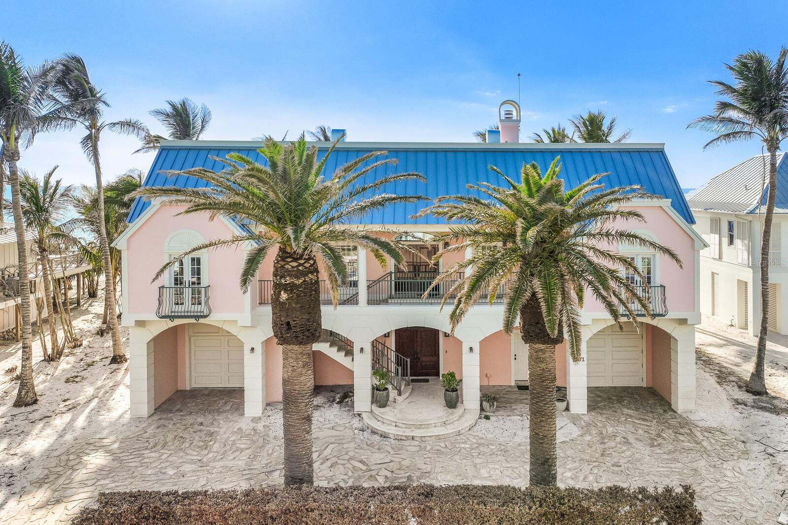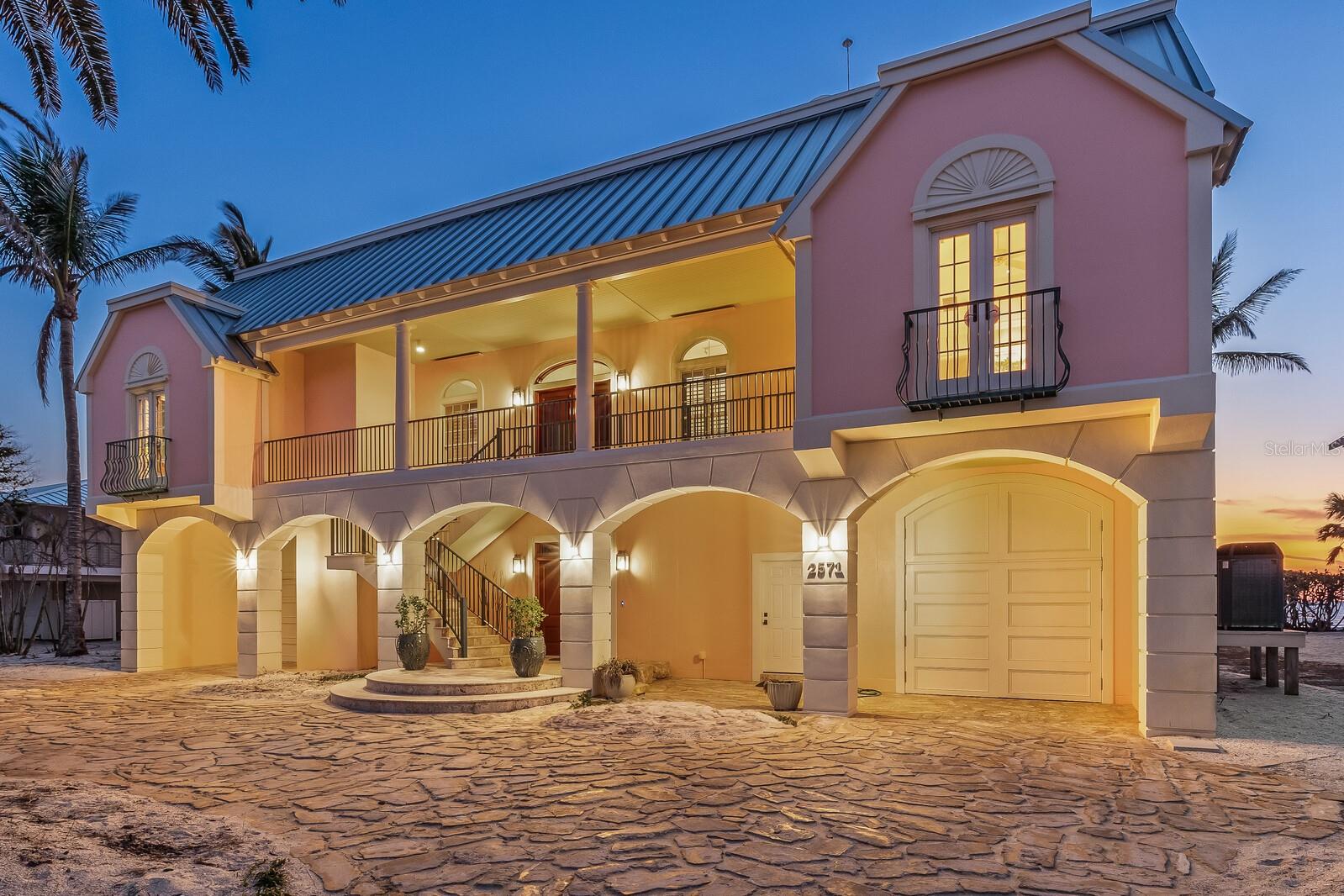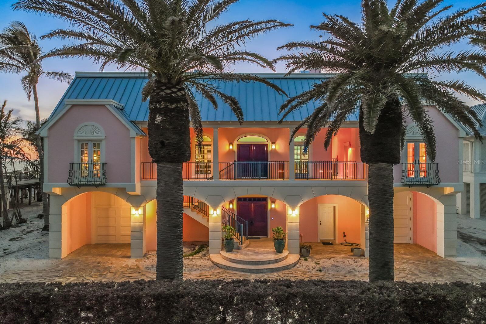 Welcome to beach front paradise! Warmth and privacy are the hallmarks of this stunning Gulf front home. Each room is well appointed with lovely architectural details. Solid teak front doors open to the living/dining area with arched windows, a gas fireplace, custom stone mantel, tray ceiling, and unobstructed views of the Gulf of Mexico. No details were overlooked in the gourmet kitchen. A generous butcher block island is surrounded by a 48" SubZero refrigerator, a 48" duel fuel Wolf range with 4 burners, 2 char-broilers and 2 ovens, 2 dishwashers, a wine cooler, ice maker, and a chilled water purifier. The private tray ceiling primary bedroom has a set of sliding doors opening to a sun deck overlooking the Gulf. The dedicated, private den is filled with custom built bookcases and cabinetry. There is an additional second level bonus room that can either serve as a private office or kid's playroom. Your guests will appreciate the separate 4 bedroom wing on the opposite side of the house. Custom features are abundant throughout; plantation shutters, travertine tile, wood flooring, elevator, two oversized garages, as well as finished lower level storage. Step onto the Gulf front pool deck and enjoy tropical breezes and glorious sunsets.