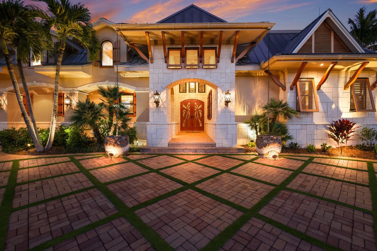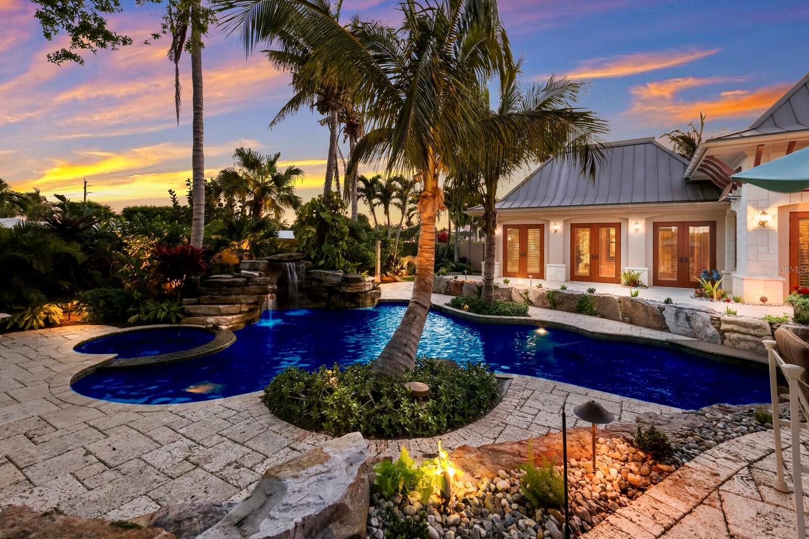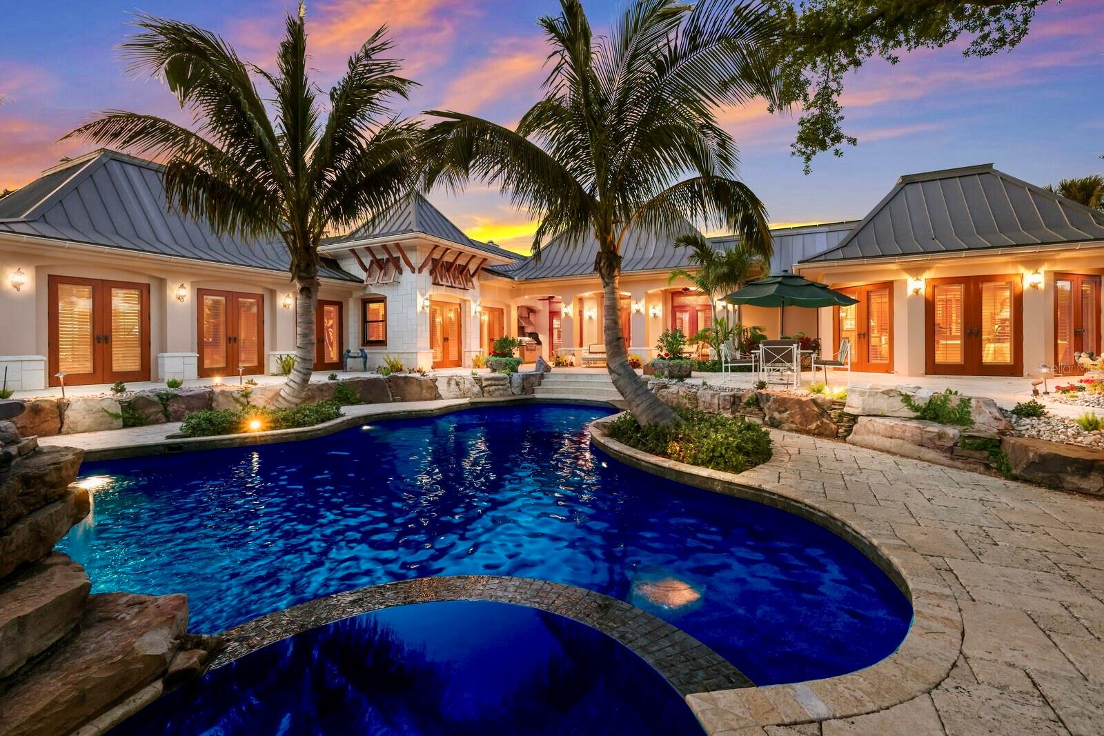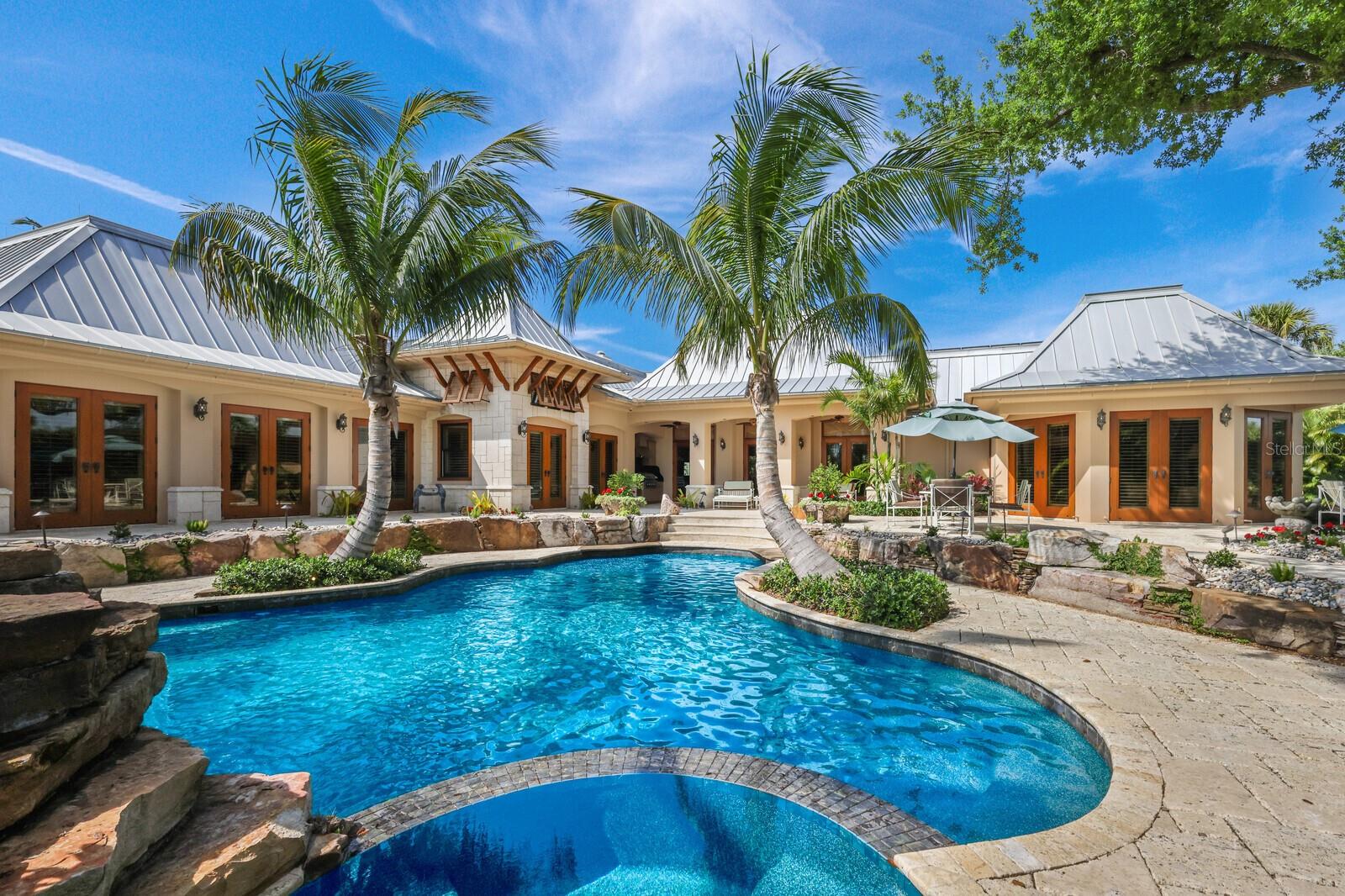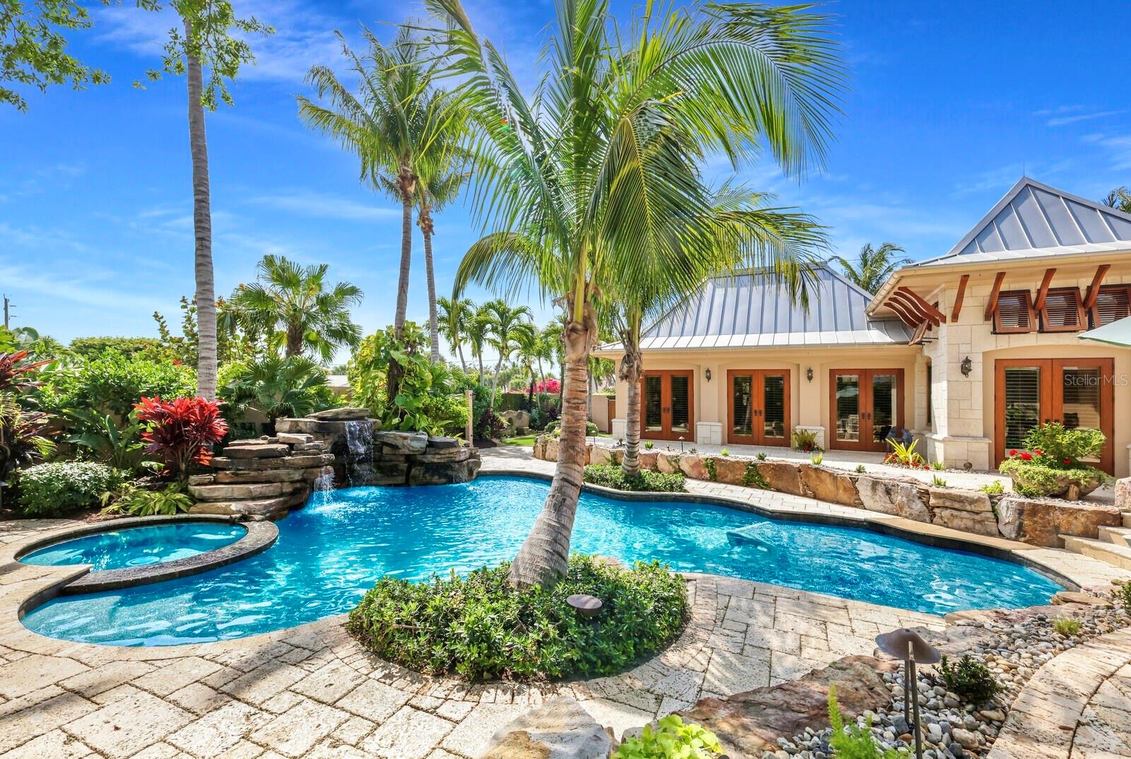 Welcome to 1000 East Railroad Avenue, a breathtaking oasis nestled within the historic district of Boca Grande. Situated on a sprawling half-acre lot, this 6,417 square foot residence offers a harmonious blend of luxurious living and timeless West Indies-inspired architecture. Completely remodeled and reconstructed between 2010 and 2012, no expense was spared in creating this masterpiece of design and craftsmanship. Custom finishes grace every corner, showcasing exquisite mahogany and cypress details complemented by custom impact glass windows and doors that bathe the interior with natural light. Notably, none of the living areas in this residence experienced any water damage from past hurricanes. As you step outside, prepare to be enchanted by your own private tropical paradise. A heated pool and spa beckon for relaxation, accompanied by a tranquil waterfall and a glass tile sun shelf perfect for soaking up the Florida sun. Entertain guests effortlessly in the outdoor kitchen area, surrounded by mature tropical landscaping and expertly crafted hardscape. A backyard mosquito mist system ensures year-round comfort, while whole-home landscape lighting adds a magical ambiance to the evenings. The seamless transition of Dominican coral stone from exterior to interior enhances the flow of design and architecture. Inside, modern luxury meets convenience with a whole-home Sonos sound system and automated Lutron lighting control. The chef's kitchen is a culinary haven, boasting stunning river granite countertops, a spacious island, and top-of-the-line appliances. Multiple bar areas and a gracious dining room complement the spacious living room, creating the perfect setting for gatherings. Retreat to the dedicated home office for work or unwind with loved ones in the upstairs entertainment room. The master suite enjoys its own wing, offering a sumptuous bathroom complete with a jetted tub, walk-in shower, dual vanities, and dual walk-in closets. Privacy and security are paramount, with a concrete block stucco wall enclosing the property and two power-operated gates leading to the paver driveway adorned with decorative turf inlays. With impeccable finishes and woodworking throughout, 1000 East Railroad Avenue is truly a must-see property were indoor and outdoor living blend seamlessly together.