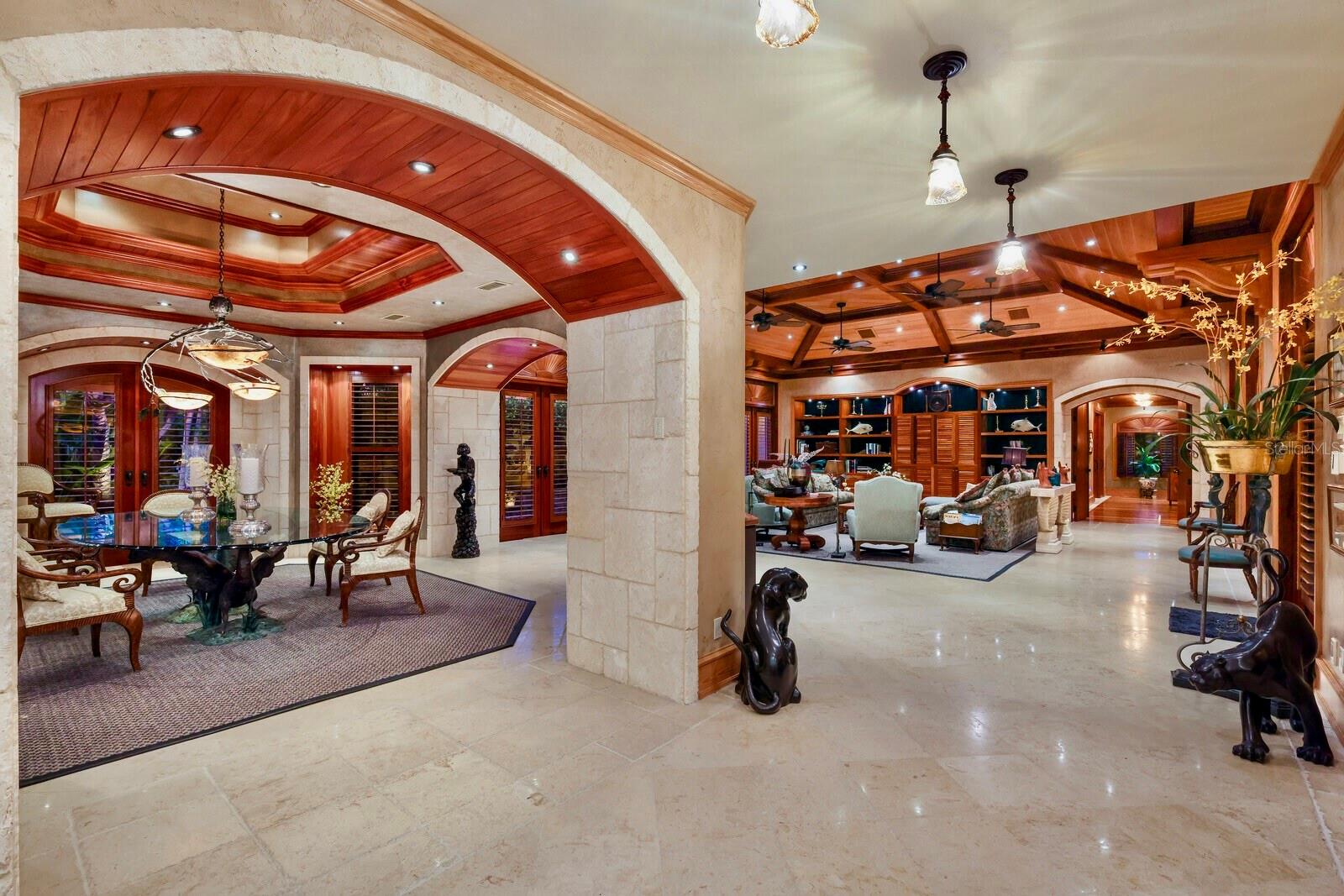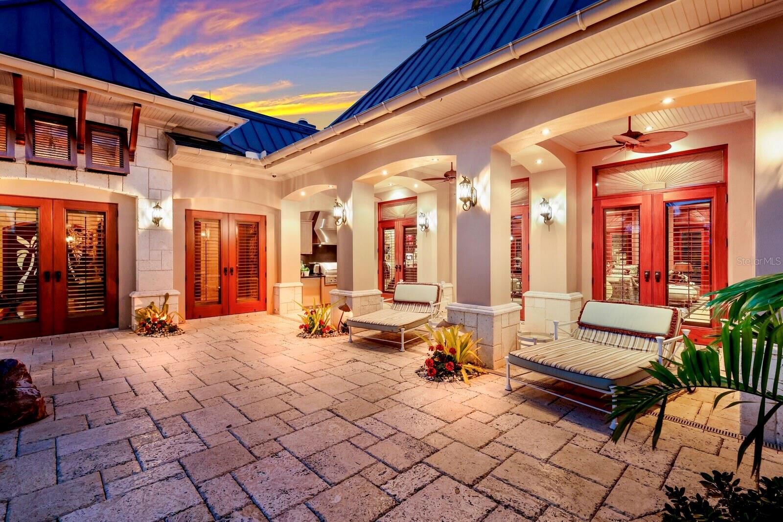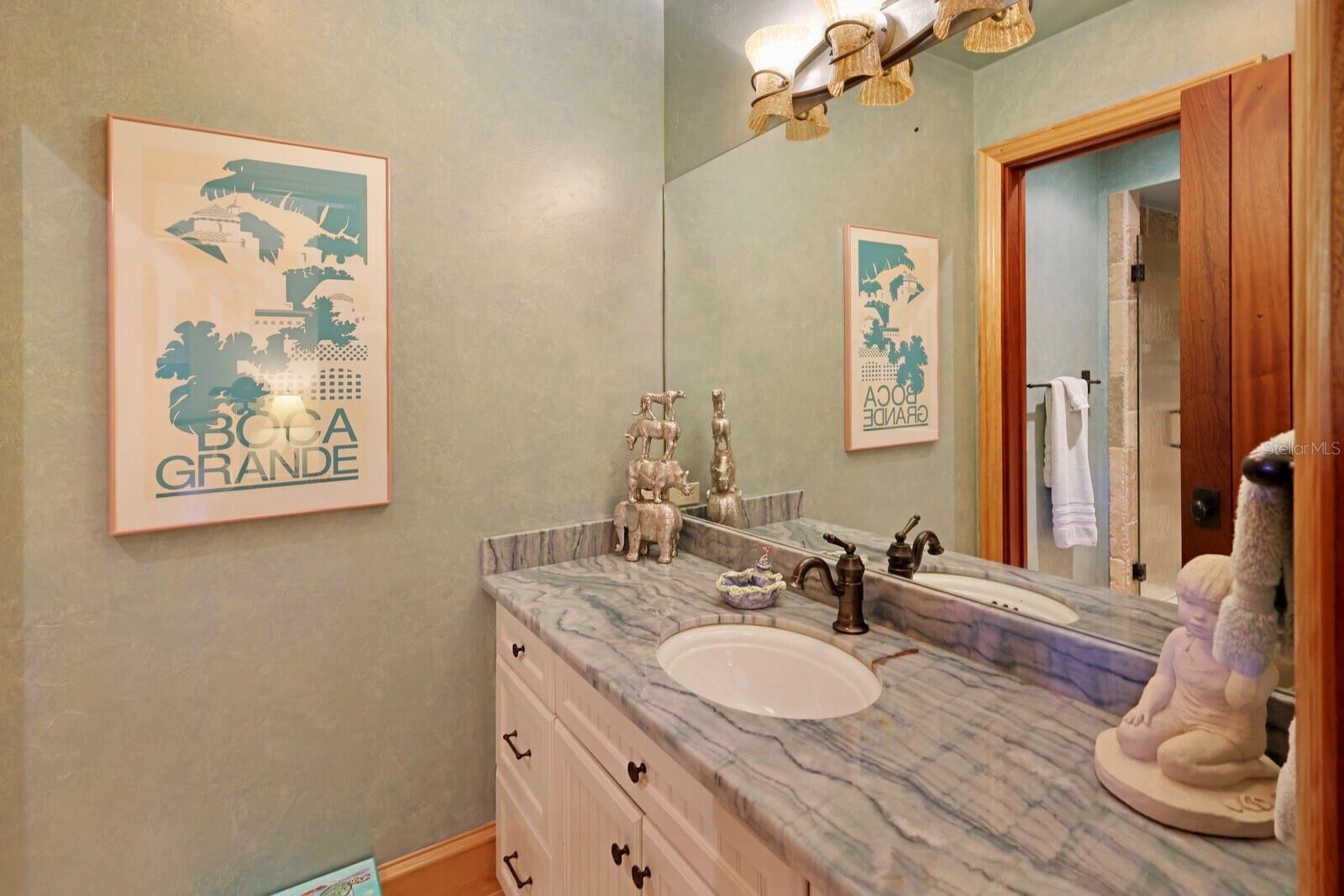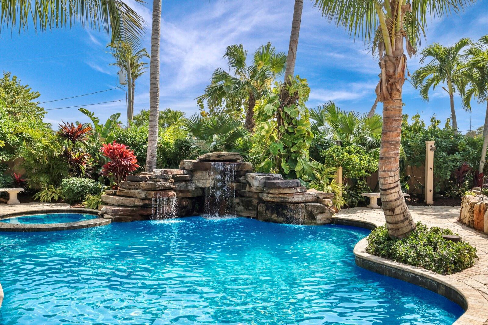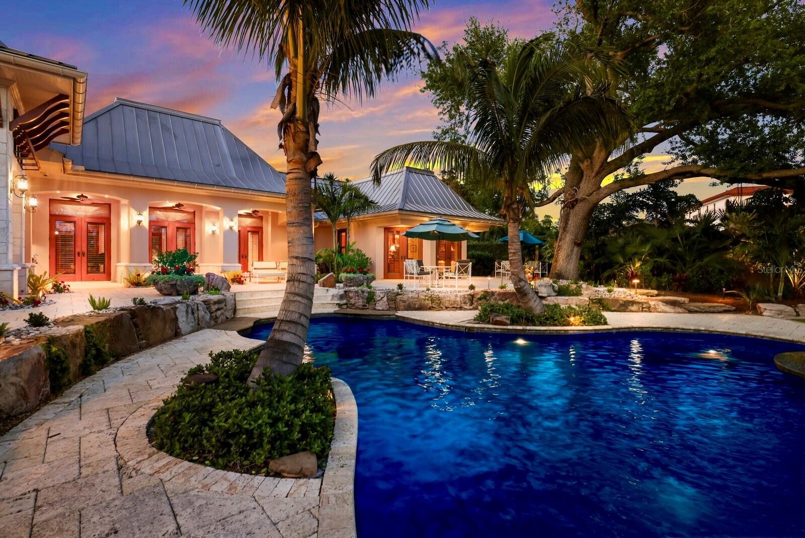 Welcome to 1000 East Railroad Avenue, a breathtaking oasis nestled within the historic district of Boca Grande. Situated on a sprawling half-acre lot, this 6,417 square foot residence offers a harmonious blend of luxurious living and timeless West Indies-inspired architecture. Completely remodeled and reconstructed between 2010 and 2012, no expense was spared in creating this masterpiece of design and craftsmanship. Custom finishes grace every corner, showcasing exquisite mahogany and cypress details complemented by custom impact glass windows and doors that bathe the interior with natural light. Notably, none of the living areas in this residence experienced any water damage from past hurricanes. As you step outside, prepare to be enchanted by your own private tropical paradise. A heated pool and spa beckon for relaxation, accompanied by a tranquil waterfall and a glass tile sun shelf perfect for soaking up the Florida sun. Entertain guests effortlessly in the outdoor kitchen area, surrounded by mature tropical landscaping and expertly crafted hardscape. A backyard mosquito mist system ensures year-round comfort, while whole-home landscape lighting adds a magical ambiance to the evenings. The seamless transition of Dominican coral stone from exterior to interior enhances the flow of design and architecture. Inside, modern luxury meets convenience with a whole-home Sonos sound system and automated Lutron lighting control. The chef's kitchen is a culinary haven, boasting stunning river granite countertops, a spacious island, and top-of-the-line appliances. Multiple bar areas and a gracious dining room complement the spacious living room, creating the perfect setting for gatherings. Retreat to the dedicated home office for work or unwind with loved ones in the upstairs entertainment room. The master suite enjoys its own wing, offering a sumptuous bathroom complete with a jetted tub, walk-in shower, dual vanities, and dual walk-in closets. Privacy and security are paramount, with a concrete block stucco wall enclosing the property and two power-operated gates leading to the paver driveway adorned with decorative turf inlays. With impeccable finishes and woodworking throughout, 1000 East Railroad Avenue is truly a must-see property were indoor and outdoor living blend seamlessly together.