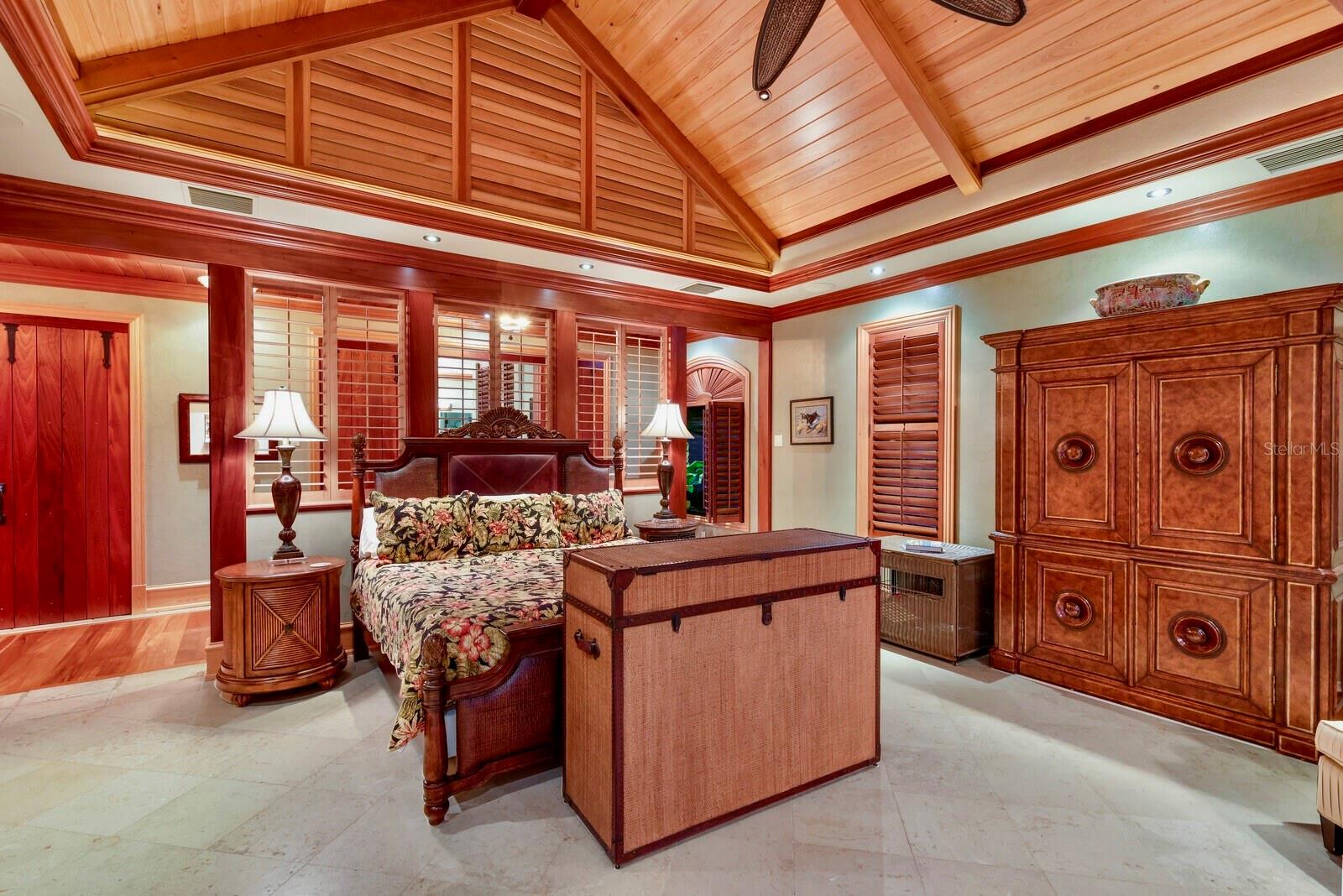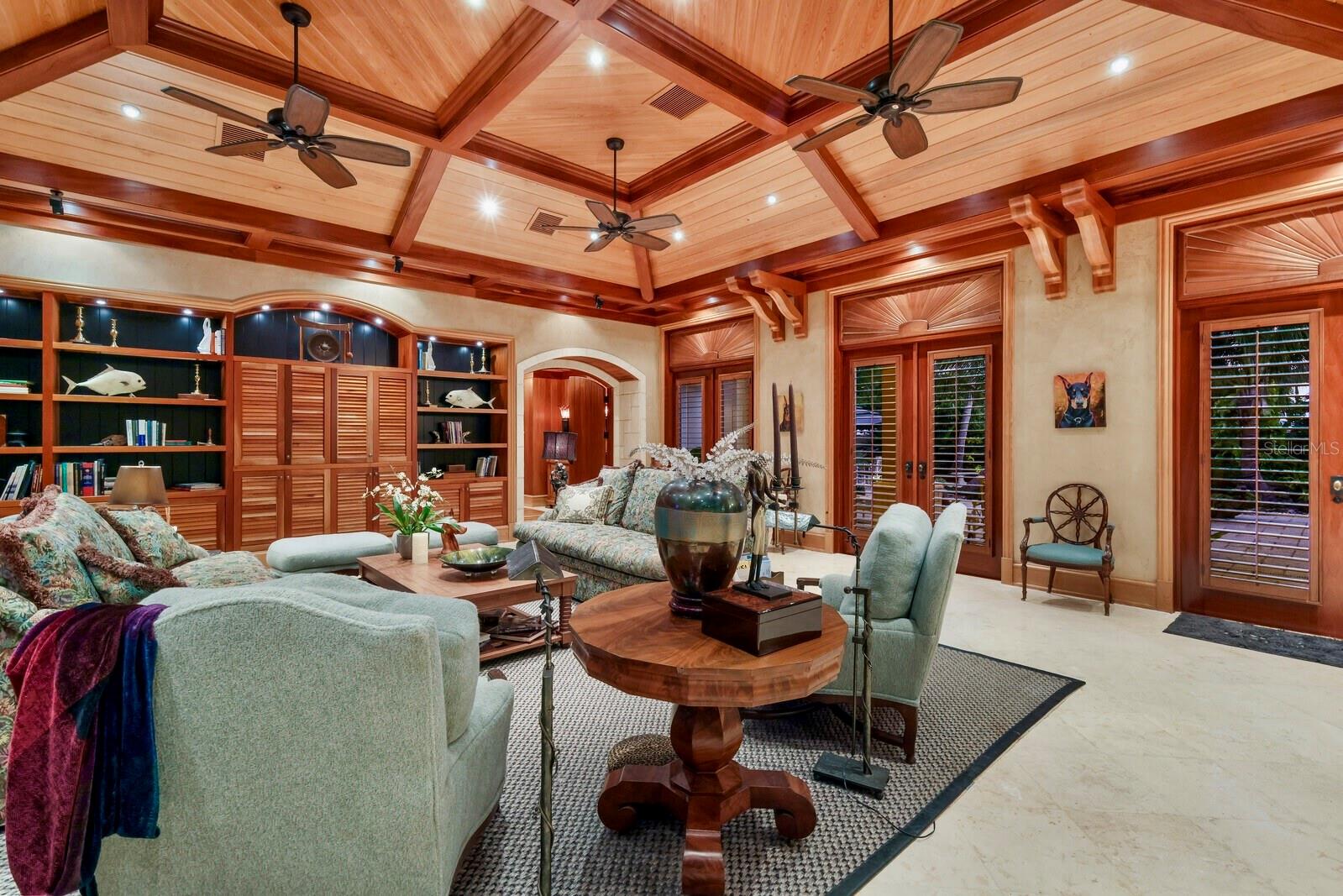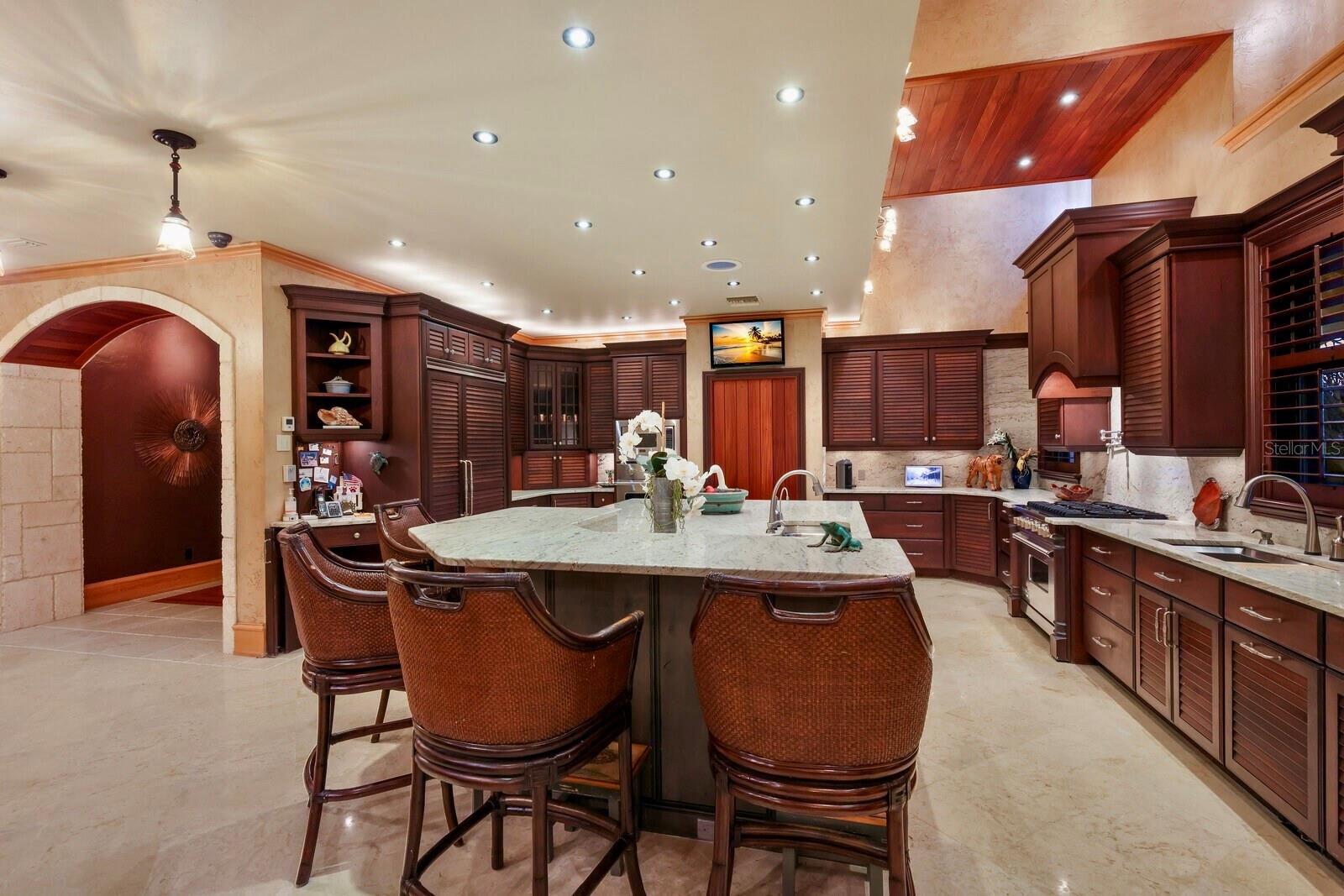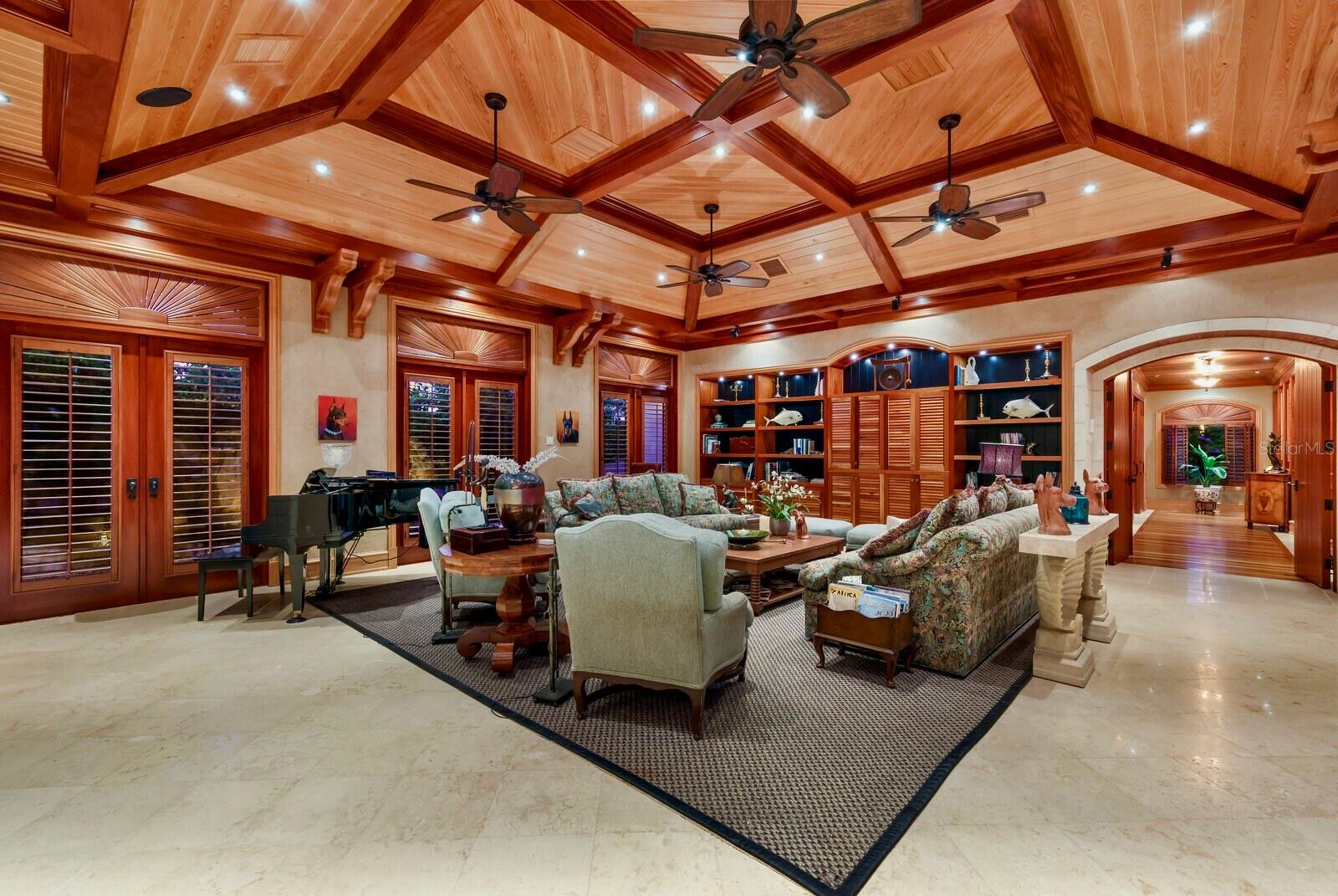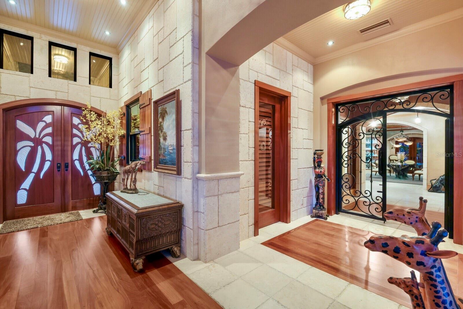 Welcome to 1000 East Railroad Avenue, a breathtaking oasis nestled within the historic district of Boca Grande. Situated on a sprawling half-acre lot, this 6,417 square foot residence offers a harmonious blend of luxurious living and timeless West Indies-inspired architecture. Completely remodeled and reconstructed between 2010 and 2012, no expense was spared in creating this masterpiece of design and craftsmanship. Custom finishes grace every corner, showcasing exquisite mahogany and cypress details complemented by custom impact glass windows and doors that bathe the interior with natural light. Notably, none of the living areas in this residence experienced any water damage from past hurricanes. As you step outside, prepare to be enchanted by your own private tropical paradise. A heated pool and spa beckon for relaxation, accompanied by a tranquil waterfall and a glass tile sun shelf perfect for soaking up the Florida sun. Entertain guests effortlessly in the outdoor kitchen area, surrounded by mature tropical landscaping and expertly crafted hardscape. A backyard mosquito mist system ensures year-round comfort, while whole-home landscape lighting adds a magical ambiance to the evenings. The seamless transition of Dominican coral stone from exterior to interior enhances the flow of design and architecture. Inside, modern luxury meets convenience with a whole-home Sonos sound system and automated Lutron lighting control. The chef's kitchen is a culinary haven, boasting stunning river granite countertops, a spacious island, and top-of-the-line appliances. Multiple bar areas and a gracious dining room complement the spacious living room, creating the perfect setting for gatherings. Retreat to the dedicated home office for work or unwind with loved ones in the upstairs entertainment room. The master suite enjoys its own wing, offering a sumptuous bathroom complete with a jetted tub, walk-in shower, dual vanities, and dual walk-in closets. Privacy and security are paramount, with a concrete block stucco wall enclosing the property and two power-operated gates leading to the paver driveway adorned with decorative turf inlays. With impeccable finishes and woodworking throughout, 1000 East Railroad Avenue is truly a must-see property were indoor and outdoor living blend seamlessly together.