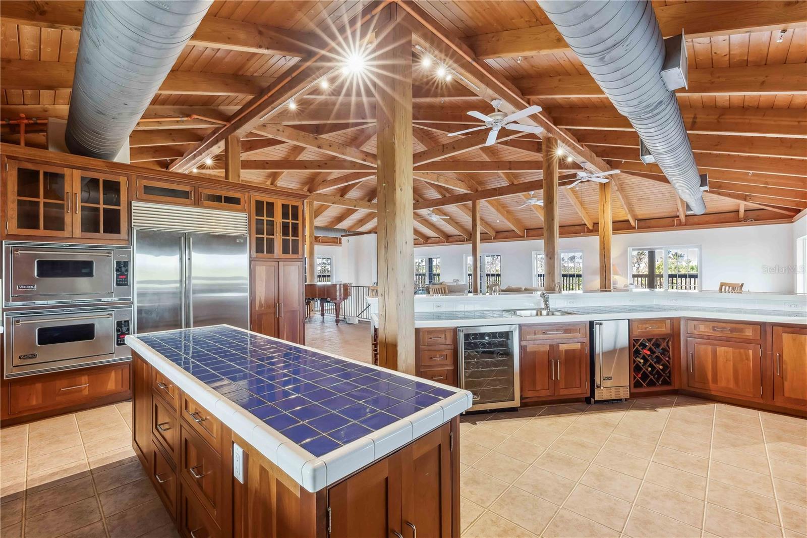 One or more photo(s) has been virtually staged. 200 Palms- a custom retreat bordering nature preserve positioned on 1.35 acres at the end of a quiet cul-de-sac and backing to a serene nature preserve, this custom-built home blends warm, natural elements with thoughtful design. Soaring Douglas Fir vaulted ceilings crown the expansive great room, where rich cherry cabinetry, Viking and Sub-Zero appliances, and an oversized kitchen island that seats eight create a comfortable space for gathering. The home’s two main levels feature 10-foot-wide, fully screened wraparound decks—ideal for enjoying the peaceful, private setting. Multiple sets of double French doors create seamless indoor-outdoor flow from nearly every room. With four spacious bedrooms, three full bathrooms, and an additional office or fifth bedroom with a half bath, the layout is both flexible and functional. The ground floor, with 4 car garage and workshop, is accessible—like all three levels—via a private elevator. Additional updates include a new metal roof (July 2021), fresh carpeting, and two recently replaced air conditioning units. This home offers a rare combination of craftsmanship, privacy, and modern comfort—perfect for relaxed island living.