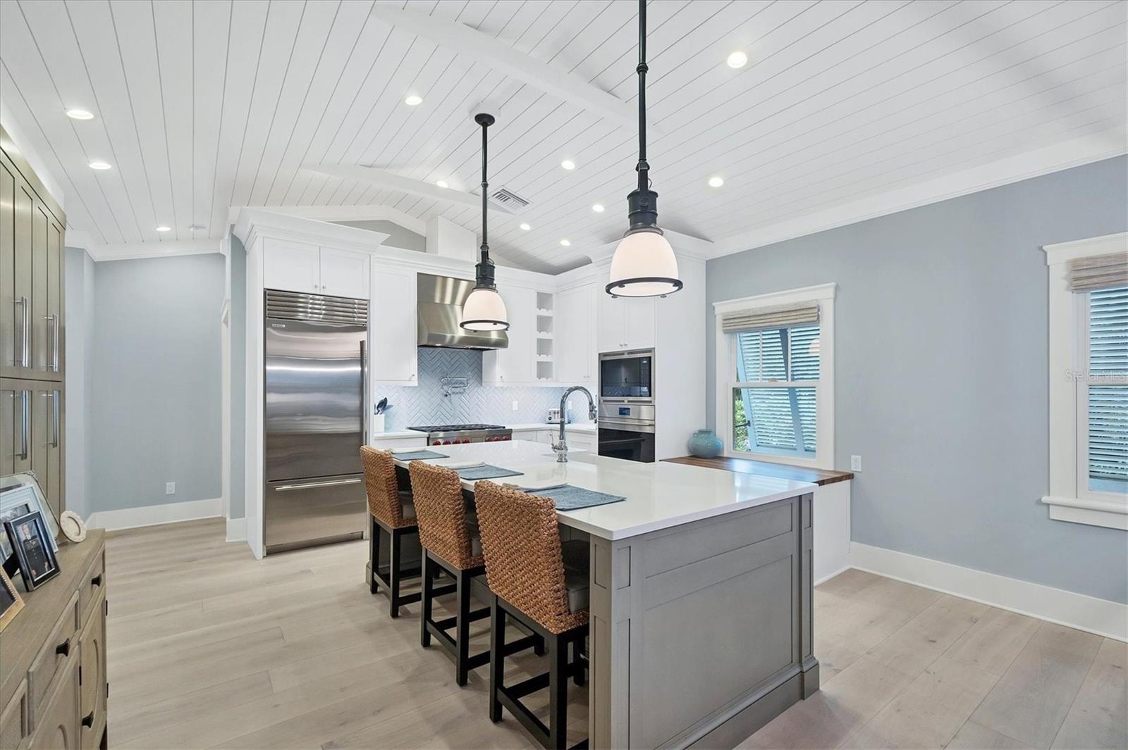 Historic 3 bedroom, 3 ½ bath completely renovated home with garage, located just steps away from shopping, restaurants and the beach! In 2019, this historic and contributing Boca Grande cottage underwent a full renovation and addition which included an interior staircase and second living floor with a third bedroom suite and bathroom as well as a full-size garage with space for a car and golf cart. All work was completed by Safety Harbor Builders boasting incredible custom carpentry including cabinets, built-ins, closets, crown molding, 8-inch baseboards, solid wood custom doors and beautifully crafted ceilings. Wide plank white oak wood flooring runs throughout main living areas, kitchen and all bedrooms. A chef’s dream kitchen includes a 6 burner Wolf range with pot filler, plus an additional Wolf wall oven, Wolf built-in microwave / convection oven, Bosch dishwasher and Sub-Zero refrigerator. Other features include a large island with a farmhouse sink, Quartz countertops, and a built-in wall pantry with easy access drawers. Three bedrooms, all with private full baths include custom glass enclosures, and showers detailed with Carrara marble and / or hammered subway tiles, one with a cast iron tub. For guests, there is a powder room off the living area. The laundry room includes a second custom pantry for additional storage and Whirlpool washer and dryer. Finished with all impact rated windows and doors plus with a new metal roof in 2025, with a new tankless water heater and all appliances in 2025. The propane tank provides for the range, tankless water heater and fireplace. The house is also generator ready. Lush landscaping, irrigation and lighting are all installed for privacy and beauty. Use the welcoming front porch to enjoy and gather with friends and family in a truly historic custom architecturally designed Boca Grande cottage built to today’s standards!