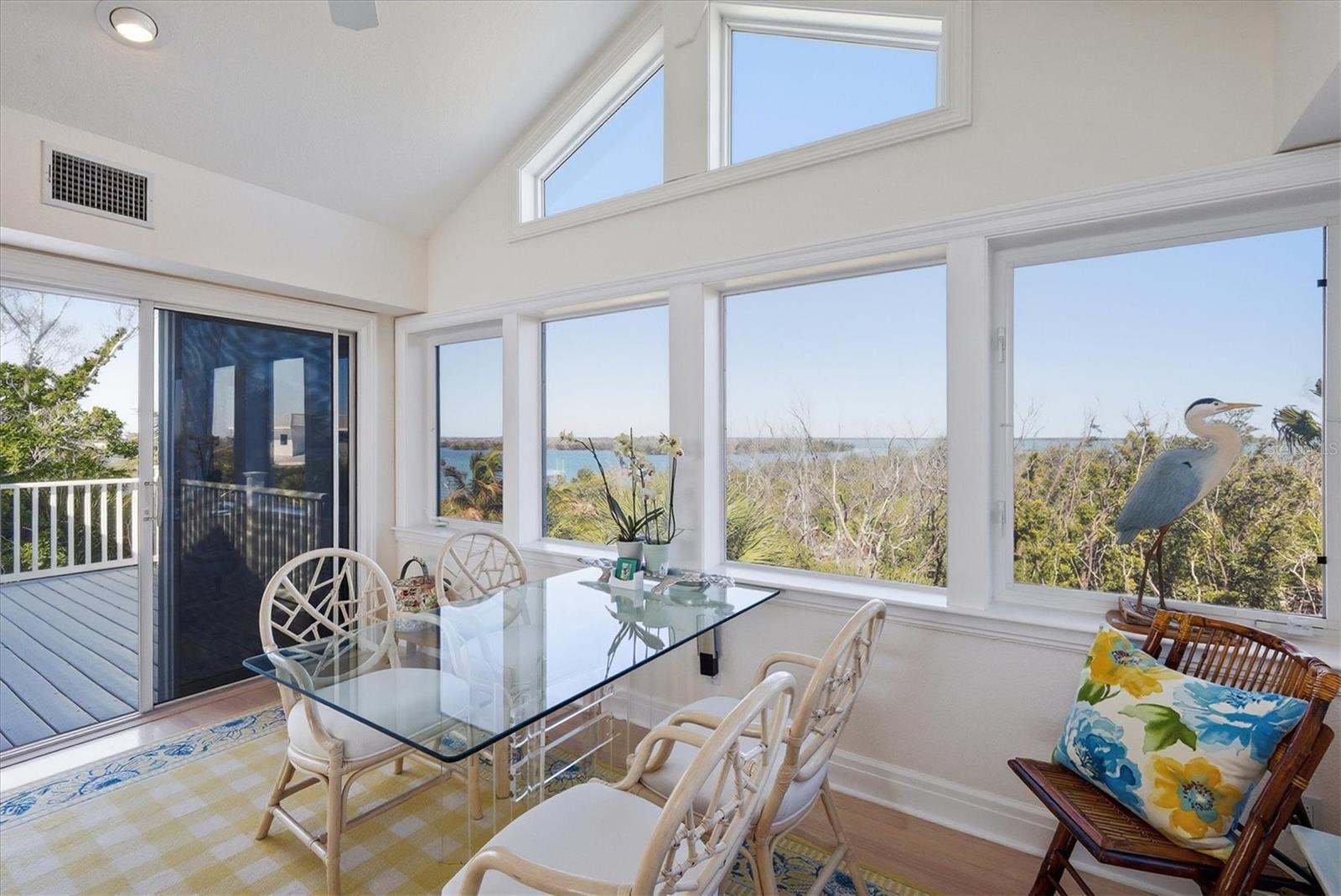 Located on Gasparilla Island beyond a private driveway, this one-of-a-kind retreat spans generous acreage and captures panoramic bay and coastal water views. Positioned on 1.88 acres and framed by native landscaping, the serene setting feels worlds away, yet remains just minutes from the charm of Boca Grande village. Spanning 2,951 square feet of refined living space with a total footprint of 6,287 square feet, the residence features three bedrooms plus a study or bonus room that can easily serve as a fourth bedroom, along with three-and-a-half baths. An interior elevator services all floors, ensuring effortless access throughout. The interiors reflect a sophisticated coastal aesthetic, highlighted by light-colored hardwood floors and thoughtfully designed living spaces. The study features a wet bar, opens to an exterior porch, and offers a perfect spot for stargazing, while the upstairs primary suite enjoys its own private porch—both providing sweeping Bay views and front-row seats to abundant wildlife, including osprey, pelicans, and egrets. An expansive porch running the length of the home invites morning coffee with sunrises over the water and evenings bathed in soft sunset hues. Electric hurricane shutters provide peace of mind, while the three-car, climate-controlled garage plus dedicated golf cart space adds everyday convenience. Leisurely bike rides or golf cart trips along the paved path lead directly into the village of Boca Grande, known for exceptional dining, unique shopping, world-class fishing, and outstanding boating. Properties of this size, setting, and water-view presence are exceptionally rare on the island, making this a truly special opportunity.