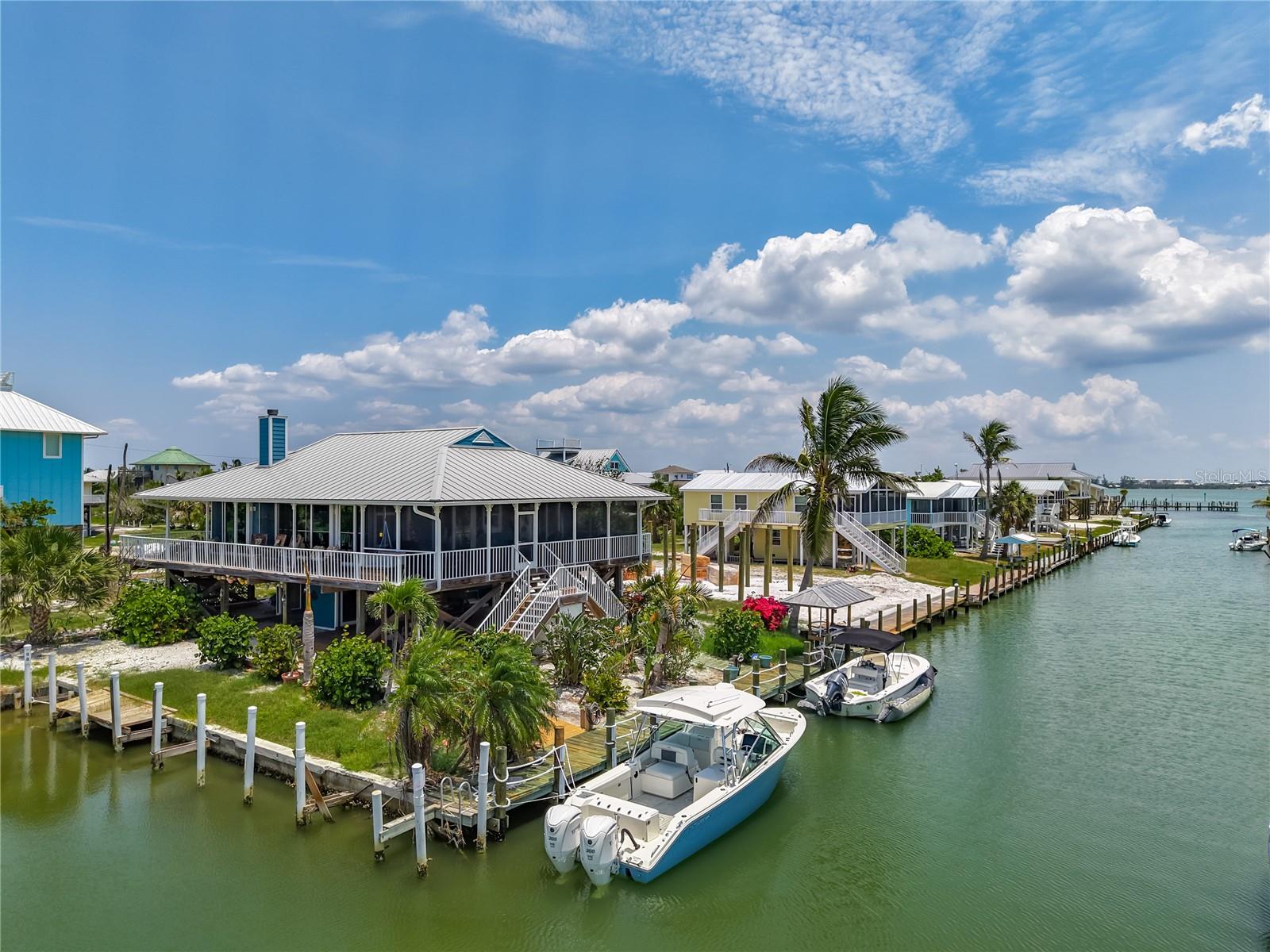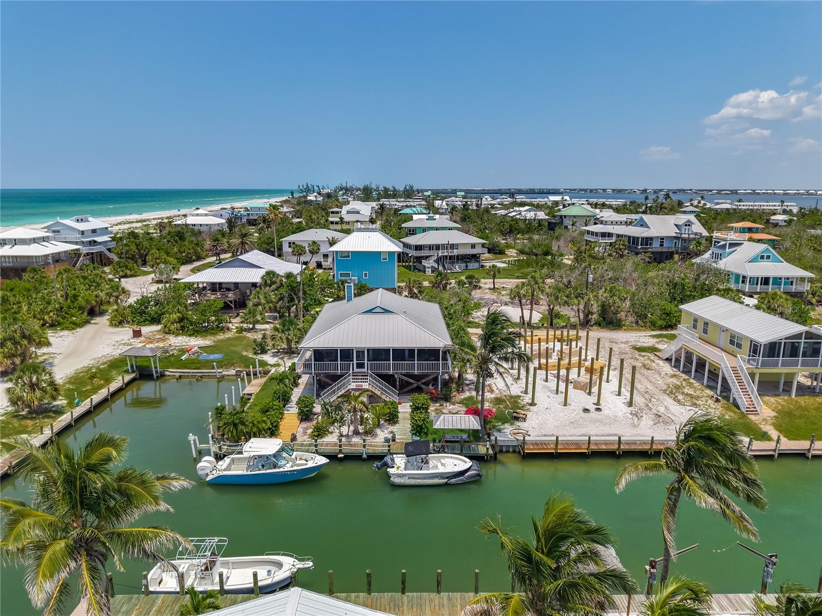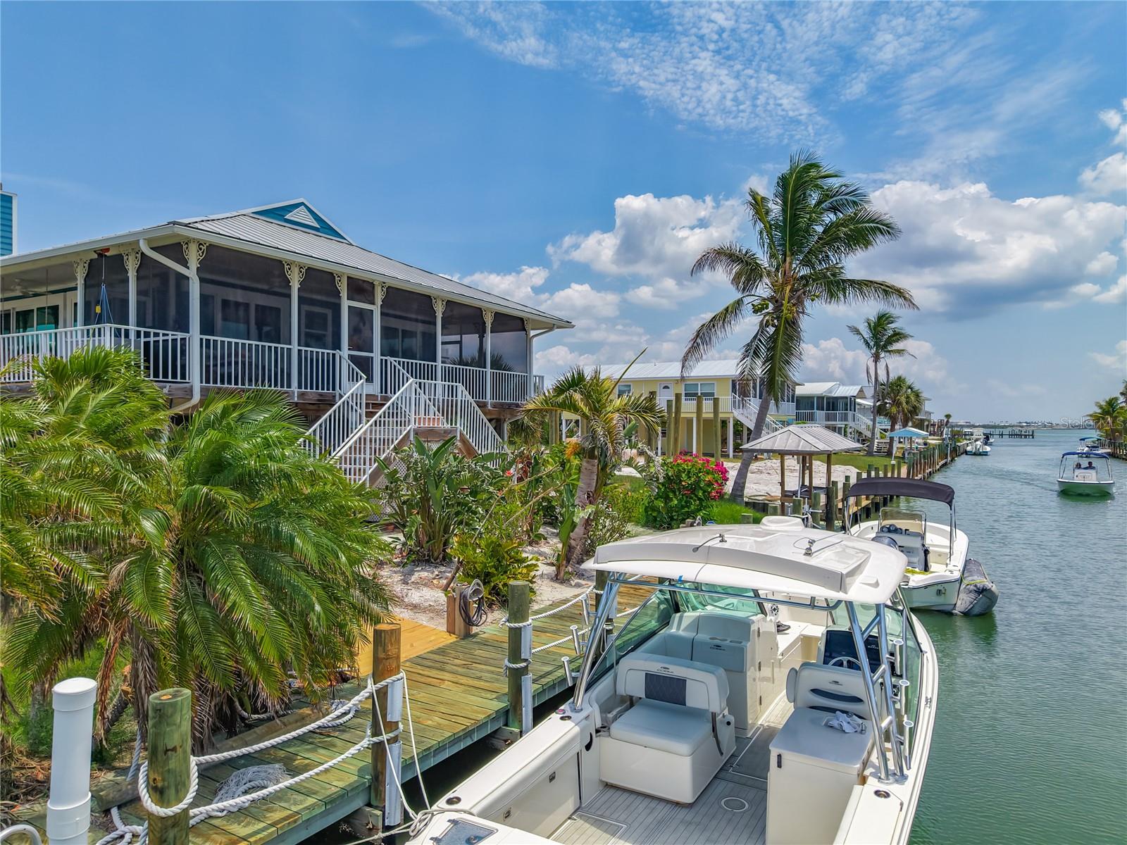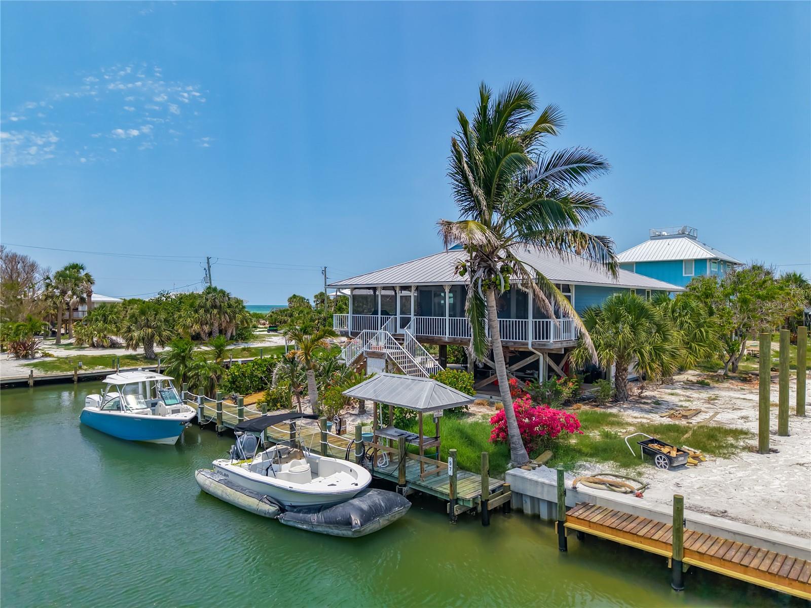 Come With Two Boat, Furnished PLUS More ! Welcome to your Key West-style retreat on Little Gasparilla Island! Nestled on the desirable southwest corner of the North Canal—one of only two canals on the island—this rare gem offers 65 feet of private dock frontage. The well-maintained property features a newly updated seawall and dock (2019), offering effortless boat access. As you arrive, tropical landscaping and lush foliage set the tone for your serene island oasis. Inside, an open-concept layout is highlighted by a stunning vaulted ceiling with coastal plank accents and brand-new luxury vinyl plank flooring. A wood-burning fireplace—perfect for cool island nights—anchors the spacious great room, ideal for entertaining family and friends. The kitchen, fully renovated in 2022, features beautiful Cambria countertops, new upper and lower cabinetry, and GE Café appliances, including a stove, oven, and dishwasher. The oversized island includes an under-cabinet microwave and large wine fridge—perfect for entertaining. This home offers three well-appointed bedrooms, thoughtfully spaced for privacy. The primary suite boasts partial Gulf views and an ensuite bath with a modern, open-concept design, including a double-sink vanity, walk-in glass shower with penny tile, and water closet. A deep closet offers plenty of space for all your island gear. The second bedroom is a peaceful sanctuary with two large windows that bring in Florida sunshine, a queen-sized layout, and a generous closet. The third bedroom overlooks the canal, features ample closet space, and direct access via sliding doors to the screened sun porch—perfect as a guest room, flex space, or home office. Between the guest bedrooms, you'll find the first-floor laundry room—rare for LGI—equipped with LG washer/dryer and overhead shelving. The adjacent second bathroom mirrors the black-and-white penny tile theme found in the primary suite. Additional upgrades include PGT Miami-Dade hurricane-rated windows and doors, new Hardie board siding and soffits, and an aluminum double-strapped seamless roof. The fireplace was rebuilt to code in 2024, and the upgraded, permitted electrical panel supports a new tankless water heater. The lower deck features 1,200 sq ft of outdoor living space with a TV, fire pit, outdoor shower, and a dumbwaiter for supplies from the dock. There’s also a secure enclosed space for golf cart storage and an adjacent workshop. Enjoy water views from nearly every room—including the living room, dining area, kitchen, and primary bedroom. Sliding doors open onto a large open-air porch that spans the west side of the home, overlooking the canal and Gulf. A screened front porch provides shady comfort with canal views. Deeded beach access is just minutes away, and the island offers miles of uncrowded beaches and world-class fishing for snook, redfish, snapper, and more. This turnkey home includes an inflatable boat lift, and the seller is open to negotiating the inclusion of a 21' Polar center console boat and a six-person Club Car golf cart. Experience the best of island living—schedule your private showing today!