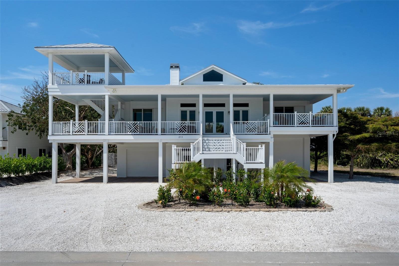 This quintessential Florida beach home captures the essence of Boca Grande living. Enjoy Gulf views, expansive porches, a rooftop tower, and an oversized yard—all just steps from the sand. Set on a private road owned exclusively by street residents, this property ensures no public parking now or in the future. Custom-built by longtime island resident and respected builder Tommy Locke, the home features an airy, open layout perfect for both family life and entertaining. Several en-suite bedrooms and expansive sliding glass doors invite the outdoors in, creating a breezy coastal retreat. Classic Florida pine floors, a wood-burning fireplace, vaulted ceilings, and an abundance of natural light lend warmth and charm throughout. The elevated design includes generous garage and storage space, with a custom-built area large enough to house a center console boat, RV, multiple vehicles, or golf carts. The ground level opens to a sunny and shaded pool deck, complete with a heated pool and plenty of lounging space. Beach access is just steps away, and the shops and restaurants of downtown Boca Grande are minutes by foot or golf cart. Whether you're looking for a peaceful escape or a lively gathering place, this home offers the perfect setting for any Boca Grande lifestyle.