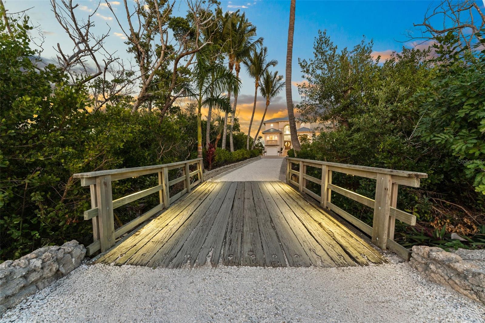 Welcome to 4150 Snail Island Court, a truly one-of-a-kind gated waterfront estate set on 3.57 acres of pristine land and bordered by a protected nature conservatory, offering unmatched privacy and natural beauty. A dramatic, palm-lined driveway with custom lighting creates a grand entrance to this exceptional residence. Built to last, the home is elevated approximately ten steps to the entry and constructed with solid block and concrete, impact-rated windows and doors, and a metal roof. Inside, the home showcases custom solid-wood doors with elegant arched detailing, and a private ELEVATOR servicing all levels for convenience and ease. The main floor is designed for comfortable entertaining and guest accommodations, featuring three guest bedrooms, each with its own ensuite bathroom. The spacious kitchen offers quartz countertops, stainless steel appliances, a breakfast bar, and a cozy dining nook. Adjacent are the formal dining area, living room, and a den with closing doors, ideal for movie nights or flex space. Sliding doors open to a spacious balcony with room for dining, overlooking the pool and surrounding nature. The third floor is dedicated entirely to the owner’s retreat, showcasing a luxurious primary suite with a private balcony, an attached secondary living room with kitchenette, a dedicated office, and two oversized walk-in closets with built-in shelving. The primary bathroom is spacious, has imported Mirano tiles, custom marble countertops, and also features a steam room. Elevated finishes include tray ceilings and decorative wall accents. On the ground floor, a large storage room—easily convertible into a bar or lounge—opens to the outdoor living area. Enjoy a covered lanai, heated pool and spa, and a backyard fire pit, perfect for relaxing or entertaining. Waterfront amenities include a recently rebuilt dock with high-end composite decking and two covered boat lifts. Adding to the uniqueness of this estate, the front yard features a private driving range, making this property as extraordinary as it is luxurious. This rare waterfront offering blends privacy, durability, and resort-style living—an exceptional opportunity on Boca Grande
