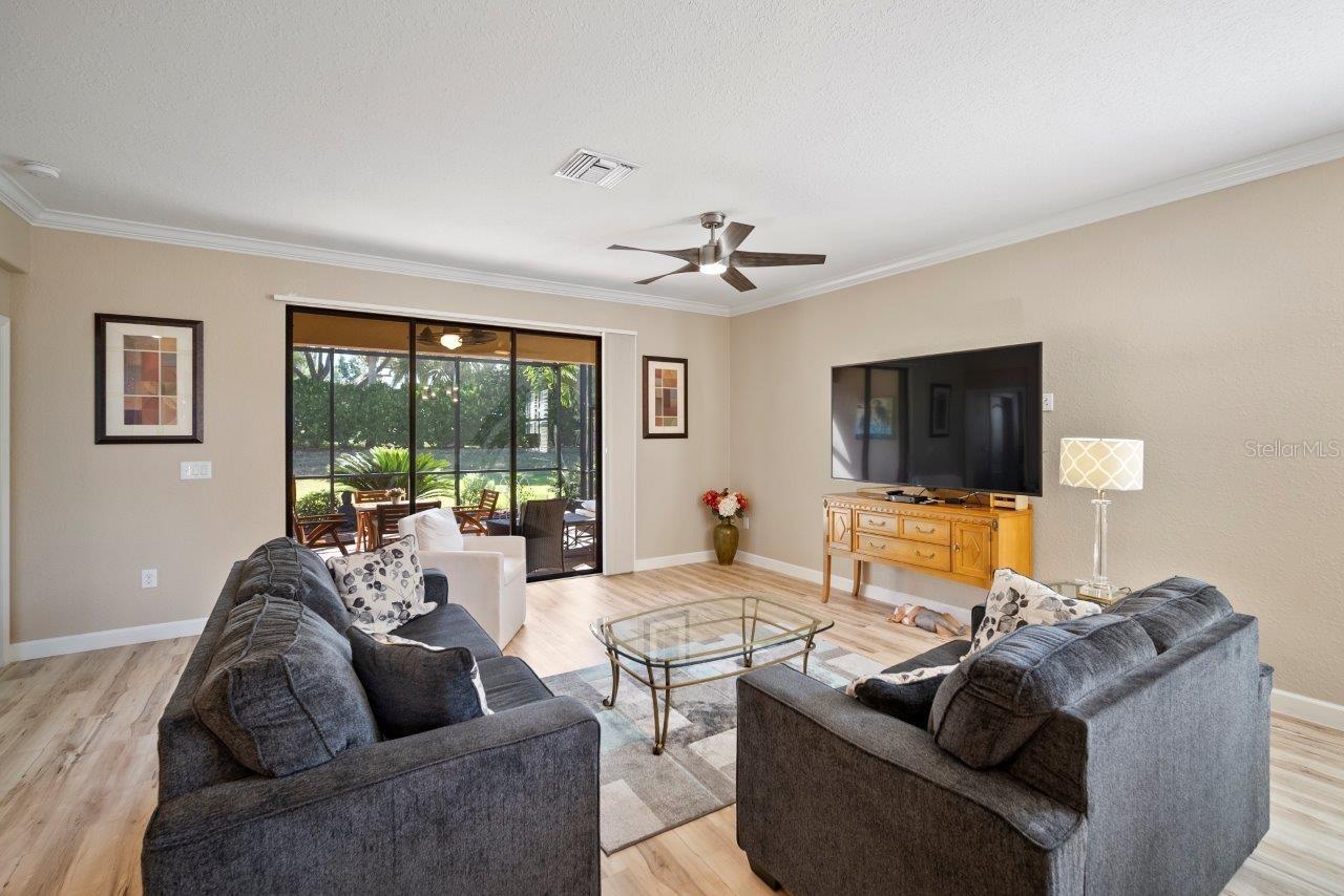 Don’t miss this sought-after turnkey furnished Trevi Floorplan in River Strand Golf and Country Club with an extended private paver lanai. As you step inside you will be greeted by the bright spacious floorplan featuring high ceilings, laminate plank flooring, plantation shutters, and crown molding throughout. The entire inside quarters is composed of simple designs and a neutral color palette. A very classy ambiance that is suitable for any décor style! The kitchen boasts a large island with a breakfast bar, granite counter tops, stainless steel appliances, and a pantry. While the great room includes a triple panel sliding glass door that opens to the extended screened-in paver lanai, making this an entertainers dream! The owner’s suite features dual walk-in closets, and an ensuite bathroom with dual sinks, a walk-in shower, and garden tub. This home offers a split floor plan creating privacy for all your guests. A bonus this home has over other floorplans is the spacious den/bonus room that can be used as a home office, workout room, or theater room! An additional benefit this home has is the non-mandatory golf membership to the clubhouse. River Strand is a gated and maintenance-free resort style community offering a clubhouse with a restaurant, bar & grill, 2 separate community pools and spas, 6 satellite pools, 2 fitness centers, tiki bar, billiard room, game room, tennis and pickle ball courts, and several social activities all year long! All while located minutes from I-75, Costco, Restaurants, shopping, beautiful beaches, and more! Is this home your perfect match? Schedule a showing today!