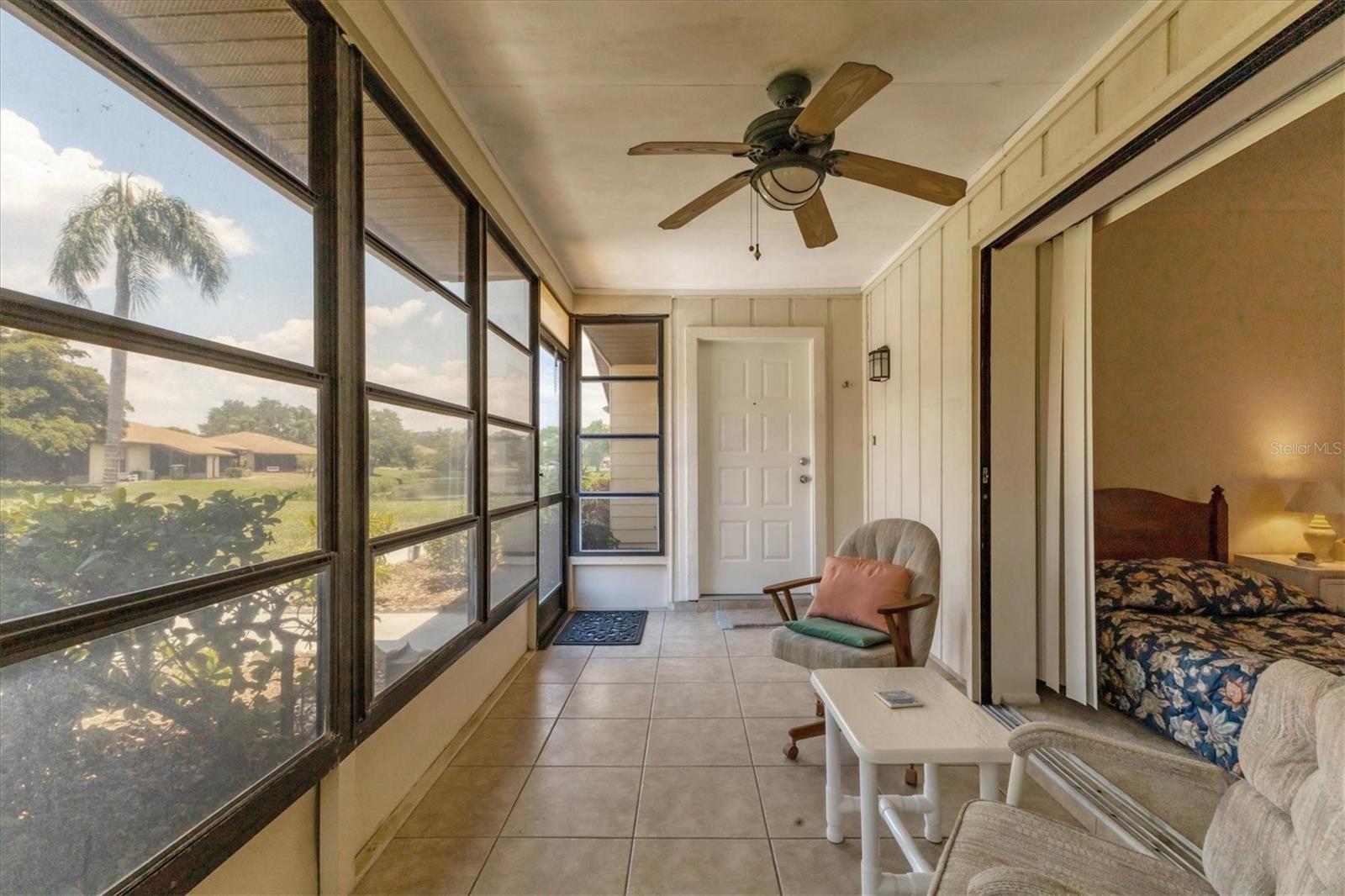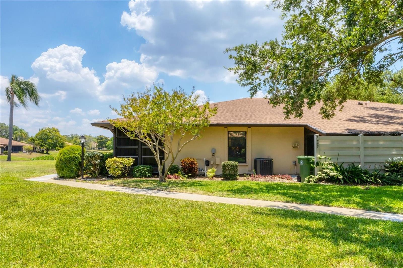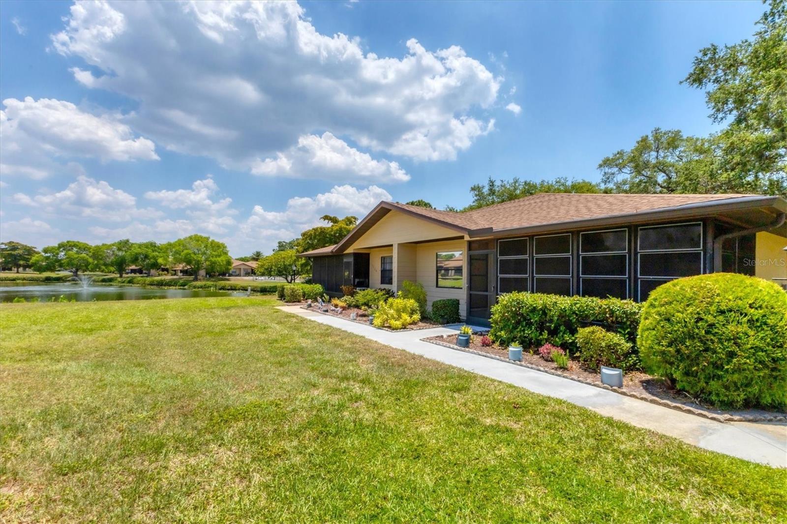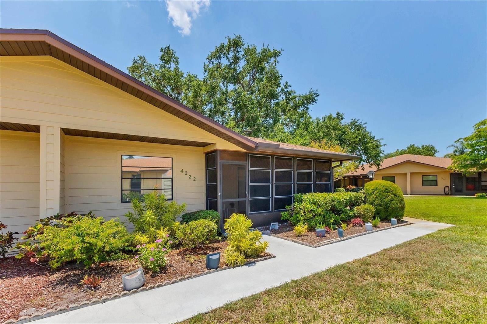 Welcome to Heritage Village West a 55+ community nestled in vibrant West Bradenton, Florida only 5 miles to the beach. This villa is on the inside of the circle in a desirable location in the community, near the pond and green space. This home has irrigation installed and allows the grass to stay beautiful year round. (See realtor remarks) Enter the home through the screened/enclosed lanai with a tile floor, equipped with a ceiling fan and sliding vinyl windows that open to allow a breeze. Some home owners use this space as a dining room and have enclosed it and added AC/duct work. There are sliding glass doors that give an entrance/exit to the guest bedroom or you can enter the home through the front door into the open living room. The kitchen has been updated with granite counter tops, a tile backsplash and newer stainless steel appliances. The kitchen floor is a neutral tile that goes throughout the kitchen, laundry room and both bathrooms. The open floor plan allows a seamless flow from the kitchen, living room and dining area. Off of the kitchen is a private laundry room with full size washer/dryer and built in shelving. There is room in the kitchen for a dining table. The AC is a TRANE and was replaced in 2015. The hot water heater replaced in 2011 and the roof was replaced by the hoa in the last 3-5 years without an assessment. The HOA manages the roof, gutter cleaning, pest control and any other exterior maintenance.The guest bedroom is spacious with a ceiling fan, closet and lots of natural light. The guest bath is across the hallway and has a tile shower with tub. The primary bedroom has a small enclosed lanai with AC and extra storage space. There is an en-suite bathroom. The primary bath has a tile walk in shower with grab bars, glass doors and a single vanity. This home gives that light, bright, warm feeling and is perfect for a second home or a full time Florida residence. It could use some light updating and personal touches. (Flooring, paint, new vanities) but is in good condition and a great location. The most recent updated unit sold for $270k. The community of HVW is a social, tight knit, friendly, well maintained and well managed community in West Bradenton. There are No Assessments and only a $1,000 assessment one time when insurance increased in 2023. Shopping, dining, beaches and more are within a few minutes of this home. Call today to schedule a showing!