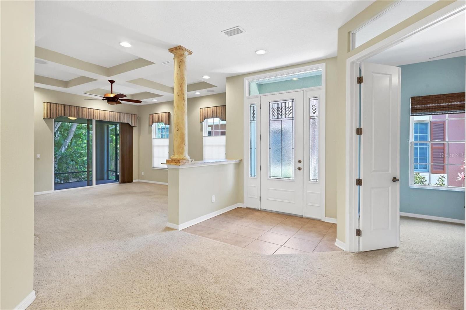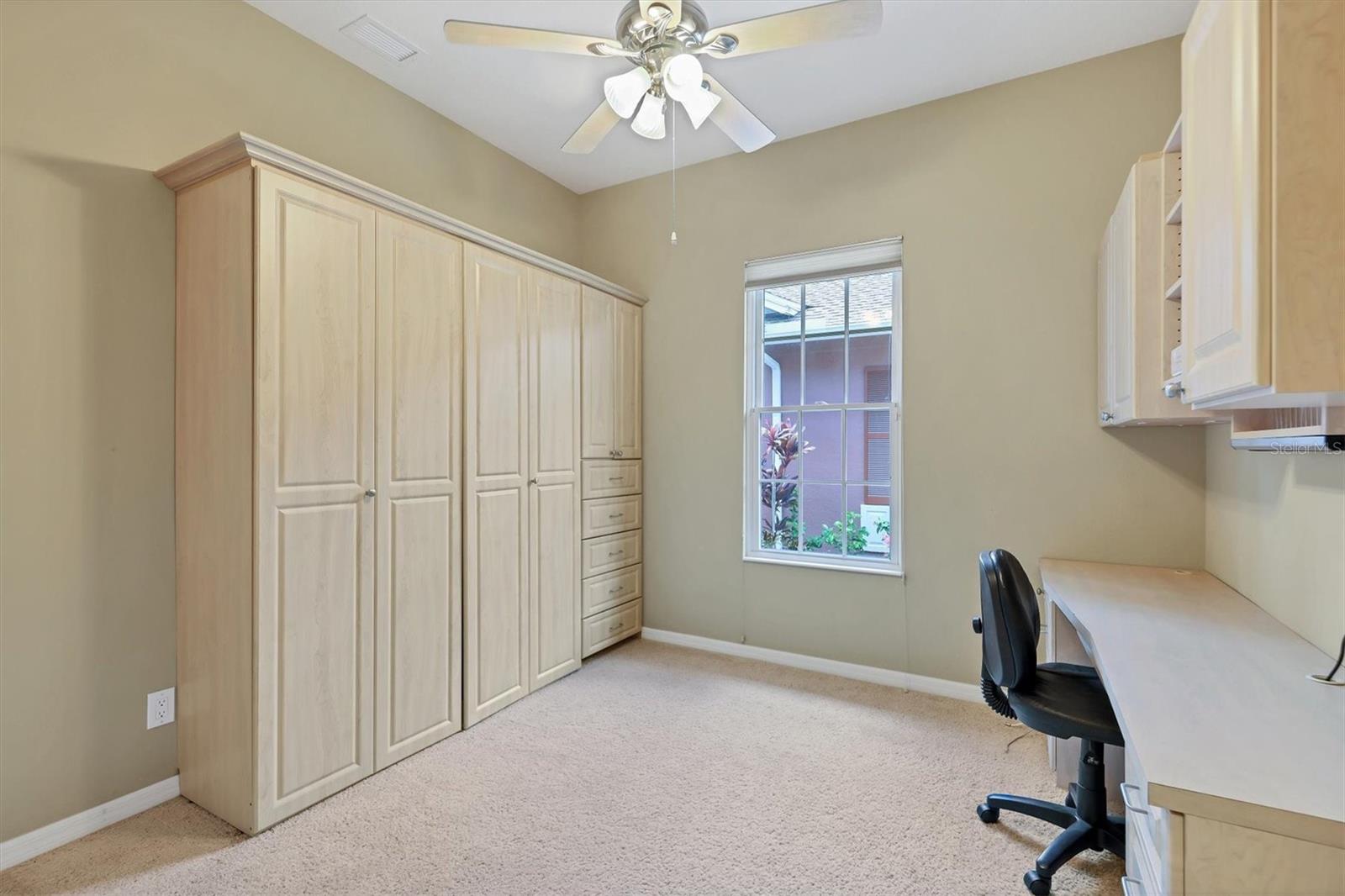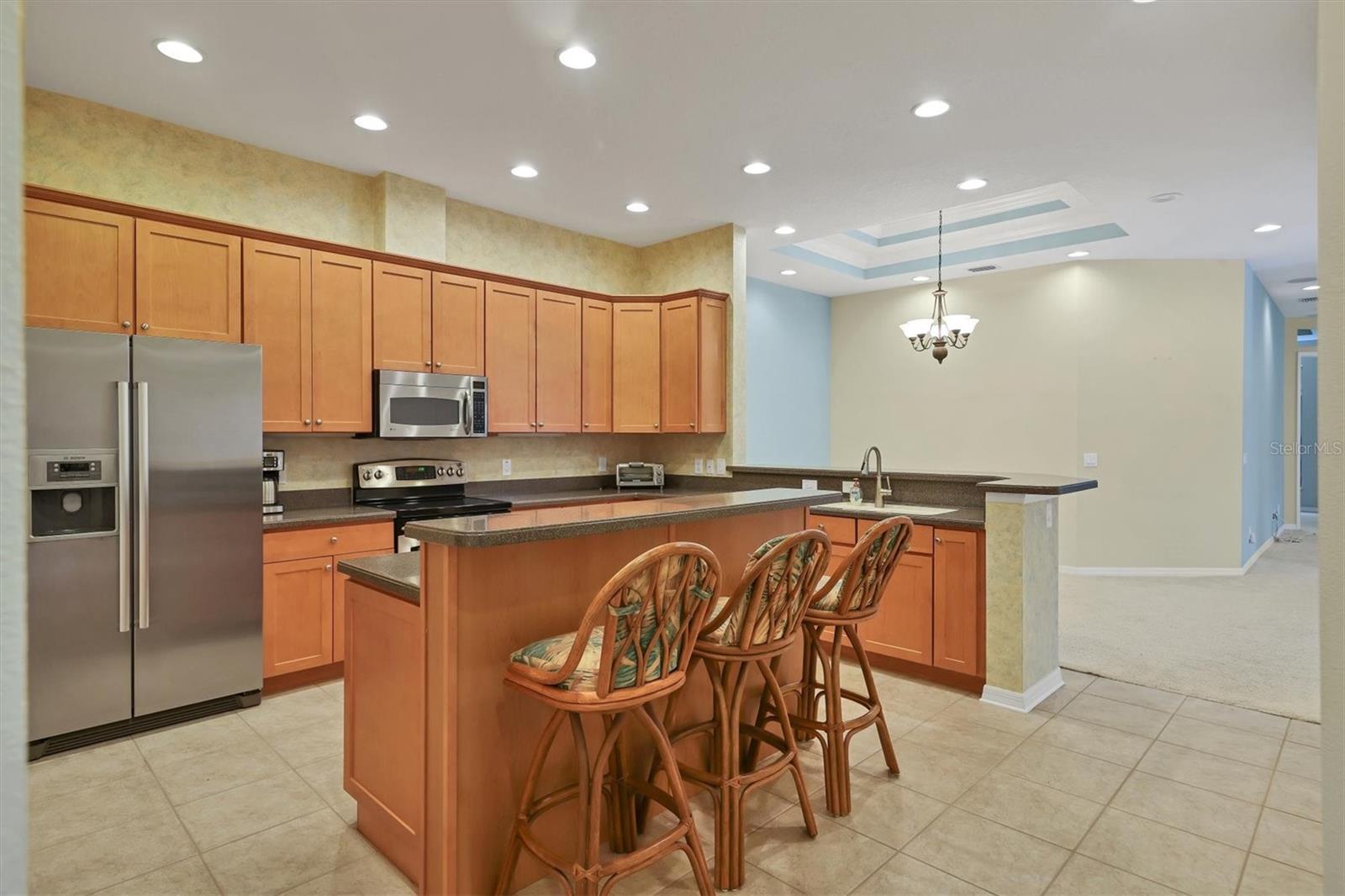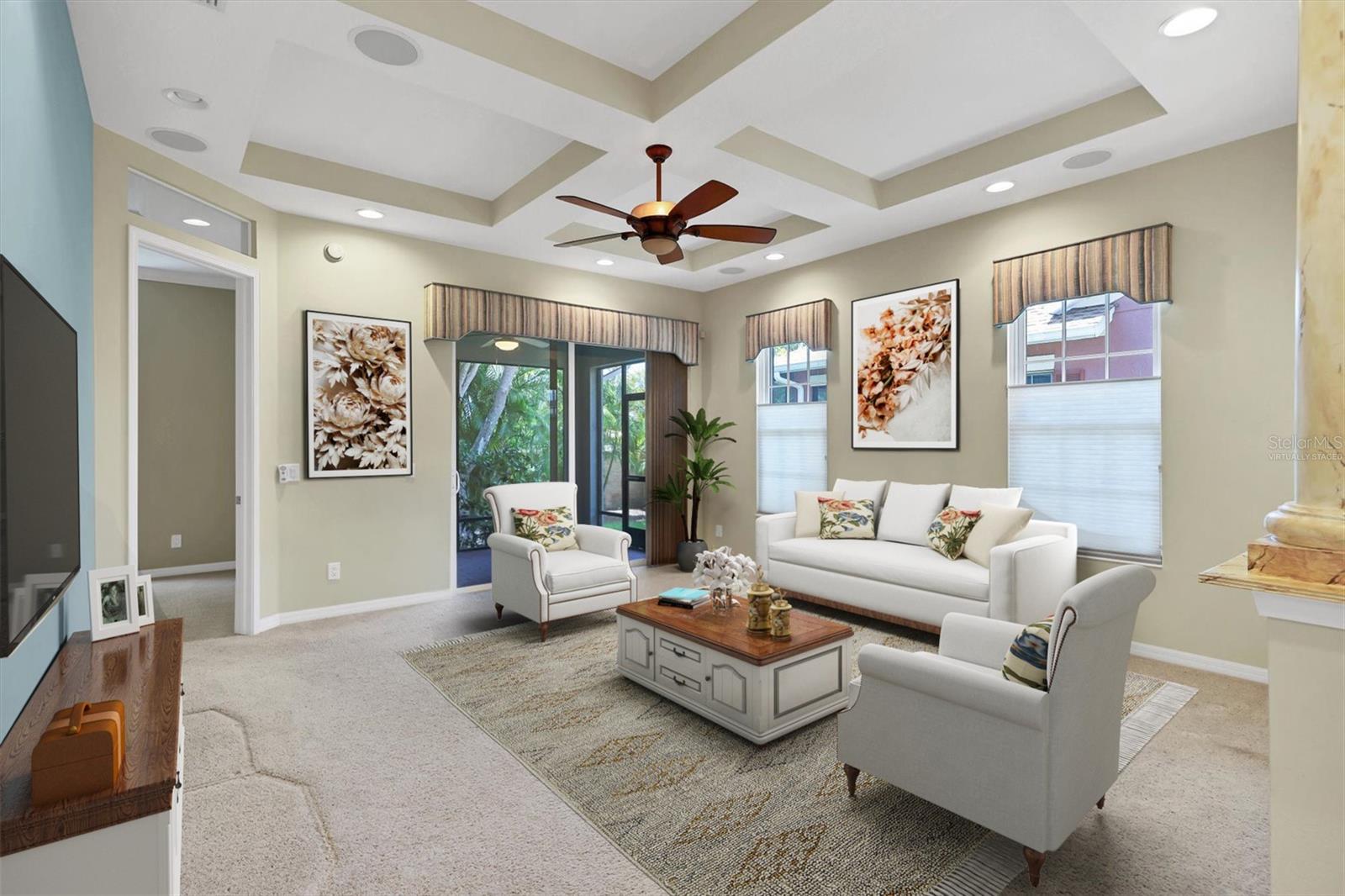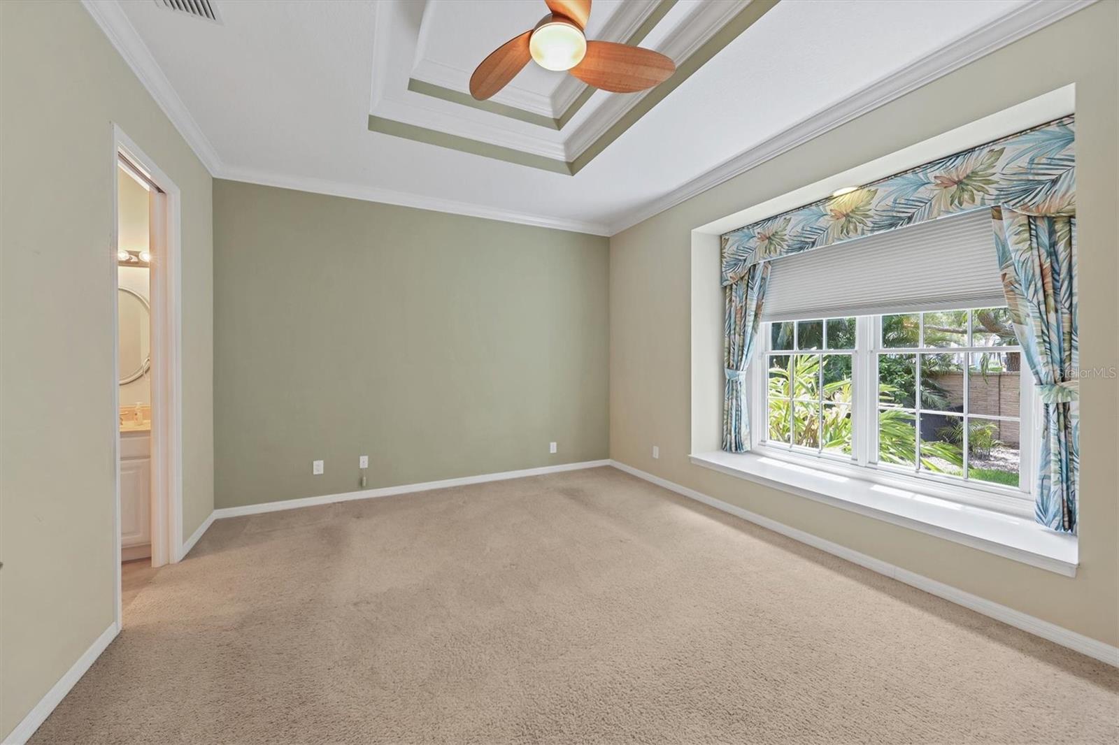 Introducing an exceptional villa that features 3 bedrooms, 2 bathrooms, plus a den, and under 5 miles to the award winning beaches of Anna Maria Island. With ROOF replaced March of 2024 and HVAC replaced in 2019 you will rest easy knowing big ticket replacements are already taken care of! Step inside to the open floor plan accentuated by 10-foot, double tray, and coffered ceilings throughout giving an elevated touch. The split floor plan makes it easy and convenient to enjoy having guests over while still maintaining your privacy. Walking into the primary bedroom you're greeted with an expansive bedroom and a cozy window nook that gives plenty of natural light. The primary bathroom offers a double sink vanity, walk-in-tiled shower, a closed off toilet with bidet, and spacious walk in closet. The bedrooms also feature California closets for all of your storage needs. The kitchen features custom wood cabinetry, pull-out drawers, stainless steel appliances, built-in wine rack, and walk-in pantry. On the guest side of the home you will find the additional 3 bedrooms and bathroom, the laundry room, and 2-car garage. One of the bedrooms is fitted for an office where you will find a full sized desk, upper cabinets, and a Murphy bed for maximum efficiency. The laundry room has the convenience you'll enjoy with upper cabinets and a hidden pull-down ironing board. Palma Sola Trace offers great amenities, the heated community pool is just a short walk away, in addition to a large clubhouse and a full gym. With this home located under 5 miles to Anna Maria Island this gives you easy access to the sugary sand beaches, fine dinning, and a true vacationing experience just a bike ride away.