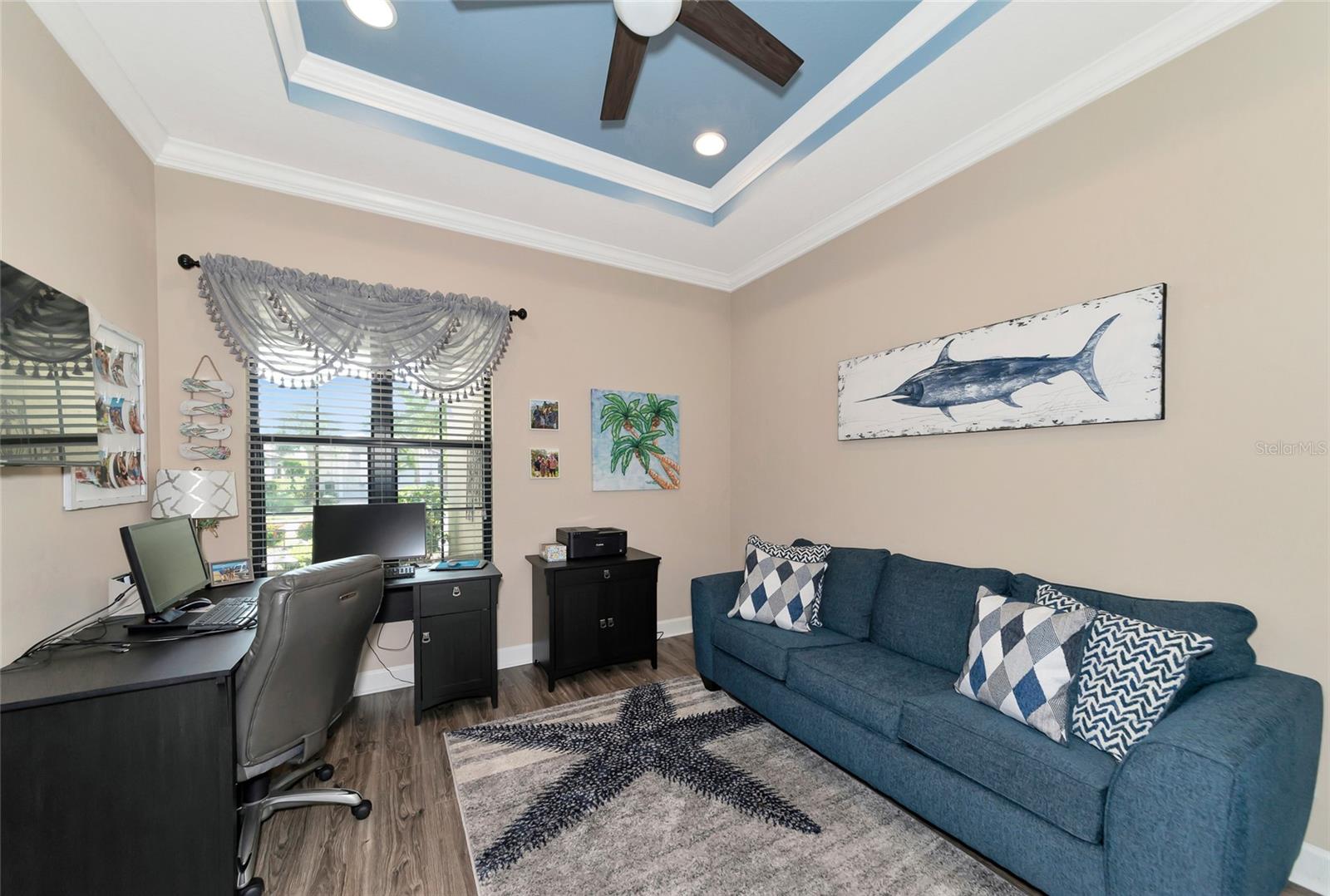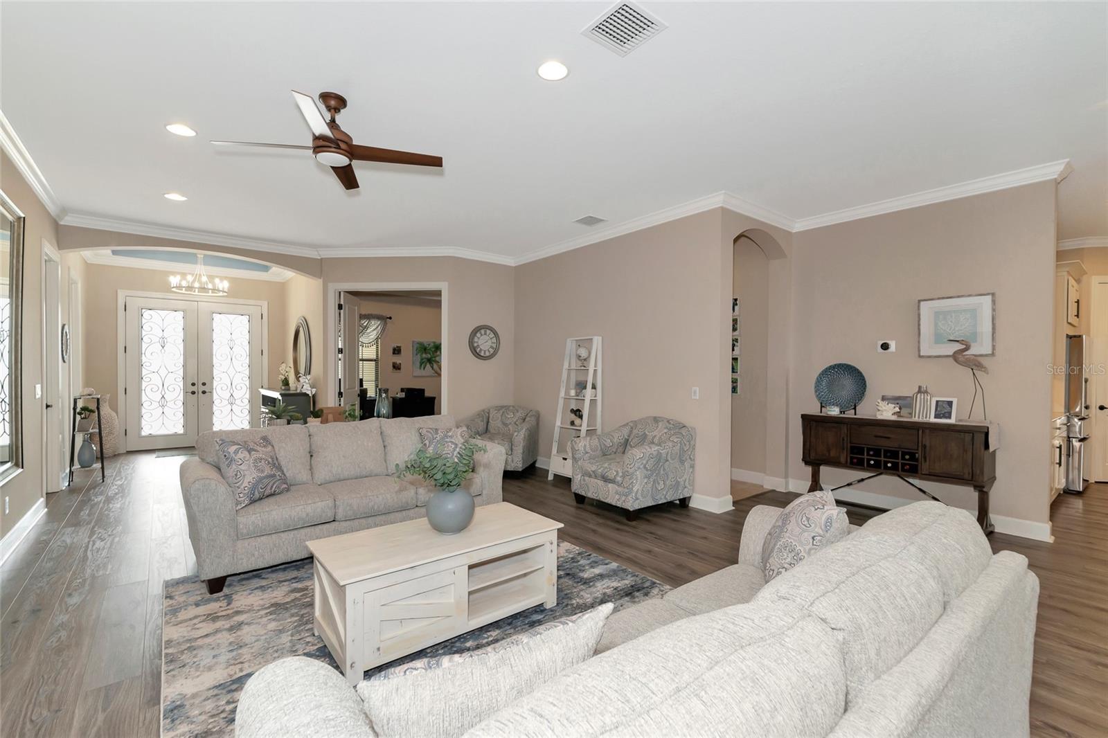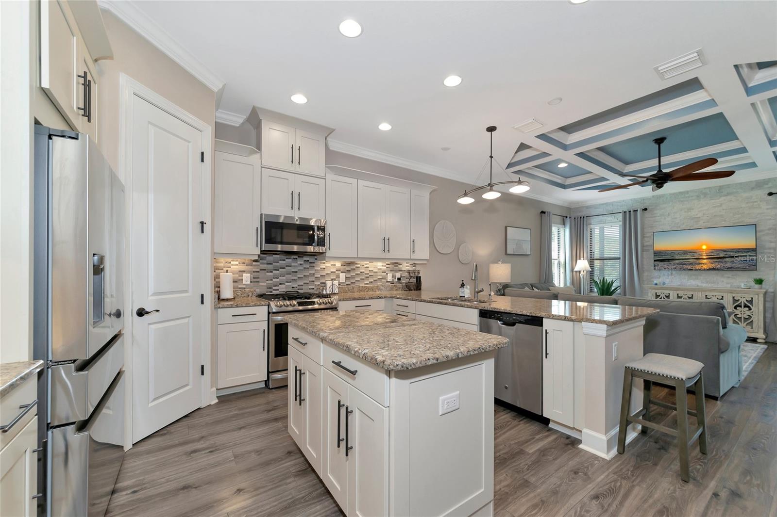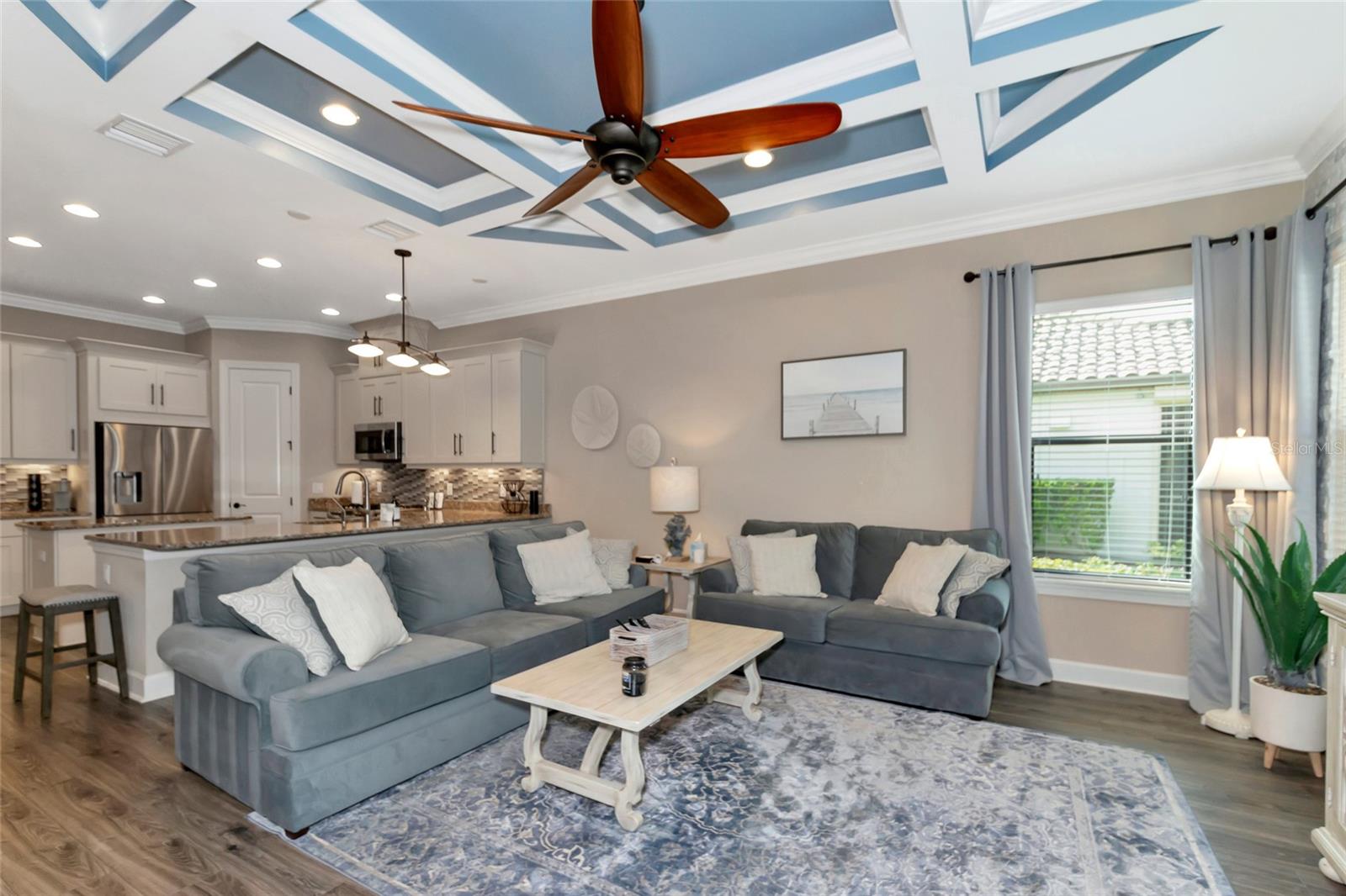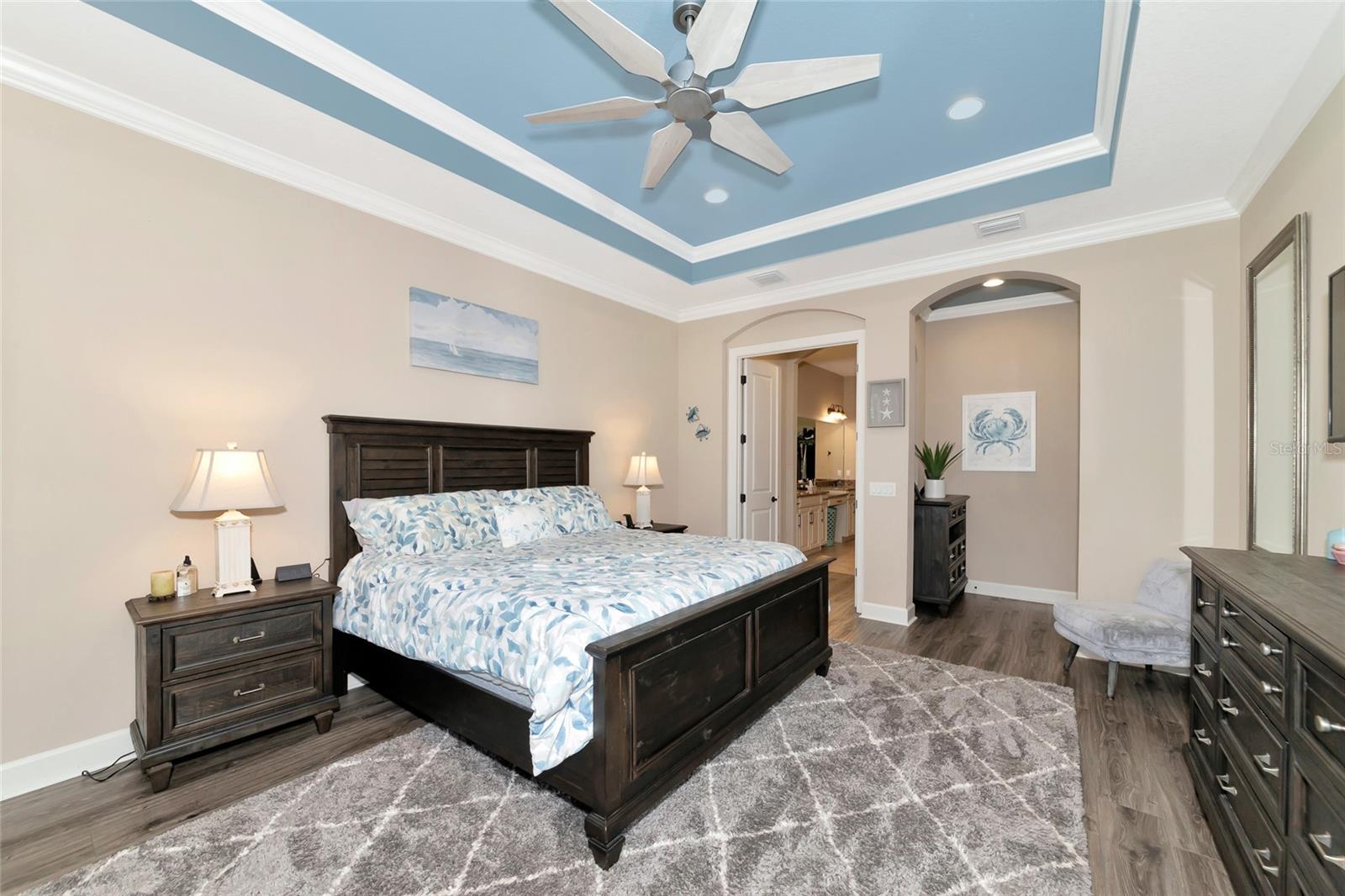 GOLF-DEEDED HOME! Furniture available on a separate Bill of Sale. Discover a life of elegance and recreation in the prestigious Esplanade Golf & Country Club with this magnificent Bella Casa model home by Taylor Morrison. From the moment you step through the grand entrance, you are greeted with an array of sophisticated features including coffered ceilings, towering 10 ft ceilings, and majestic 8 ft doors that establish an ambiance of refined style. Spanning nearly 3,000 square feet, this exquisite property offers three plush bedrooms and four luxurious baths, ensuring ample space and privacy for family and guests alike. The interior boasts stunning wood laminate flooring that complements the unique stone accent walls, adding a touch of rustic charm to the modern design. Each room is meticulously crafted to maximize comfort and aesthetic appeal. The home's functionality is matched by its recent upgrades, including a brand new HVAC system with a transferrable warranty, ensuring peace of mind and year-round comfort. Outside, the screened lanai with hurricane protection invites you to enjoy serene evenings or vibrant social gatherings, enhanced by tasteful outdoor lighting. Living in the Esplanade Golf & Country Club means more than just enjoying a beautiful home; it’s about embracing a lifestyle. The community offers a wide range of amenities that cater to all interests and ages. Whether you’re perfecting your swing on the golf course, engaging in a spirited game of pickleball or tennis, staying active in the state-of-the-art fitness center, or unwinding in the full-service spa, Esplanade has something to enrich every day. Socialize at the Bahama Bar, dive into resort-style pools, and explore culinary delights at the community center, all managed under the watchful eye of a dedicated lifestyle director. The gated community is nestled in a prime location within Lakewood Ranch, renowned for its "A" rated schools, picturesque walking trails, abundant shopping, and top-tier restaurants. Moreover, the proximity to stunning area beaches offers the perfect escape on sun-filled afternoons. This home isn’t just a place to live—it's a gateway to a lifestyle of luxury, convenience, and endless enjoyment. Embrace the opportunity to make it yours and experience the pinnacle of Florida living.