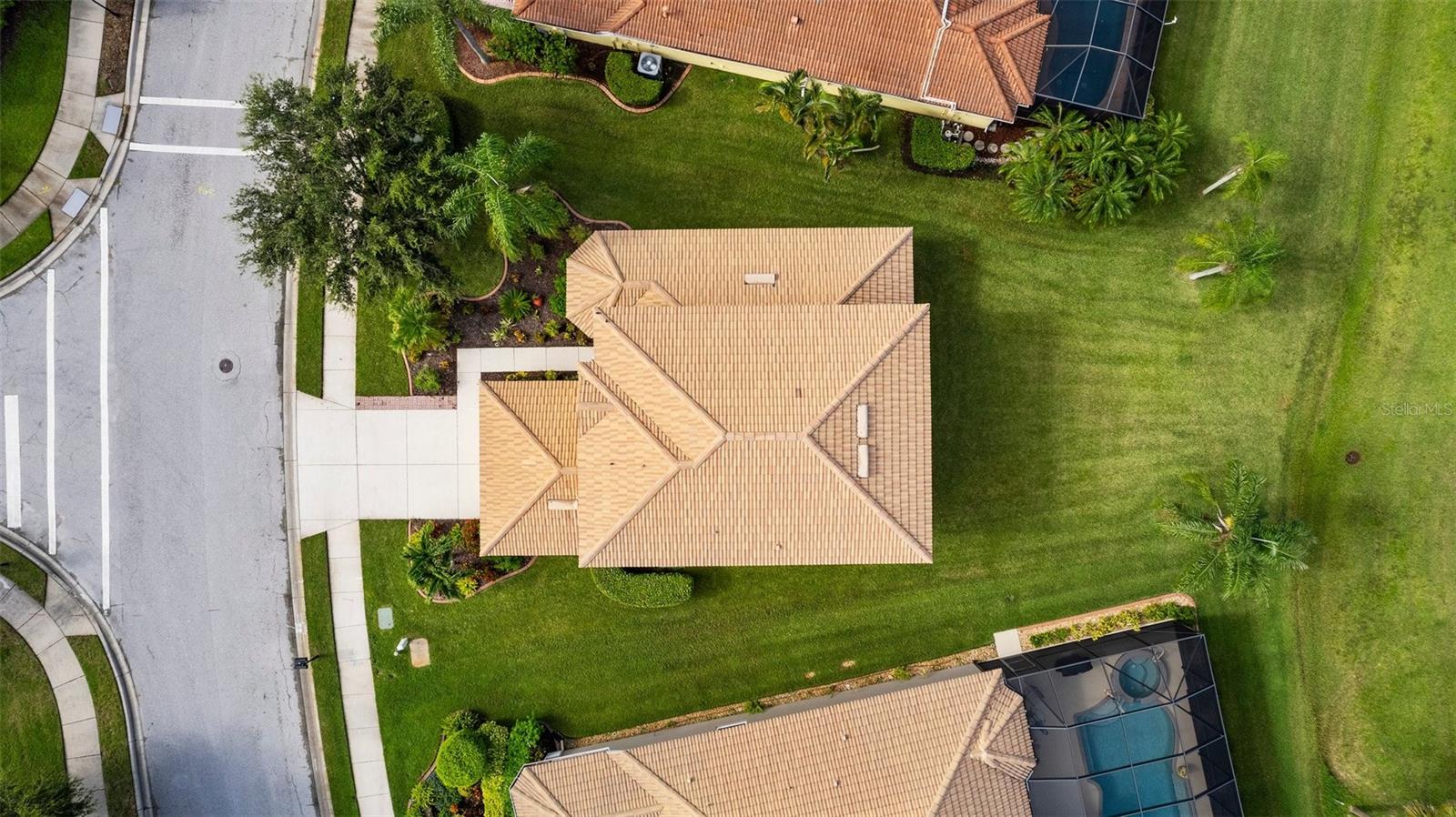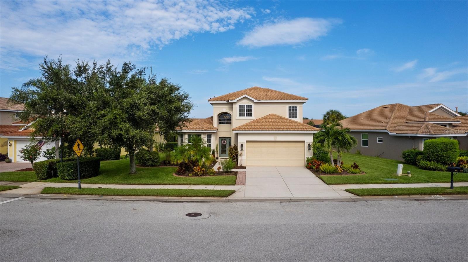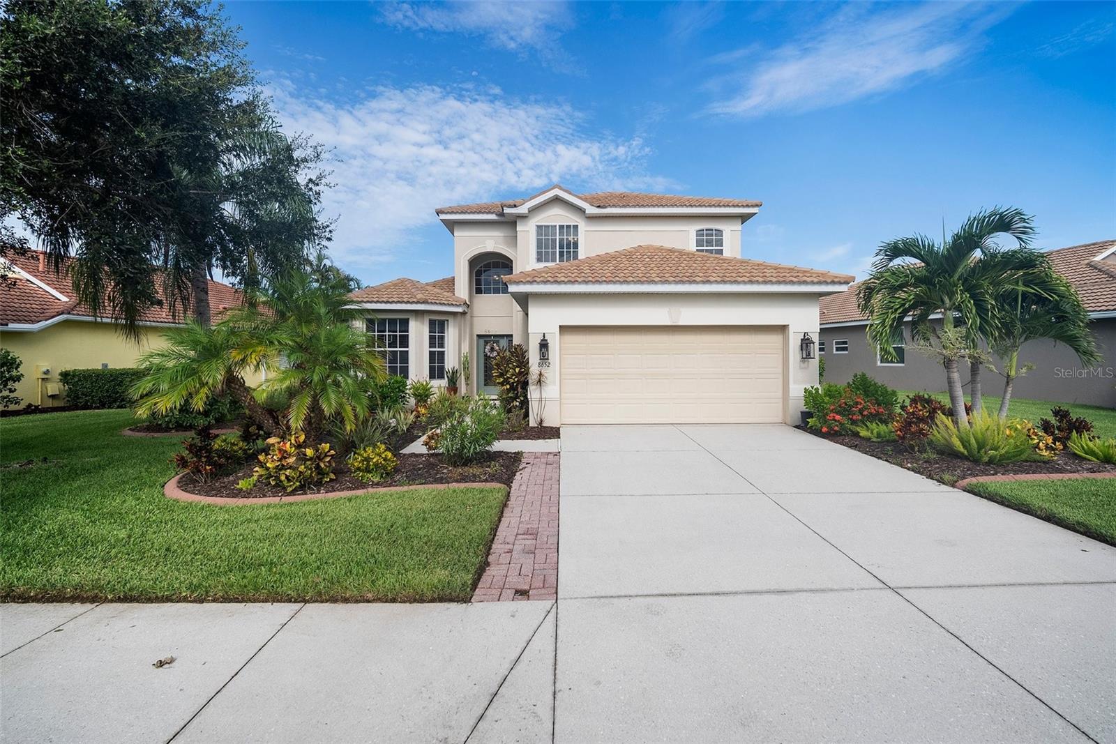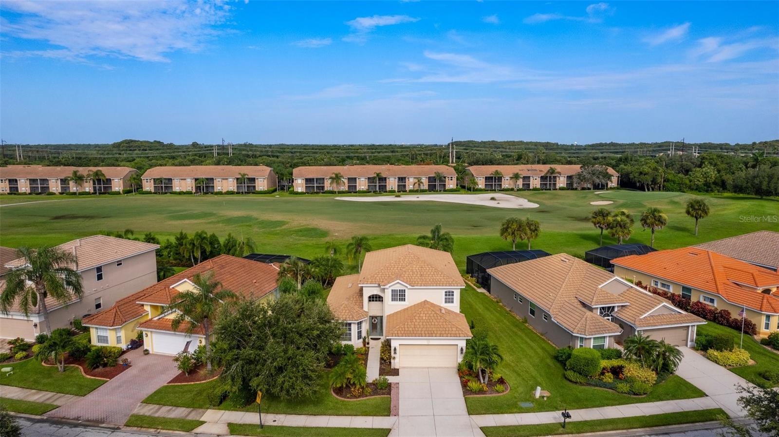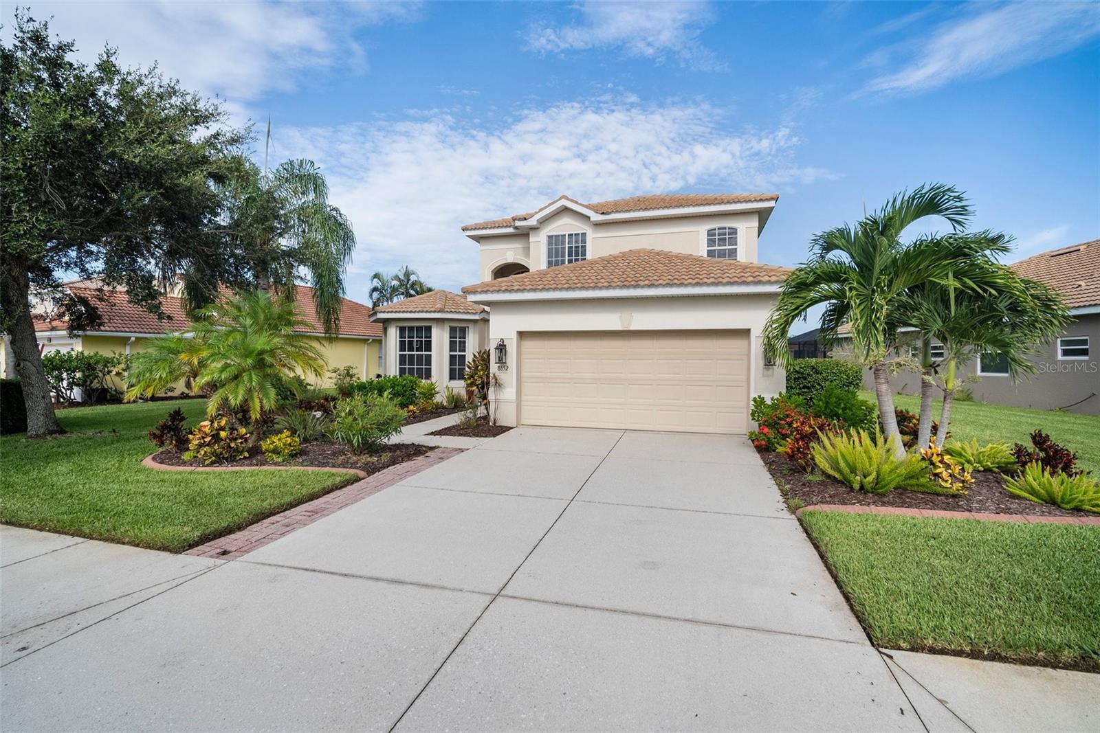 Your home awaits you in Stoneybrook, a beautiful golf community. You will love this three bedroom, two and a half bath with the primary bedroom and laundry room on the first floor. This home, with a barrel tile roof and hurricane shutters, has an open floor plan with custom tile layed at a diagonal in the gathering spaces. As you walk in the front door, you are met with a generous great room and high ceilings. There are plenty of places to eat, as the home is fit with a formal dining room, breakfast nook, and breakfast bar. The kitchen is adorned with ample cabinets, granite countertops, new stainless steel appliances (including a gas stove, double oven, wine fridge, main fridge with a glass door, and freezer that creates craft ice balls). The kitchen also includes a pantry for extra storage and opens up to the breakfast nook adjacent to the sliders that lead to the covered and screened lanai and a gorgeous golf course view. Note that this side of the golf course does not have the golf cart path for extra privacy. Main bedroom has crown molding, his and hers walk-in closets, and an en-suite bathroom. The primary bathroom has a separate tub and shower combo, dual vanities, and a separate water closet. There is a 2 year old state of the art $17,000 HVAC system that saves owner $200 per month. Never had a bill over $218 and they keep it at 73 degrees! Upstairs you will find a bonus/flex room and two guest bedrooms. Thinking of adding a pool? There is more than enough room here! Live like you are on vacation all year round with an 18-hole championship golf course, restaurant, active golf club and recreation center, 2 resort style heated pool and one has a spa, fitness center, tennis, pickleball, basketball, volleyball, shuffleboard, bocci ball, lake with a fishing pier, playgrounds, picnic area, dog parks, and more! Coming soon to the area: Seasons 52, Hobby Lobby, and Whole Foods!