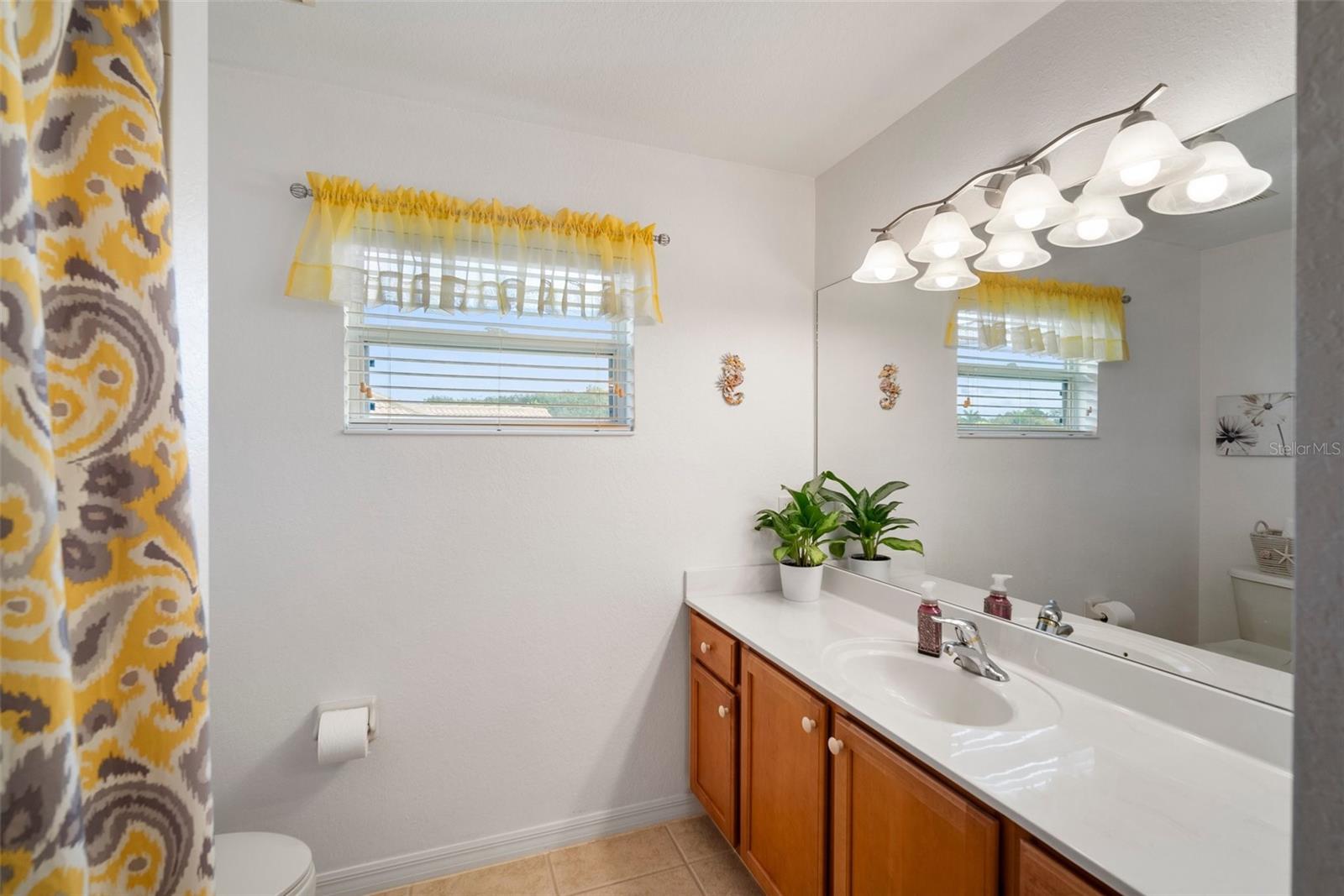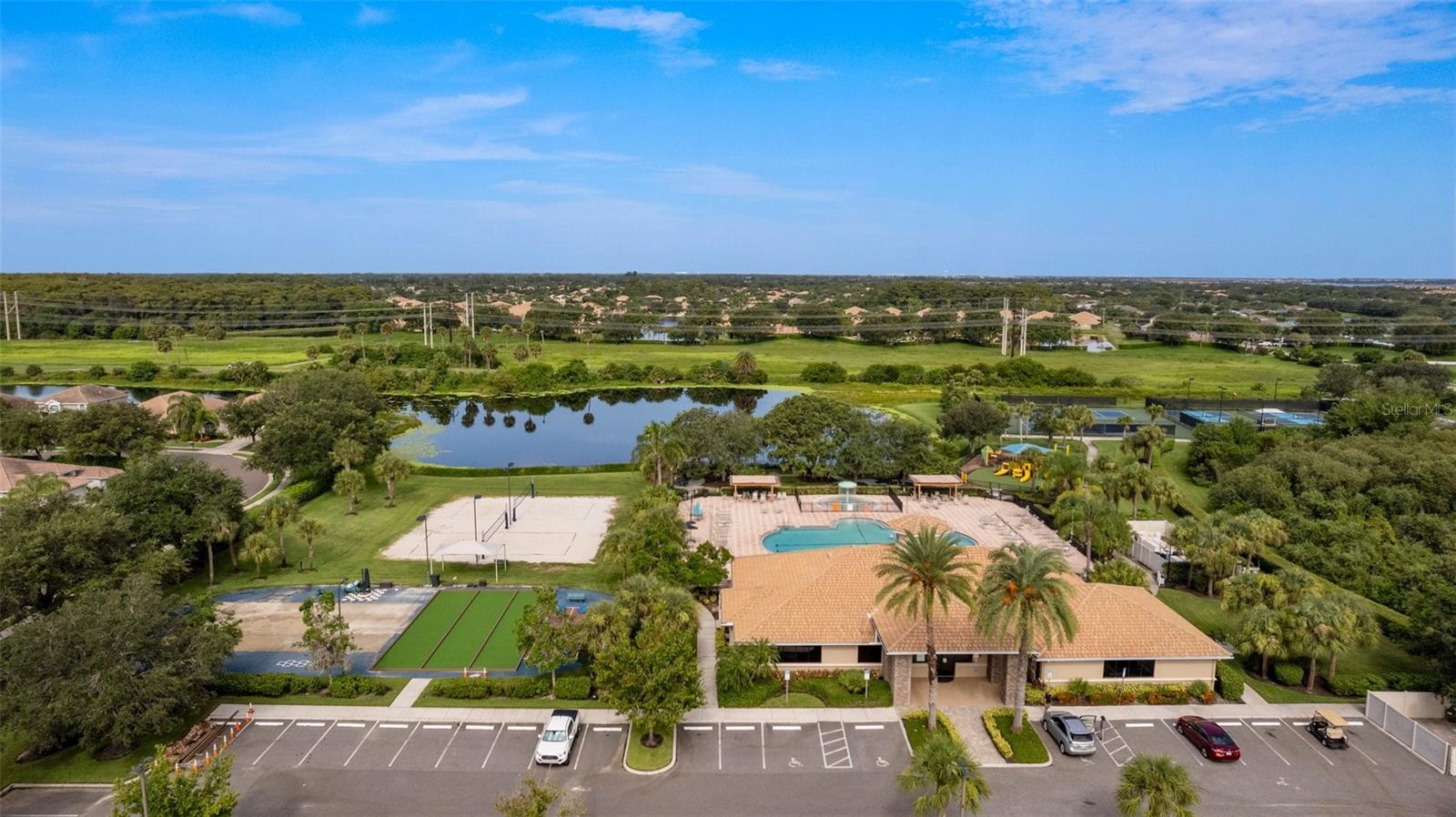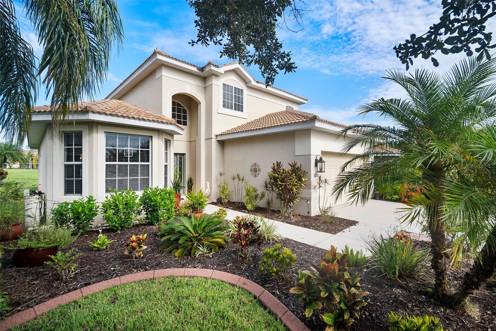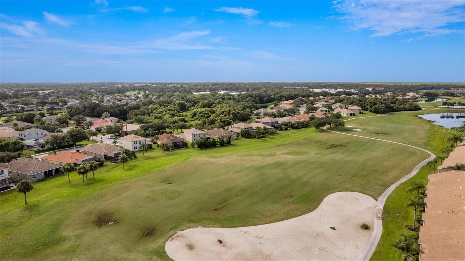 Your home awaits you in Stoneybrook, a beautiful golf community. You will love this three bedroom, two and a half bath with the primary bedroom and laundry room on the first floor. This home, with a barrel tile roof and hurricane shutters, has an open floor plan with custom tile layed at a diagonal in the gathering spaces. As you walk in the front door, you are met with a generous great room and high ceilings. There are plenty of places to eat, as the home is fit with a formal dining room, breakfast nook, and breakfast bar. The kitchen is adorned with ample cabinets, granite countertops, new stainless steel appliances (including a gas stove, double oven, wine fridge, main fridge with a glass door, and freezer that creates craft ice balls). The kitchen also includes a pantry for extra storage and opens up to the breakfast nook adjacent to the sliders that lead to the covered and screened lanai and a gorgeous golf course view. Note that this side of the golf course does not have the golf cart path for extra privacy. Main bedroom has crown molding, his and hers walk-in closets, and an en-suite bathroom. The primary bathroom has a separate tub and shower combo, dual vanities, and a separate water closet. There is a 2 year old state of the art $17,000 HVAC system that saves owner $200 per month. Never had a bill over $218 and they keep it at 73 degrees! Upstairs you will find a bonus/flex room and two guest bedrooms. Thinking of adding a pool? There is more than enough room here! Live like you are on vacation all year round with an 18-hole championship golf course, restaurant, active golf club and recreation center, 2 resort style heated pool and one has a spa, fitness center, tennis, pickleball, basketball, volleyball, shuffleboard, bocci ball, lake with a fishing pier, playgrounds, picnic area, dog parks, and more! Coming soon to the area: Seasons 52, Hobby Lobby, and Whole Foods!