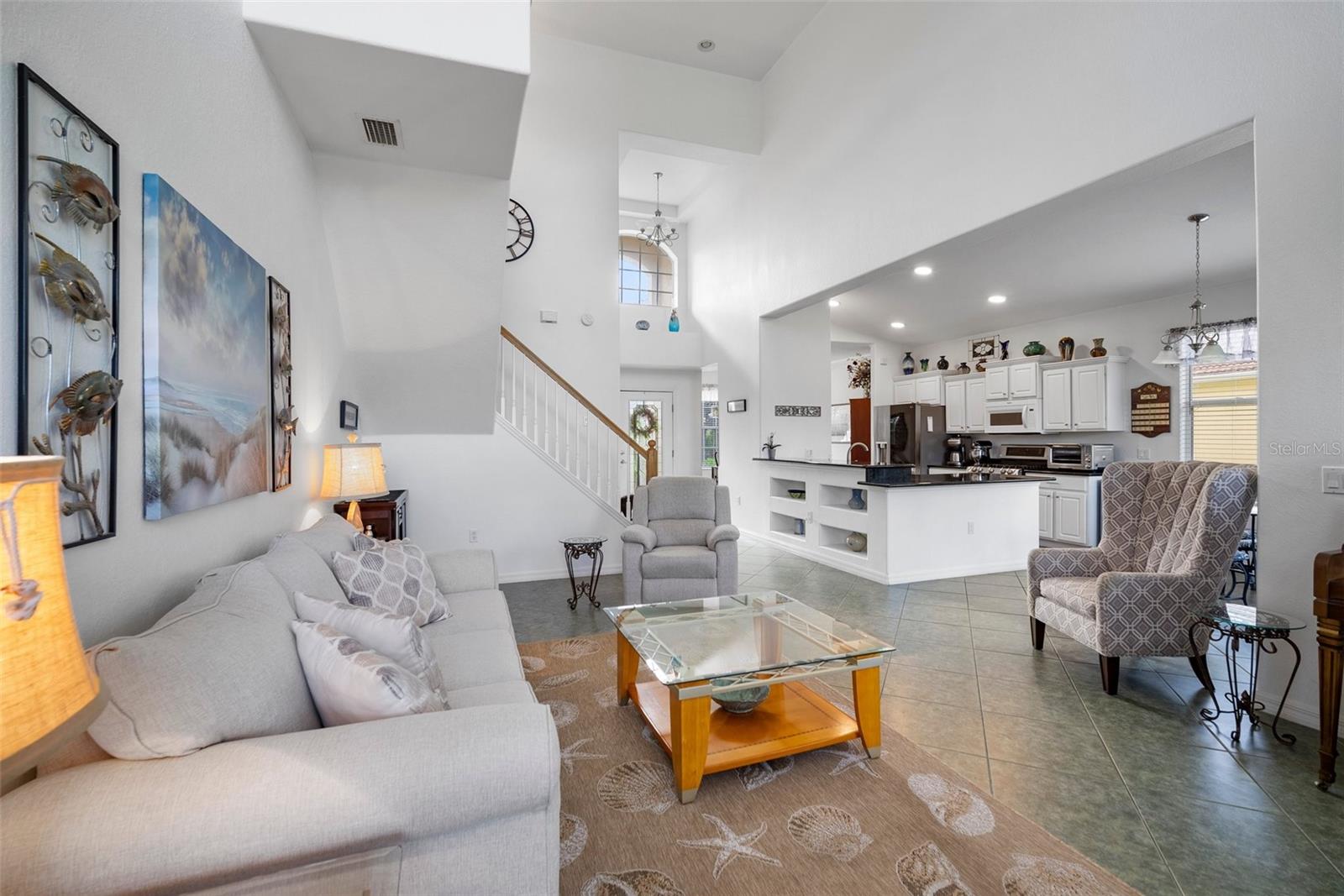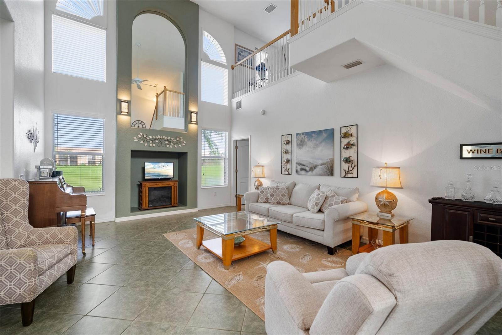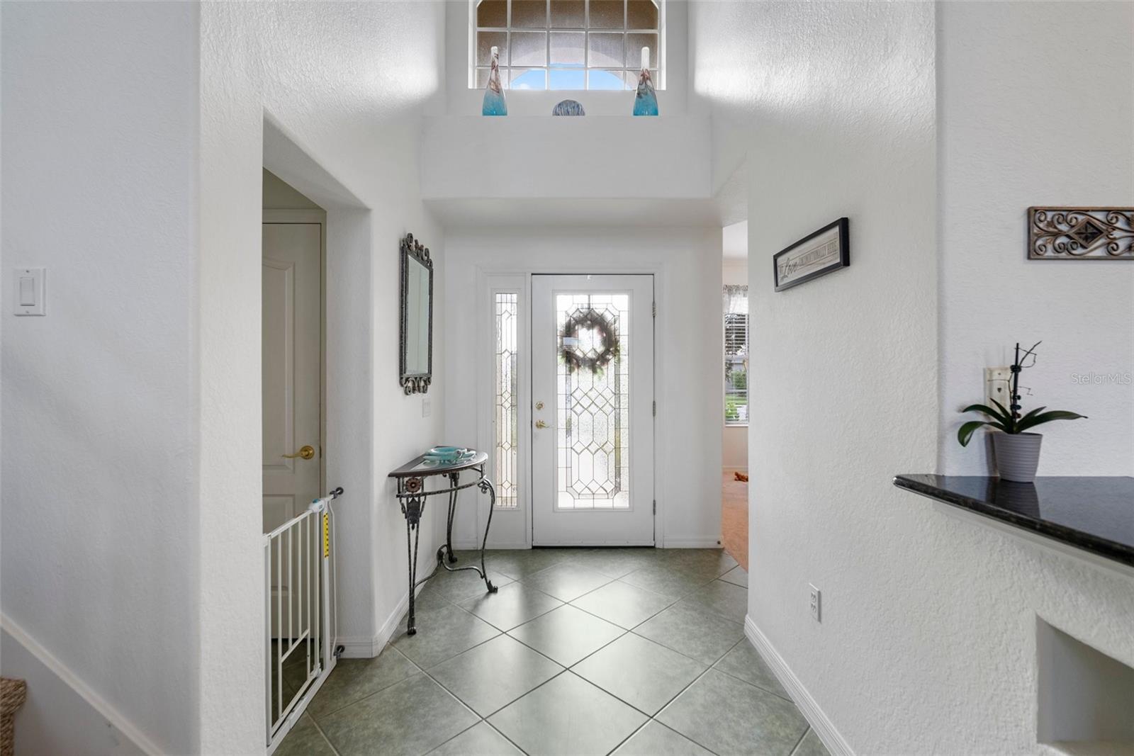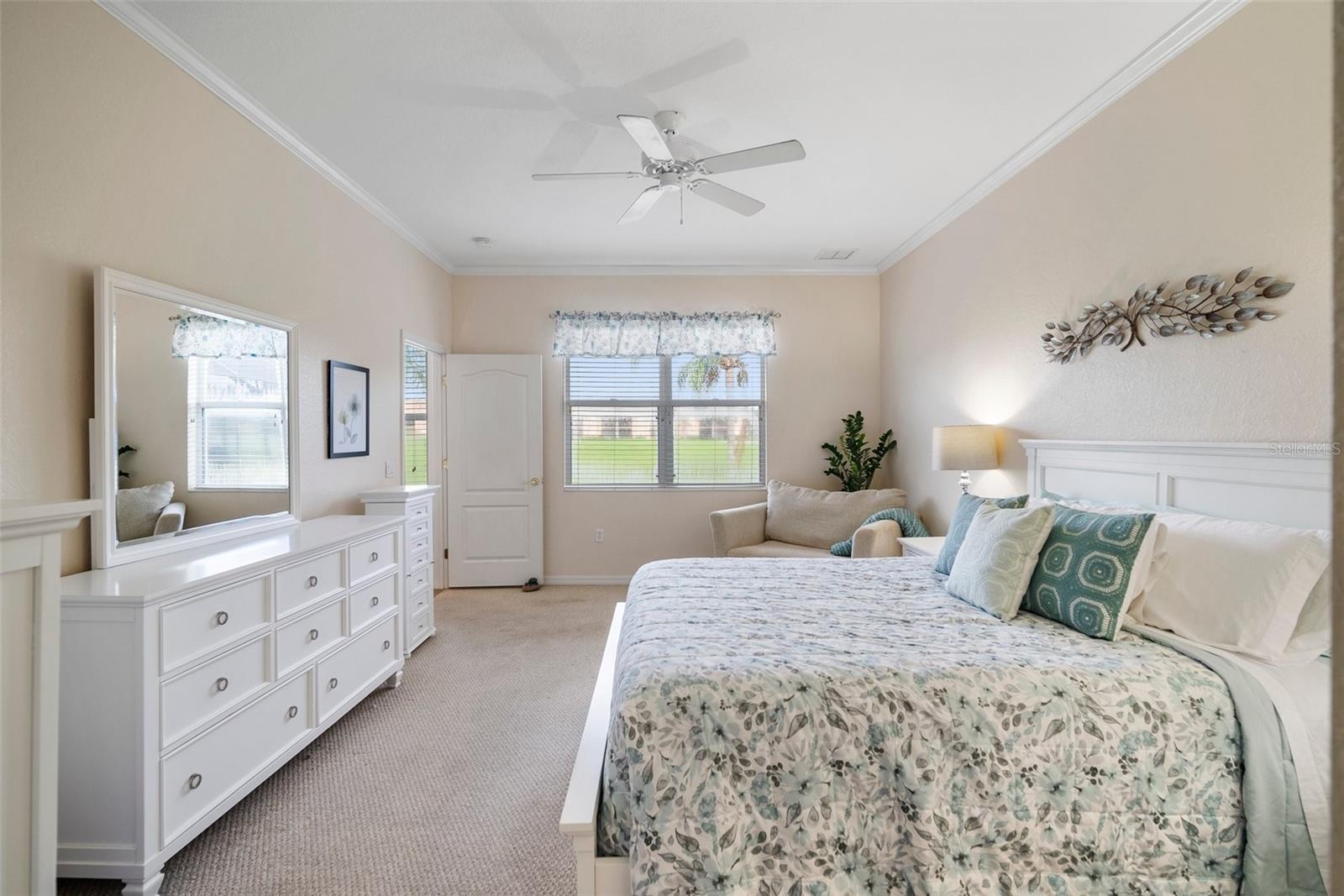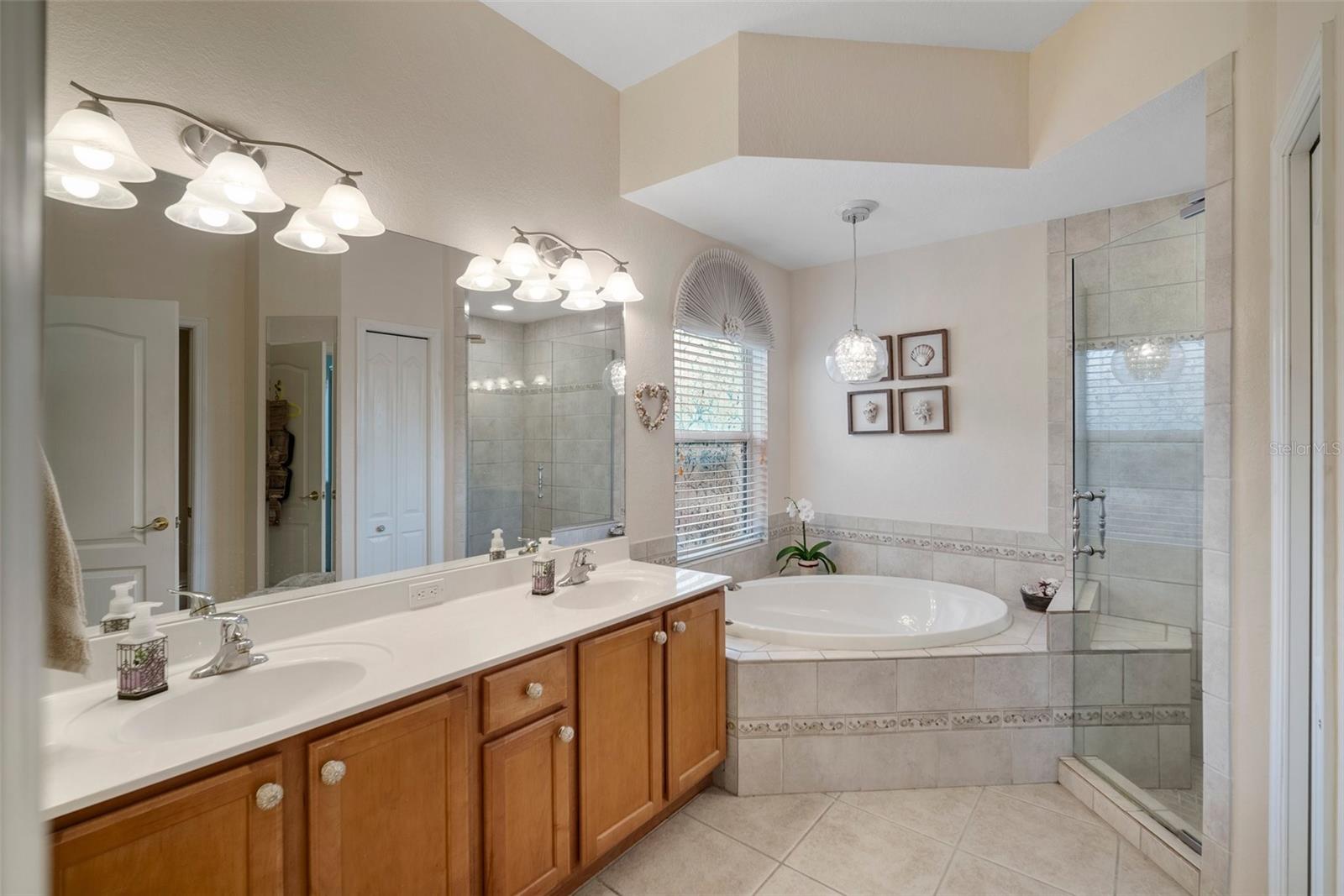 Your home awaits you in Stoneybrook, a beautiful golf community. You will love this three bedroom, two and a half bath with the primary bedroom and laundry room on the first floor. This home, with a barrel tile roof and hurricane shutters, has an open floor plan with custom tile layed at a diagonal in the gathering spaces. As you walk in the front door, you are met with a generous great room and high ceilings. There are plenty of places to eat, as the home is fit with a formal dining room, breakfast nook, and breakfast bar. The kitchen is adorned with ample cabinets, granite countertops, new stainless steel appliances (including a gas stove, double oven, wine fridge, main fridge with a glass door, and freezer that creates craft ice balls). The kitchen also includes a pantry for extra storage and opens up to the breakfast nook adjacent to the sliders that lead to the covered and screened lanai and a gorgeous golf course view. Note that this side of the golf course does not have the golf cart path for extra privacy. Main bedroom has crown molding, his and hers walk-in closets, and an en-suite bathroom. The primary bathroom has a separate tub and shower combo, dual vanities, and a separate water closet. There is a 2 year old state of the art $17,000 HVAC system that saves owner $200 per month. Never had a bill over $218 and they keep it at 73 degrees! Upstairs you will find a bonus/flex room and two guest bedrooms. Thinking of adding a pool? There is more than enough room here! Live like you are on vacation all year round with an 18-hole championship golf course, restaurant, active golf club and recreation center, 2 resort style heated pool and one has a spa, fitness center, tennis, pickleball, basketball, volleyball, shuffleboard, bocci ball, lake with a fishing pier, playgrounds, picnic area, dog parks, and more! Coming soon to the area: Seasons 52, Hobby Lobby, and Whole Foods!