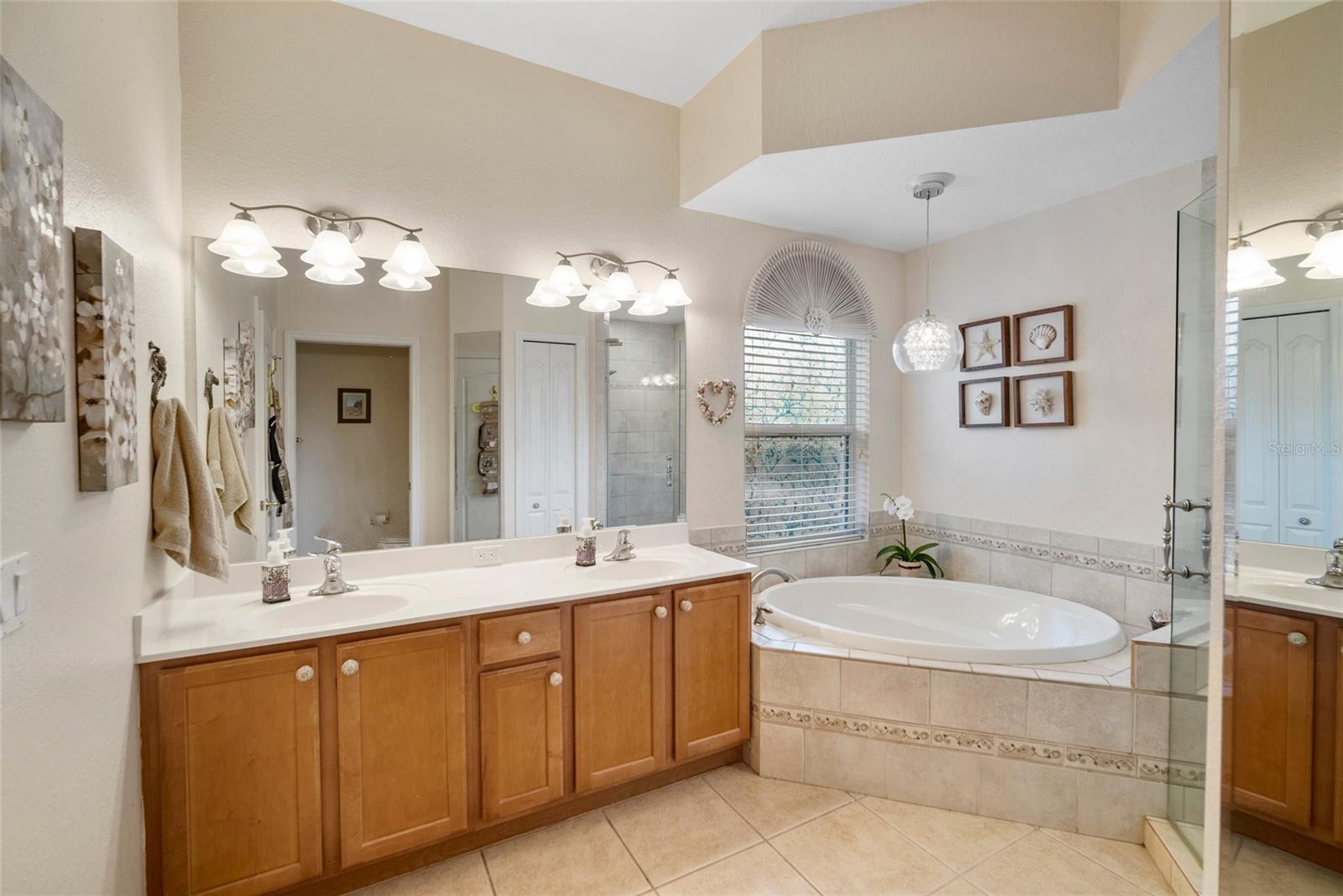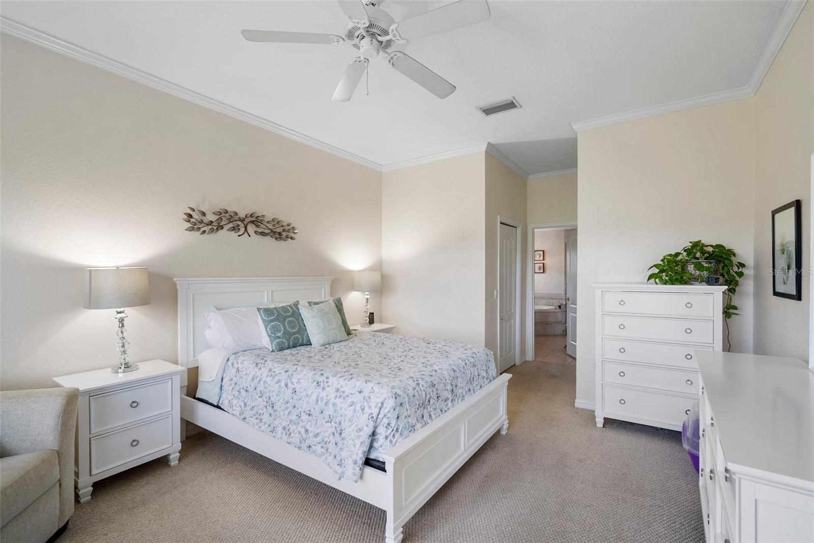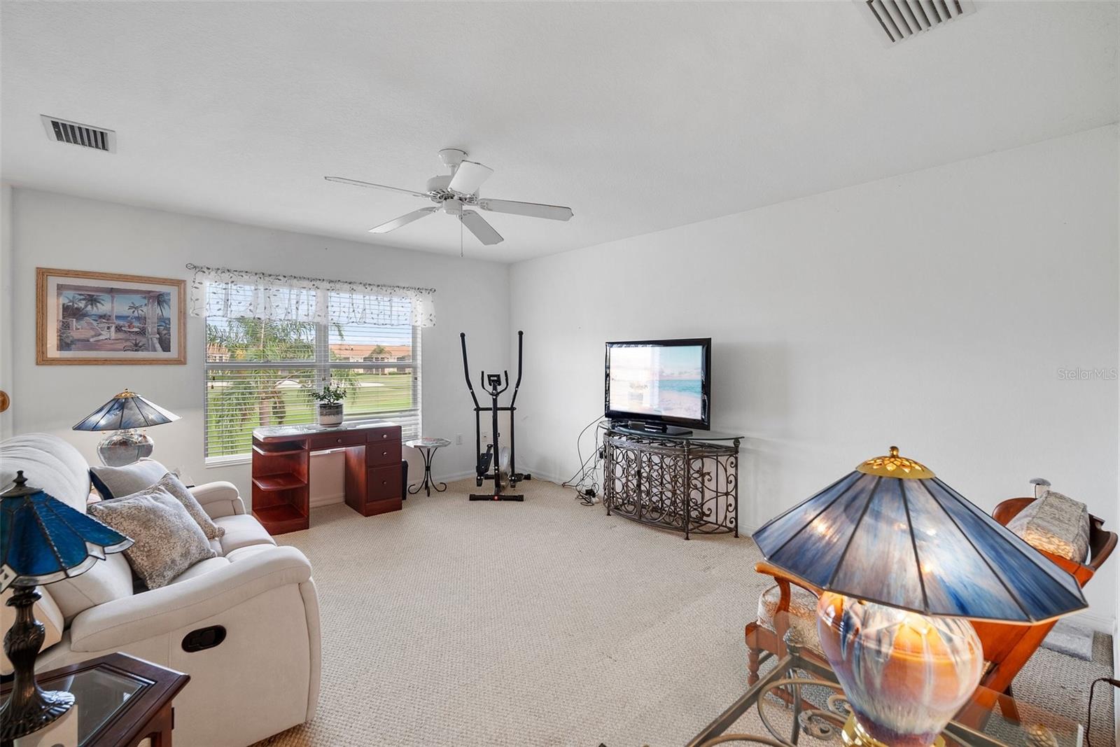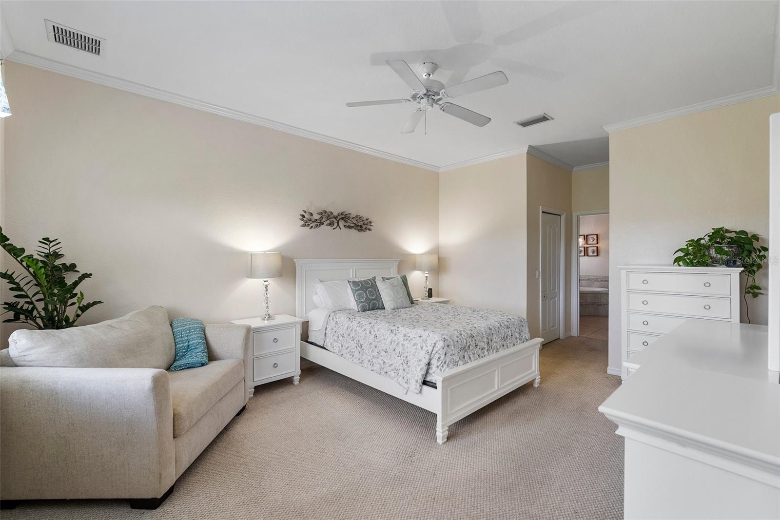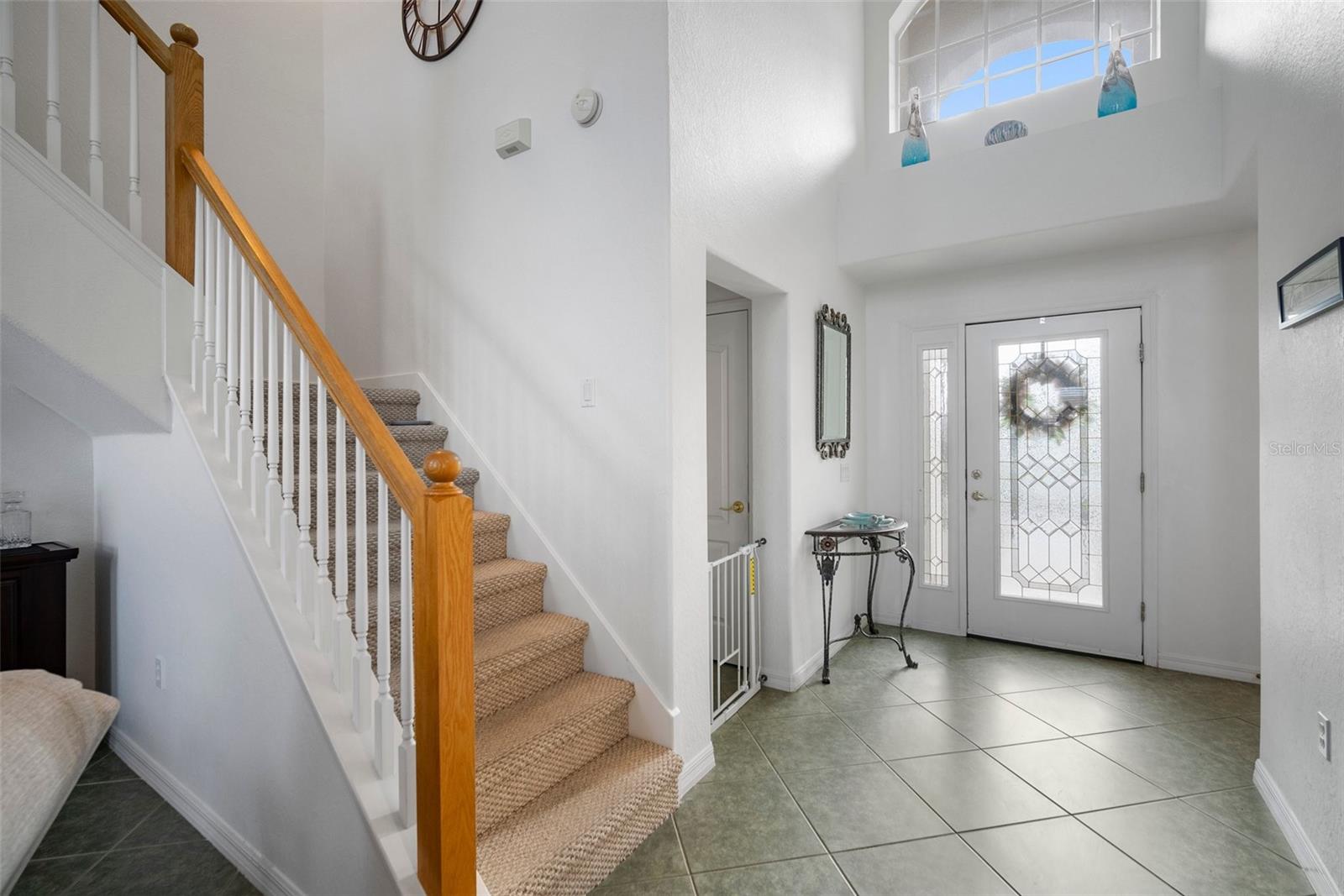 Your home awaits you in Stoneybrook, a beautiful golf community. You will love this three bedroom, two and a half bath with the primary bedroom and laundry room on the first floor. This home, with a barrel tile roof and hurricane shutters, has an open floor plan with custom tile layed at a diagonal in the gathering spaces. As you walk in the front door, you are met with a generous great room and high ceilings. There are plenty of places to eat, as the home is fit with a formal dining room, breakfast nook, and breakfast bar. The kitchen is adorned with ample cabinets, granite countertops, new stainless steel appliances (including a gas stove, double oven, wine fridge, main fridge with a glass door, and freezer that creates craft ice balls). The kitchen also includes a pantry for extra storage and opens up to the breakfast nook adjacent to the sliders that lead to the covered and screened lanai and a gorgeous golf course view. Note that this side of the golf course does not have the golf cart path for extra privacy. Main bedroom has crown molding, his and hers walk-in closets, and an en-suite bathroom. The primary bathroom has a separate tub and shower combo, dual vanities, and a separate water closet. There is a 2 year old state of the art $17,000 HVAC system that saves owner $200 per month. Never had a bill over $218 and they keep it at 73 degrees! Upstairs you will find a bonus/flex room and two guest bedrooms. Thinking of adding a pool? There is more than enough room here! Live like you are on vacation all year round with an 18-hole championship golf course, restaurant, active golf club and recreation center, 2 resort style heated pool and one has a spa, fitness center, tennis, pickleball, basketball, volleyball, shuffleboard, bocci ball, lake with a fishing pier, playgrounds, picnic area, dog parks, and more! Coming soon to the area: Seasons 52, Hobby Lobby, and Whole Foods!