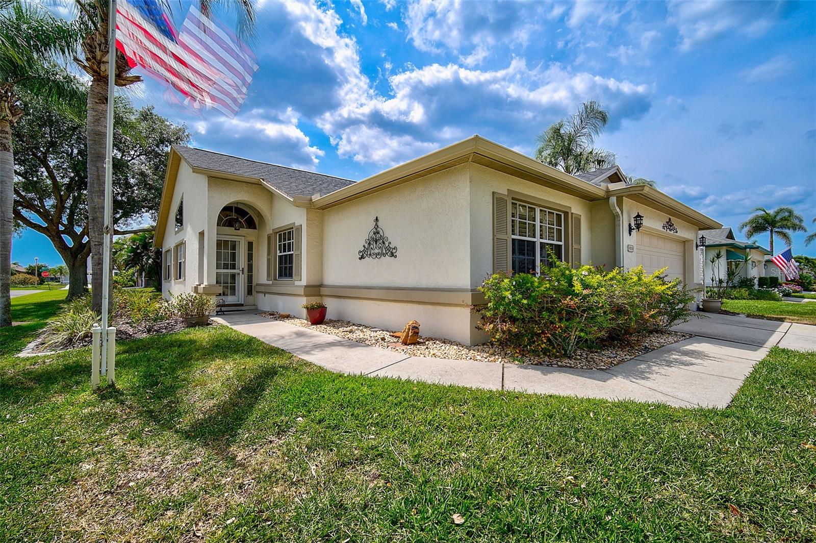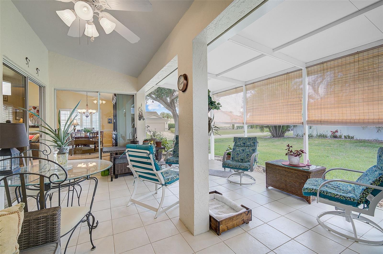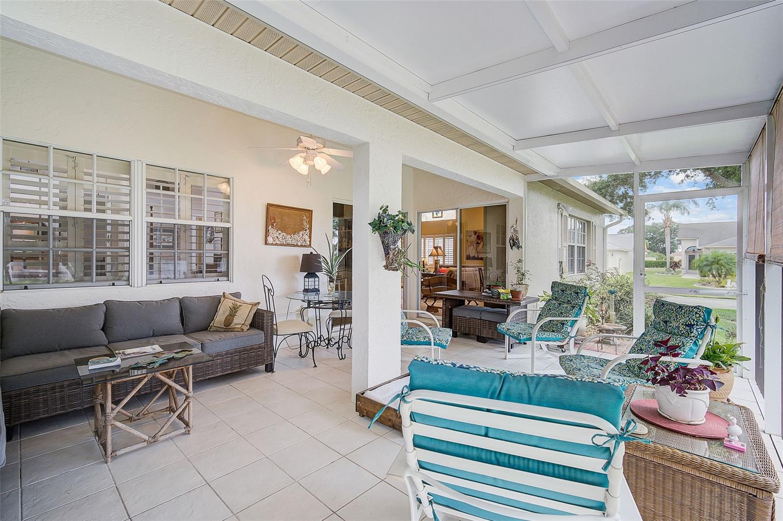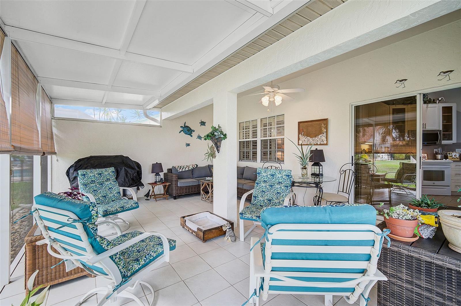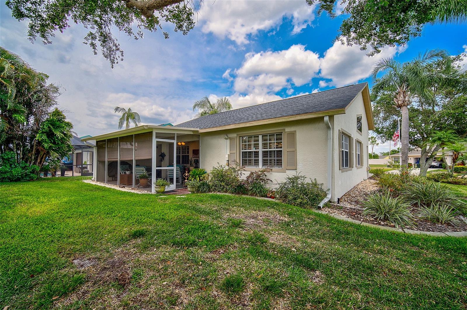 Located in The Greens of Peridia, this 1,756 Sq. Ft. home offers 2 BR/2BA + Den, all situated on a desirable corner lot. The entryway greets you with a gorgeous glass door, leading into a space filled with natural light. Plantation shutters adorn every window, adding both style and privacy. The updated kitchen features granite countertops, tall cabinets, track lighting, and a spacious pantry, offering both functionality and elegance. Adjacent to the kitchen, you'll find a combined living and dining area with high ceilings, perfect for entertaining. The primary bedroom includes a walk-in closet and an owner's bath with a large shower and dual sinks, providing a comfortable retreat. The versatile den can be used as a home office, guest room, or hobby space, catering to your unique needs. The large screened lanai provides a peaceful outdoor space to enjoy your morning coffee or evening relaxation. A/C replaced in 2020 and the roof in 2022. Don't miss out on this beautifully maintained home, ready for you to move in! Living in Peridia Golf & Country Club offers a vibrant lifestyle with access to an 18-hole executive golf course, tennis courts, pickleball, bar poker, live music with dancing, Mahjong, members-only events, and much more! Conveniently located close to restaurants, shopping, the Gulf beaches, the airport, and more! One Time- Capital Reserve $4,000; Quarterly- Yard Maintenance $329.00 ; Quarterly- Master Association $877; Annual- Food/beverage Minimum $450; One Time- Application Fees $200.